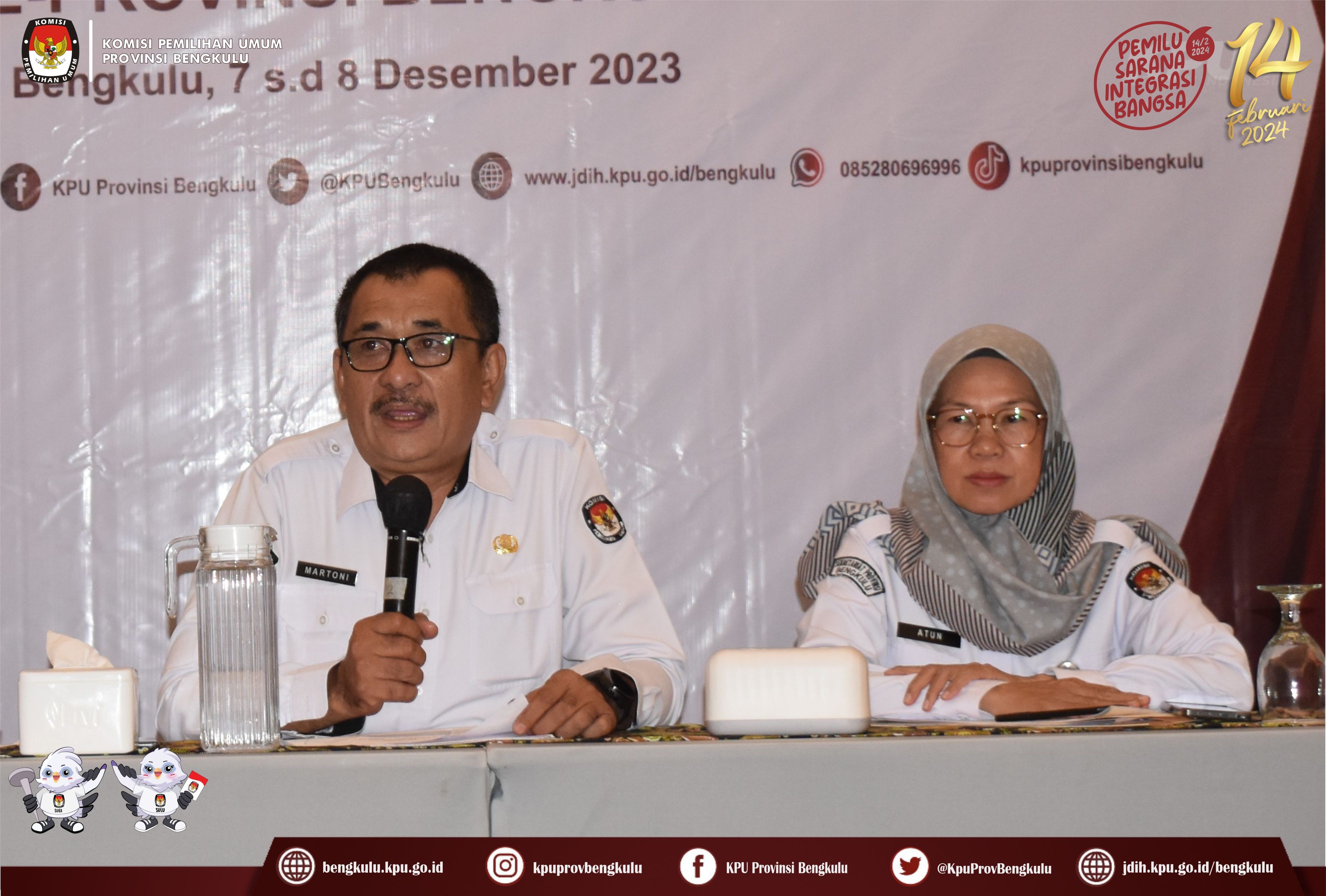 Bengkulu, bengkulu.kpu.go.id - KPU Provinsi Bengkulu menggelar Rapat Koordinasi Perencanaan Data dan Informasi KPU Provinsi dan KPU Kabupaten/Kota se-Provinsi Bengkulu, Kamis-Jum'at 7-8/12/2023) bertempat di Hotel Mercure Bengkulu. Peserta yang hadir meliputi Ketua, Anggota Divisi Perencanaan Data dan Informasi, Sekretaris, Kasubbag Perencanaan Data dan Informasi, Operator Perencanaan dan Admin/Operator Sidalih KPU Kabupaten/Kota se-Provinsi Bengkulu. Rapat dibuka oleh Plh. Ketua KPU Provinsi Bengkulu Emex Verzoni bersama Anggota Sarjan Efendi dan Sekretaris Kemas Mohammad Ajir, Penata Kelola Pemilu Ahli Madya, dan Kasubbag. Hari kedua Rapat Koordinasi dilanjutkan penyampaian materi dari BPKP Provinsi Bengkulu F.x Eddi Harjanta dan DJPB Bengkulu Ahmad Sauqi serta diskusi tanya jawab.