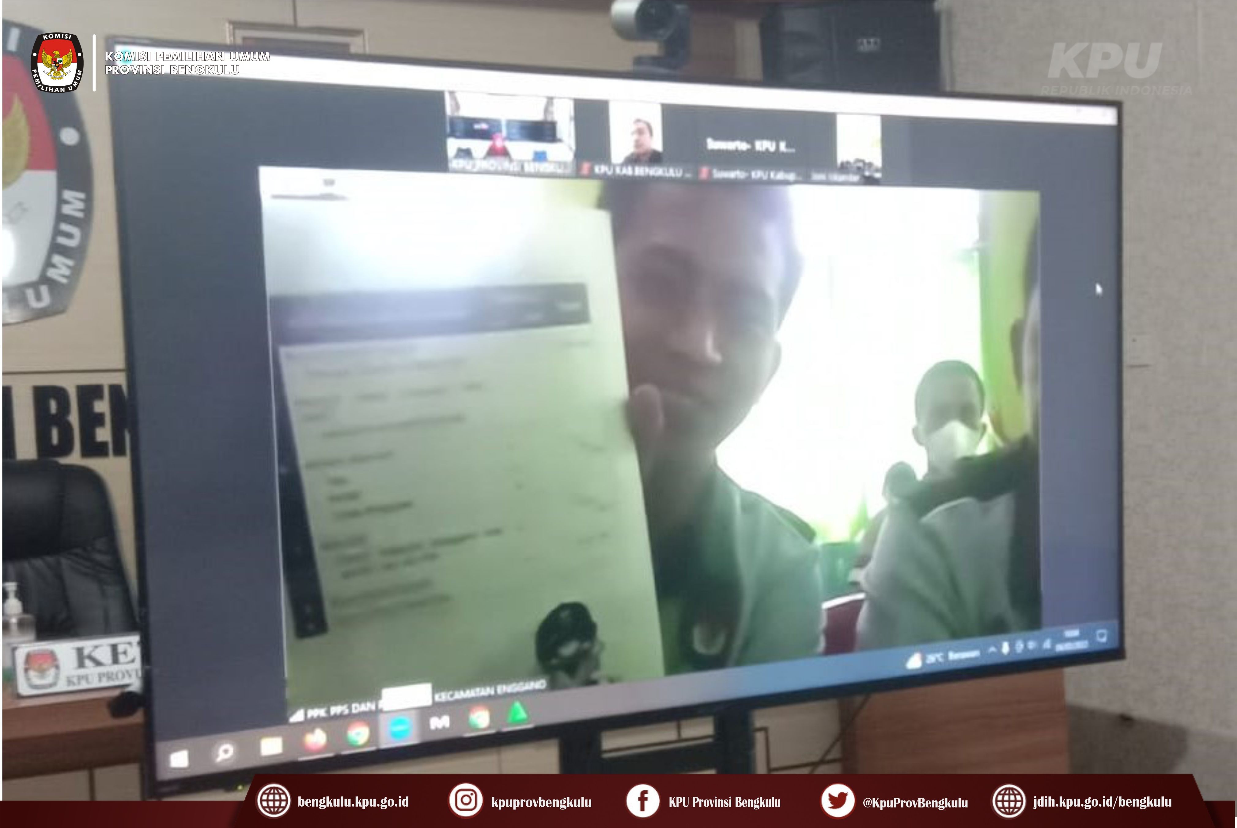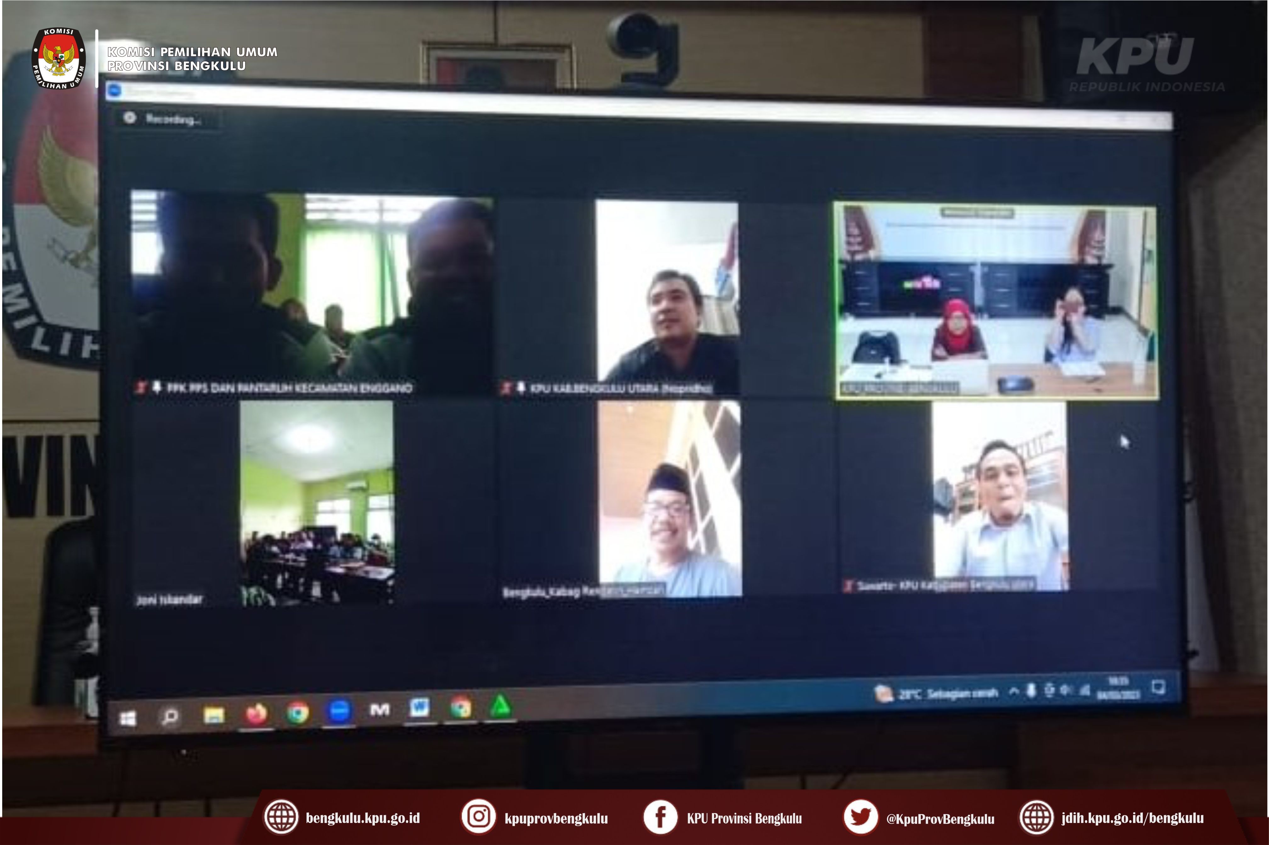 Bengkulu-bengkulu.kpu.go.id, Anggota KPU Provinsi Bengkulu Siti Baroroh didampingi Kabag Rendatin Hamzah dan Kasubbag Data dan Informasi Yunita Dika Fitri hadir dalam Rapat Koordinasi Perkembangan dan Evaluasi Hasil Coklit di Kecamatan Enggano Kabupaten Bengkulu Utara secara daring (zoom meeting) pada Sabtu (4/3/2023). ‘