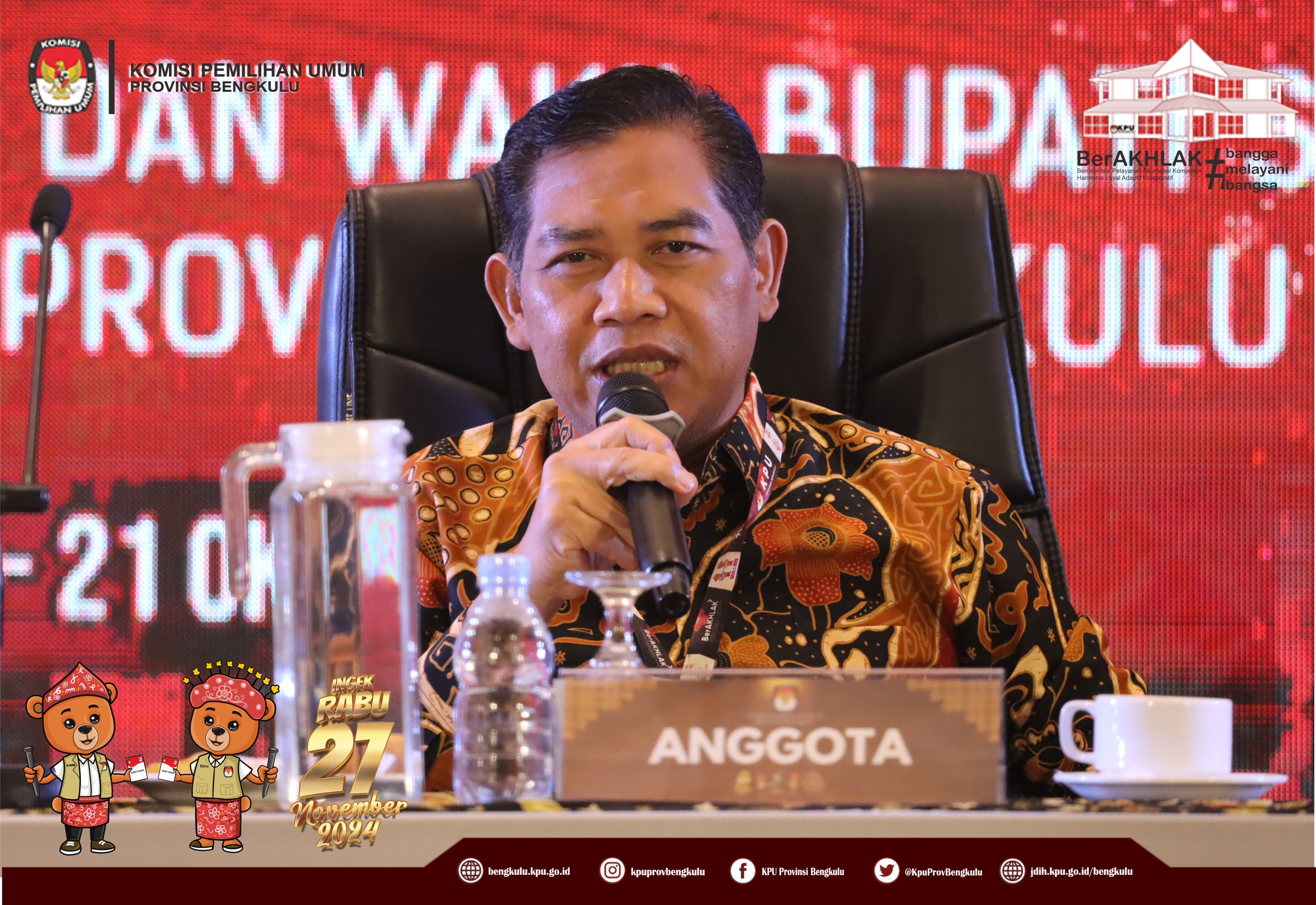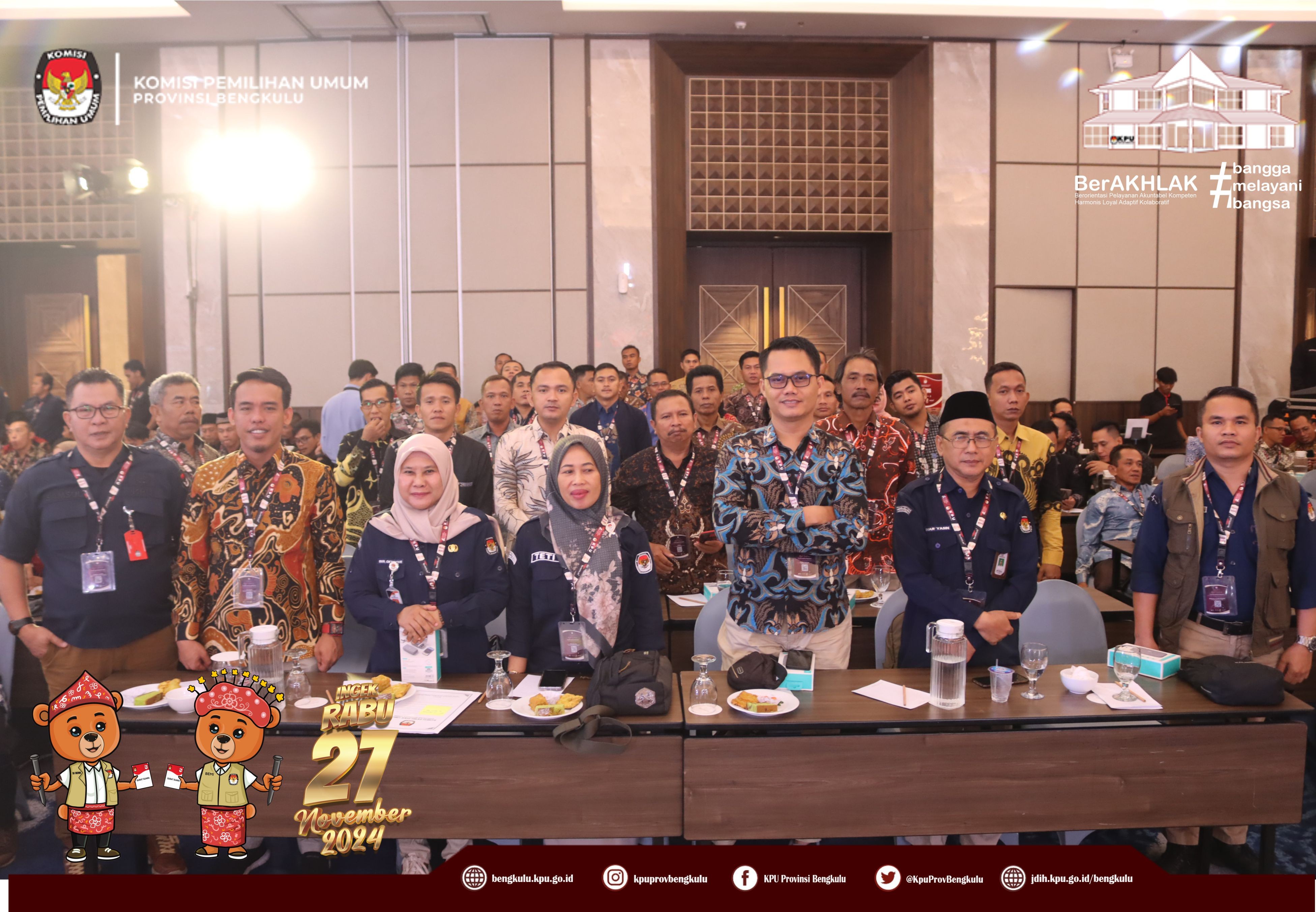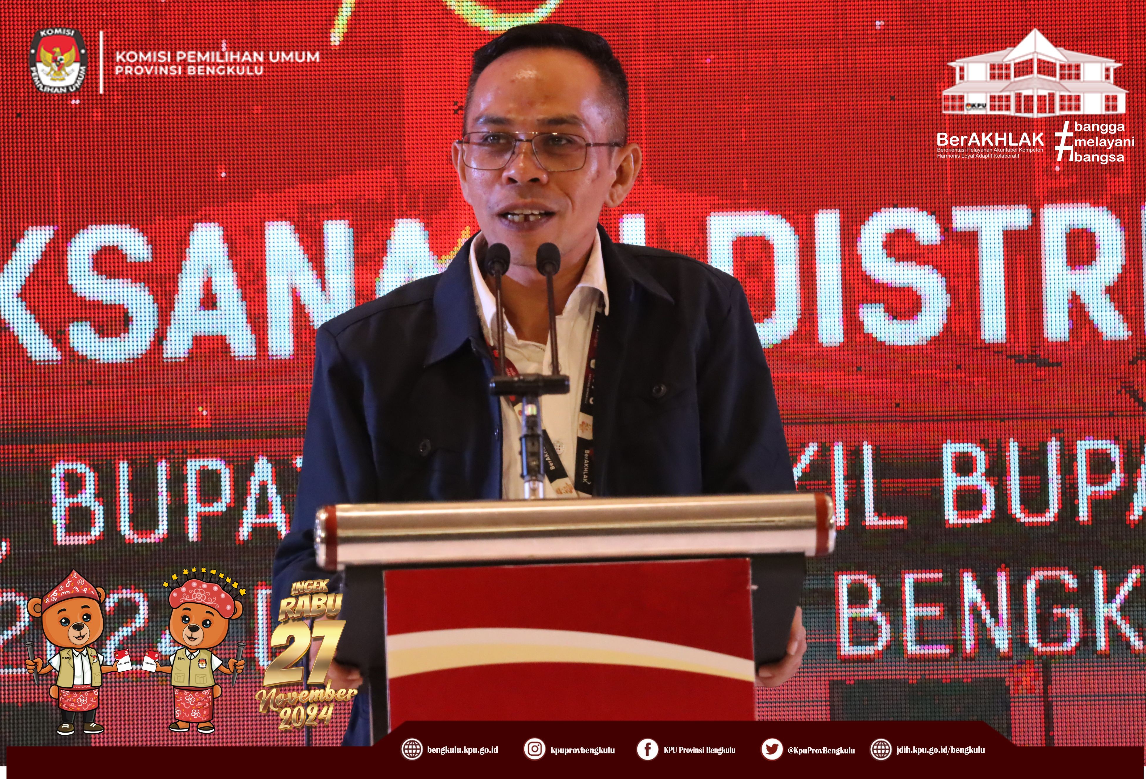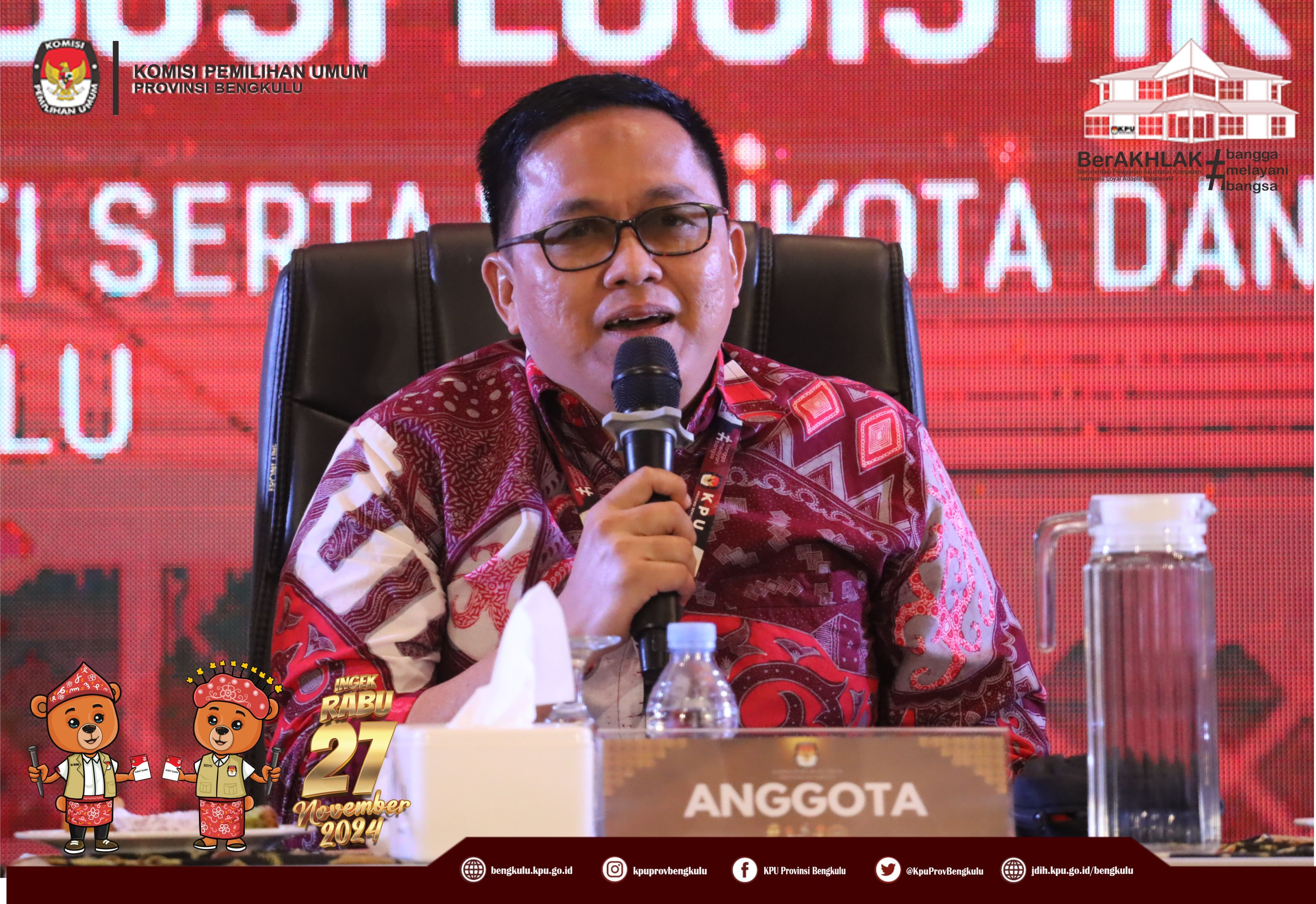 Bengkulu, bengkulu.kpu.go.id - Ketua KPU Provinsi Bengkulu Bapak Rusman Sudarsono, Anggota KPU Provinsi Bengkulu Bapak Alpin Samsen, Bapak Dodi Hendra Supiarso, Bapak Emex Verzoni dan Bapak Sarjan Efendi serta Sekretaris Kemas Mohammad Ajir membuka Rapat Koordinasi Persiapan Pelaksanaan Distribusi Logistik Pemilihan Gubernur dan Wakil Gubernur, Bupati dan Wakil Bupati serta Walikota Wakil Walikota Tahun 2024 di Provinsi Bengkulu, Sabtu (19/10/2024) di Hotel Mercure Bengkulu. Hadir dalam rapat koordinasi adalah Ketua, Sekretaris, Kasubbag Keuangan Umum dan Logistik, Pejabat Pembuat Komitmen (PPK), Operator SIlog KPU Kabupaten/Kota se-Provinsi Bengkulu serta Ketua dan Sekretaris Panitia Pemilihan Kecamatan (PPK) Kabupaten/Kota se-Provinsi Bengkulu. Bapak Rusman dalam arahannya menyampaikan bahwa rapat koordinasi ini dilaksanakan dalam rangka menyamakan persepsi dan pemahaman kepada seluruh peserta yang hadir terkait pengelolaan dan persiapan distribusi logistik. Sementara itu, dalam arahannya Bapak Sarjan meminta kepada seluruh Jajaran KPU Kabupaten/Kota dan Badan Adhoc untuk serius dan terdokumentasi dengan baik dalam pengelolaan dan pendistribusian logistik tingkat hingga ke tingkat TPS. Bapak Alpin menyampaikan ucapan terima kasih dan apresiasi kepada KPU Kabupaten/Kota, PPK, PPS dan Pantarlih yang telah melaksanakan tugas dengan baik dalam pemutakhiran data pemilih sampai dengan penetapan DPT tingkat Provinsi Bengkulu. Bapak Emex menegaskan kepada penyelenggara pemilihan KPU Kabupaten/Kota, PPk, PPS dan KPPS untuk bekerja secara profesional, berintegritas dan menjaga soliditas dalam menyukseskan pilkada serentak di Provinsi Bengkulu, Bapak Dodi meminta kepada seluruh jajaran badan adhoc untuk memahami tupoksi dan tugas dalam pengelolaan logistik hingga ke TPS, serta Bapak Kemas menegaskan kepada jajaran sekretariat baik KPU Kabupaten/Kota, PPK, dan PPS untuk membantu dan memfasilitasi pelaksanaan penyelenggaraan pemilihan serentak pada Rabu 27 November 2024 dan mendokumentasikan secara tertib dan baik untuk setiap proses tahapan kegiatan pemilihan Tahun 2024.