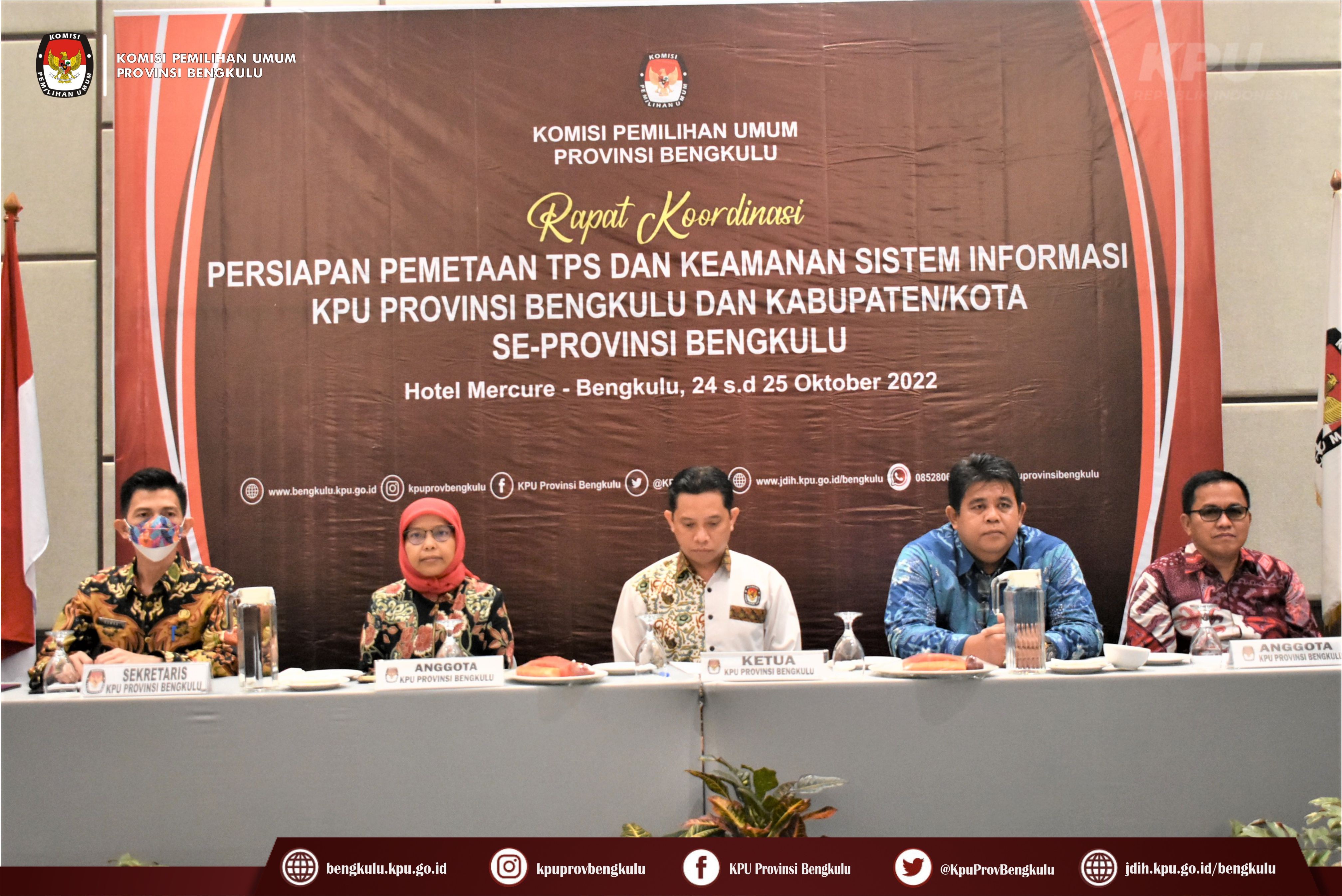 Bengkulu-bengkulu.kpu.go.id, Ketua KPU Provinsi Bengkulu Irwan Saputra, Anggota KPU Provinsi Bengkulu Siti Baroroh, Darlinsyah dan Emex Verzoni serta Sekretaris Kemas Mohammad Ajir membuka kegiatan Rapat Koordinasi Persiapan Pemetaan TPS dan Keamanan Sistem Informasi KPU Provinsi Bengkulu dan KPU Kabupaten/Kota se-Provinsi Bengkulu di Mercure Hotel Bengkulu, Selasa (24/10).