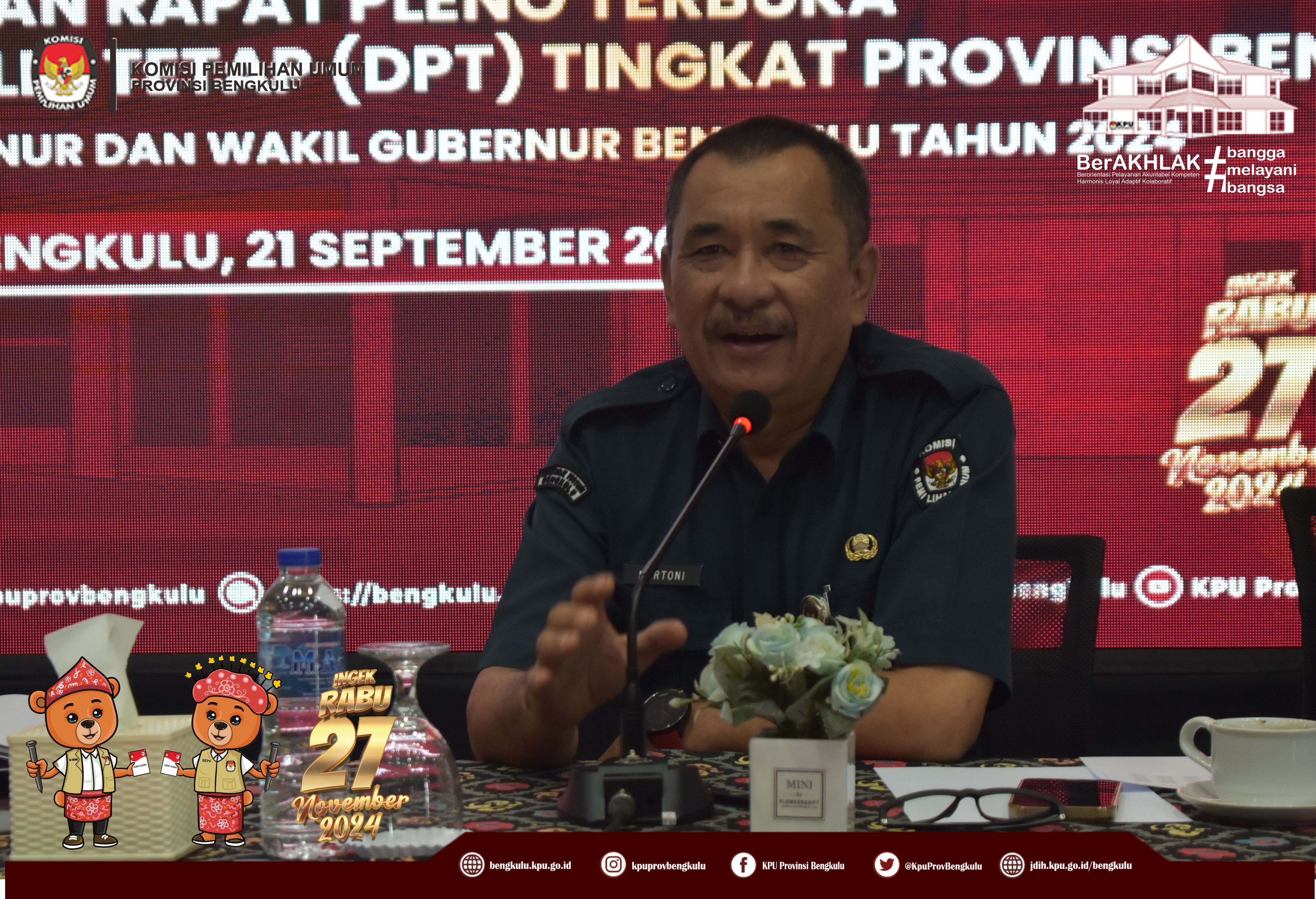 Bengkulu, bengkulu.kpu.go.id - Ketua KPU Provinsi Bengkulu Rusman Sudarsono, Anggota KPU Provinsi Bengkulu Alpin Samsen, Dodi Hendra Supiarso, dan Sarjan Efendi serta Sekretaris Kemas Mohammad Ajir membuka Rapat Koordinasi Persiapan Rapat Pleno Terbuka Rekapitulasi Daftar Pemilih Tetap (DPT) Tingkat Provinsi Bengkulu Pada Pemilihan Gubernur dan Wakil Gubernur Bengkulu Tahun 2024, Sabtu (21/9/2024) di Grage Hotel Bengkulu. Hadir Ketua, Anggota, Sekretaris Kasubbag Perencanaan Data dan Informasi serta Admin/Operator Sidalih KPU Kabupaten/Kota se-Provinsi Bengkulu. Rusman menyampaikan bahwa rapat koordinasi ini dilaksanakan dalam rangka untuk menyamakan persepsi dan memitigasi permasalahan sebelum ditetapkan sebagai daftar pemilih tetap pemilihan serentak tahun 2024 di Provinsi Bengkulu. KPU Kabupaten/Kota secara bergantian memaparkan dan menjelaskan progres pelaksanaan Rekapitulasi Daftar Pemilih Tetap (DPT) yang telah dilaksanakan di tingkat Kabupaten/Kota.