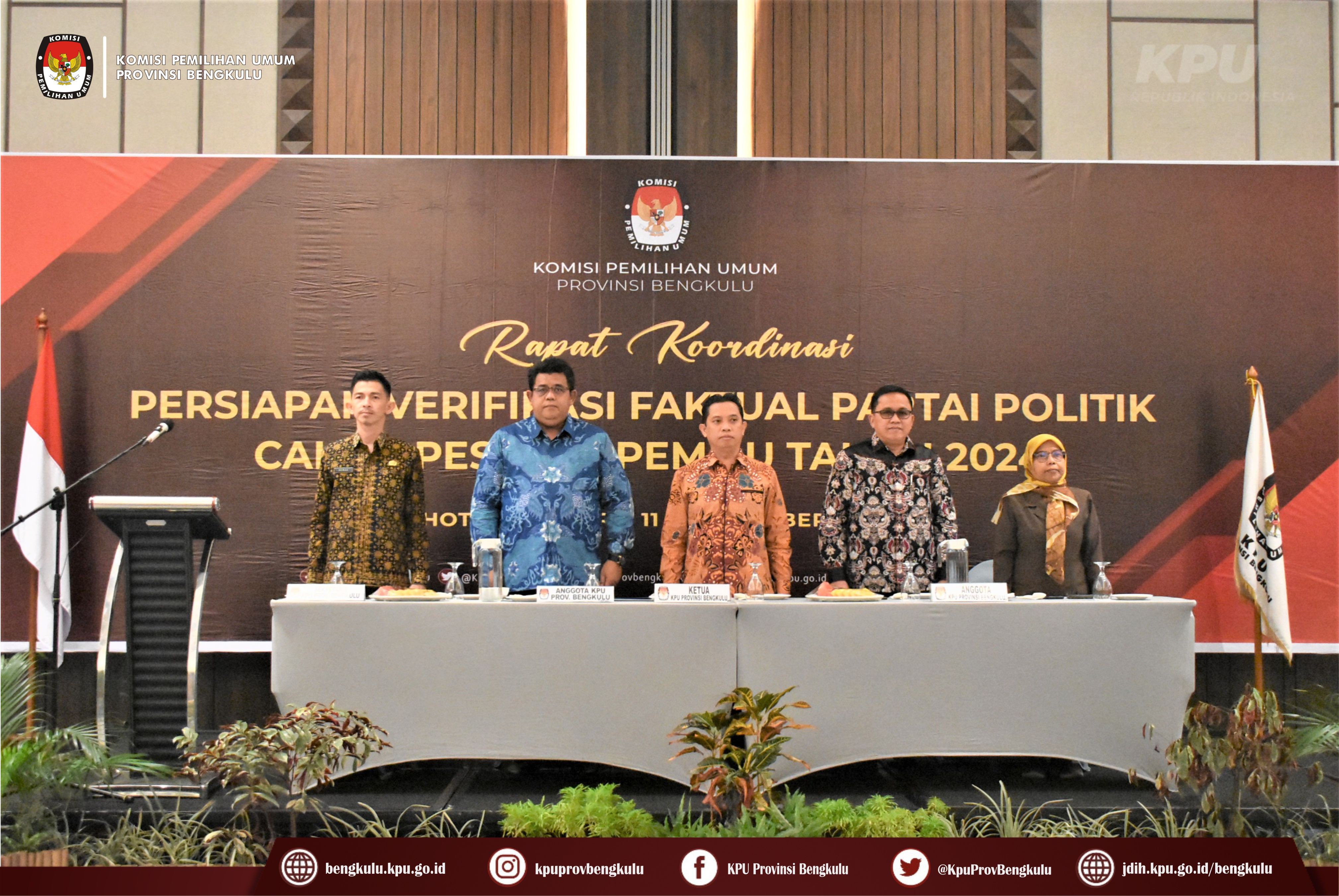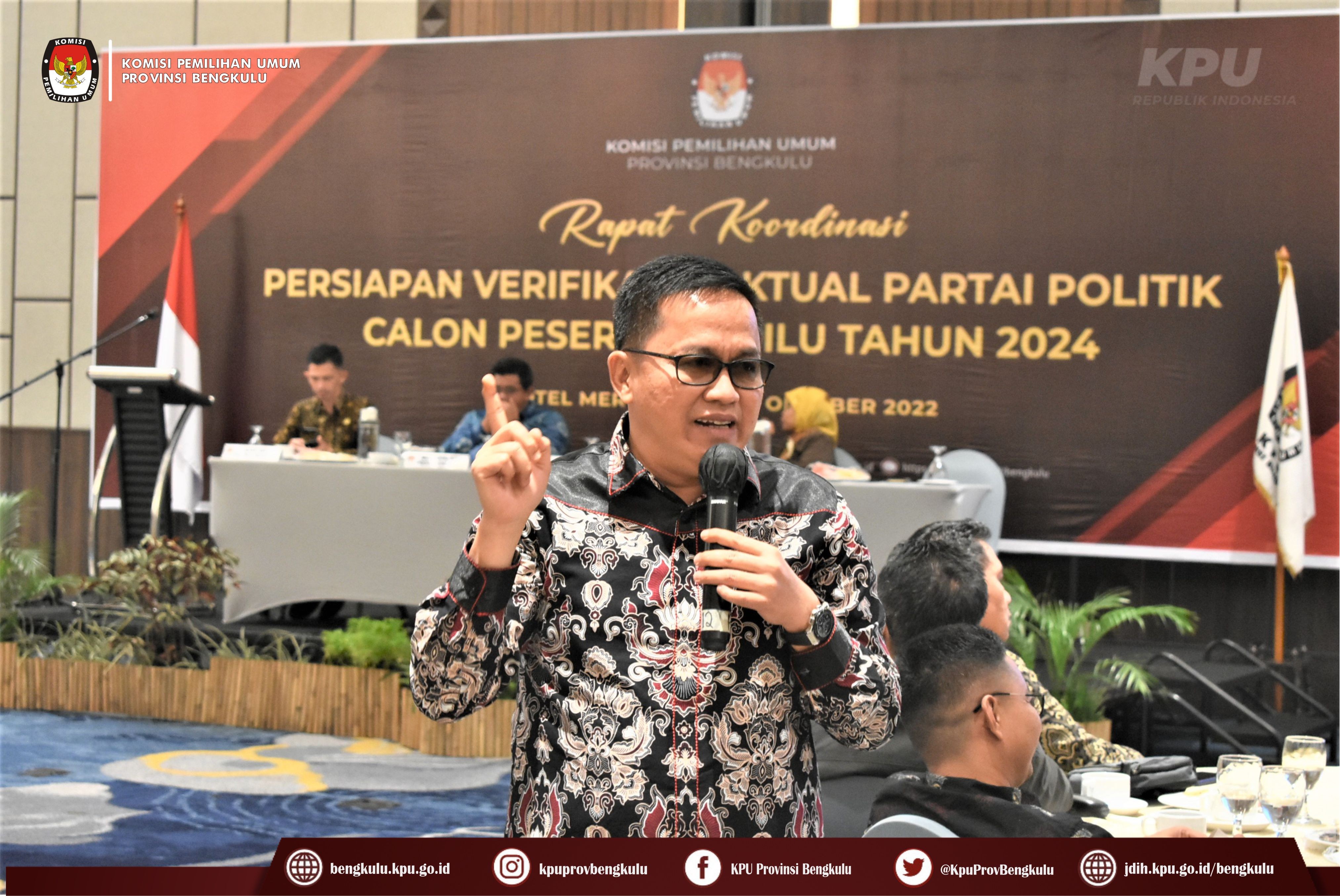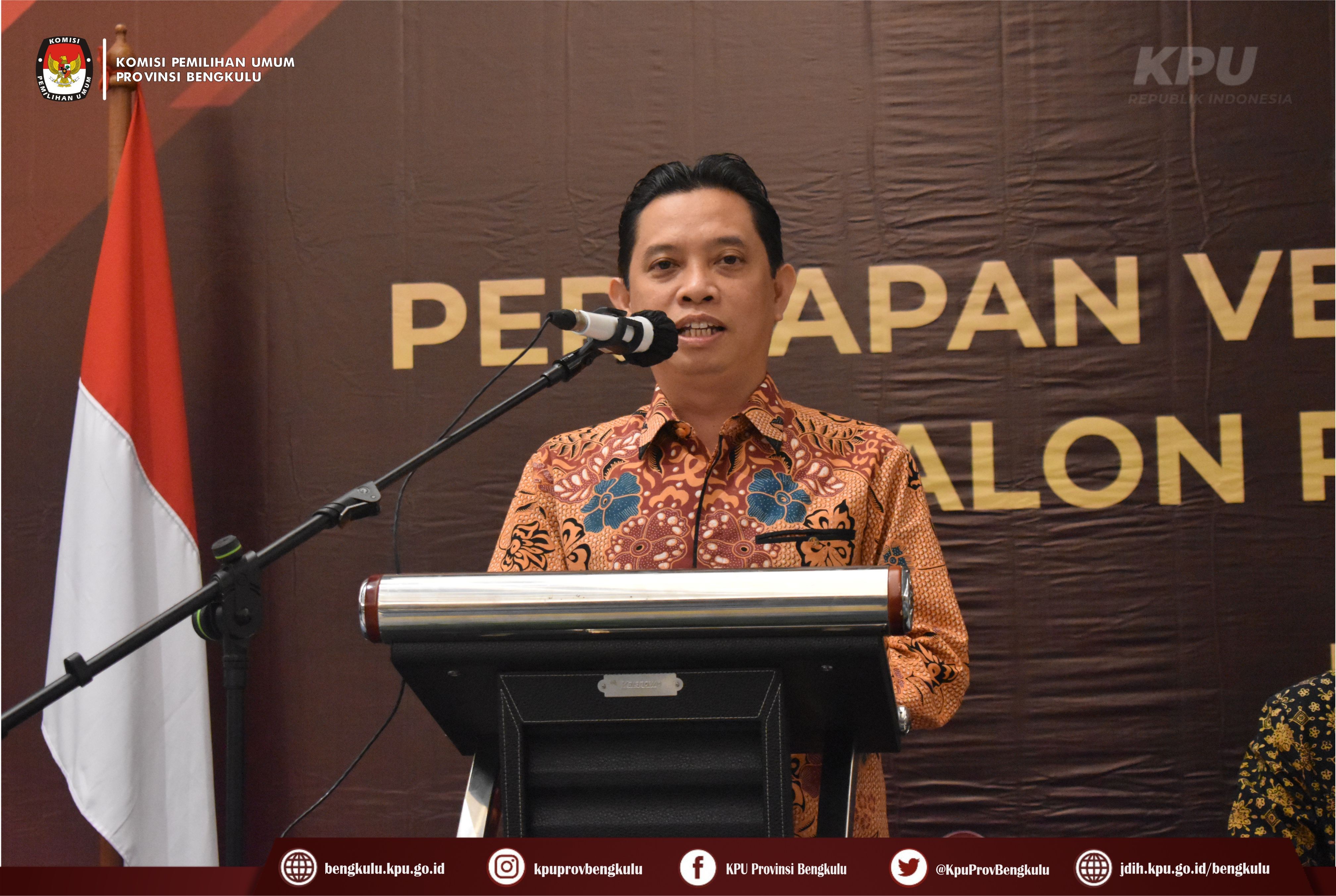 Bengkulu-bengkulu.kpu.go.id, Ketua KPU Provinsi Bengkulu Irwan Saputra didampingi Anggota KPU Provinsi Bengkulu Siti Baroroh, Darlinsyah dan Emex Verzoni serta Sekretaris Kemas Mohammad Ajir membuka acara Rapat Koordinasi Persiapan Verifikasi Faktual Partai Politik Calon Peserta Pemilu Tahun 2024 bertempat di Hotel Mercure Bengkulu, Selasa (11/10). Kegiatan rapat koordinasi ini diikuti oleh Ketua, Anggota, Sekretaris, Kasubbag Teknis Penyelenggaraan Pemilu, Partisipasi dan Hubungan Masyarakat serta Operator SIPOL KPU Kabupaten/Kota se-Provinsi Bengkulu serta Anggota Bawaslu Divisi Hukum Penanganan Pelanggaran dan Penyelesaian Sengketa Kabupaten/Kota se-Provinsi Bengkulu. Dalam arahannya Irwan menyampaikan bahwa kegiatan ini penting dilaksanakan dalam rangka menyamakan persepsi dan pemahaman antara KPU dan Bawaslu dalam persiapan pelaksanaan Verifikasi Faktual Partai Politik Calon Peserta Pemilu Tahun 2024.