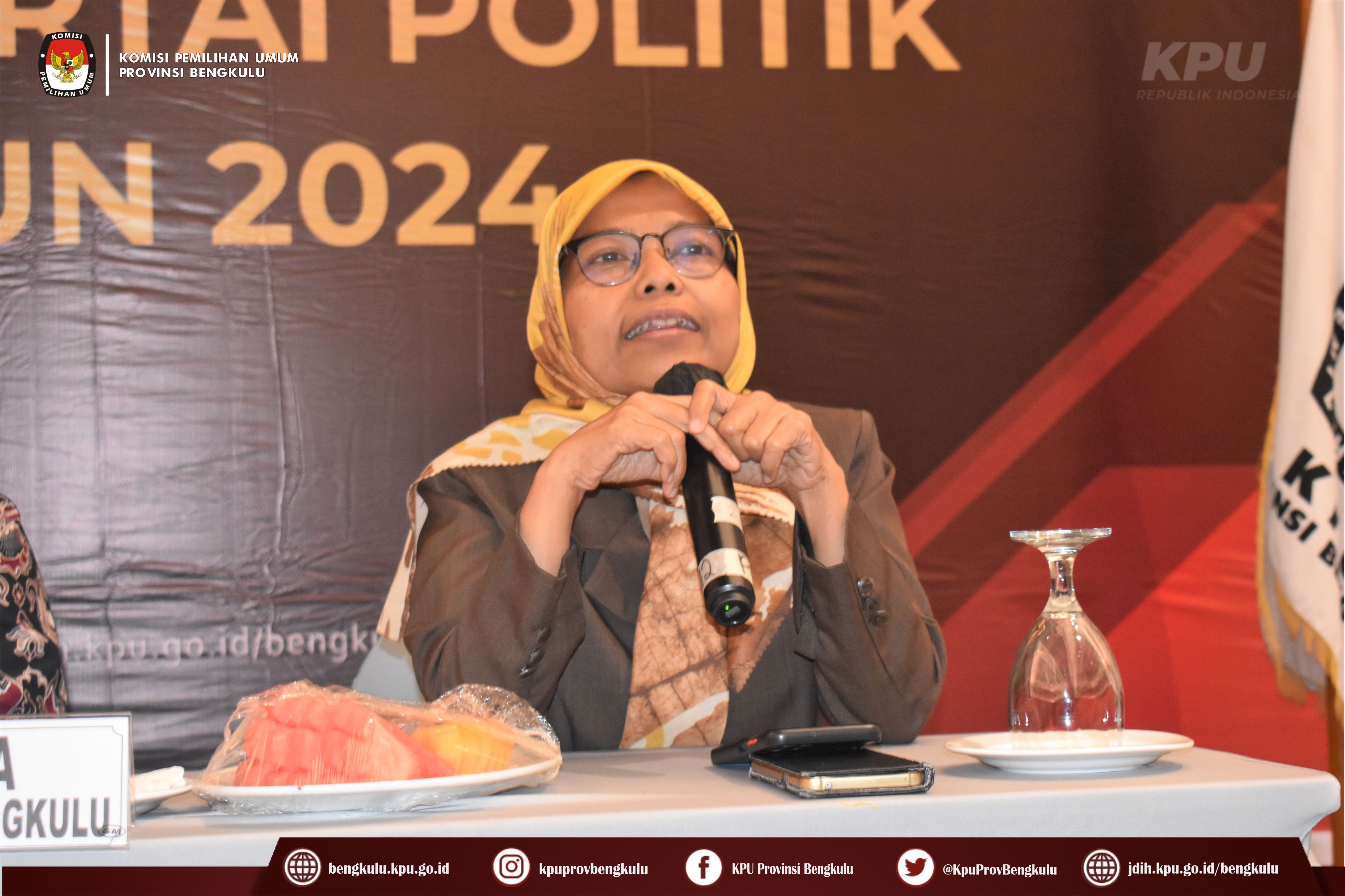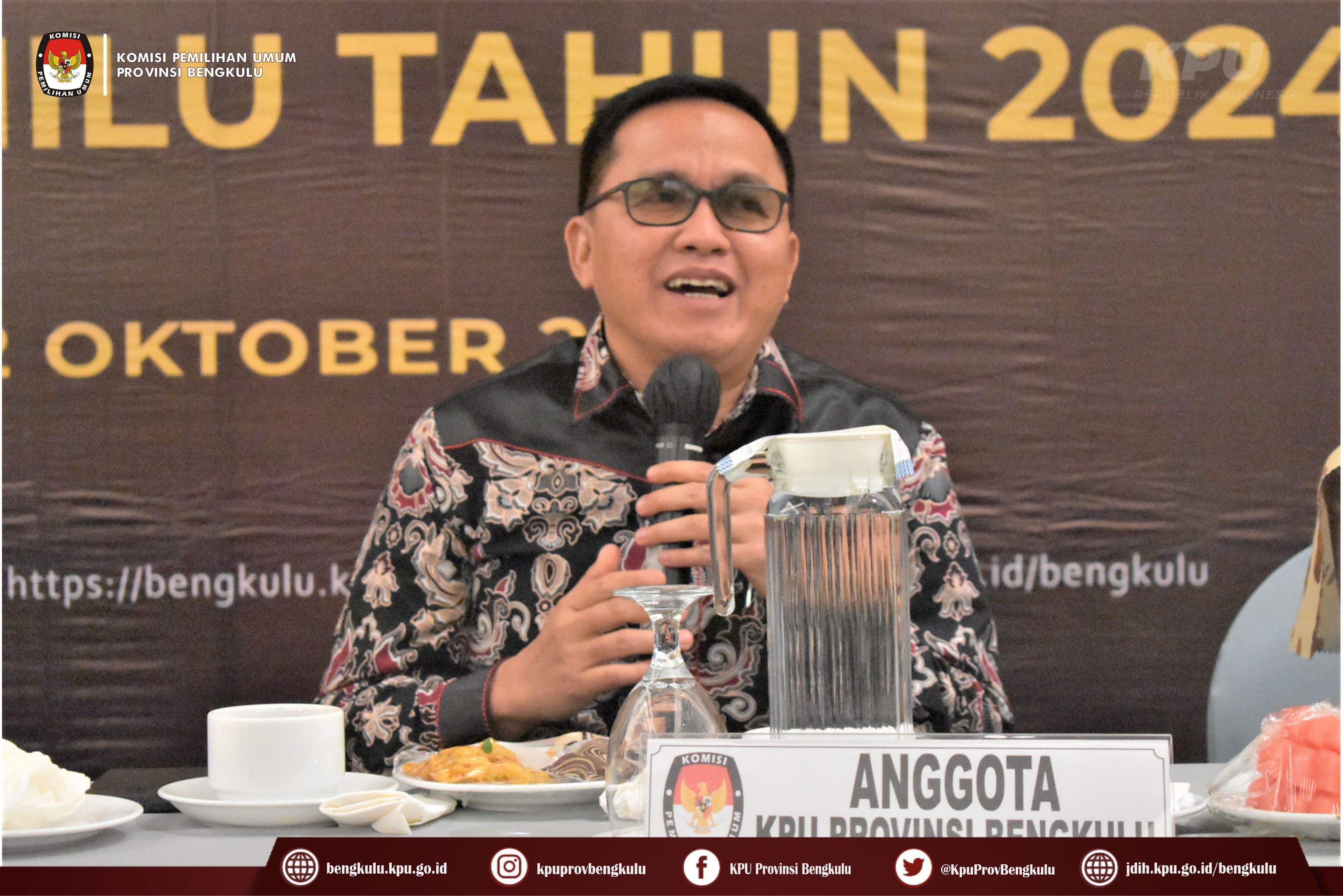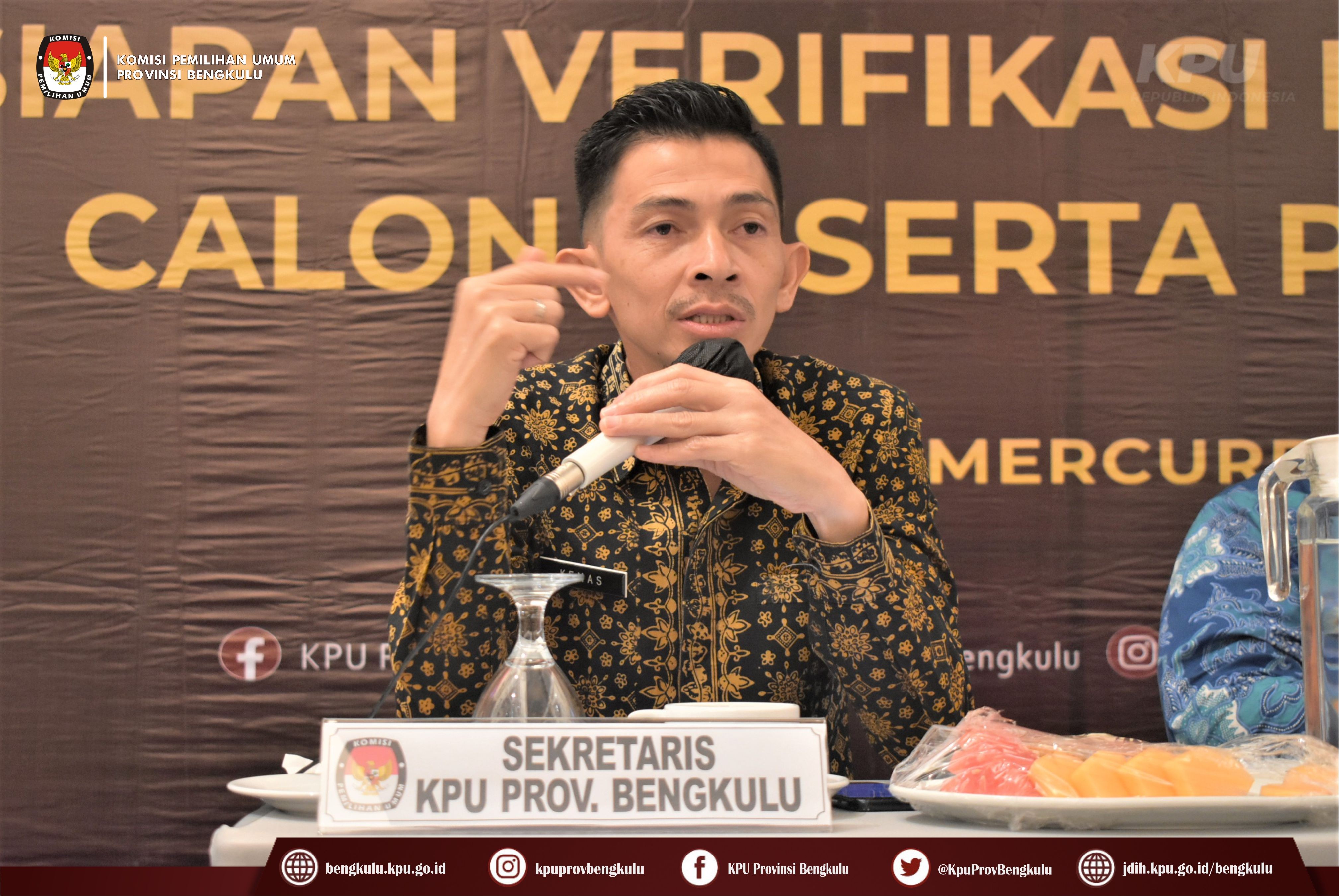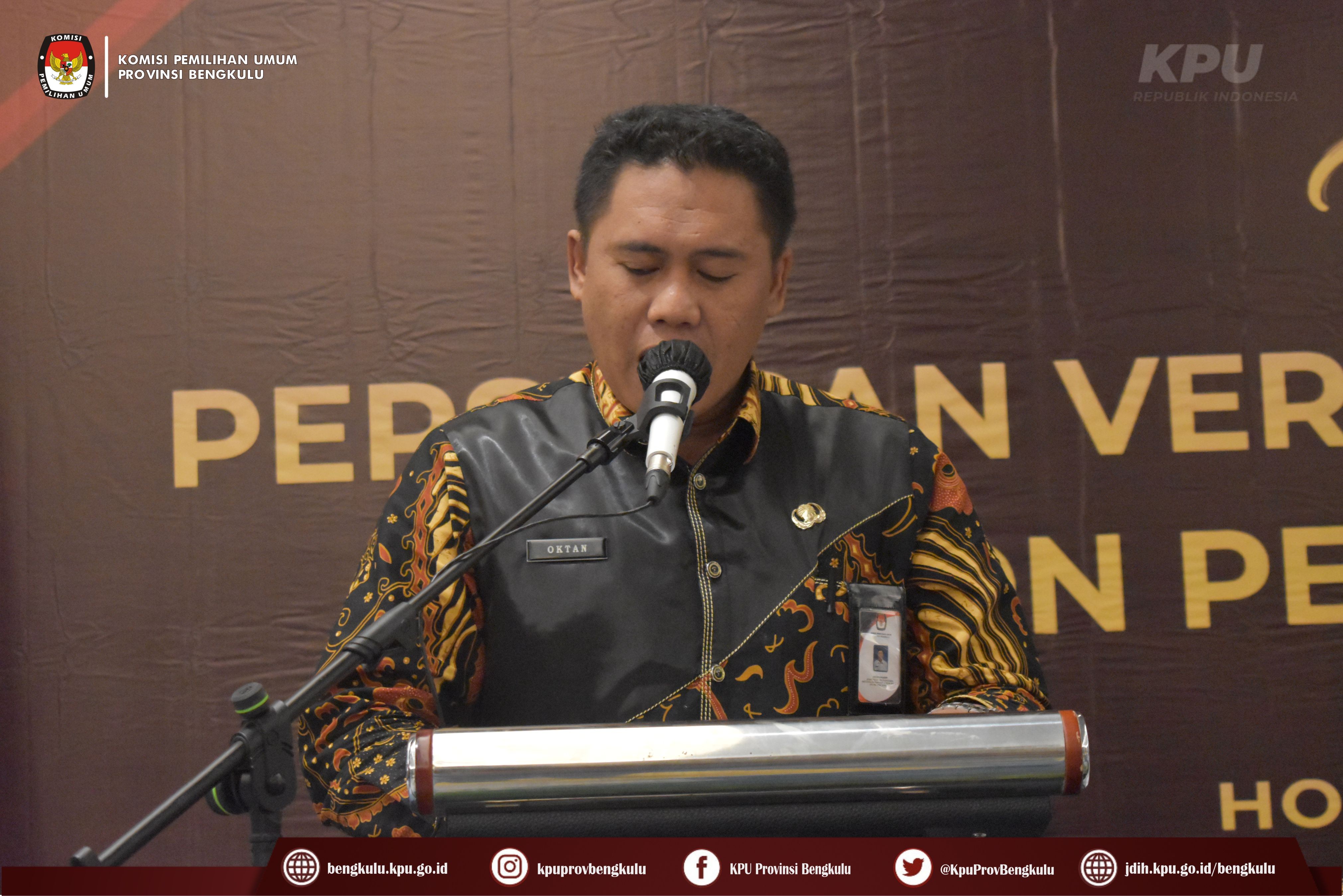 Bengkulu-bengkulu.kpu.go.id, Ketua KPU Provinsi Bengkulu Irwan Saputra didampingi Anggota KPU Provinsi Bengkulu Siti Baroroh, Darlinsyah dan Emex Verzoni serta Sekretaris Kemas Mohammad Ajir membuka acara Rapat Koordinasi Persiapan Verifikasi Faktual Partai Politik Calon Peserta Pemilu Tahun 2024 bertempat di Hotel Mercure Bengkulu, Selasa (11/10). Kegiatan rapat koordinasi ini diikuti oleh Ketua, Anggota, Sekretaris, Kasubbag Teknis Penyelenggaraan Pemilu, Partisipasi dan Hubungan Masyarakat serta Operator SIPOL KPU Kabupaten/Kota se-Provinsi Bengkulu serta Anggota Bawaslu Divisi Hukum Penanganan Pelanggaran dan Penyelesaian Sengketa Kabupaten/Kota se-Provinsi Bengkulu. Dalam arahannya Irwan menyampaikan bahwa kegiatan ini penting dilaksanakan dalam rangka menyamakan persepsi dan pemahaman antara KPU dan Bawaslu dalam persiapan pelaksanaan Verifikasi Faktual Partai Politik Calon Peserta Pemilu Tahun 2024.
