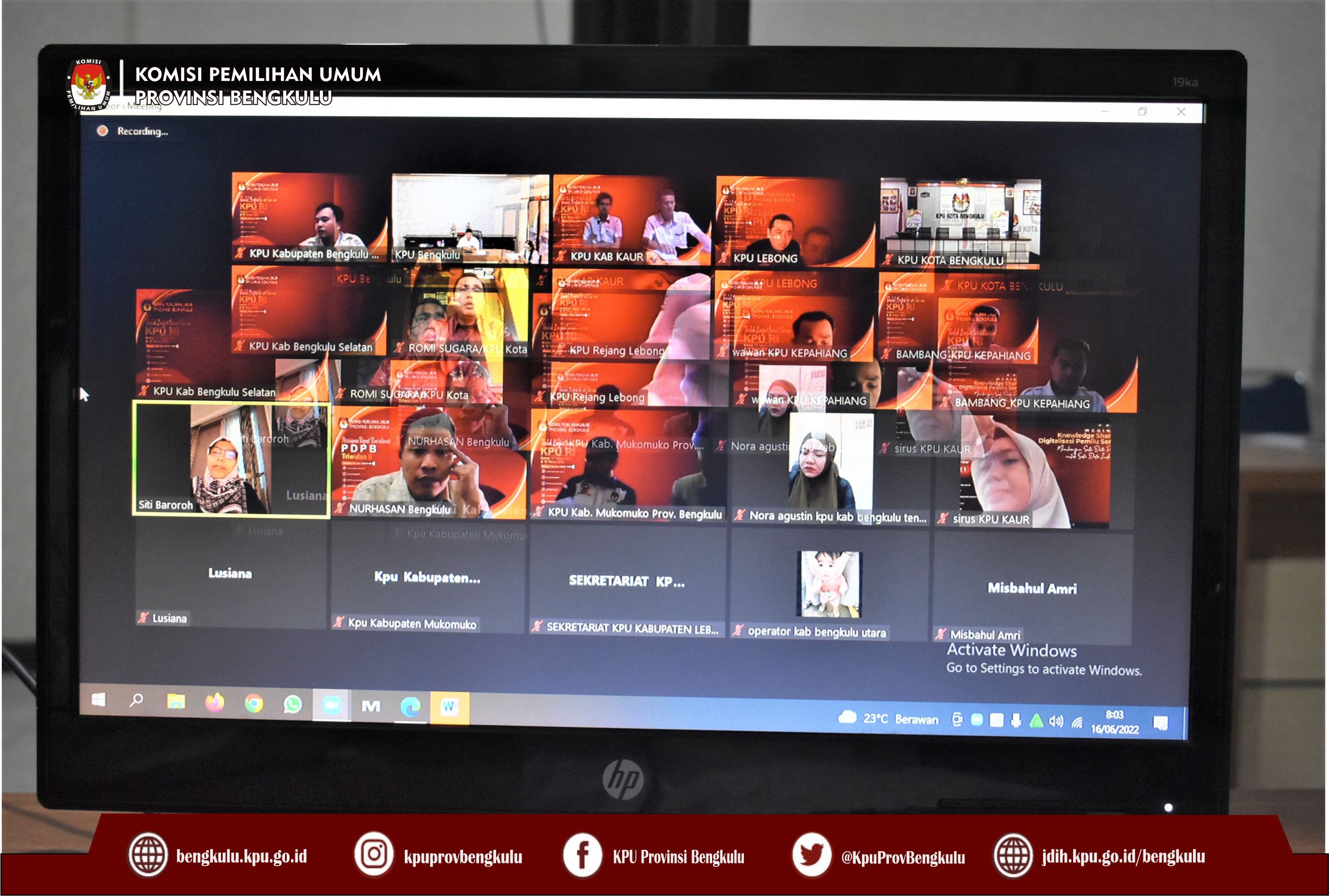 Bengkulu-bengkulu.kpu.go.id, Anggota KPU Provinsi Bengkulu Siti Baroroh membuka kegiatan Rapat Koordinasi Tindak Lanjut Surat Edaran KPU Republik Indonesia Nomor 17 dan 18 Tahun 2022 sekaligus memberikan arahan yang dilaksanakan secara daring (zoom meeting) Kamis (16/6). Rapat koordinasi tersebut diikuti Kabag Perencanaan Data dan Informasi Hamzah, Kasubbag Data dan Informasi Yunita Dika Fitri dan Operator Sidalih KPU Provinsi Bengkulu, Anggota Divisi Perencanaan Data dan Informasi, Kasubbag Data dan Informasi serta Operator Sidalih KPU Kabupaten/Kota Se-Provinsi Bengkulu. Dalam arahannya Siti baroroh menyampaikan agar mempedomani kedua surat dimaksud diatas agar menjadi acuan untuk melakukan pencermatan dan menindaklanjuti hasil pemadanan DPB Semester II Tahun 2021 dengan Data Kependudukan Kemendagri dan Petunjuk Teknis Penggunaan Aplikasi mobile lindungihakmu.