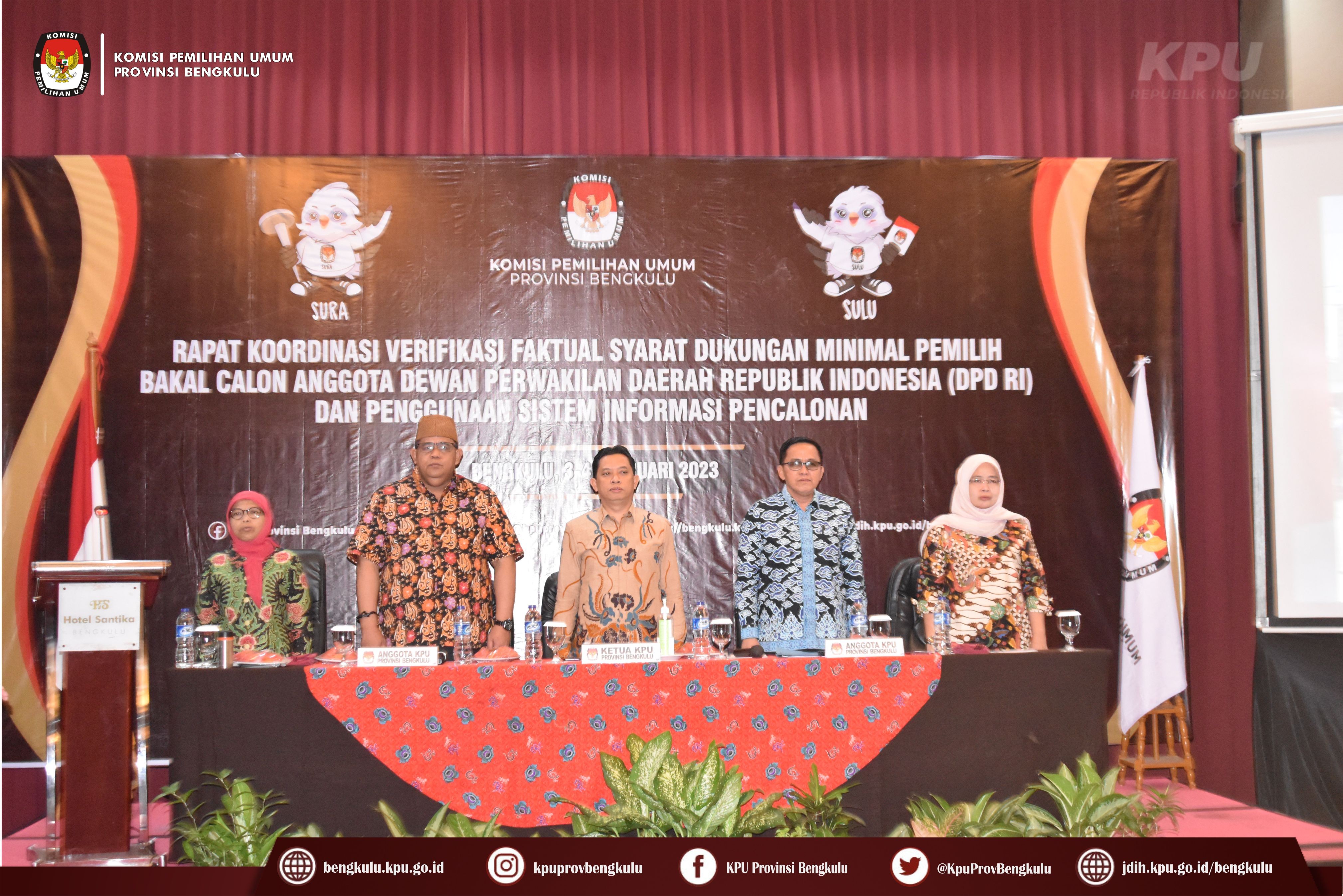 Bewngkulu-bengkulu.kpu.go.id, Ketua KPU Provinsi Bengkulu Irwan Saputra bersama Anggota KPU Provinsi Bengkulu Siti Baroroh, Darlinsyah, Emex Verzoni, dan Irna Riza Yuliastuty serta Sekretaris Kemas Mohammad Ajir membuka Rapat Koordinasi Verifikasi Faktual Syarat Dukungan Minimal Pemilih Bakal Calon Perseorangan Anggota Dewan Perwakilan Daerah (DPD) RI dan Penggunaan Sistem Informasi Pencalonan (SILON) bertempat di Hotel Santika Bengkulu, Jum’at (3/2/2023).