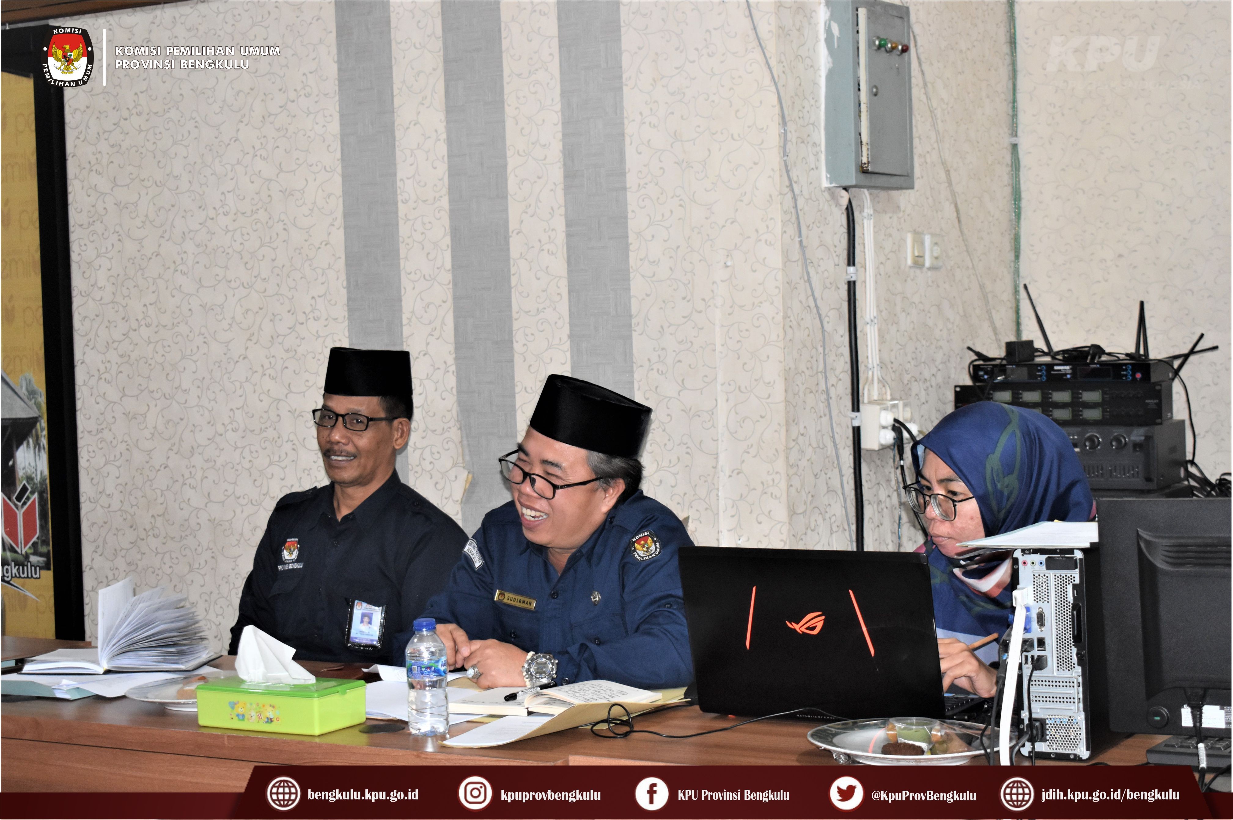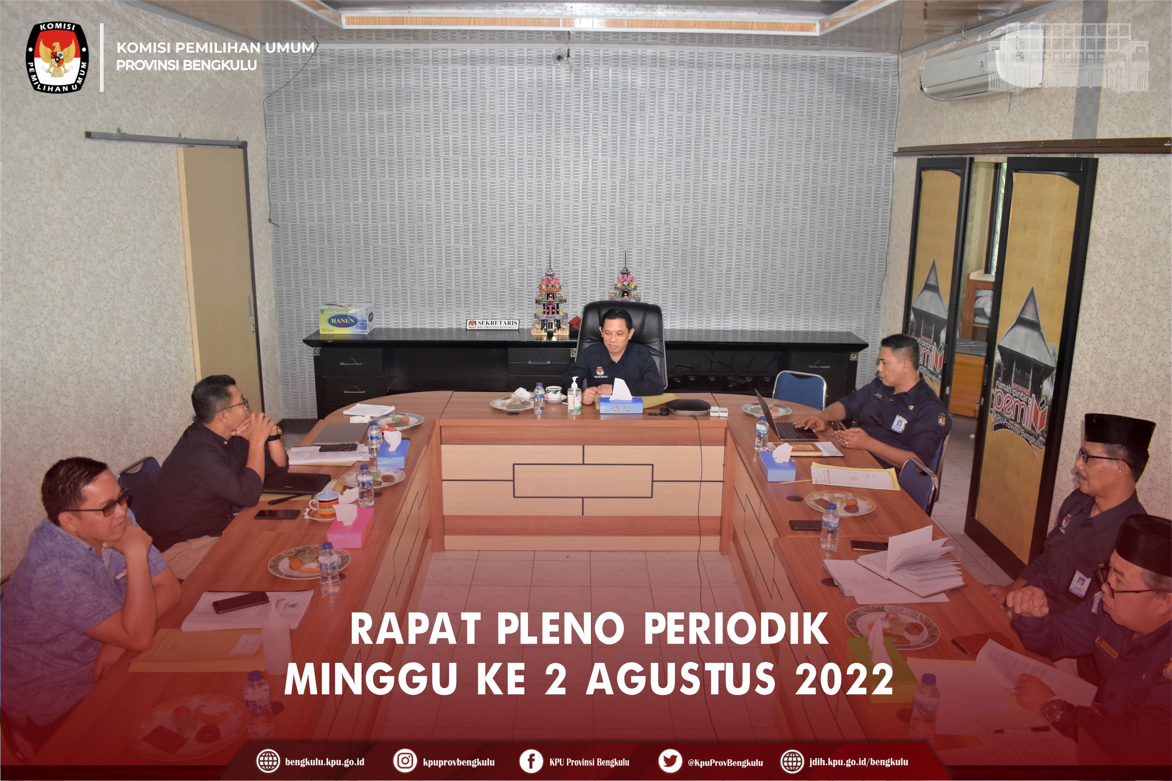 Bengkulu-bengkulu.kpu.go.id, KPU Provinsi Bengkulu melaksanakan Rapat Pleno Periodik Minggu ke-2 Agustus 2022 di Ruang Audio Visual Rumah Pintar Pemilu, Selasa (9/8). Rapat Pleno diikuti Ketua KPU Provinsi Bengkulu Irwan Saputra, Anggota KPU Provinsi Bengkulu Eko Sugianto, Siti Baroroh, Darlinsyah dan Emex Verzoni, serta kabag. Agenda yang dibahas dalam rapat, yaitu rencana bedah Keputusan Komisi Pemilihan Umum Nomor 260 Tahun 2022 tentang Pedoman Teknis Bagi Komisi Pemilihan Umum, Komisi Pemilihan Umum Provinsi, dan Komisi Pemilihan Umum Kabupaten/Kota Dalam Pelaksanaan Pendaftaran, Verifikasi, dan Penetapan Partai Politik Peserta Pemilihan Umum Anggota Dewan Perwakilan Rakyat dan Dewan Perwakilan Rakyat Daerah, dan Jadwal pemusnahan dokumen inaktif.