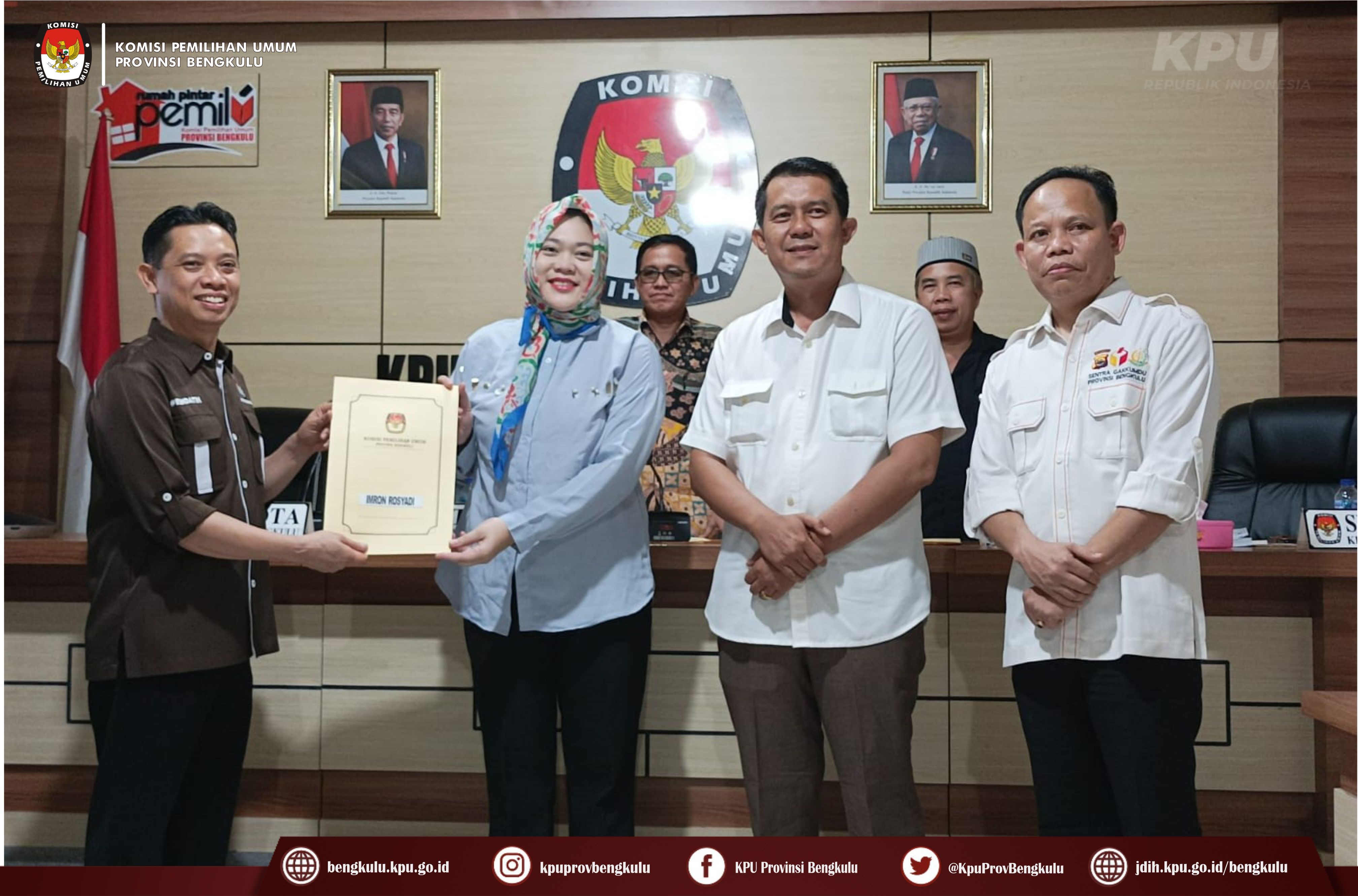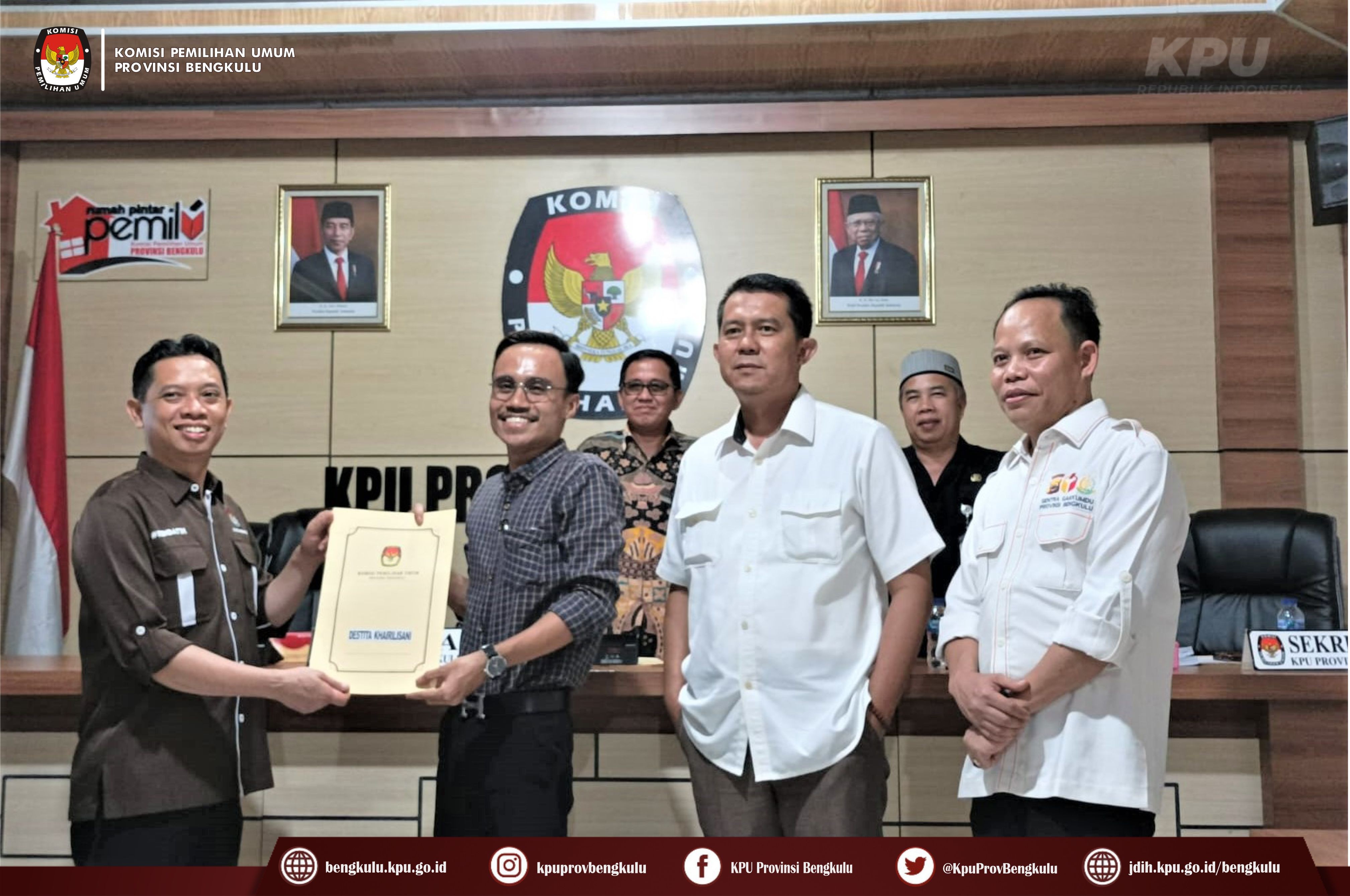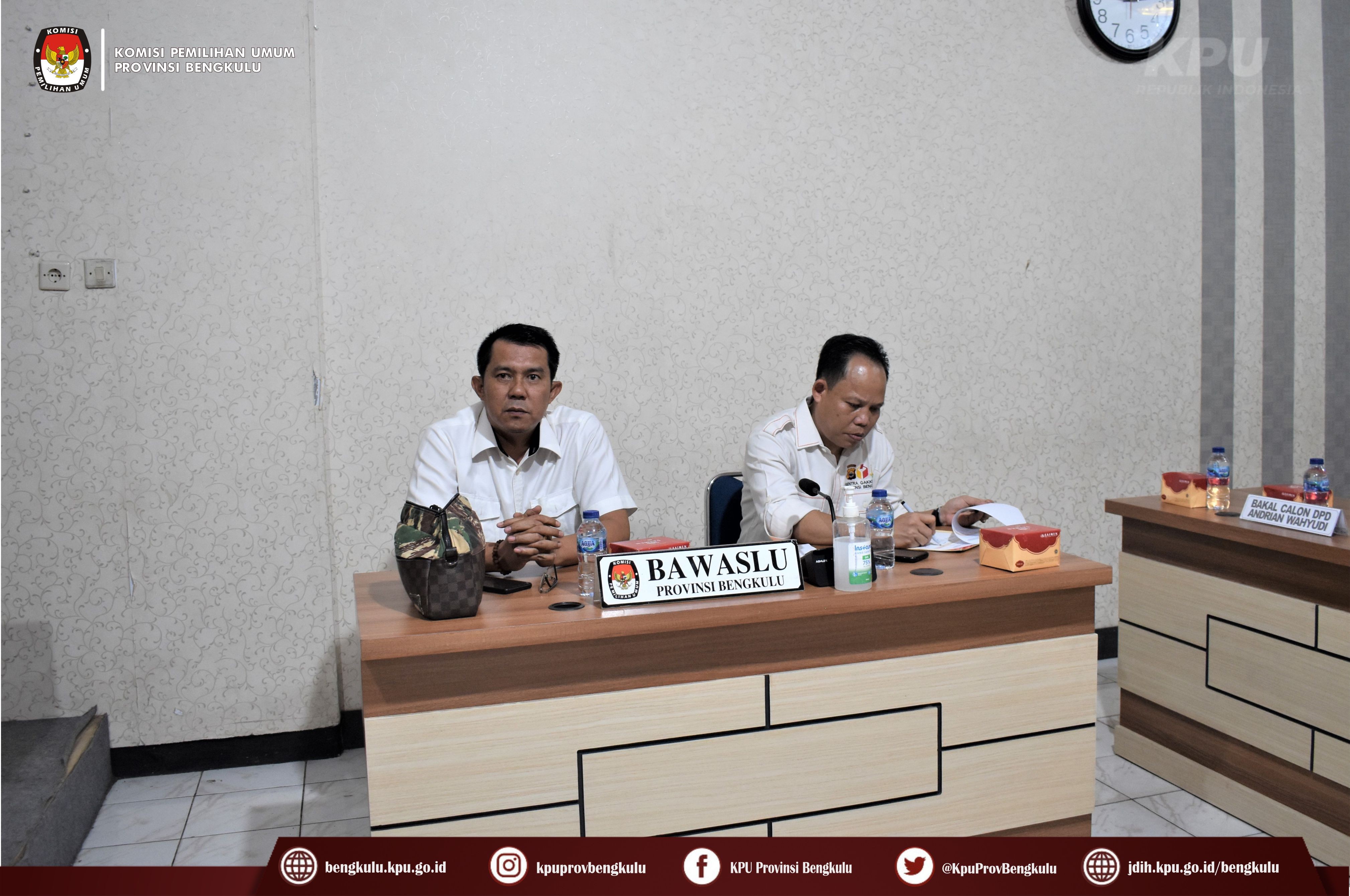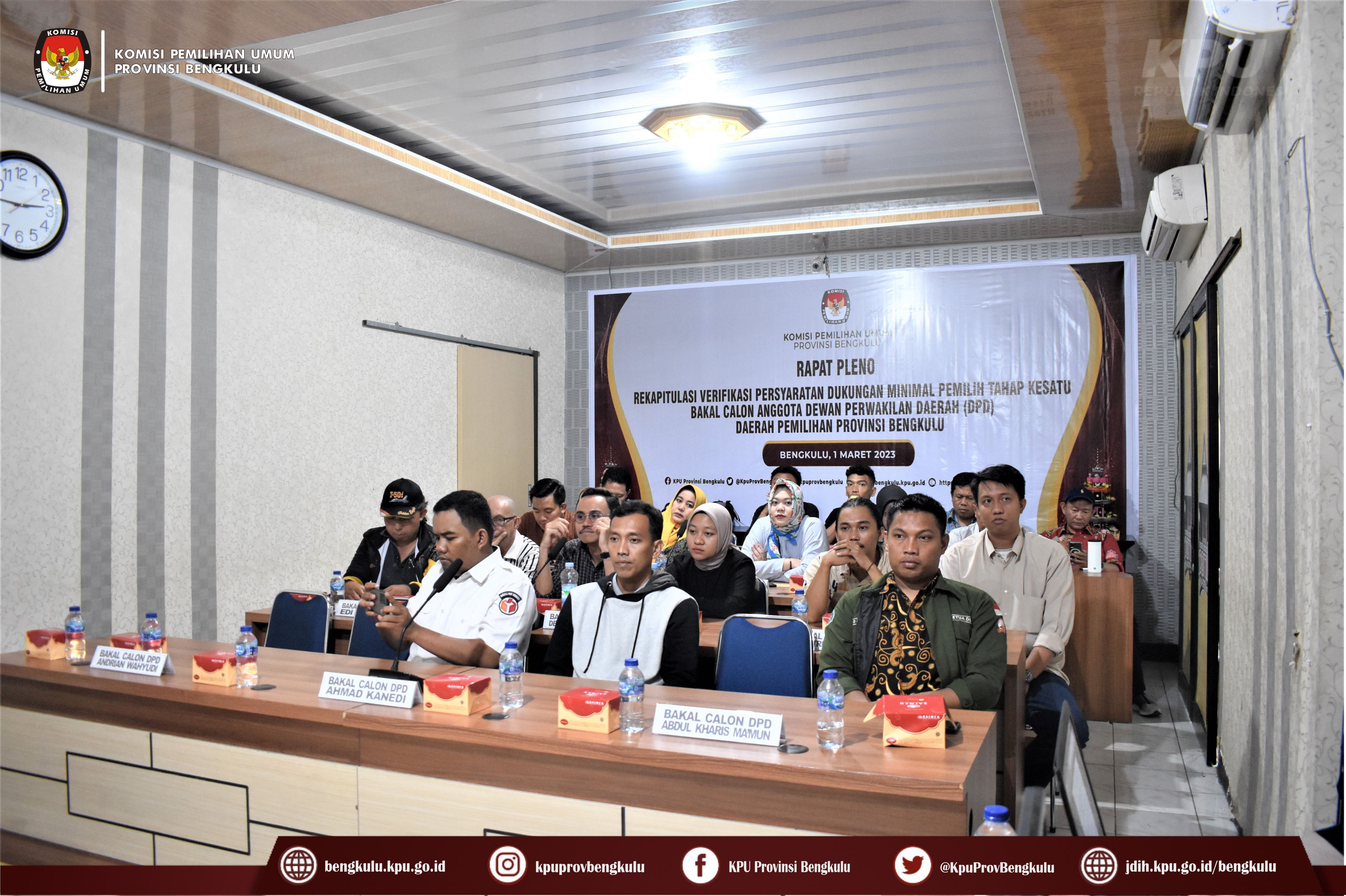 Bengkulu-bengkulu.kpu.go.id, Ketua KPU Provinsi Bengkulu Irwan Saputra bersama Anggota Emex Verzoni dan Darlinsyah serta Irna Riza Yuliastuty melalui zoom meeting dan Plh.Sekretaris KPU Provinsi Bengkulu Sudirman hadir sekaligus membuka Rapat Pleno Rekapitulasi Verifikasi Persyaratan Dukungan Minimal Pemilih Tahap Kesatu Bakal Calon Anggota DPD RI Dapil Provinsi Bengkulu di Ruang Audio Visual Rumah Pintar Pemilu, Rabu (1/3/2023). Hadir dalam rapat tersebut adalah Ketua Bawaslu Provinsi Bengkulu Halid Saifullah dan Anggota Dodi Herwansyah, Petugas Penghubung (LO), Admin dan Operator Silon Bakal Calon Anggota DPD Dapil Provinsi Bengkulu. Hasil rapat pleno menyatakan dari 12 (dua belas) bakal calon tersebut ada 8 (delapan) bakal calon dinyatakan memenuhi syarat (BMS) dan 4 (empat) bakal calon belum memenuhi syarat (BMS). Bagi bakal calon yang belum memenuhi syarat akan melakukan menyerahkan dukungan minimal pemilih perbaikan kedua pada tanggal 2 s.d 11 Maret 2023.