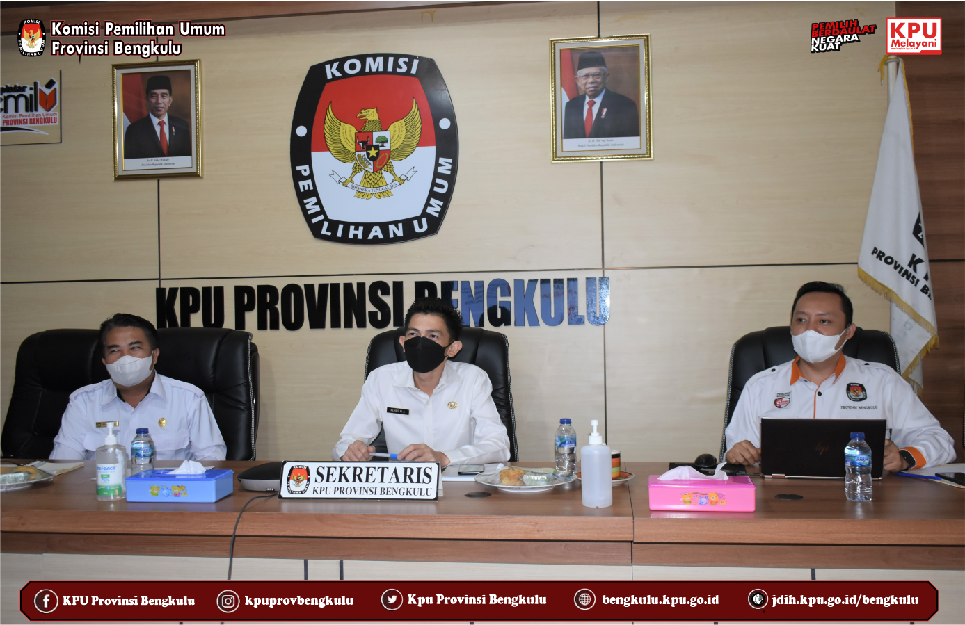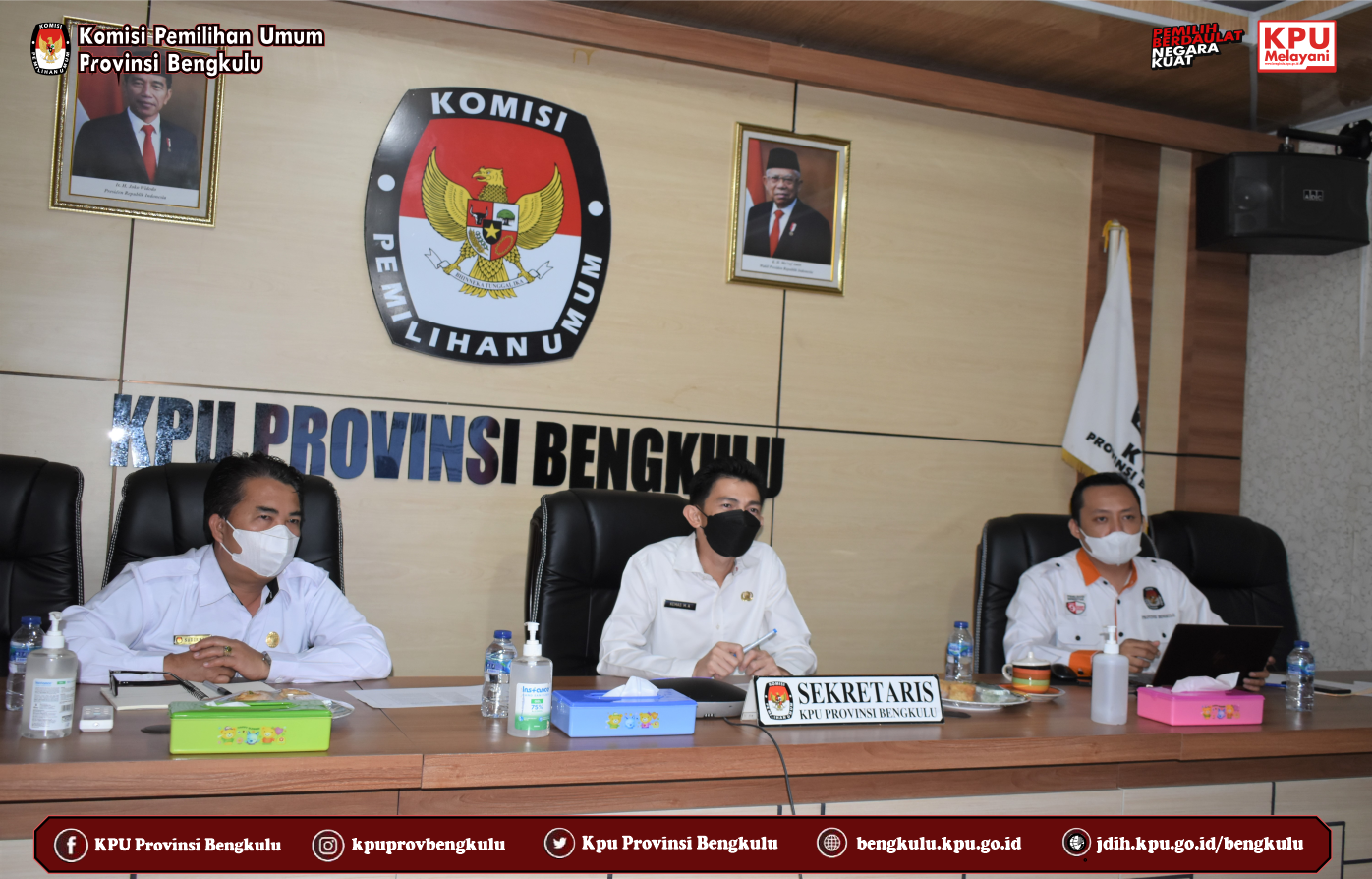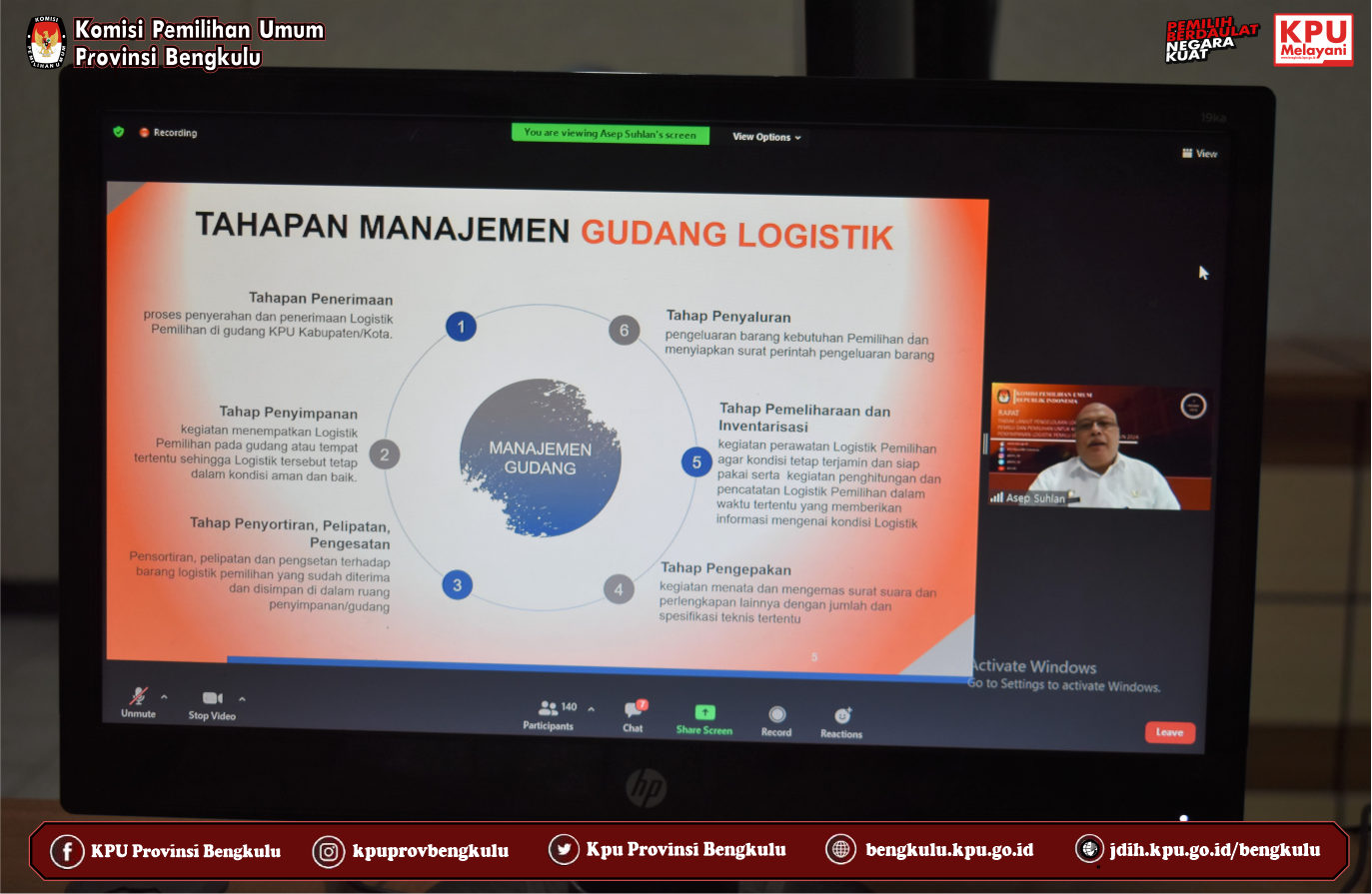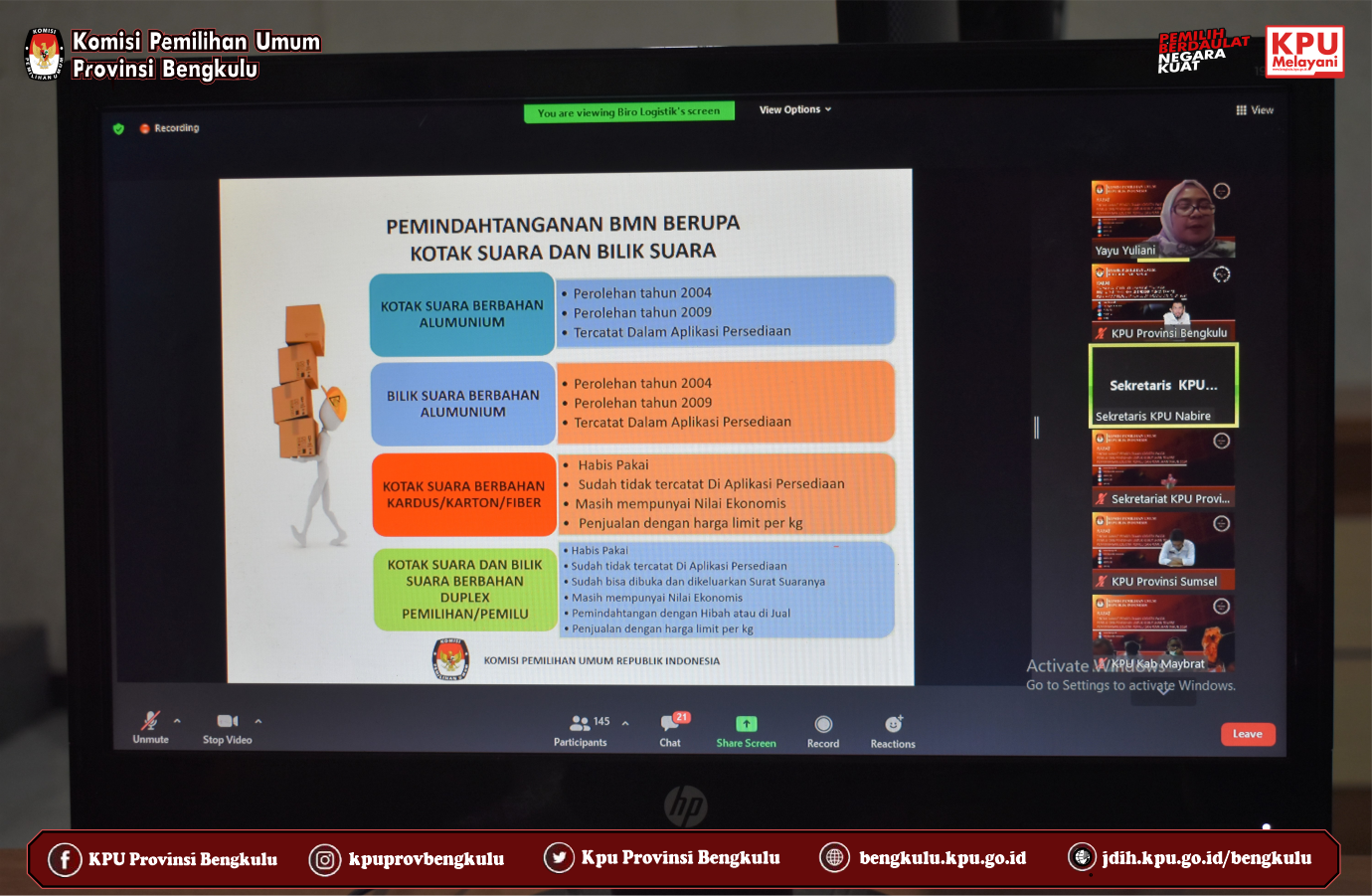 KPU Provinsi Bengkulu yang diwakili Sekretaris Kemas M Ajir, Kabag Keuangan Umum dan Logistik Sudirman dan Kasubbag Umum dan Logistik Ronny Novanda mengikuti Rapat Tindak Lanjut Pengelolaan Logistik Pasca Pemilu dan Pemilihan Untuk Kebutuhan Tempat Penyimpanan Logistik Pemilu dan Pemilihan Tahun 2024 yang diselenggarakan secara daring (zoom meeting) oleh KPU Republik Indonesia pada Kamis (7/10). Rapat ini diikuti oleh Sekretaris, Kabag KUL dan Kasubbag Umum dan Logistik KPU Provinsi/KIP Aceh Se-Indonesia.