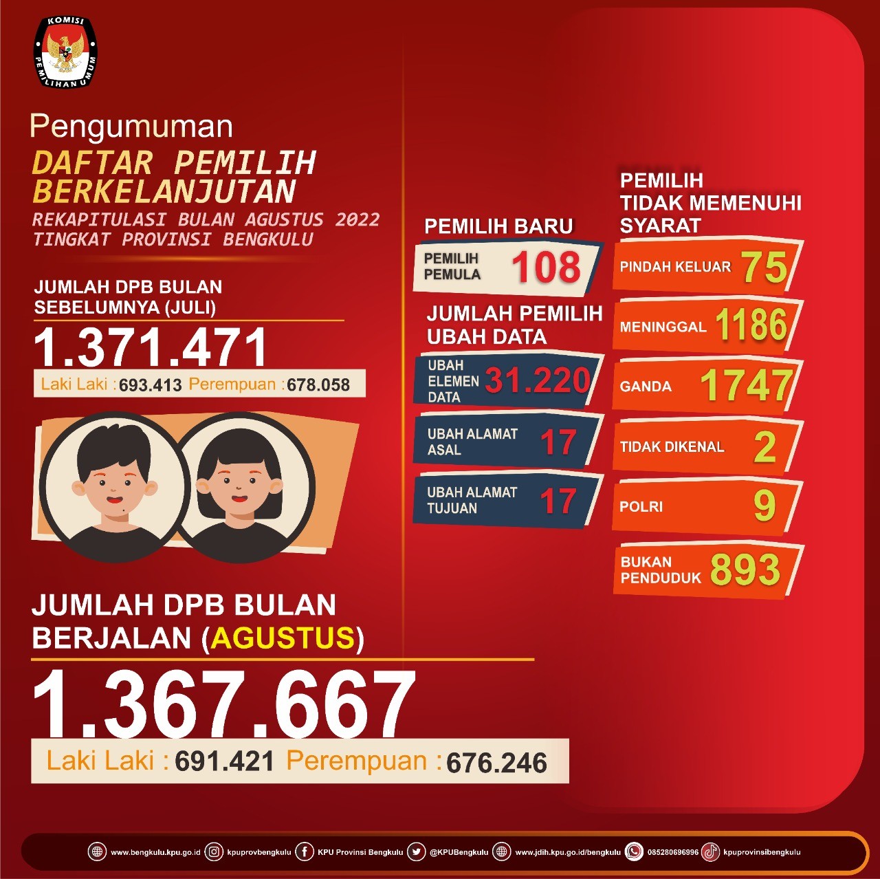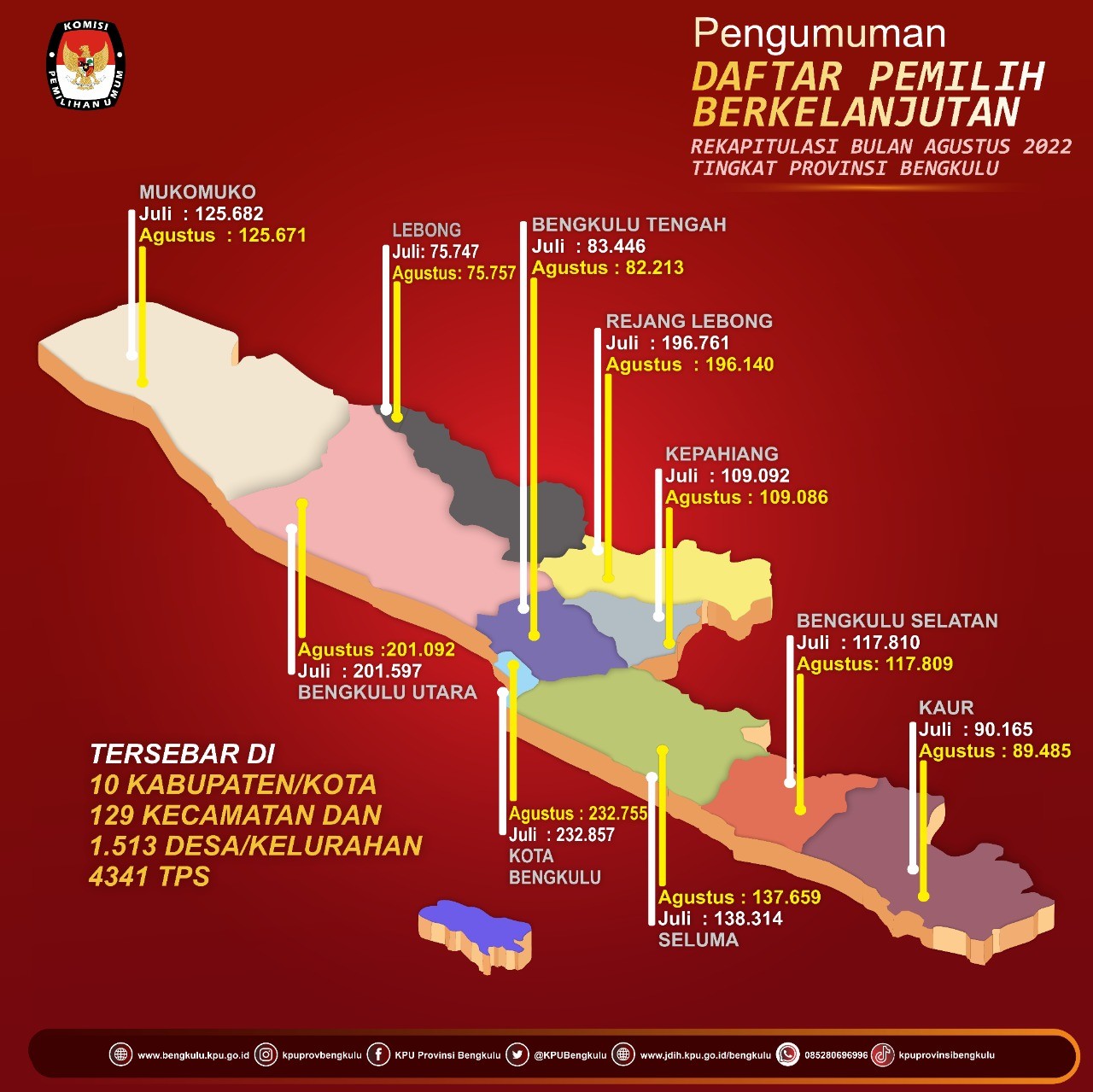 Jumlah Rekapitulasi hasil Pemutakhiran Daftar Pemilih Berkelanjutan (PDPB) bulan Agustus 2022 dengan jumlah total pemilih DPB sebanyak 1.367.667 (satu juta tiga ratus enam puluh tujuh ribu enam ratus enam puluh tujuh) pemilih dengan rincian pemilih laki-laki berjumlah 691.421 (enam ratus sembilan puluh satu ribu empat ratus dua puluh satu) dan pemilih perempuan berjumlah 676.246 (enam ratus tujuh puluh enam ribu dua ratus empat puluh enam) pemilih, tersebar di 10 Kabupaten/Kota 129 Kecamatan dan 1.513 Desa/Kelurahan dalam wilayah Provinsi Bengkulu.