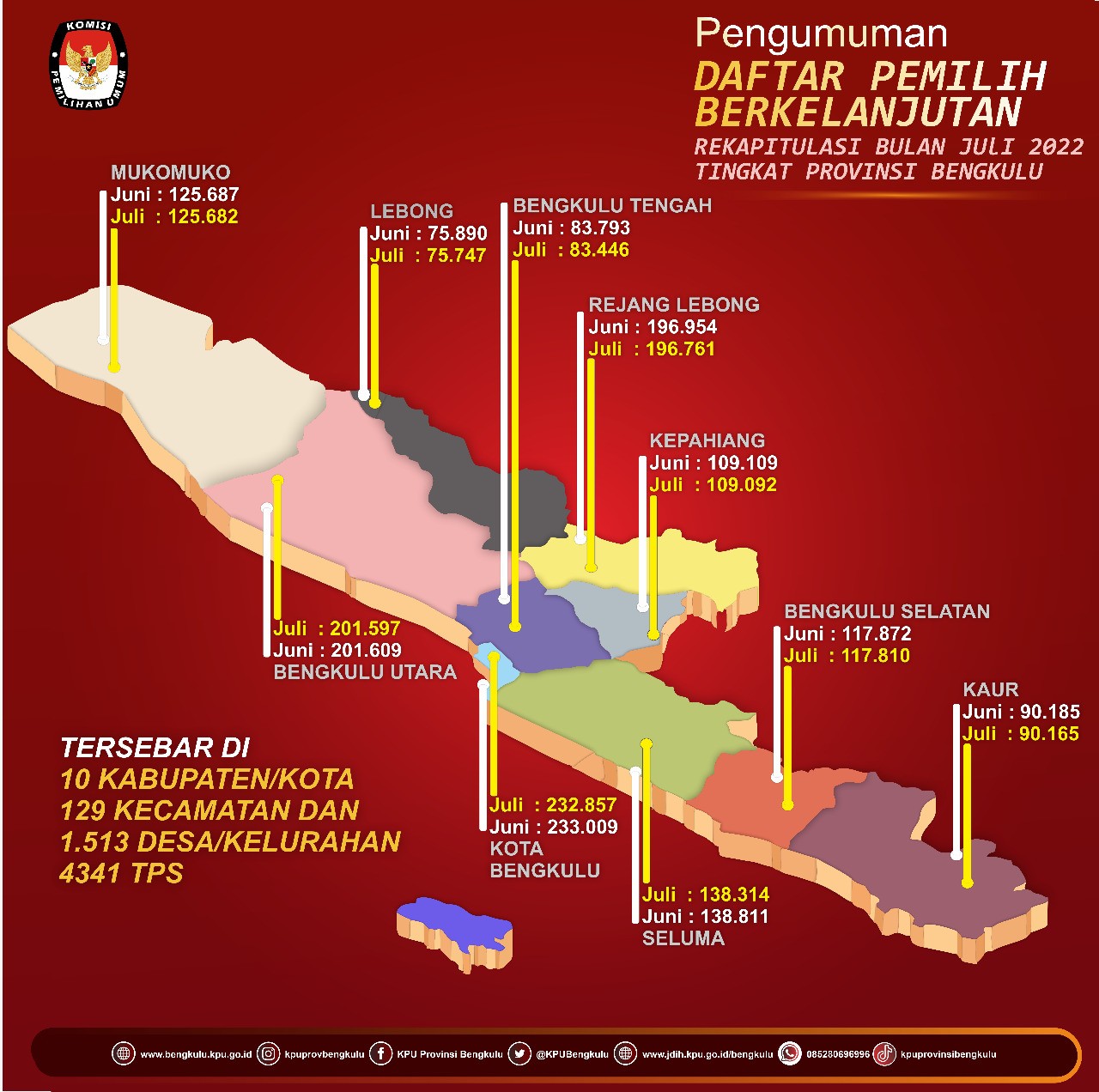 Jumlah Rekapitulasi hasil Pemutakhiran Daftar Pemilih Berkelanjutan (PDPB) bulan Juli 2022 dengan jumlah total pemilih DPB sebanyak 1.371.471 (satu juta tiga ratus tujuh puluh satu ribu empat ratus tujuh puluh satu) pemilih dengan rincian pemilih laki-laki berjumlah 693.413 (enam ratus sembilan puluh tiga ribu empat ratus tiga belas) dan pemilih perempuan berjumlah 678.058 (enam ratus tujuh puluh delapan ribu lima puluh delapan) pemilih, tersebar di 10 Kabupaten/Kota 129 Kecamatan dan 1.513 Desa/Kelurahan dalam wilayah Provinsi Bengkulu.