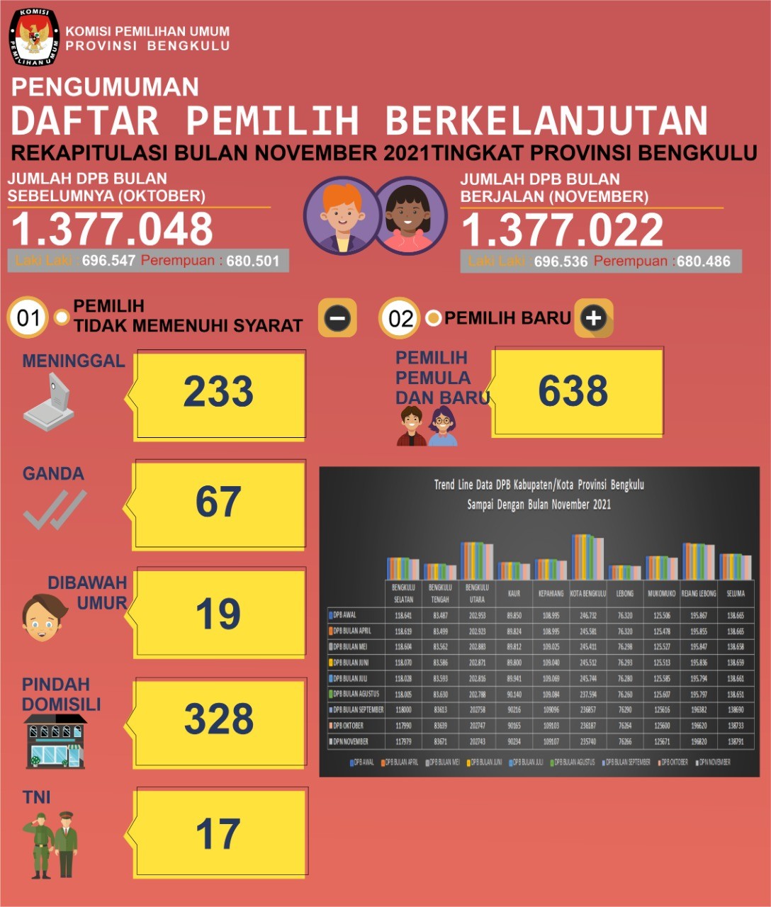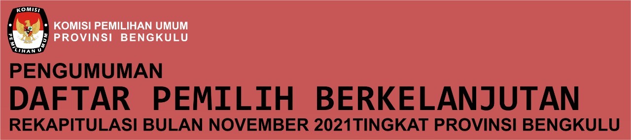 Berikut Rekapitulasi Daftar Pemilih Berkelanjutan Tingkat Provinsi Bengkulu bulan November 2021 atau Teman Pemilih dapat melihat langsung di Papan Pengumuman KPU Provinsi Bengkulu dengan alamat Jl. Kapuas Raya No. 82 Lingkar Barat Kota Bengkulu.
