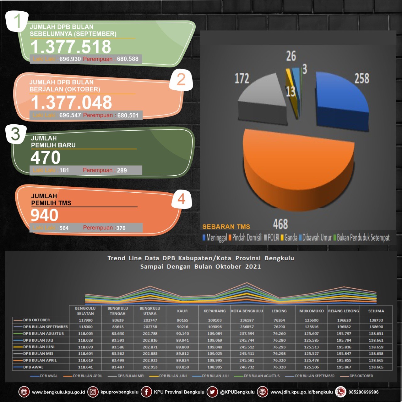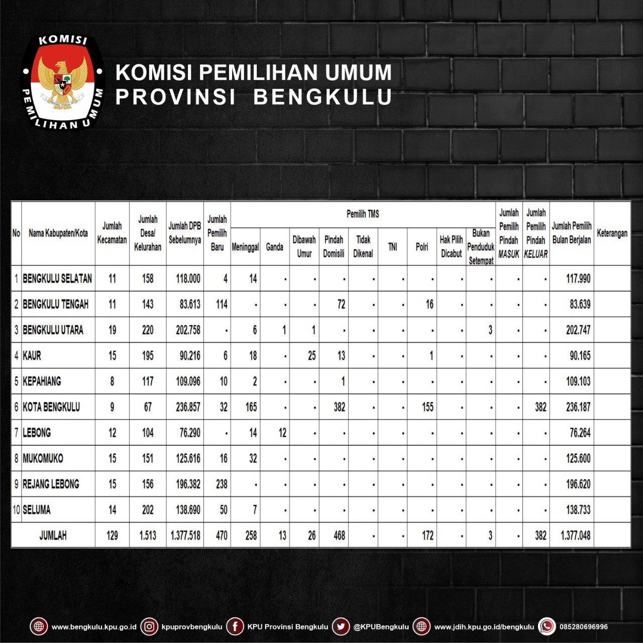 Berikut Rekapitulasi Daftar Pemilih Berkelanjutan Tingkat Provinsi Bengkulu bulan Oktober 2021 atau Teman Pemilih dapat melihat langsung di Papan Pengumuman KPU Provinsi Bengkulu dengan alamat Jl. Kapuas Raya No. 82 Lingkar Barat Kota Bengkulu.