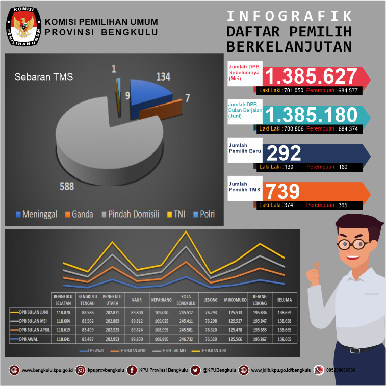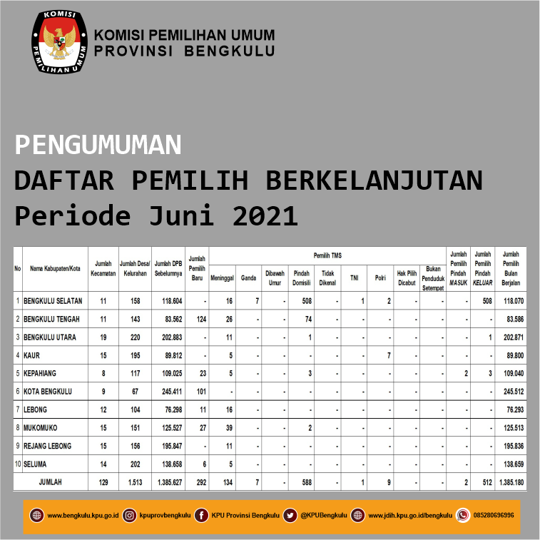 Berikut ini Rekapitulasi Daftar Pemilih Berkelanjutan (DPB) pada Semester Pertama Bulan Juni 2021 untuk Rekapitulasi Tingkat Provinsi. Bagi Teman Pemilih yang ingin mengetahui DPB dapat mengunjungi laman website KPU Provinsi Bengkulu dengan alamat www.bengkulu.kpu.go..id atau dapat melihat di papan Pengumuman Kantor KPU Provinsi Bengkulu dengan alamat Jl. Kapuas Raya No. 82 Lingkar Barat Kota Bengkulu.
