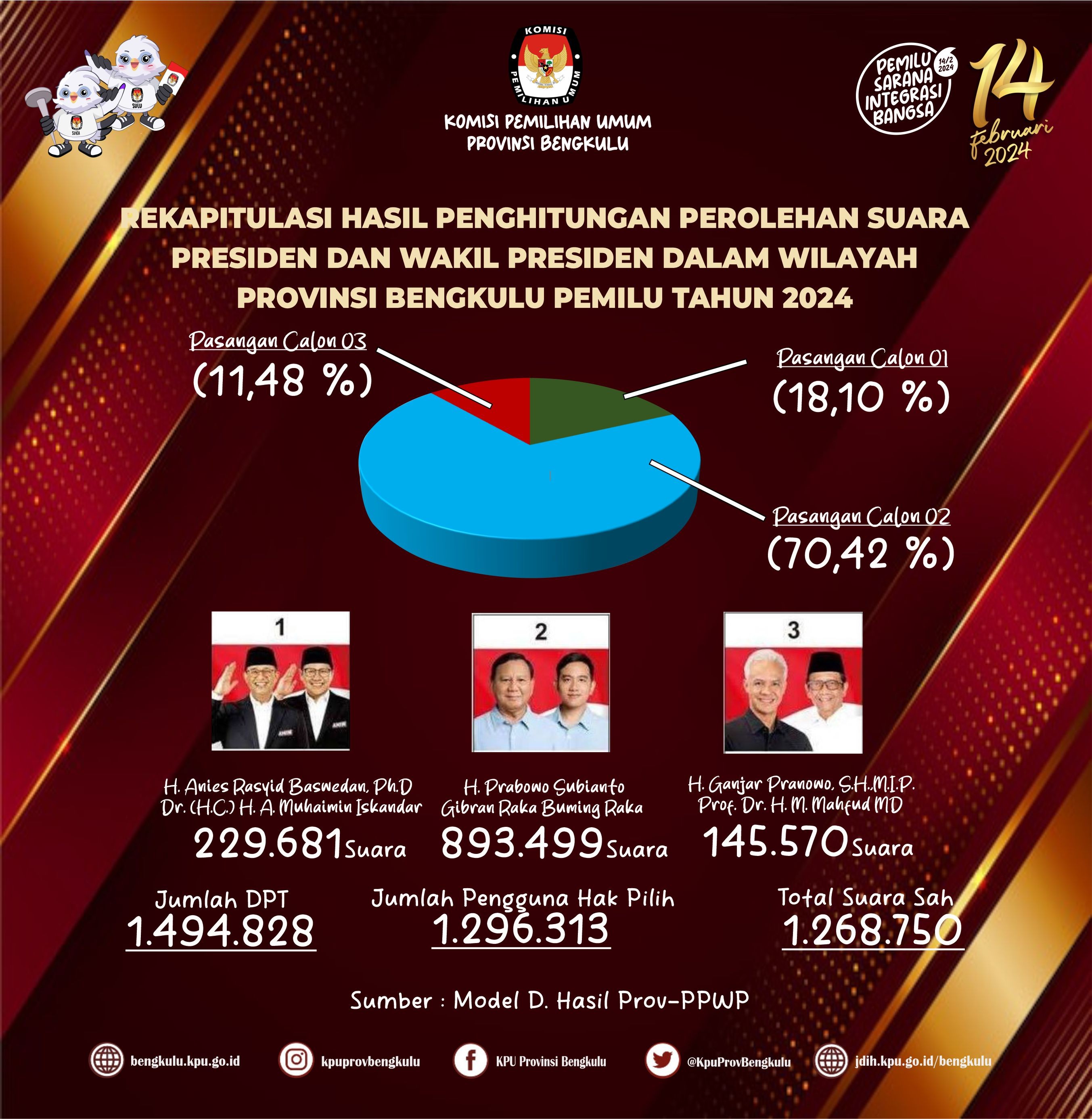 Bengkulu, bengkulu.kpu.go.id - Berikut Rekapitulasi Hasil Penghitungan Perolehan Suara Pemilihan Presiden dan Wakil Presiden Dalam Wilayah Provinsi Bengkulu Pemilu Tahun 2024 berdasarkan Model D.Hasil Provinsi- PPWP