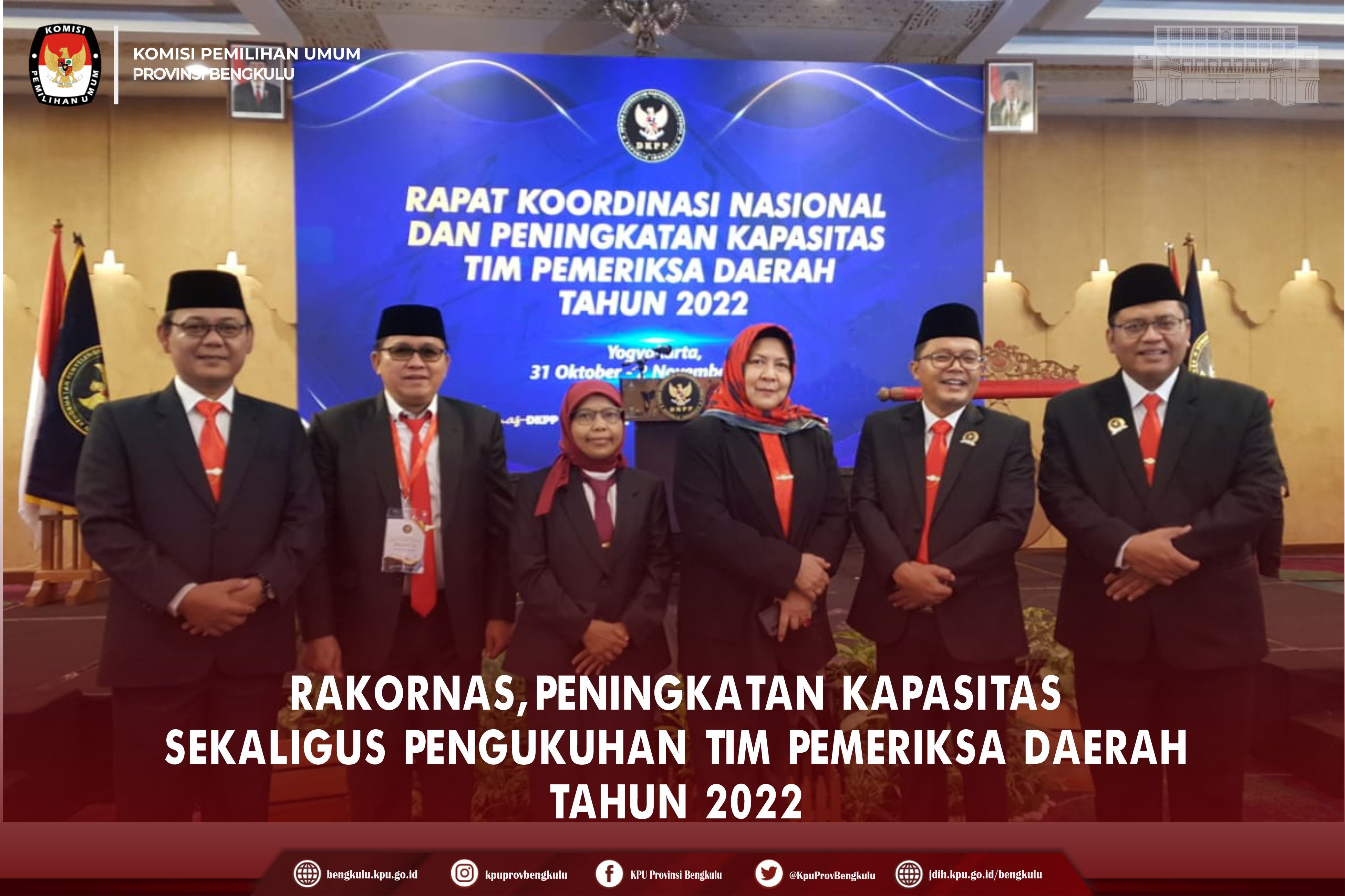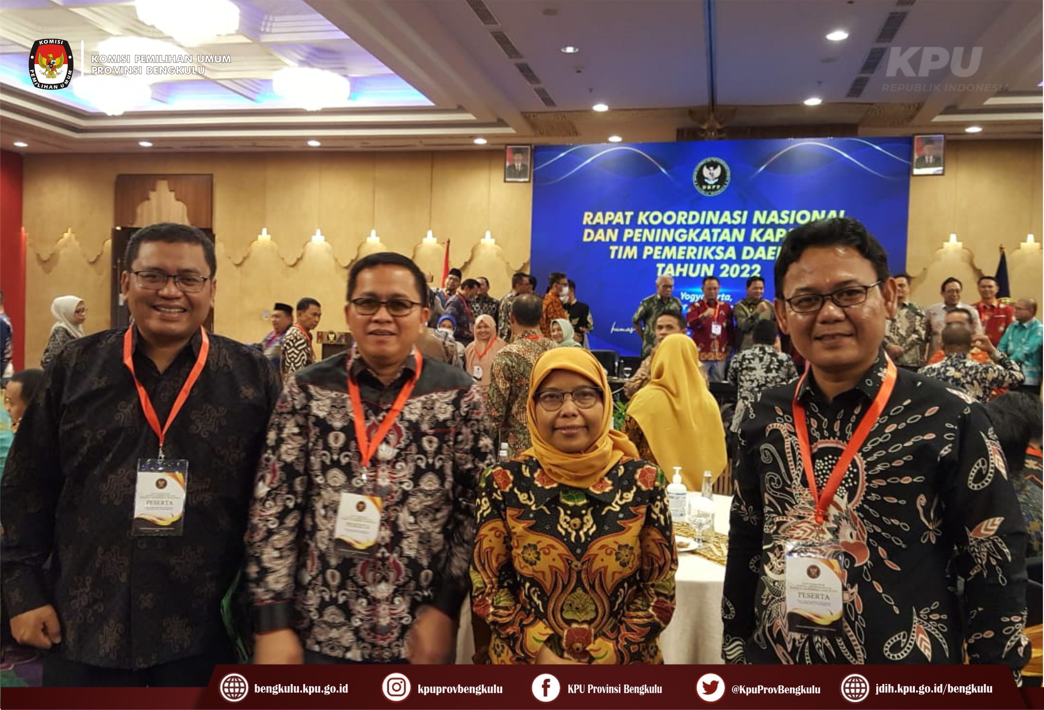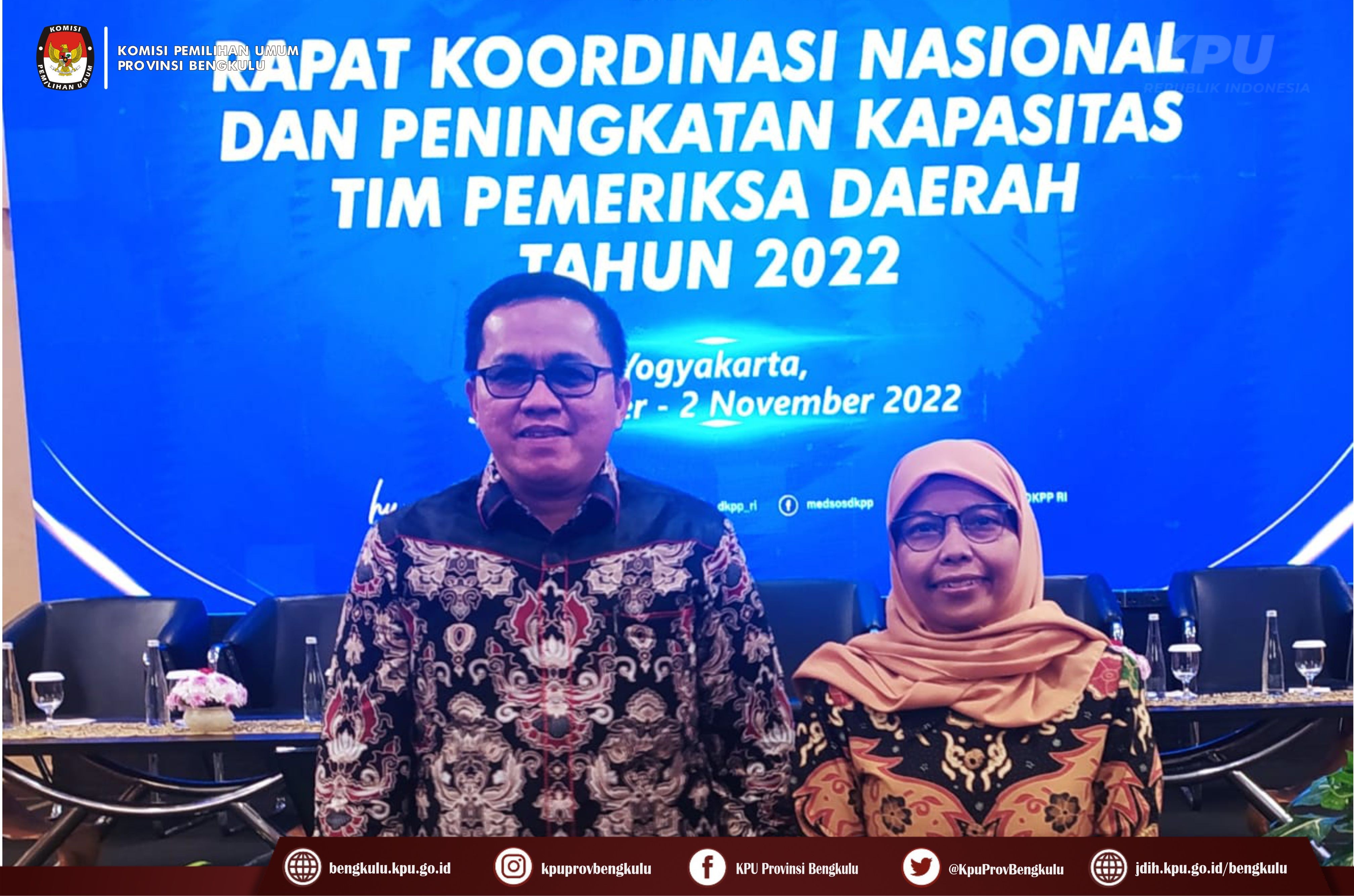 Bengkulu-bengkulu.kpu.go.id, Anggota KPU Provinsi Bengkulu Siti Baroroh dan Emex Verzoni mengikuti kegiatan Rapat Koordinasi Nasional dan Peningkatan Kapasitas Tim Pemeriksa Daerah Tahun 2022 yang diselenggarakan oleh Dewan Kehormatan Penyelenggara Pemilu (DKPP) Republik Indonesia di Yogyakarta pada 30 Oktober s.d 2 November 2022. Selain itu, pada Selasa (1/11) DKPP RI melakukan pengukuhan dan Pelantikan Anggota Tim Pemeriksa Daerah (TPD) se-Indonesia Periode Tahun 2022-2023. Untuk TPD Provinsi Bengkulu dari Unsur KPU, yaitu Siti Baroroh, S.Ag.,M.Si dan Emex Verzoni, SE, dari Unsur Bawaslu, yaitu Eko Sugianto, Sp.,M.Si dan Fahamsyah, S.Pd.I.,M.Pd.I serta dari Unsur Masyarakat Dr. Dra.Yunilisiah, M.Si dan Dr. Qolbi Khoiri, M.Pd.I.