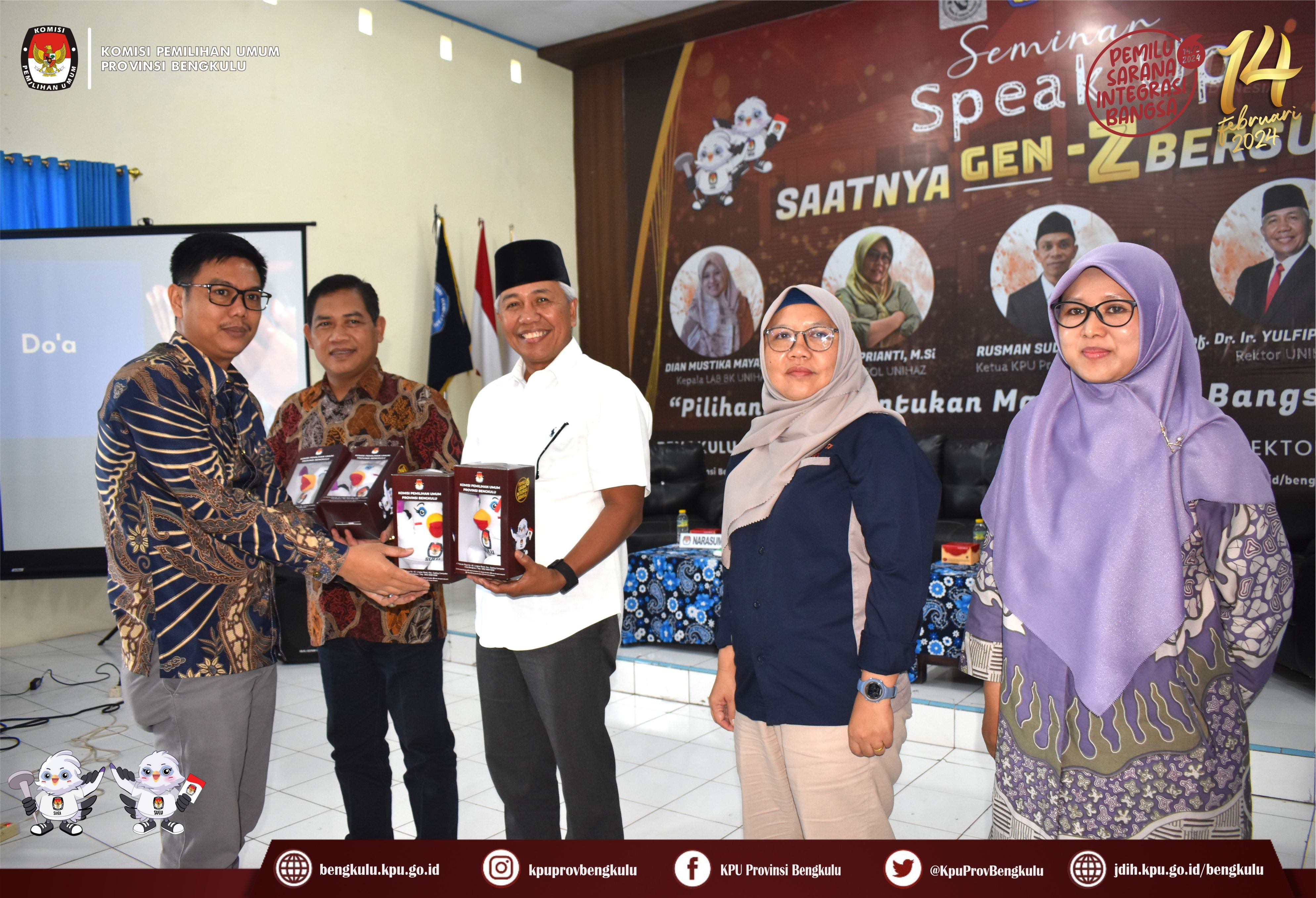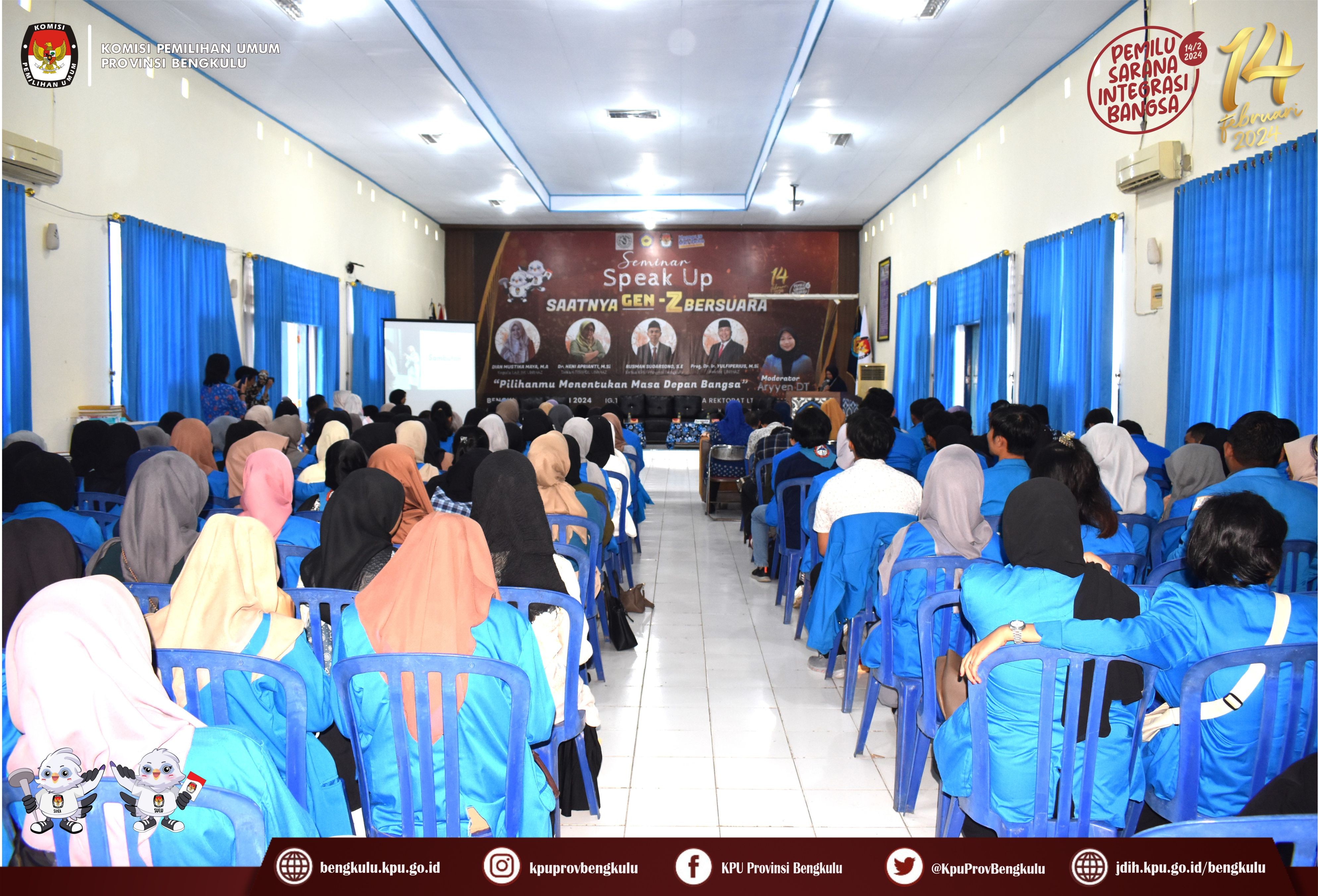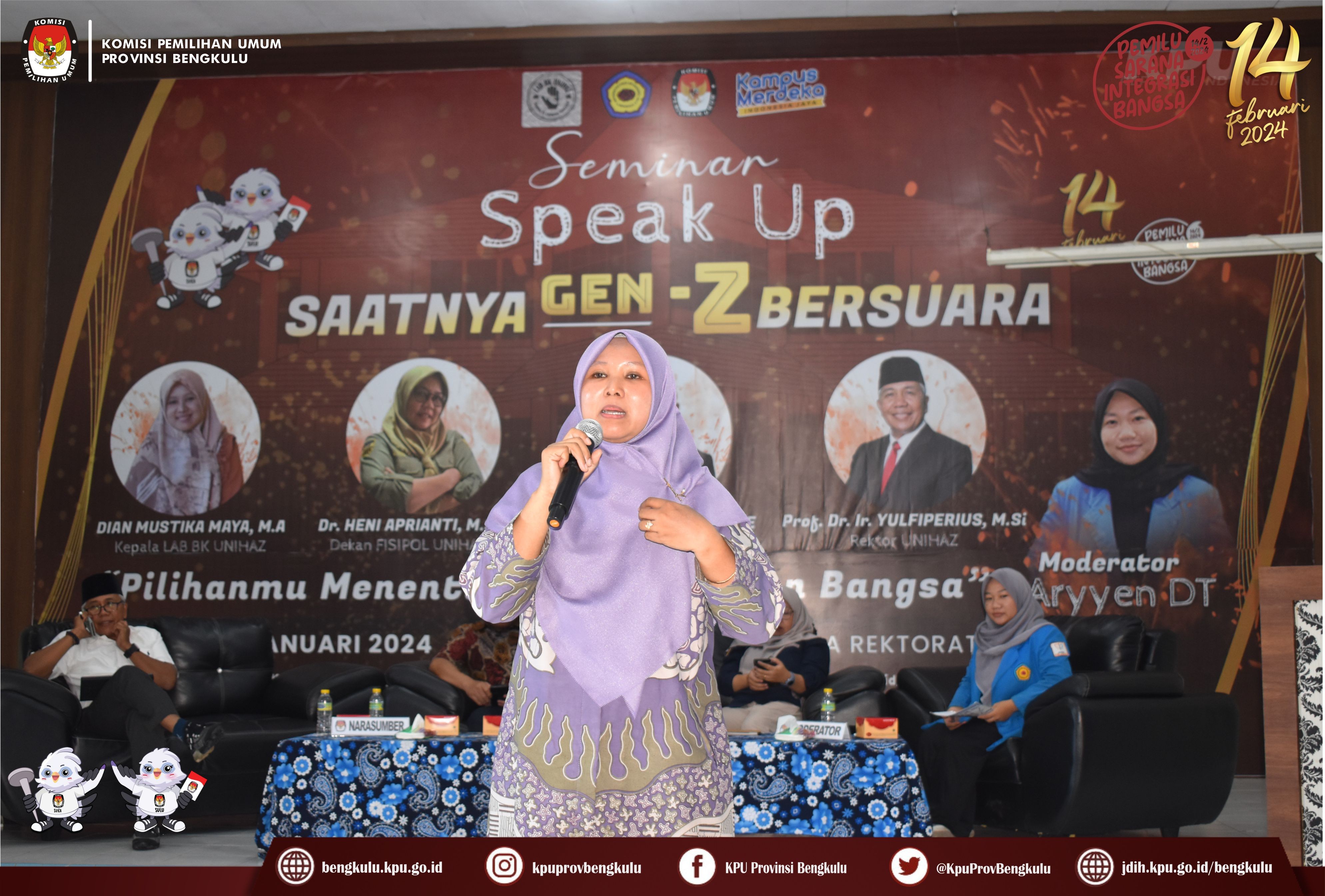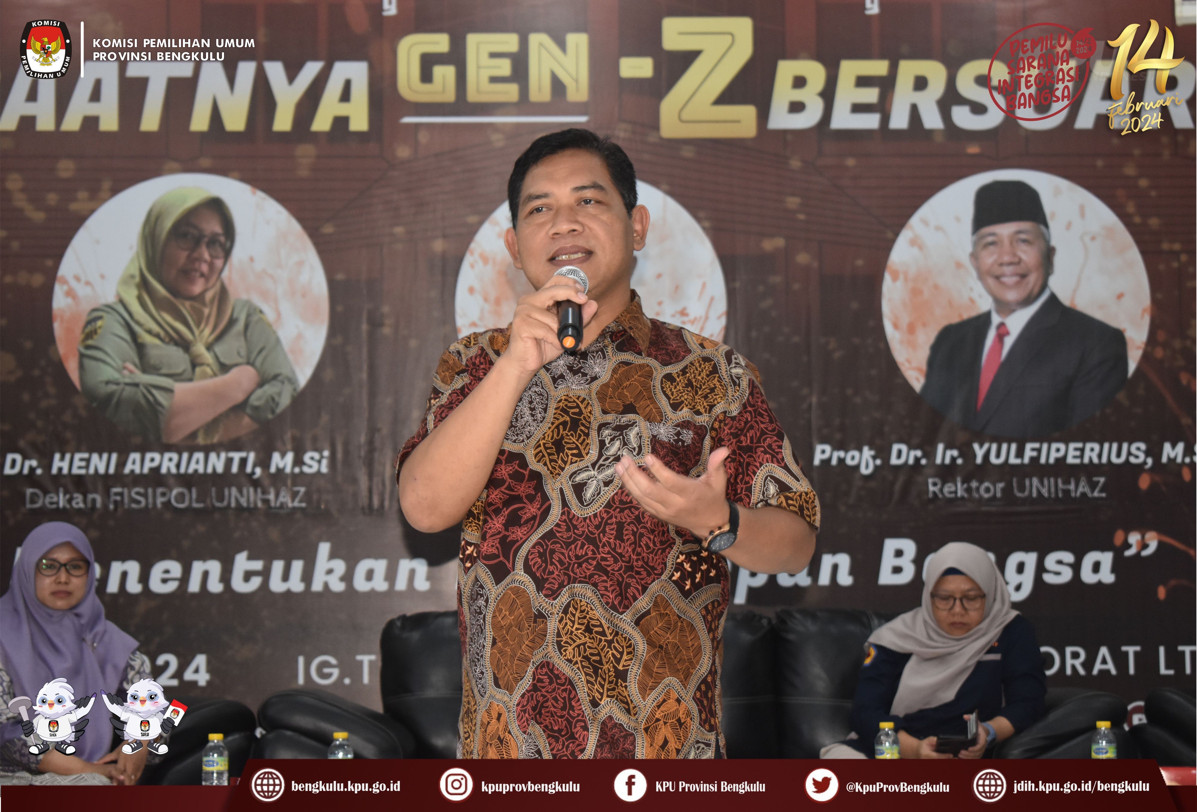 Bengkulu, bengkulu.kpu.go.id - Dalam rangka melaksanakan sosialisasi dan Pendidikan Pemilih kepada Pemilih Pemula dan Pemuda, KPU Provinsi Bengkulu hadir dalam Seminar Speak Up Saatnya Generasi Z Bersuara dengan tema Pilihanmu Menentukan Masa Depan Bangsa yang diselenggarakan Unihaz Bengkulu, Kamis (4/1/2024) bertempat di Aula Gedung Rektorat Lantai 3. Hadir dalam acara Anggota KPU Provinsi Bengkulu Alpin Samsen, Dodi Hendra Supiarso dan Emex Verzoni, Rektor Unihaz Bengkulu Yulfiperius, Dekan, Ketua Program Studi, Dosen, dan Civitas Akademik Unihaz Bengkulu. Peserta acara adalah Mahasiswa/i perwakilan program studi Universitas Bengkulu. Acara yang dibuka dengan menyanyikan Lagu Kebangsaan Indonesia Raya, Jingle Pemilu dan Mars Mahasiswa, dilanjutkan dengan Sambutan KPU Provinsi Bengkulu yang diwakili Emex Verzoni, Sambutan dari Dekan FKIP Unihaz Bengkulu Dedi Guntar sekaligus membuka acara. Emex menyampaikan apresiasi kepada Unihaz Bengkulu yang telah melaksanakan kegiatan seminar dalam rangka sosialisasi dan pendidikan pemilih kepada pemilih pemula dan pemula agar berpartisipasi menggunakan hak pilihnya pada Rabu 14 Februari 2024 mendatang. Selain itu, ditambahkan Emex ke depannya KPU Provinsi Bengkulu berharap kerjasama dengan Unihaz Bengkulu dapat terjalin secara berkesinambungan. Sementara Itu, Dedi mengatakan bahwa peran Gen Z dalam pemilu sangatlah penting karena berdasarkan informasi yang hampir 40 % pemilih berasal dari Gen Z, untuk itu mari Gunakan Hak Pilih dengan datang ke TPS pada Rabu 14 Februari 2024.