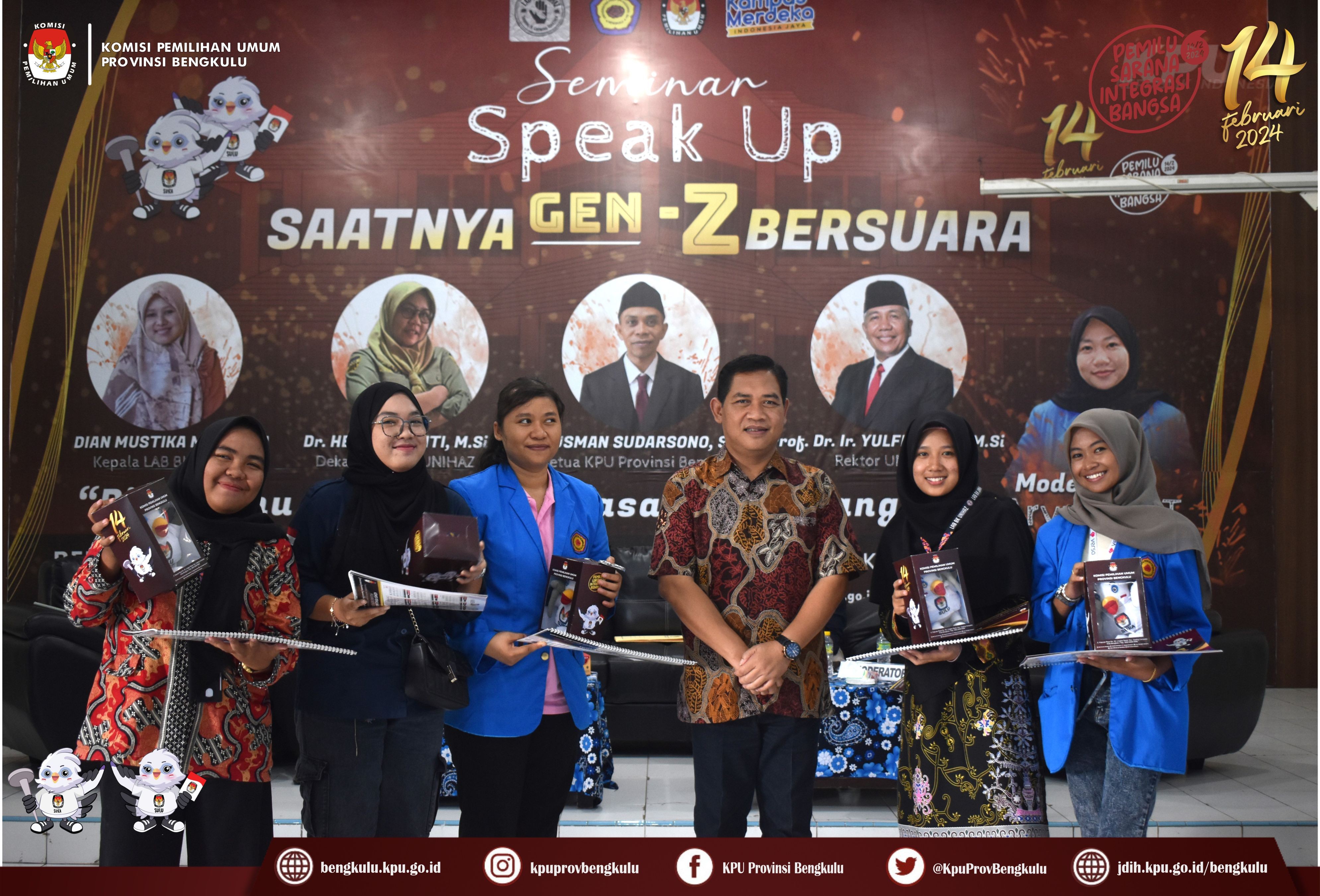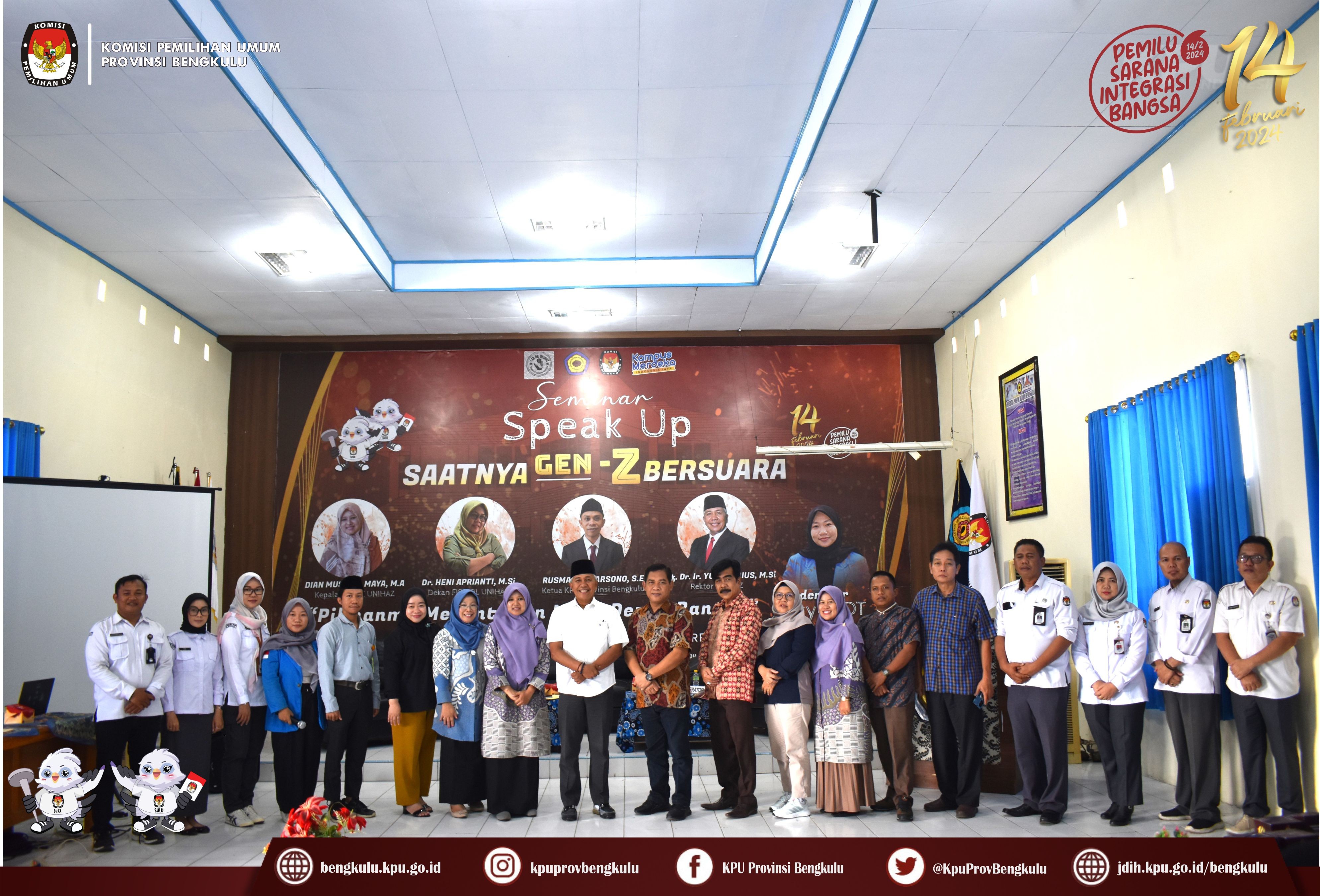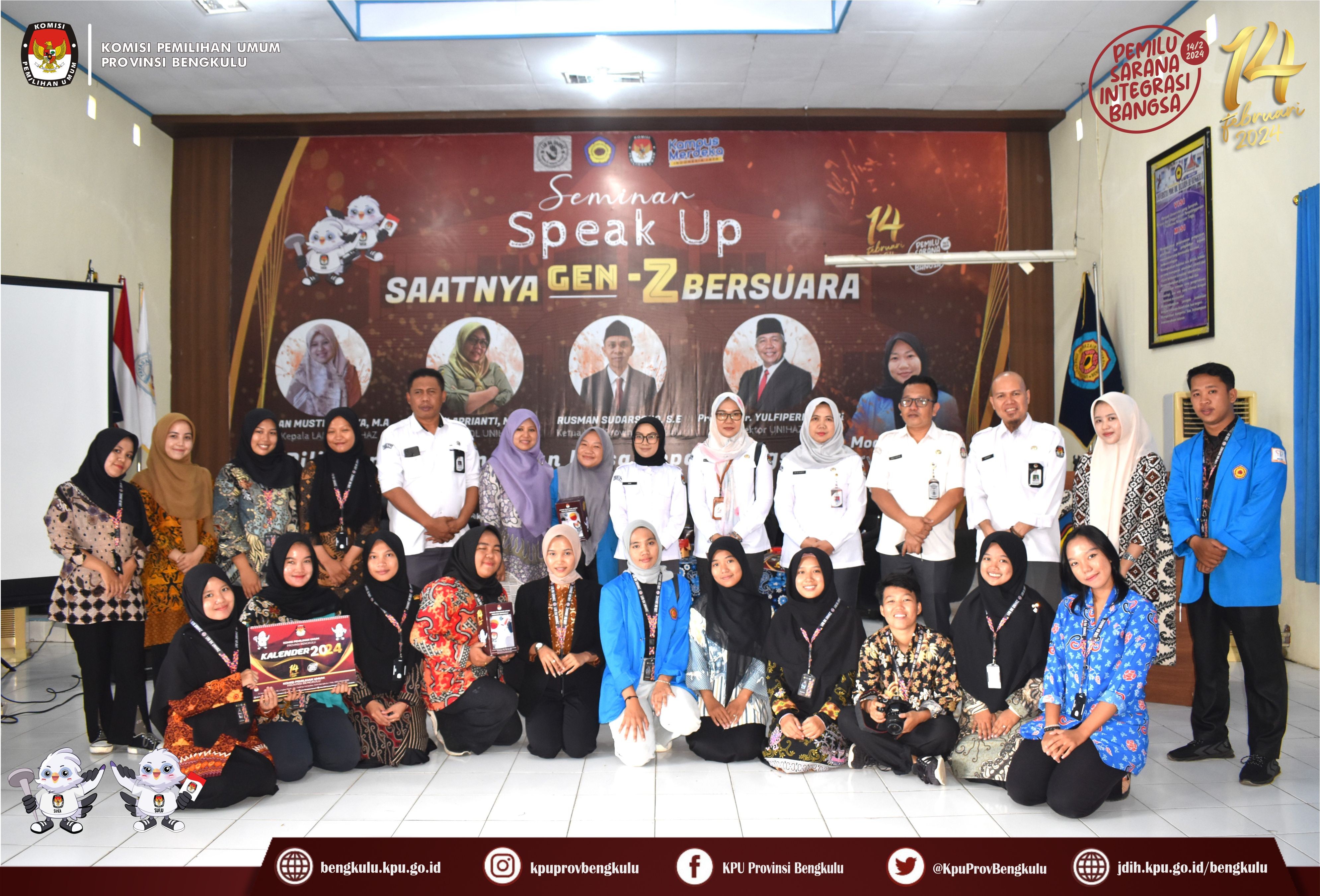 Bengkulu, bengkulu.kpu.go.id - Dalam rangka melaksanakan sosialisasi dan Pendidikan Pemilih kepada Pemilih Pemula dan Pemuda, KPU Provinsi Bengkulu hadir dalam Seminar Speak Up Saatnya Generasi Z Bersuara dengan tema Pilihanmu Menentukan Masa Depan Bangsa yang diselenggarakan Unihaz Bengkulu, Kamis (4/1/2024) bertempat di Aula Gedung Rektorat Lantai 3. Hadir dalam acara Anggota KPU Provinsi Bengkulu Alpin Samsen, Dodi Hendra Supiarso dan Emex Verzoni, Rektor Unihaz Bengkulu Yulfiperius, Dekan, Ketua Program Studi, Dosen, dan Civitas Akademik Unihaz Bengkulu. Peserta acara adalah Mahasiswa/i perwakilan program studi Universitas Bengkulu. Acara yang dibuka dengan menyanyikan Lagu Kebangsaan Indonesia Raya, Jingle Pemilu dan Mars Mahasiswa, dilanjutkan dengan Sambutan KPU Provinsi Bengkulu yang diwakili Emex Verzoni, Sambutan dari Dekan FKIP Unihaz Bengkulu Dedi Guntar sekaligus membuka acara. Emex menyampaikan apresiasi kepada Unihaz Bengkulu yang telah melaksanakan kegiatan seminar dalam rangka sosialisasi dan pendidikan pemilih kepada pemilih pemula dan pemula agar berpartisipasi menggunakan hak pilihnya pada Rabu 14 Februari 2024 mendatang. Selain itu, ditambahkan Emex ke depannya KPU Provinsi Bengkulu berharap kerjasama dengan Unihaz Bengkulu dapat terjalin secara berkesinambungan. Sementara Itu, Dedi mengatakan bahwa peran Gen Z dalam pemilu sangatlah penting karena berdasarkan informasi yang hampir 40 % pemilih berasal dari Gen Z, untuk itu mari Gunakan Hak Pilih dengan datang ke TPS pada Rabu 14 Februari 2024.