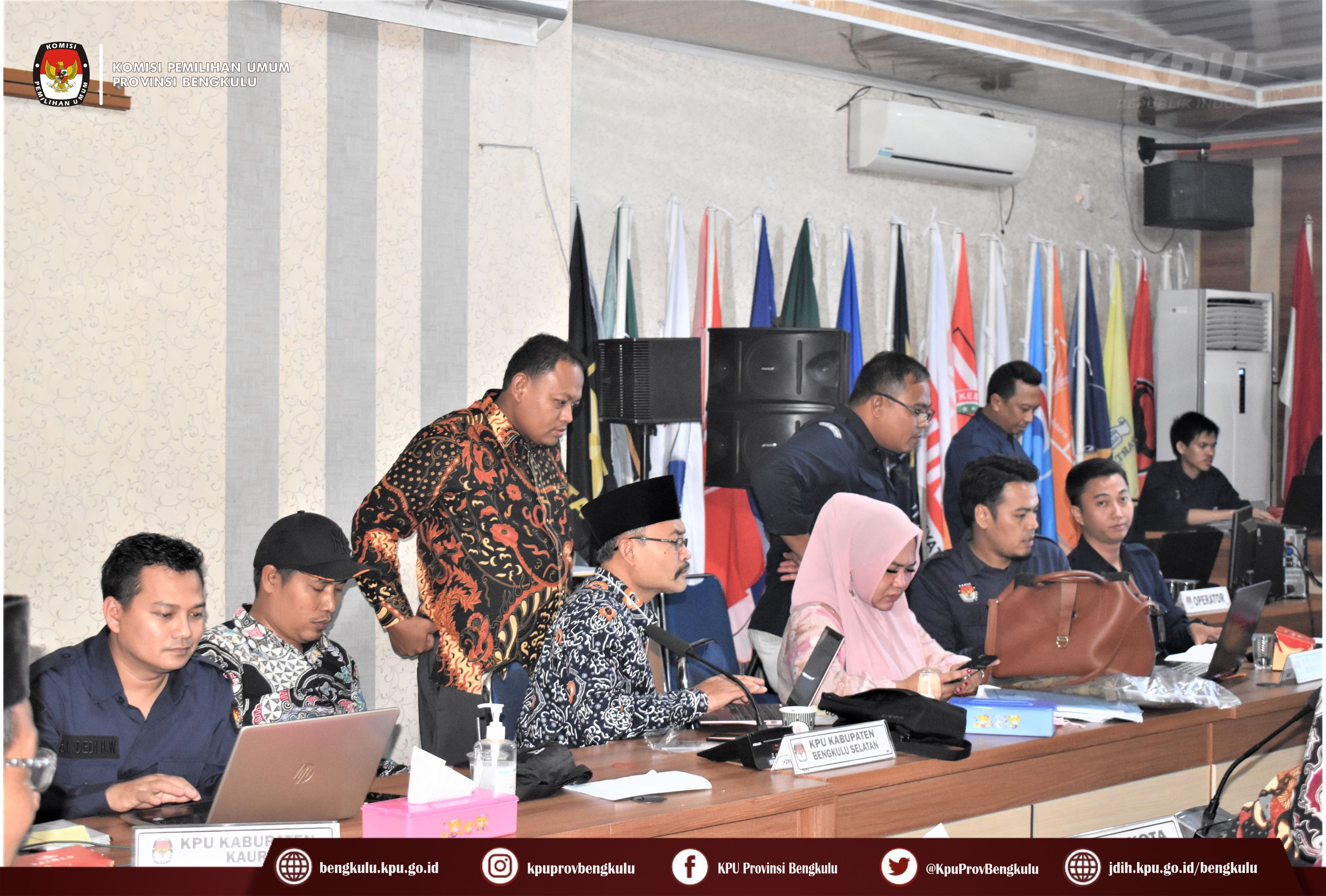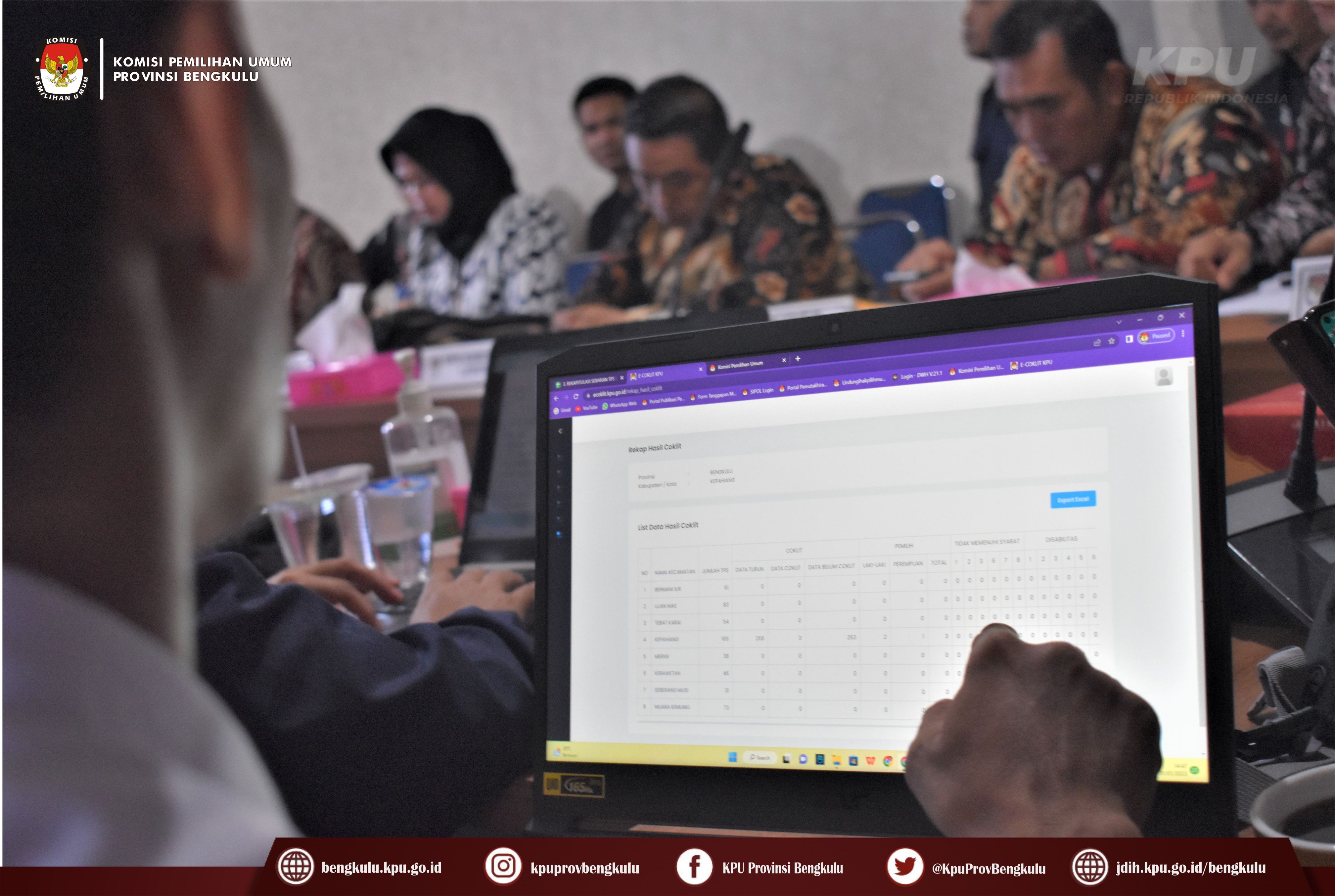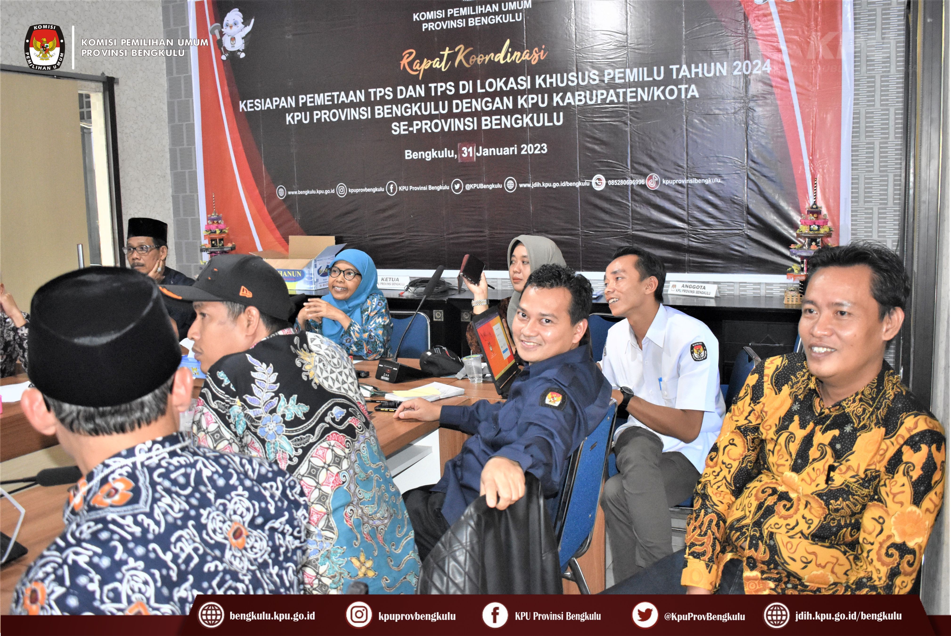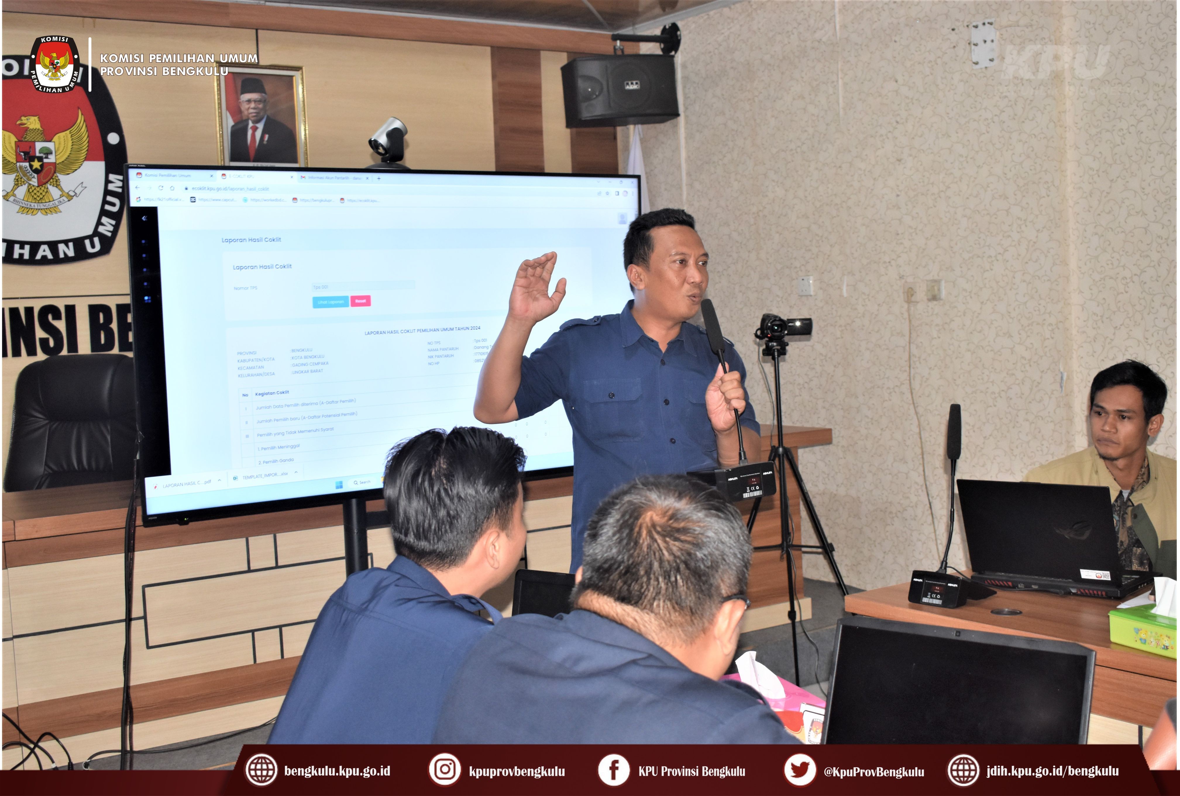 Bengkulu-bengkulu.kpu.go.id, Anggota KPU Provinsi Bengkulu Siti Baroroh memberikan arahan dalam simulasi penggunaan e-Coklit didampingi Kabag Perencanaan Data dan Informasi Hamzah dan Kasubbag Data dan Informasi Yunita Dika Fitri dalam kegiatan Rapat Koordinasi Kesiapan Pemetaan TPS dan TPS di Lokasi Khusus Pemilu Tahun 2024 bertempat di ruang Audio Visual Rumah Pintar Pemilu, Selasa (31/1/2023) Hadir dalam kegiatan tersebut, yaitu Anggota Divisi Perencanaan Data dan Informasi serta Admin/Operator Sidalih KPU Kabupaten/Kota se-Provinsi Bengkulu. pelaksanaan simulasi e-Coklit dijelaskan oleh Admin/Operator Sidalih KPU Provinsi Bengkulu Danang Tri Andono dan Zomi Putra.