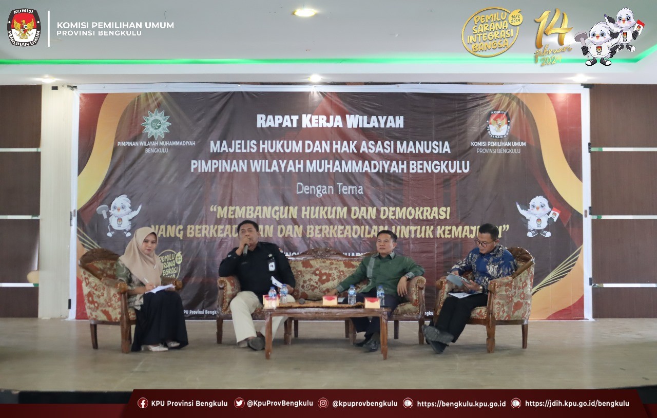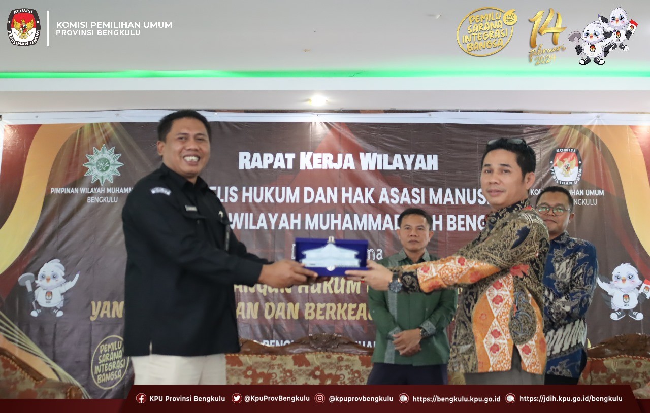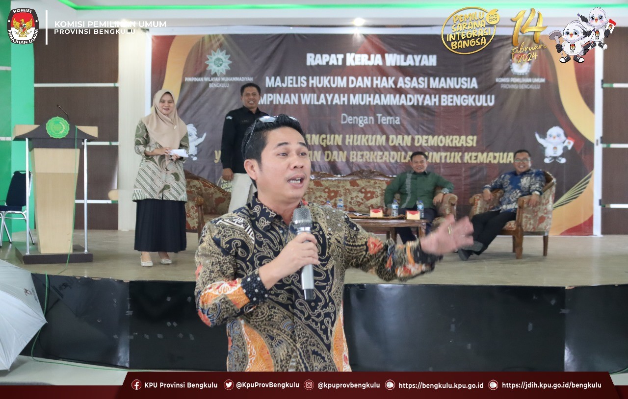 Bengkulu, bengkulu.kpu.go.id - KPU Provinsi Bengkulu menggelar Sosialisasi Bekerjasama dengan Majelis Hukum dan Hak Asasi Manusia (HAM) Pimpinan Muhammadiyah Bengkulu, Pada Minggu(21/1/2024) di gedung Kyai Haji Ahmad Dahlan Lantai 6 Universitas Muhammadiyah Bengkulu. Kegiatan ini di buka langsung oleh Dr. Fajrul Hamidi, M.Hum Selaku Ketua Pimpinan Wilayah Muhammadiyah (PWM) Provinsi Bengkulu. Turut hadir juga dari Bawaslu Provinsi bengkulu dan Pimpinan Wilayah Persatuan Wartawan Indonesia (PWI) Provinsi Bengkulu. Sosialisasi dilanjutkan dengan penyampaian materi dari KPU Provinsi Bengkulu yang diwakili oleh Kabag Teknis Penyelengara Pemilu Partisipasi Hubungan Masyarakat Hukum dan SDM Oktan Huzaeiry menjelaskan materi tentang Pelaksanaan Pemilu 2024 Demokratis dan Berintegritas. diskusi dilanjutkan dengan tanya jawab dan pemberian cinderamata kepada peserta sosialisasi.