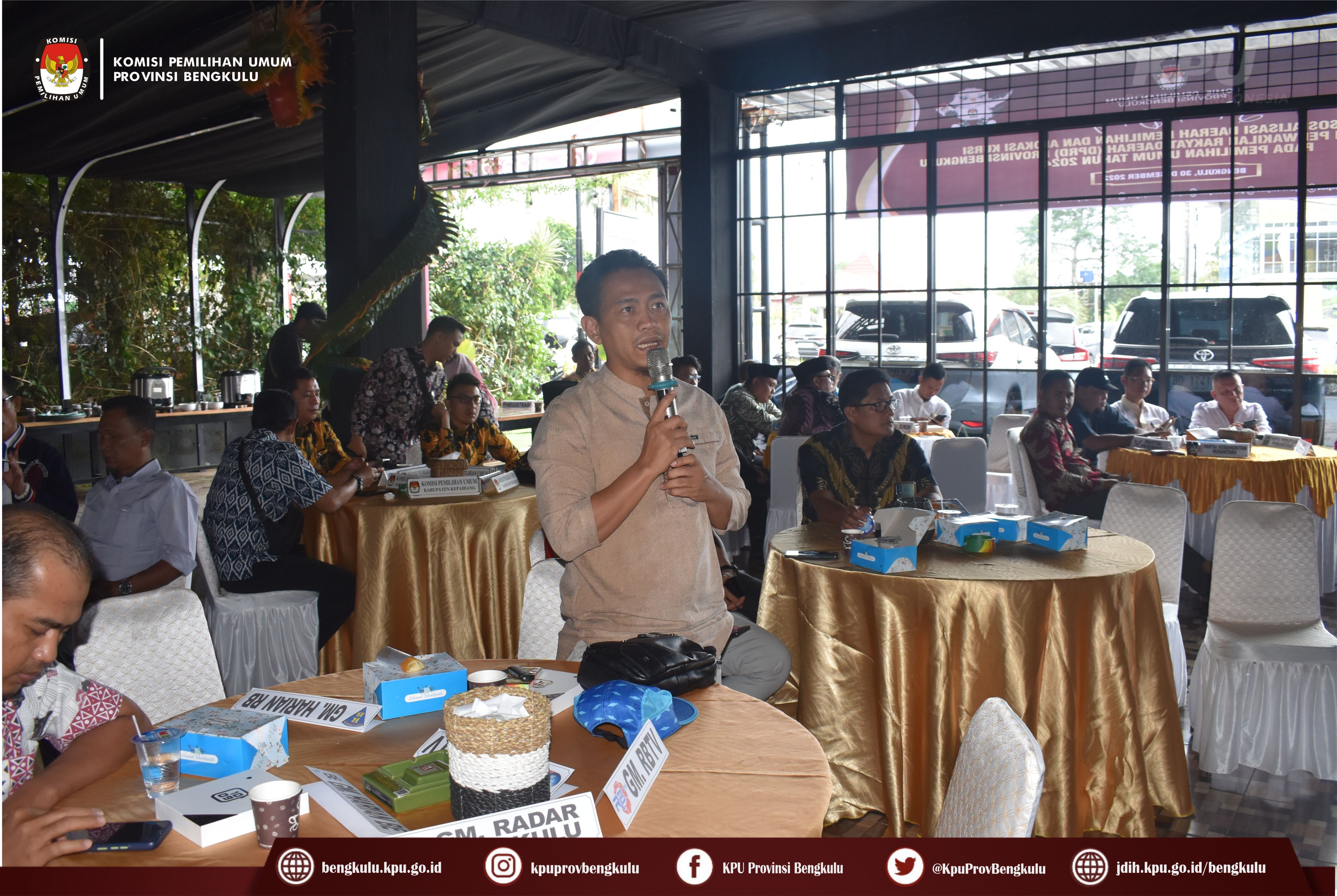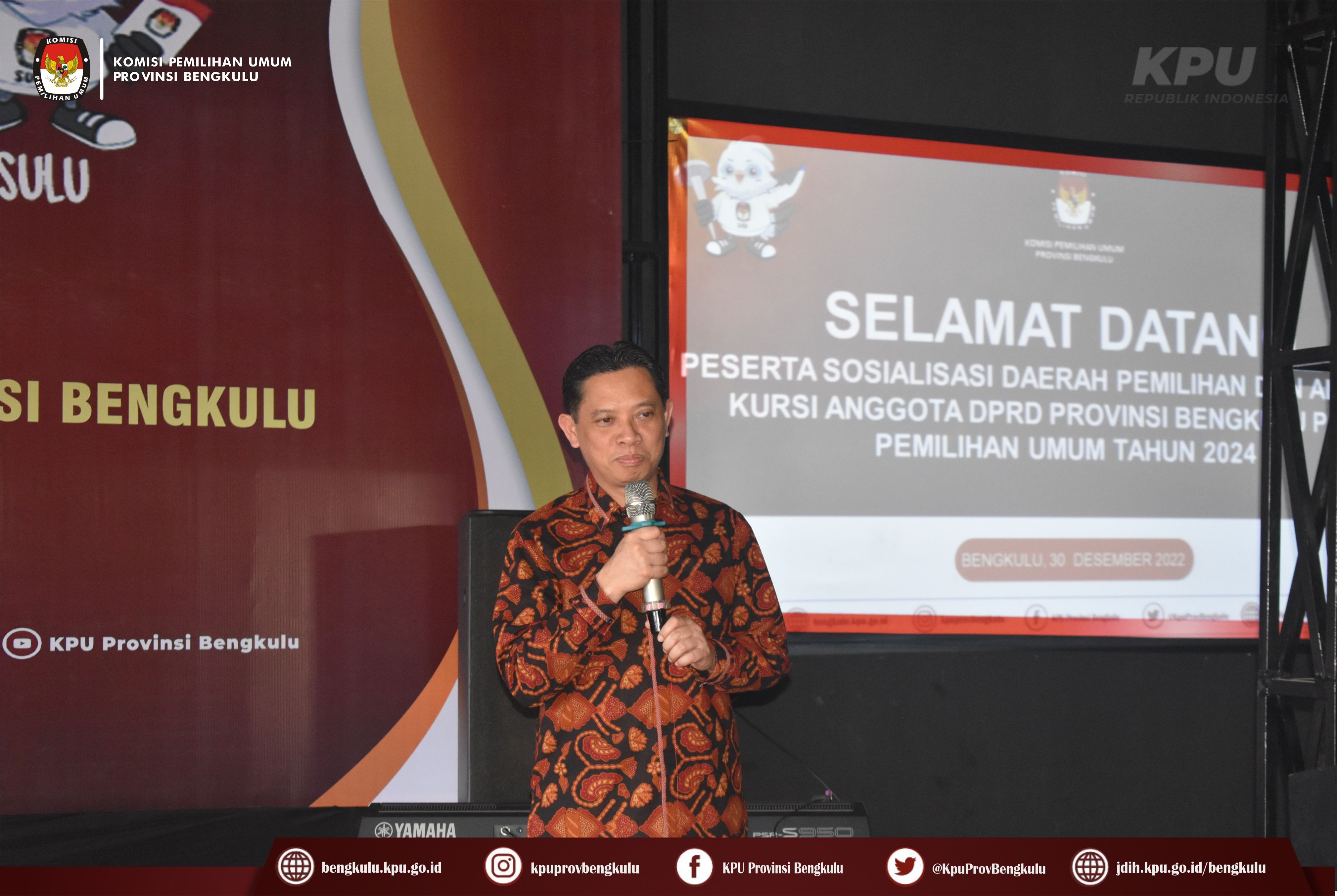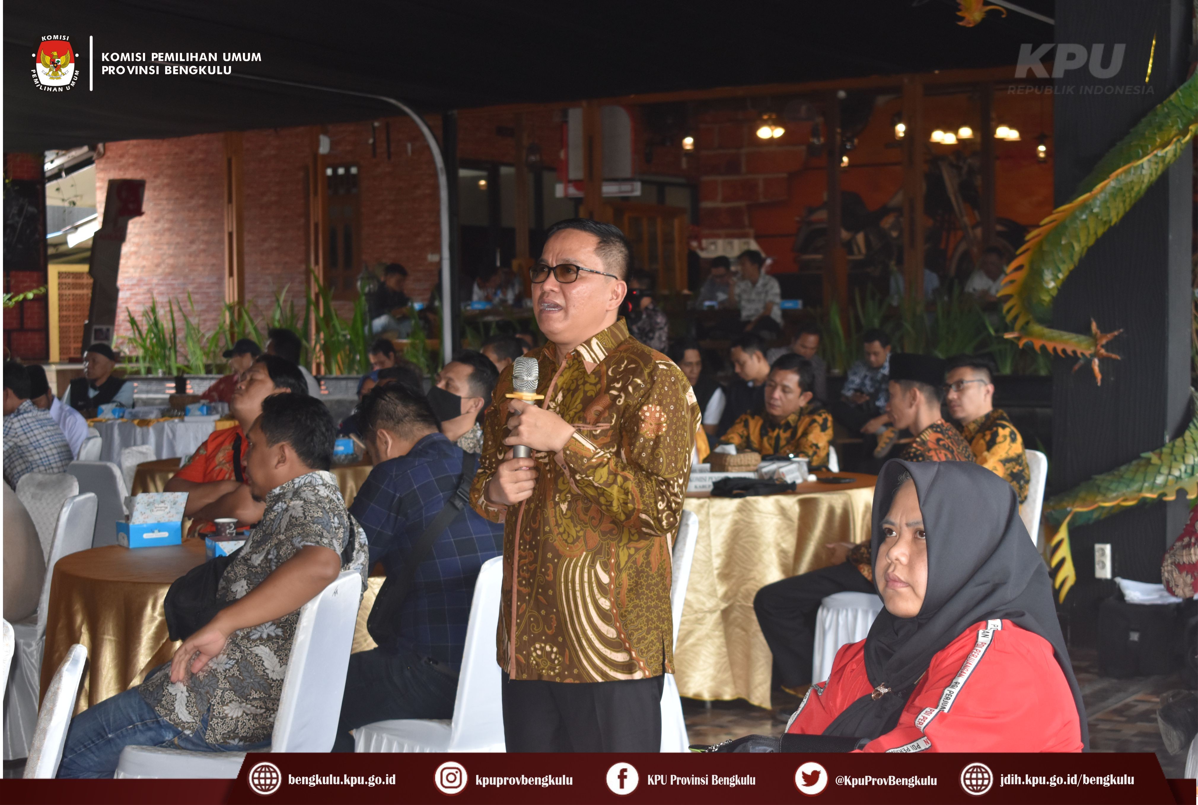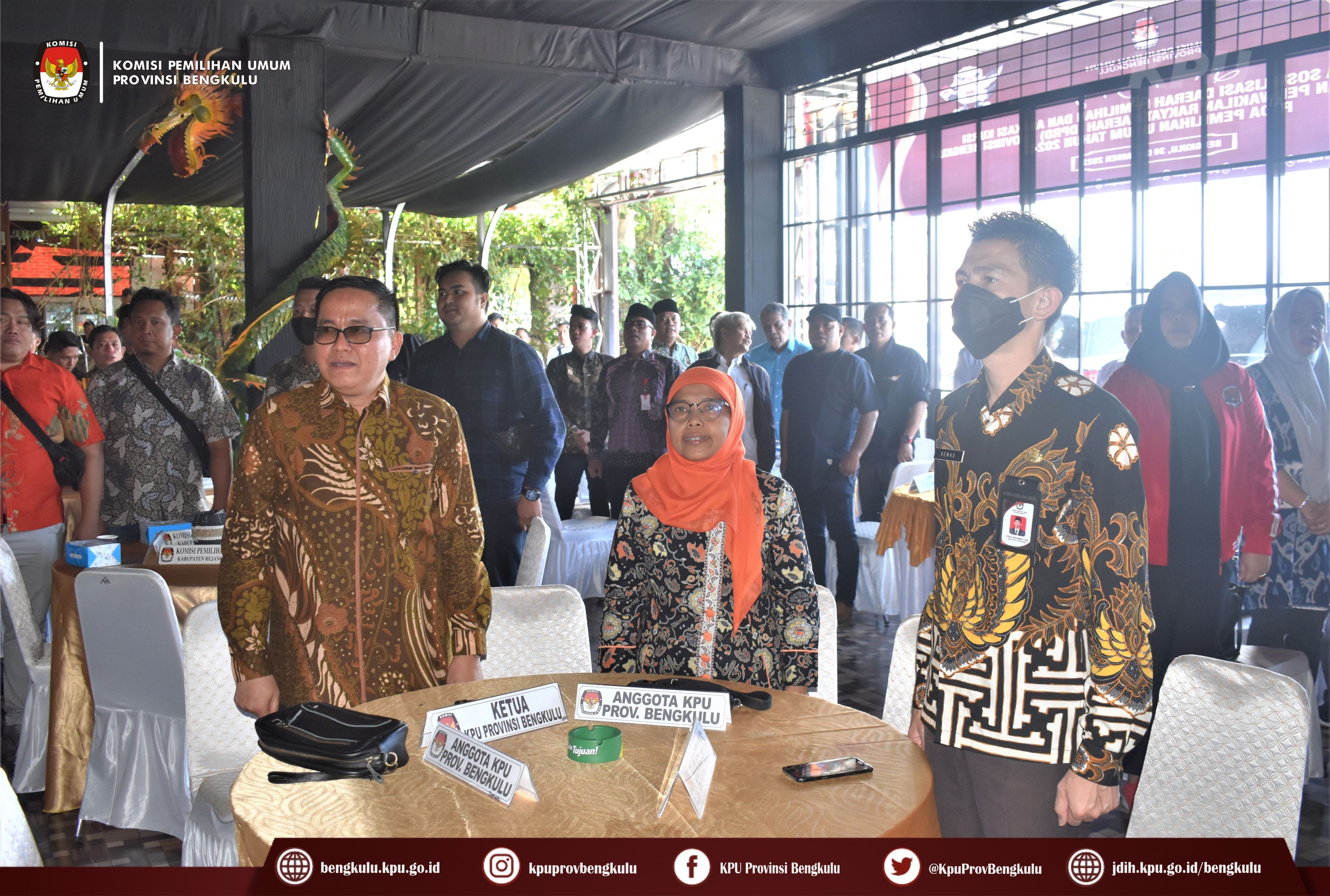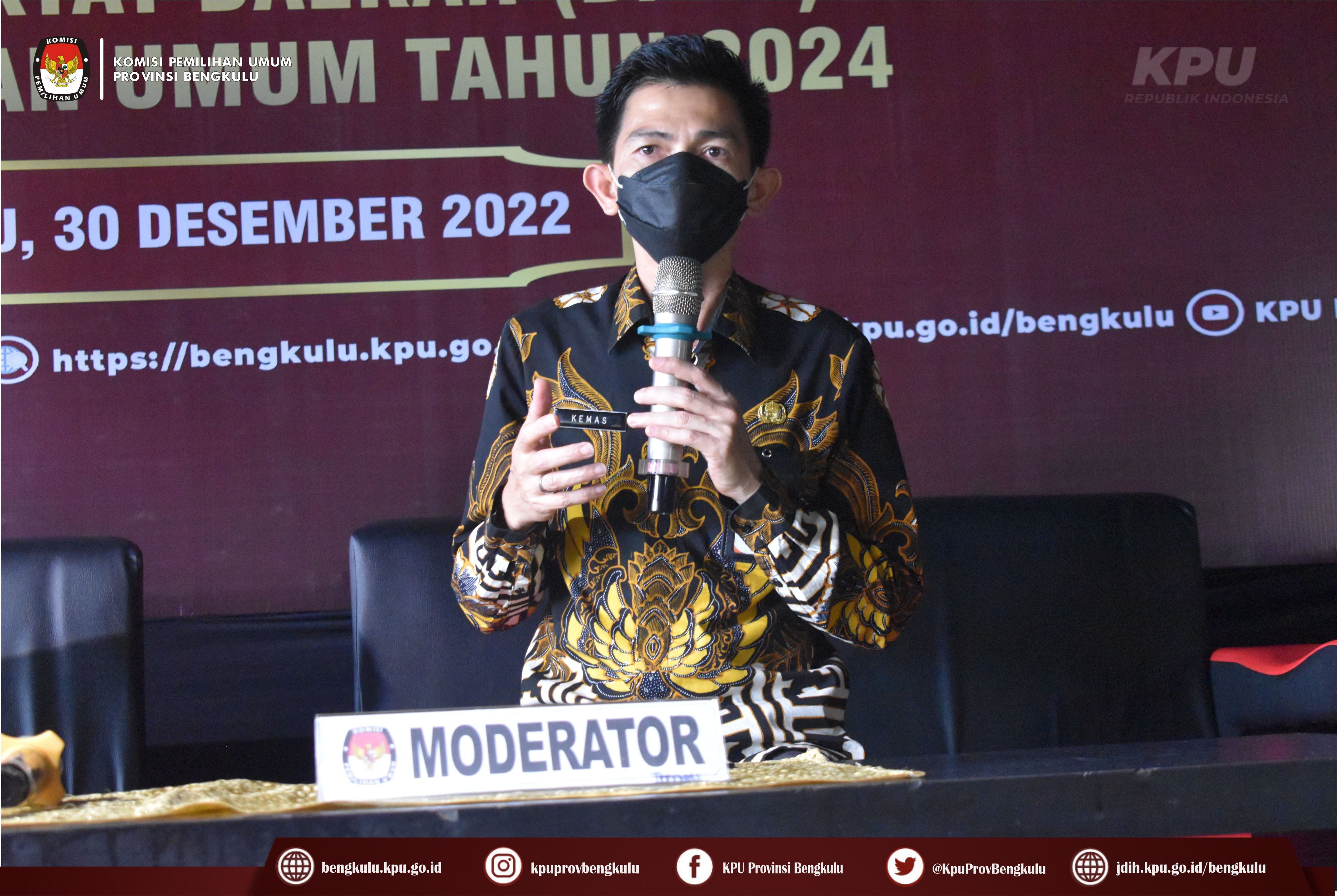 Bengkulu-bengkulu.kpu.go.id, Ketua KPU Provinsi Bengkulu Irwan Saputra bersama Anggota KPU Provinsi Bengkulu Siti Baroroh, Emex Verzoni, dan Irna Riza Yuliastuty serta Sekretaris Kemas Mohammad Ajir membuka Sosialisasi Daerah Pemilihan dan Alokasi Kursi Anggota DPRD Provinsi Bengkulu pada Pemilu Tahun 2024 di Dapur Senandung, Jum’at (30/12).