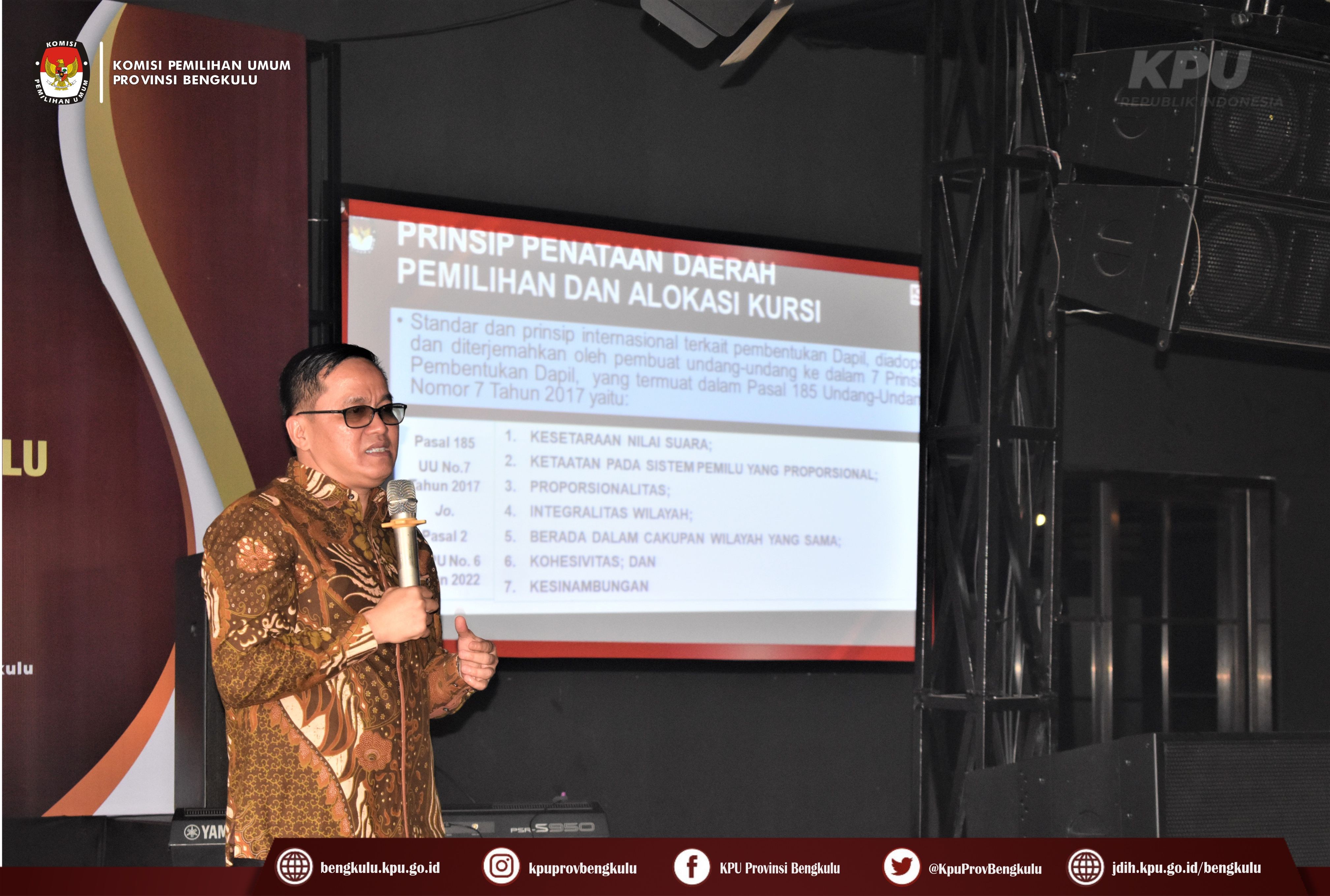 Dalam sambutannya Irwan menyampaikan bahwa sesuai dengan Pasal 185 Undang-Undang Nomor 7 Tahun 2017 Penataan Daerah Pemilihan dan Alokasi Kursi wajib memenuhi 7 (tujuh) prinsip, yaitu Kesetaraan nilai suara, Ketaatan pada sistem pemilu yang proporsional, proporsionalitas, integralitas wilayah, berada dalam cakupan wilayah yang sama, kohesivitas dan kesinambungan. Untuk itu, ditambah Irwan KPU Provinsi Bengkulu berkewajiban melakukan sosialisasi rancangan dapil dan alokasi kursi yang akan diigunakan pada Pemilu Tahun 2024 guna mendapatkan masukan dan saran sebelum ditetapkan oleh KPU Republik Indonesia. Setelah dibuka acara dilanjutkan dengan penyampaian materi oleh Anggota KPU Provinsi Bengkulu Emex Verzoni dan dimoderatori oleh Sekretaris KPU Provinsi Bengkulu Kemas Mohammad Ajir. Emex menjelaskan 7 (tujuh) prinsip penataan dapil dan alokasi kursi berdasarkan DAK2, urgensi penataan dapil, mekanisme penghitungan alokasi kursi daerah pemilihan, simulasi rancangan dapil dan alokasi Anggota berdasarkan jumlah penduduk pada DAK2, penjelasan 7 (tujuh) dapil dengan memperhatikan 7 (tujuh) prinsip. Berdasarkan Lampiran UU Nomor 7 Tahun 2022 dan PKPU 6 Tahun 2022 jumlah Dapil di Provinsi Bengkulu ada 7 (tujuh) dapil dengan 45 (empat puluh lima) kursi.