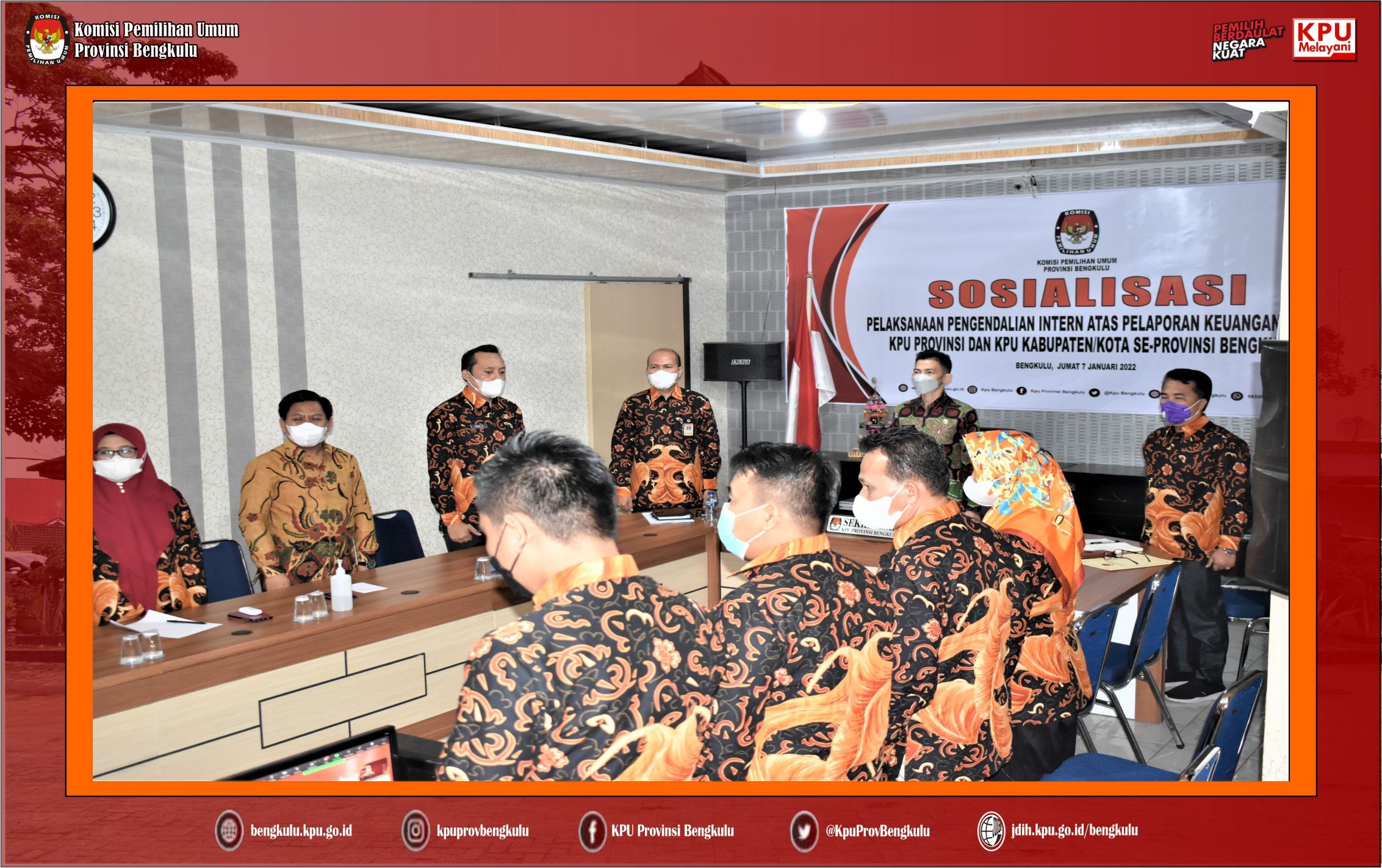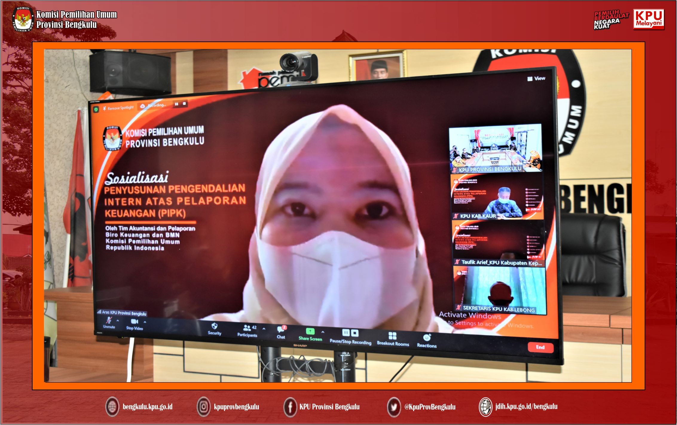#TemanPemilih, KPU Provinsi Bengkulu melaksanakan Sosialisasi Pelaksanaan Pengendalian Intern atas Pelaporan Keuangan (PIPK) KPU Provinsi dan KPU Kabupaten/Kota Se-Provinsi Bengkulu secara daring (zoom meeting) pada Jum’at (7/1). Peserta sosialisasi ini adalah Sekretaris, Kasubbag Keuangan Umum dan Logistik, Operator SAIBA, Operator SIMAK-BMN, Bendahara Pengeluaran APBN) dan Pengelola Keuangan KPU Kabupaten/Kota Se-Provinsi Bengkulu. Acara dibuka oleh Sekretaris KPU Provinsi Bengkulu Kemas M Ajir, dan Kabag Keuangan Umum dan Logistik Sudirman, Kasubbag Keuangan M. Benny Eka Putra, dan Kasubbag Umum dan Logistik Ronny Novanda. Setelah dibuka acara dilanjutkan dengan penyampaian materi dari Narasumber, yaitu Kepala Bagian Akuntansi dan Pelaporan Keuangan Biro Keuangan dan BMN KPU RI, M. Aminsyah. Aminsyah menyampaikan materi terkait Pelaksanaan PIPK untuk mendukung proses Penyusunan Laporan Keuangan Unaudited 2021.