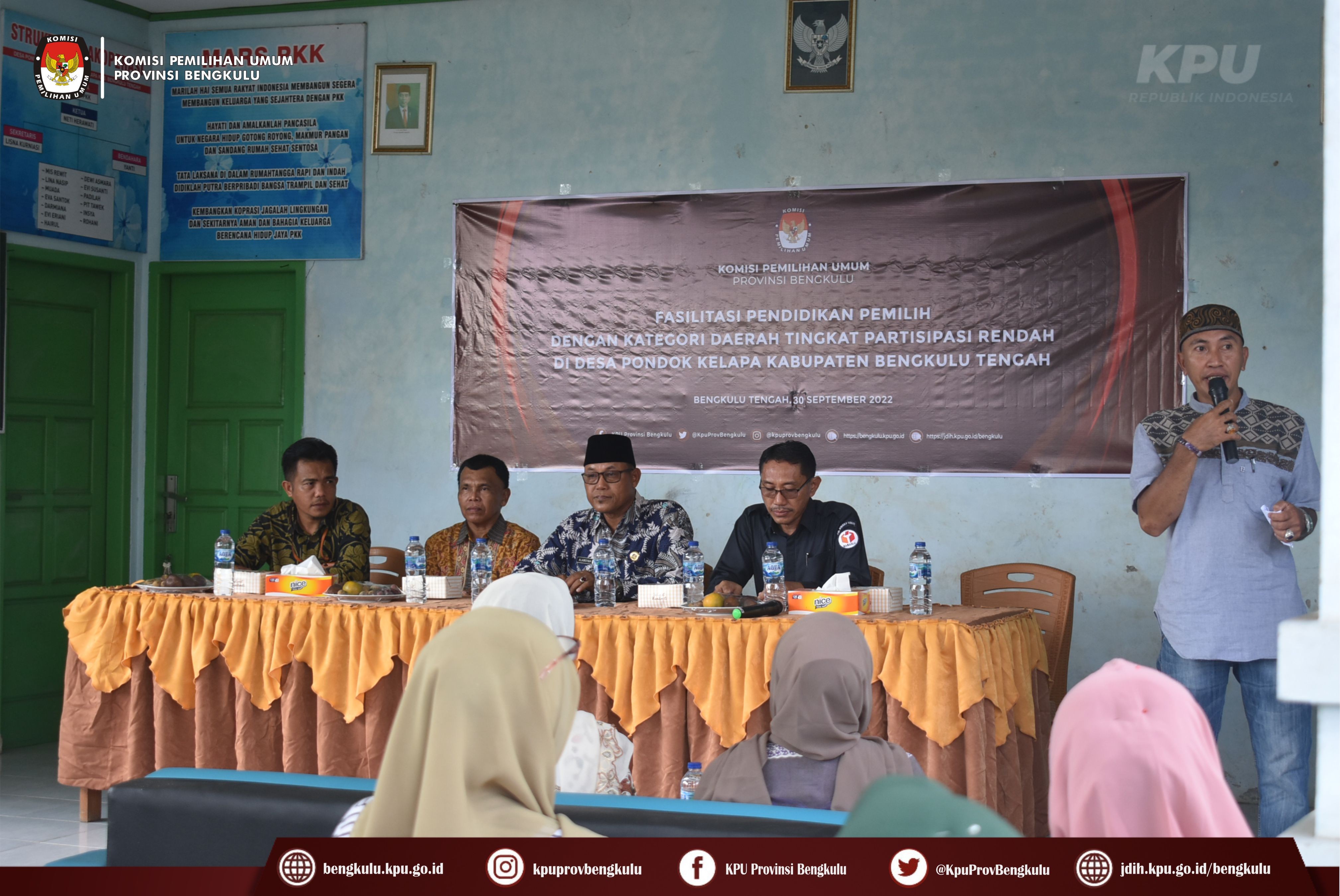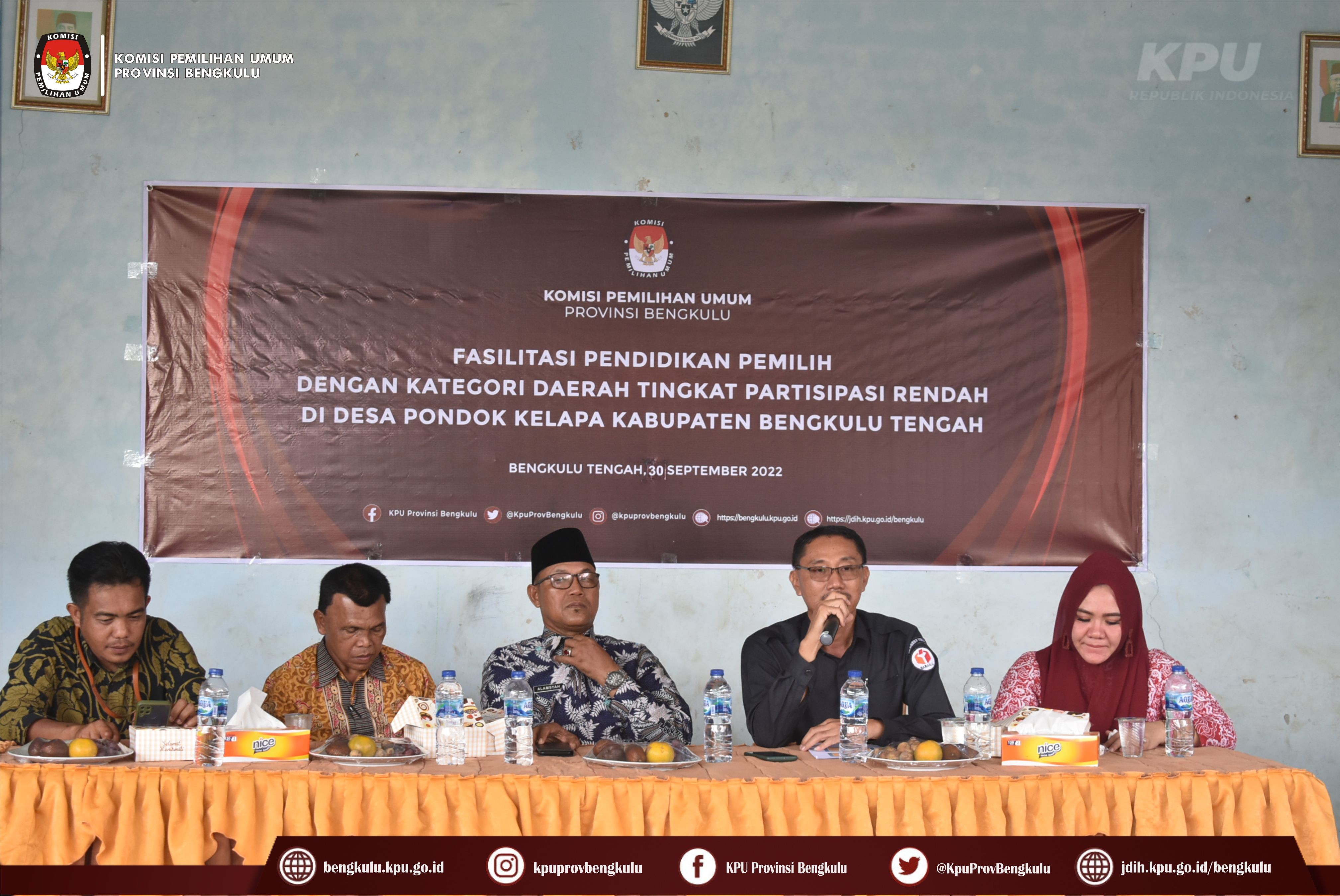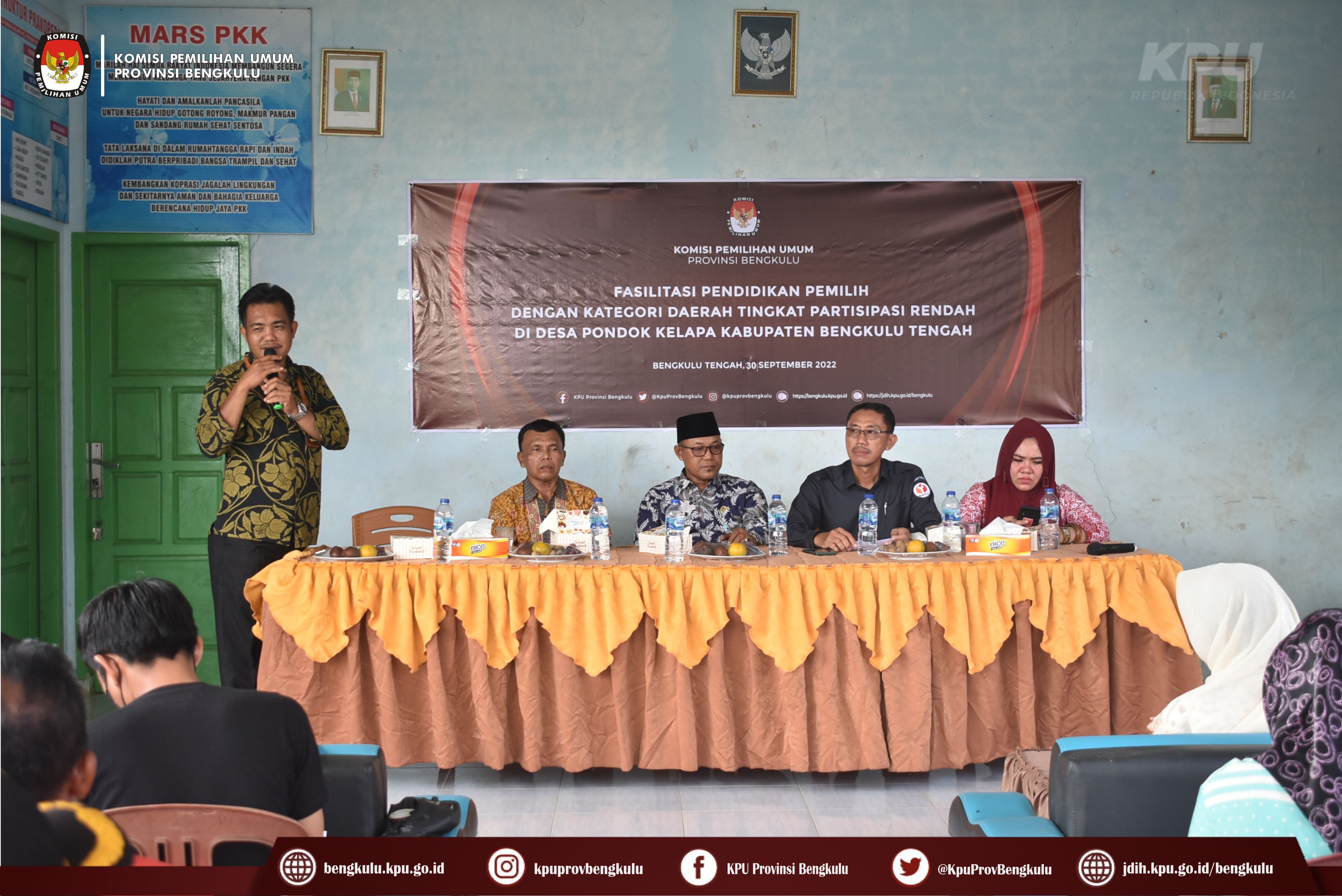 Haidir bahwa Fasilitasi Pendidikan Pemilih Dengan Kategori Daerah Tingkat Partisipasi Rendah Di Desa Pondok Kelapa Kabupaten Bengkulu Tengah Tahun 2022 sebagaimana diatur dalam Peraturan KPU Nomor 10 Tahun 2018 tentang Sosialisasi, Pendidikan Pemilih, dan Partisipasi Masyarakat dalam Penyelenggaraan Pemilihan Umum. Maka perlu dilakukan Pendidikan Pemilih Dengan Kategori Daerah Tingkat Partisipasi Rendah Di Desa Pondok Kelapa Kabupaten Bengkulu Tengah Tahun 2022 sehingga nantinya para peserta ini dapat menjadi petugas fasilitator yang menyampaikan kembali informasi Tahapan Pemilu kepada pemilih dalam upaya peningkatan Partisipasi Pemilih di Pemilihan Serentak Tahun 2024.