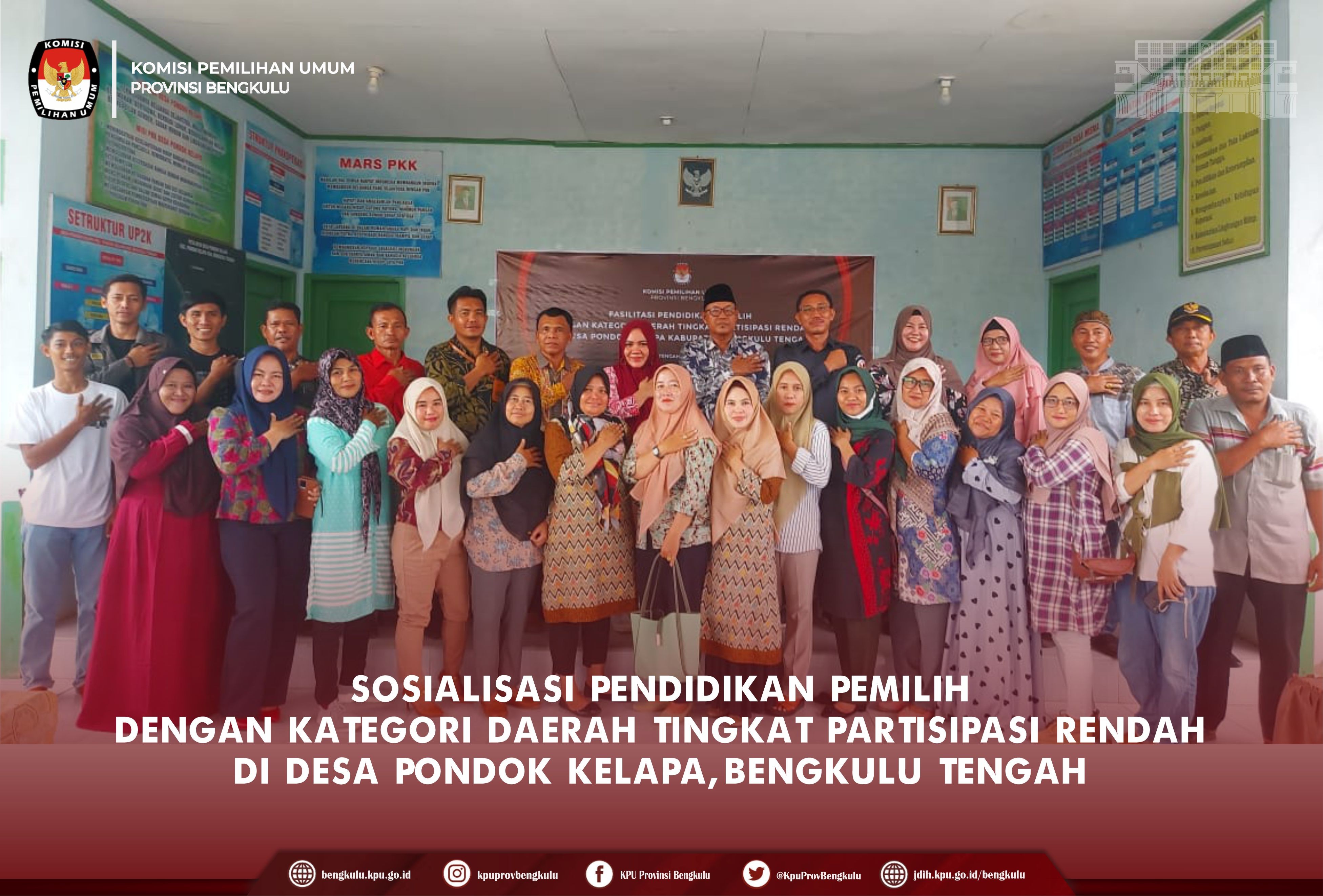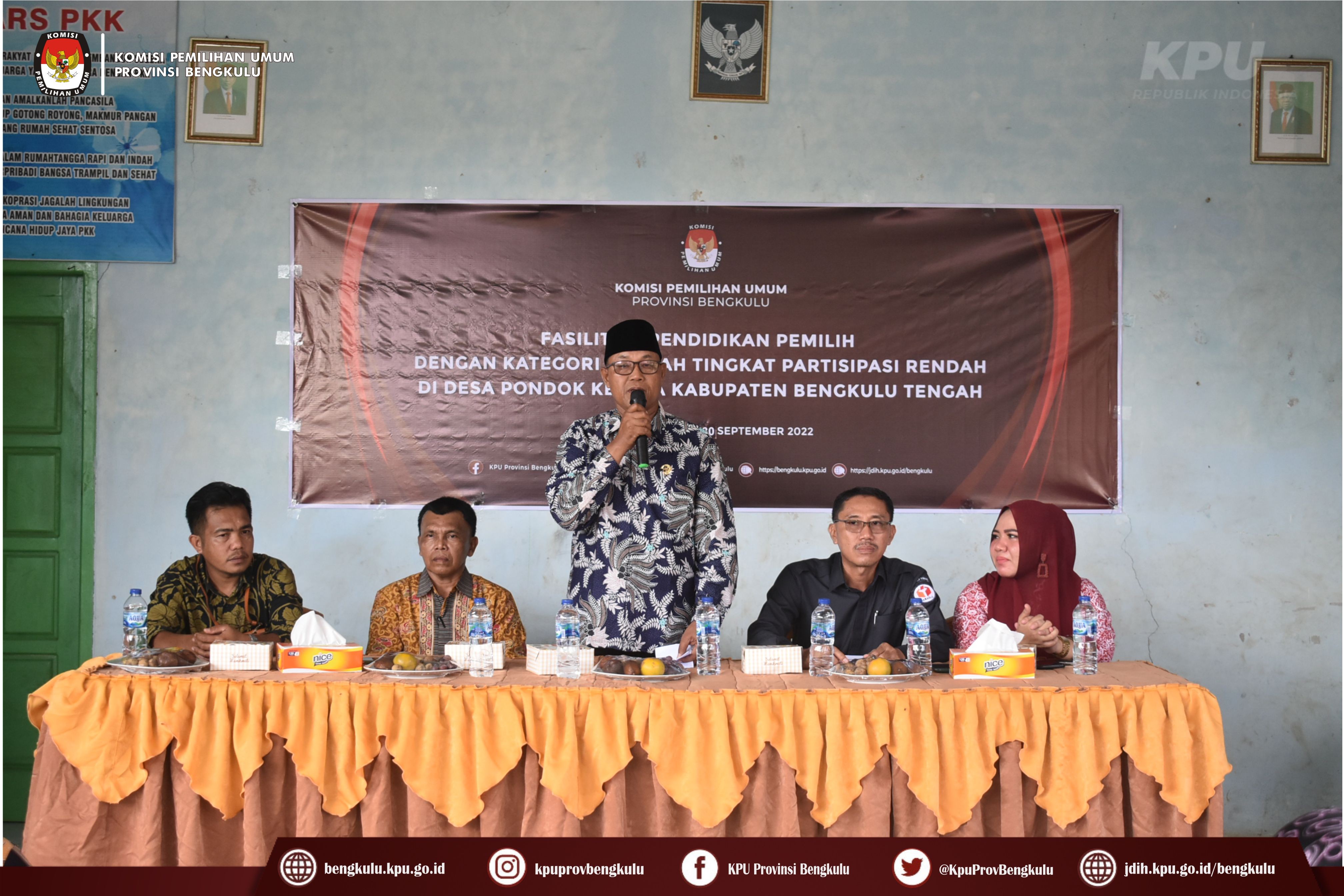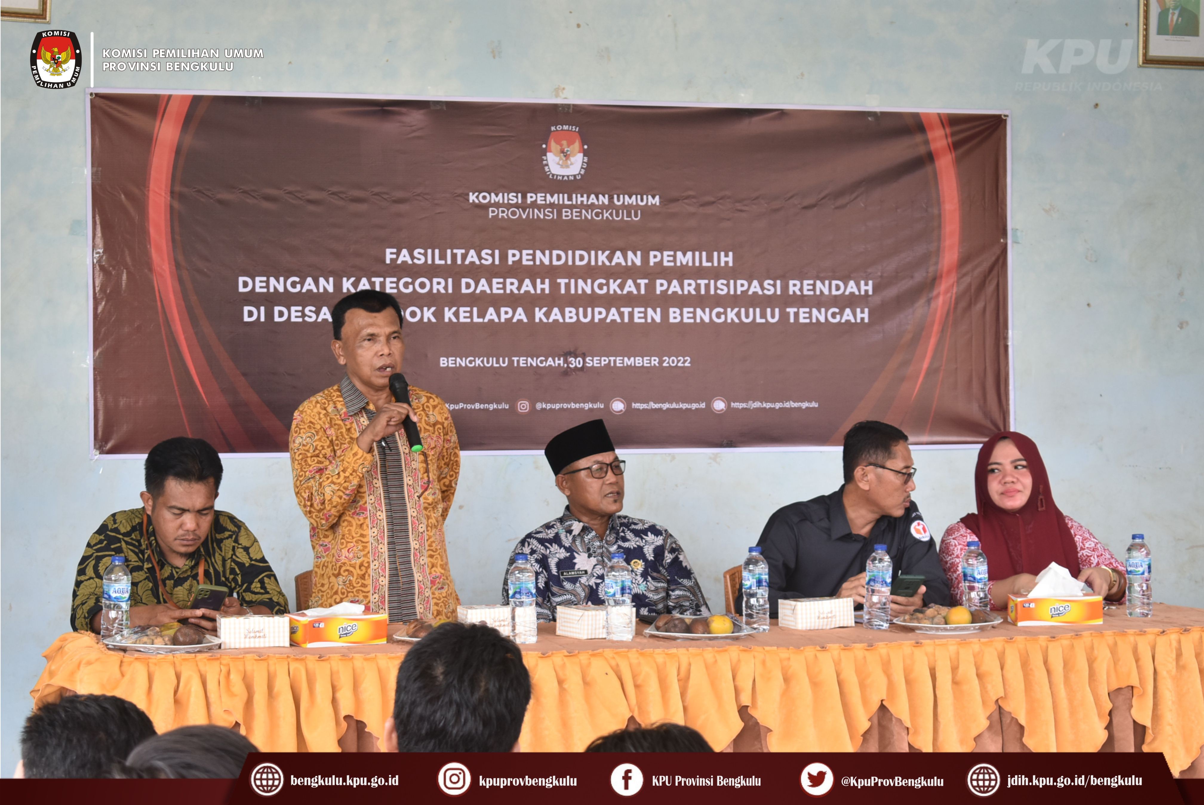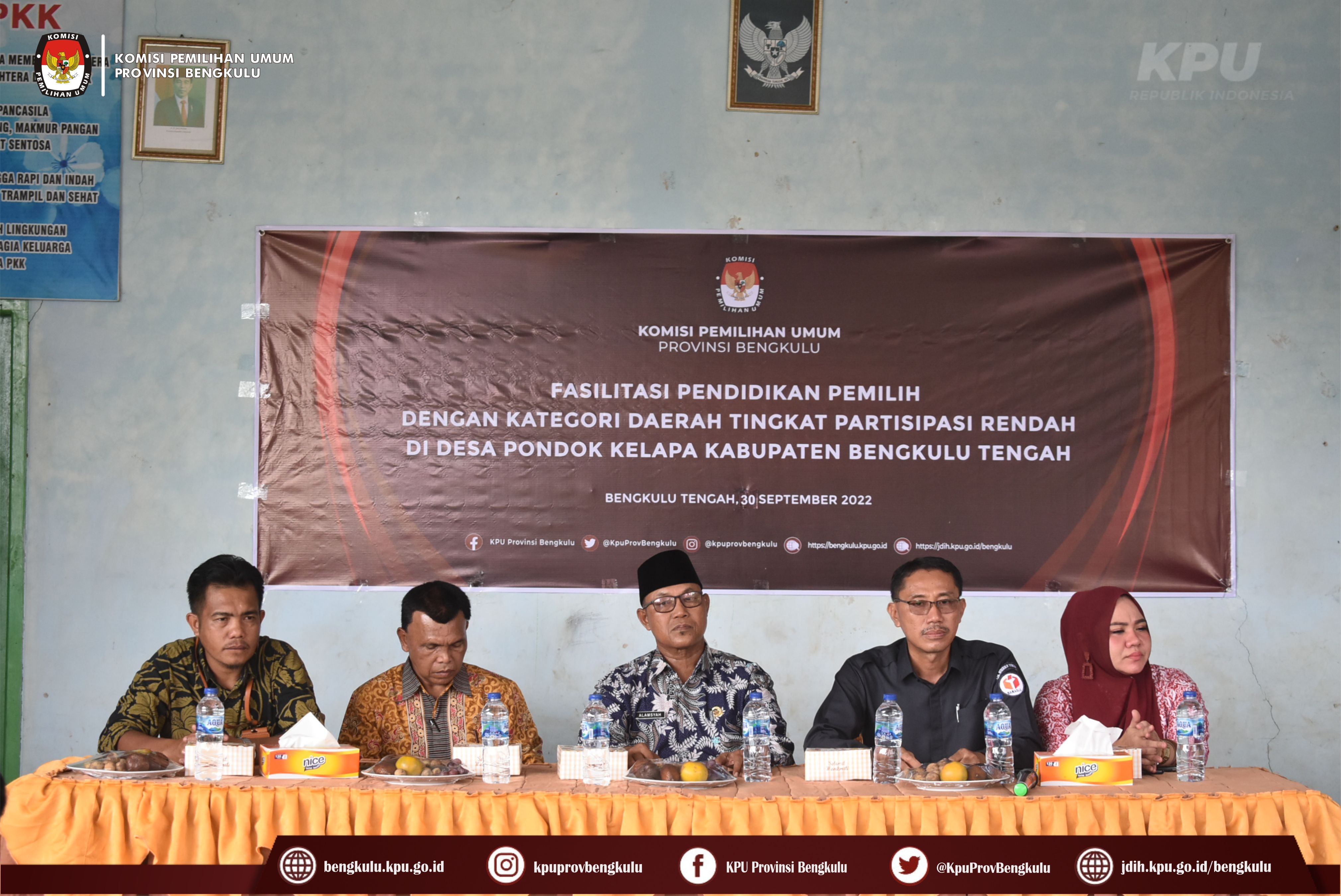 Haidir bahwa Fasilitasi Pendidikan Pemilih Dengan Kategori Daerah Tingkat Partisipasi Rendah Di Desa Pondok Kelapa Kabupaten Bengkulu Tengah Tahun 2022 sebagaimana diatur dalam Peraturan KPU Nomor 10 Tahun 2018 tentang Sosialisasi, Pendidikan Pemilih, dan Partisipasi Masyarakat dalam Penyelenggaraan Pemilihan Umum. Maka perlu dilakukan Pendidikan Pemilih Dengan Kategori Daerah Tingkat Partisipasi Rendah Di Desa Pondok Kelapa Kabupaten Bengkulu Tengah Tahun 2022 sehingga nantinya para peserta ini dapat menjadi petugas fasilitator yang menyampaikan kembali informasi Tahapan Pemilu kepada pemilih dalam upaya peningkatan Partisipasi Pemilih di Pemilihan Serentak Tahun 2024.