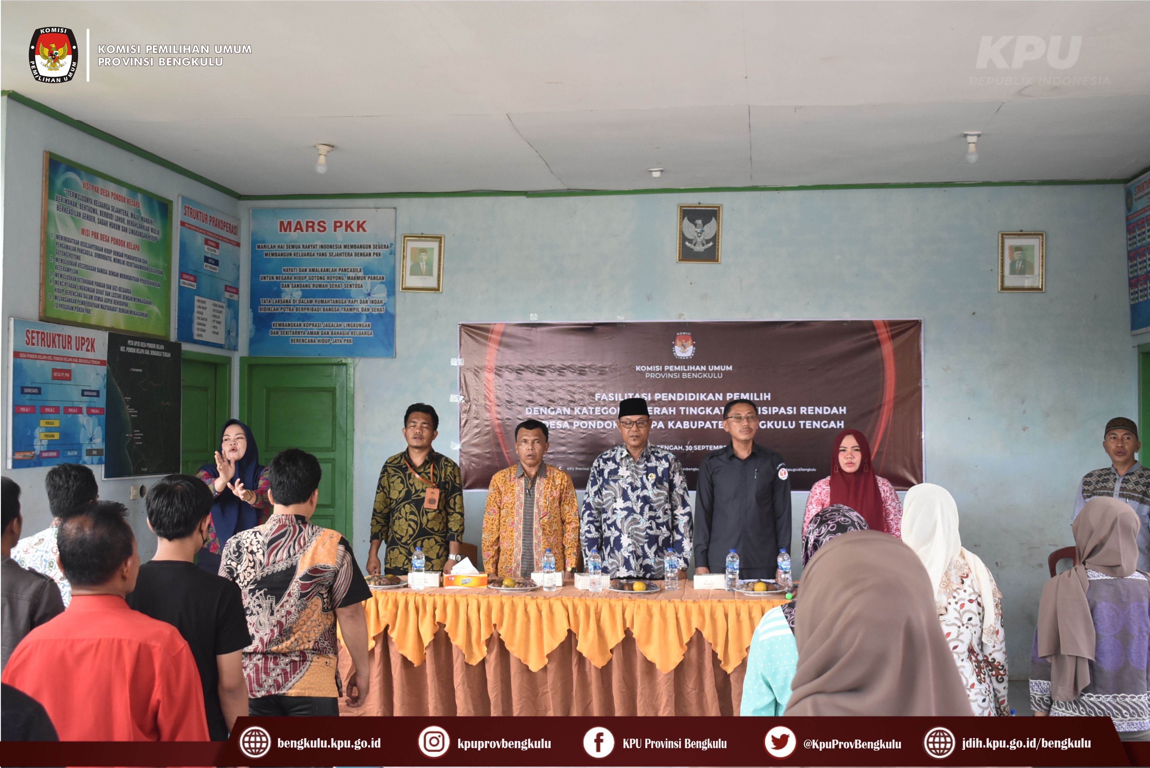Bengkulu-bengkulu.kpu.go.id, Sekretariat KPU Provinsi Bengkulu yang diwakili staf Fitrian Ansyori, Widiarti, Dwi Safitriana dan Meaghito mengikuti kegiatan Fasilitasi Pendidikan Pemilihan Kategori Daerah Tingkat Partisipasi Rendah di Desa Pondok Kelapa Kecamatan Pondok Kelapa Kabupaten Bengkulu Tengah pada Jum’at (30/9). Kegiatan tersebut diikuti sebanyak 25 (dua puluh lima) orang peserta yang berasal dari warga Desa Pondok Kelapa, yaitu Pemilih Pemula, Tokoh Masyarakat, Tokoh Perempuan, Tokoh Adat dan sebagainya. Hadir dalam kegiatan tersebut sebagai Narasumber Anggota KPU Bengkulu Tengah Meiky Helmansyah, Anggota Bawaslu Kabupaten Bengkulu Tengah Edyson dan Kepala Desa Pondok Kelapa Alamsyah. Selain itu, hadir Anggota Ketua Bengkulu Tengah Haidir dan Nora Agustin yang membuka acara sosialisasi pendidikan pemilih secara resmi.