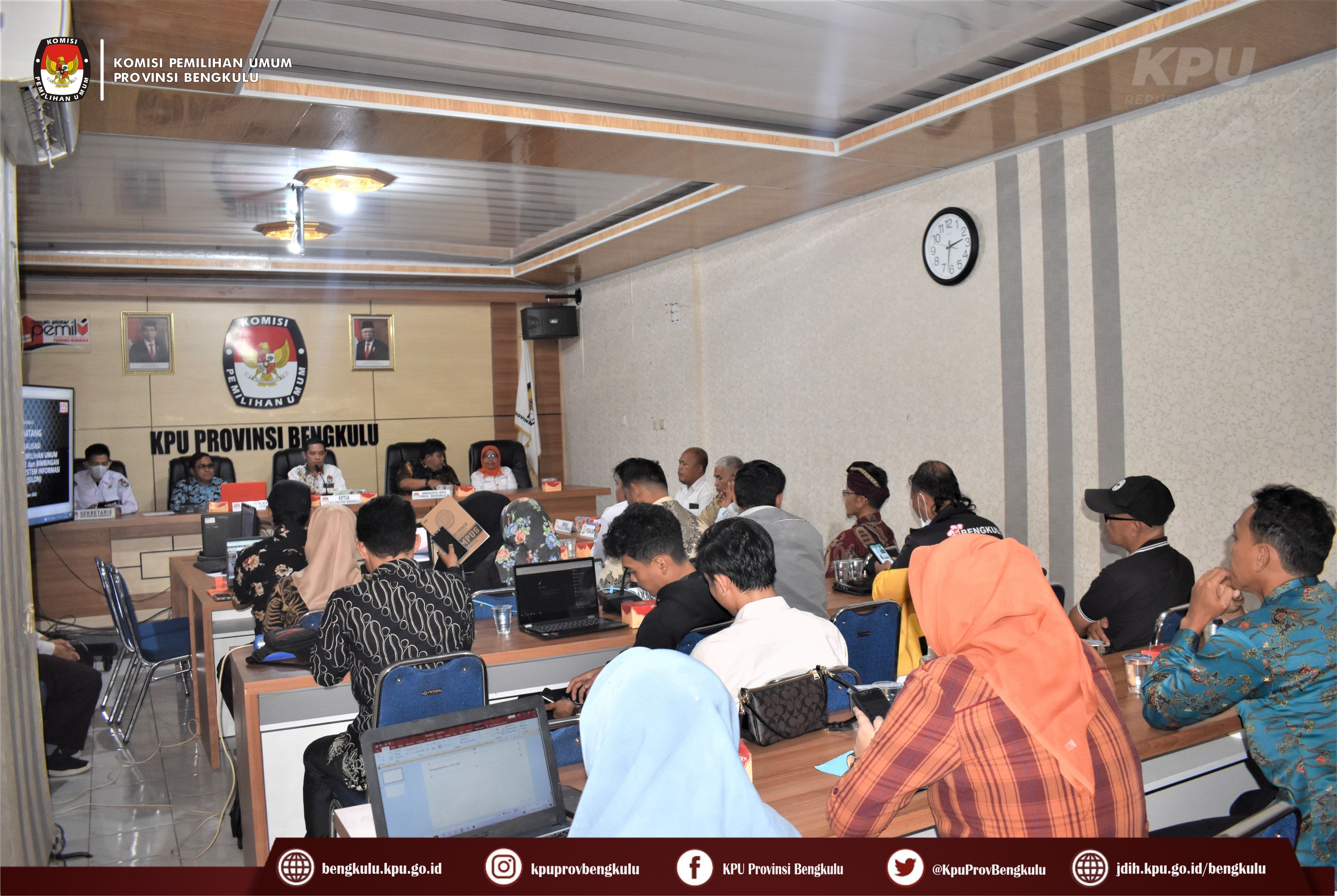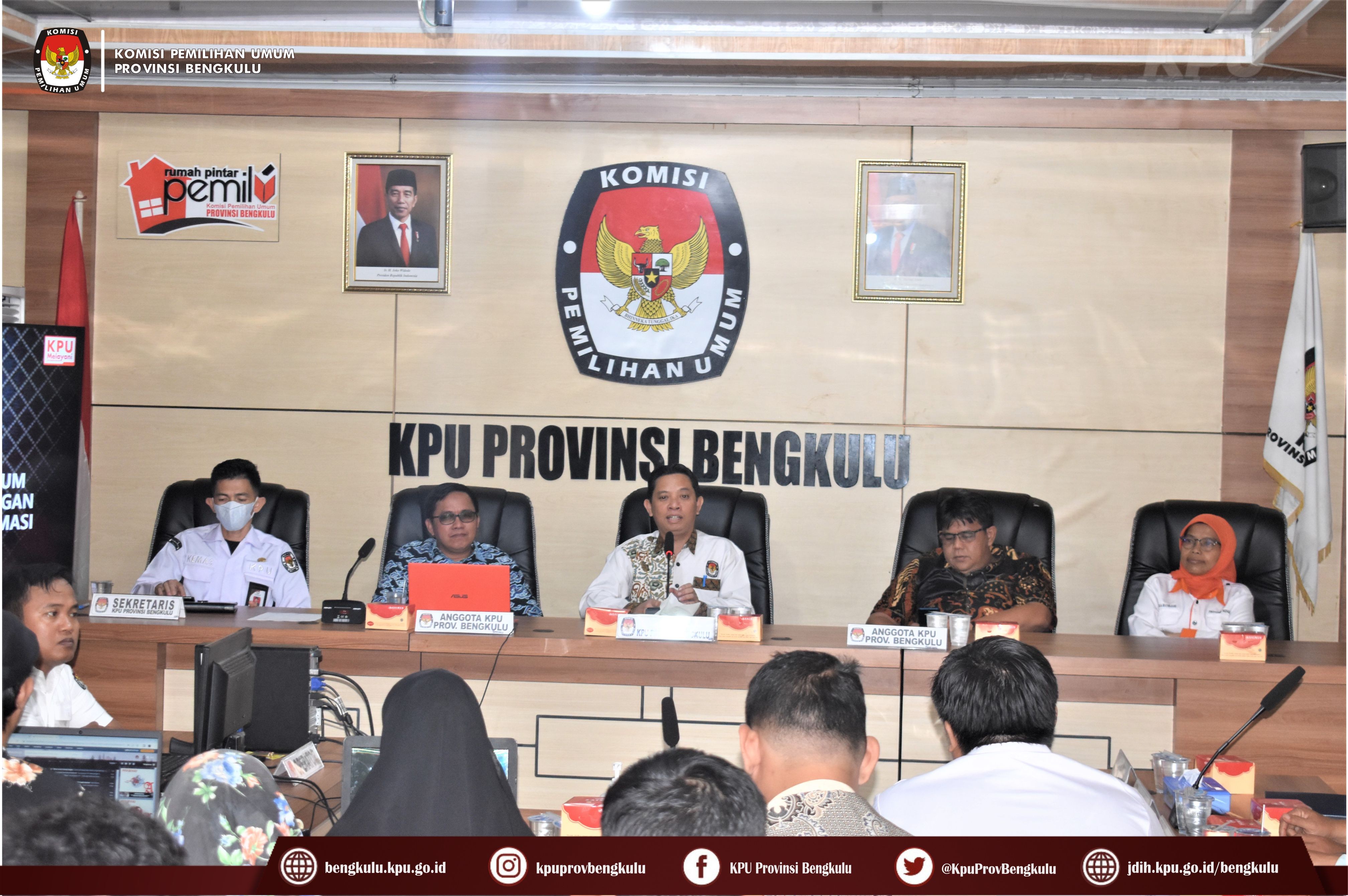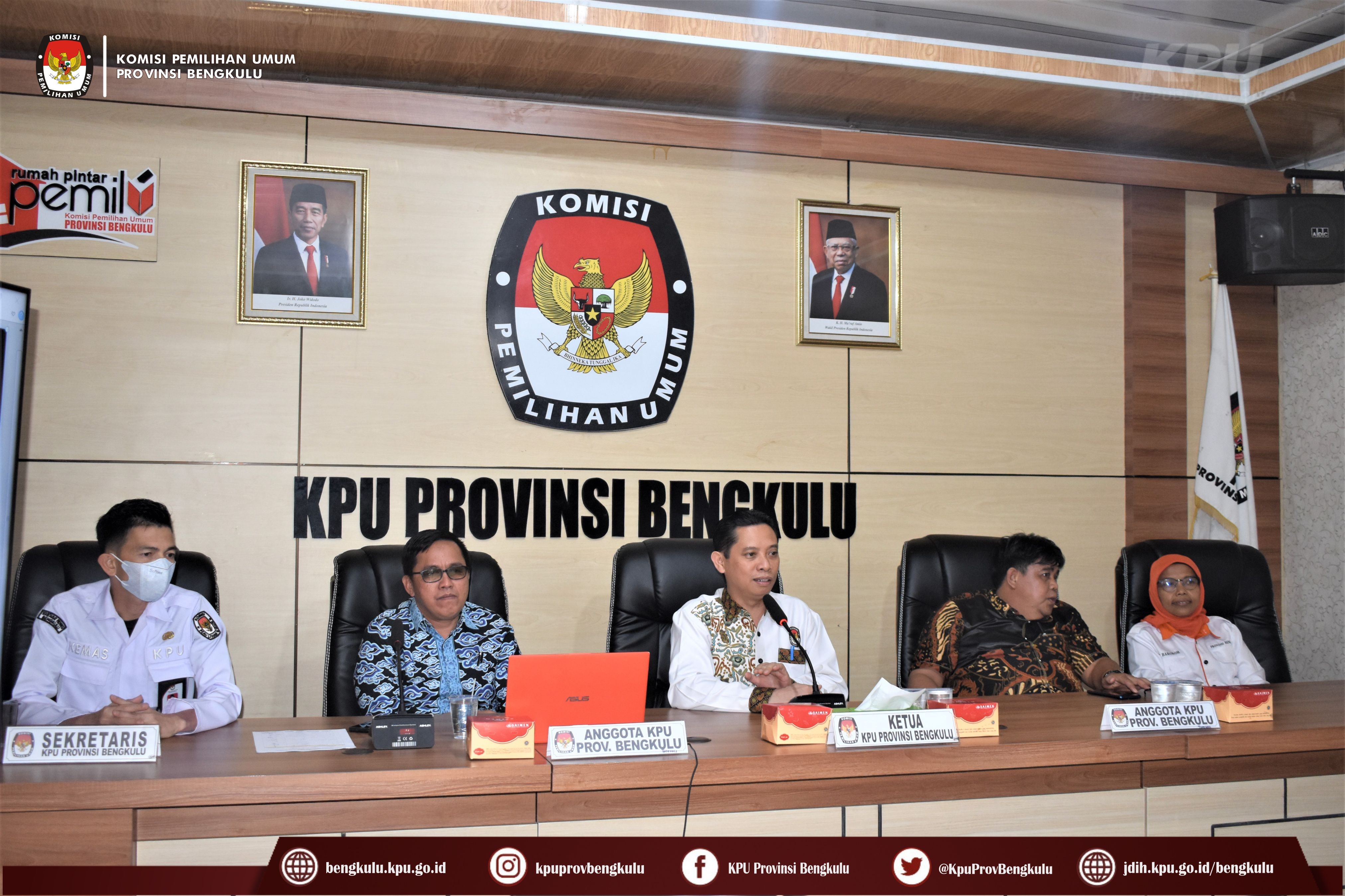 Ketua KPU Provinsi Bengkulu Irwan Saputra didampingi Anggota KPU Provinsi Bengkulu Siti Baroroh, Darlinsyah, dan Emex Verzoni, serta Sekretaris Kemas Mohammad Ajir membuka kegiatan Sosialisasi Peraturan Komisi Pemilihan Umum Nomor 10 Tahun 2022 di Ruang Audio Visual Rumah Pintar Pemilu KPU Provinsi Bengkulu, Senin (12/12).