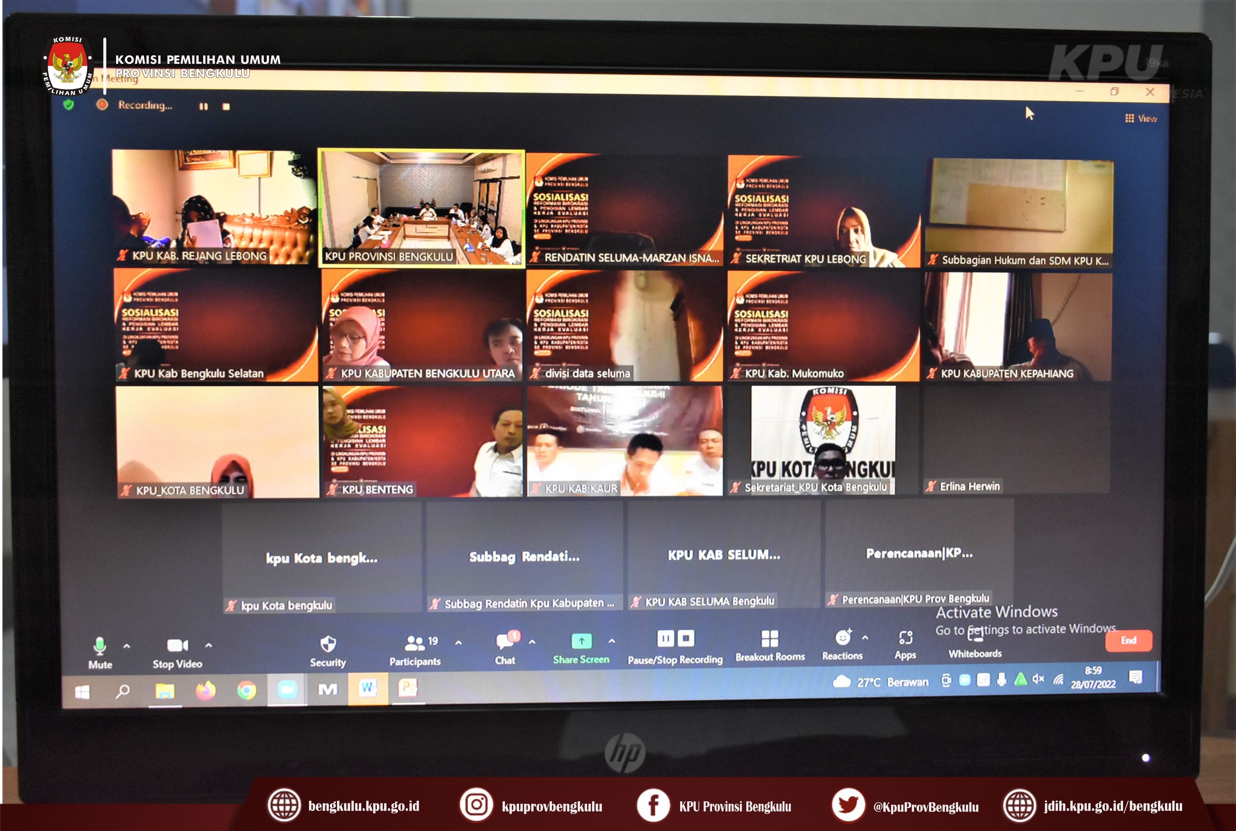Bengkulu-bengkulu.kpu.go.id, Kabag Perencanaan Data dan Informasi KPU Provinsi Bengkulu Hamzah didampingi Kasubbag Perencanaan Azmiyatun, Kasubbag Data dan Informasi Yunita Dika Fitri serta staf membuka acara Sosialisasi Reformasi Birokrasi dan Pengisian Lembar Kerja Evaluasi (LKE) di Lingkungan KPU Provinsi dan KPU Kabupaten/Kota Se-Provinsi Bengkulu secara daring (zoom meeting), Kamis (28/7). Sosialisasi diikuti Sekretaris, Kasubbag dan Staf Sub Bagian Perencanaan Data dan Informasi KPU Kabupaten/Kota Se-Provinsi Bengkulu. Hamzah menyampaikan bahwa sosialisasi ini dalam rangka menindaklanjuti Surat Ketua KPU RU Nomor 314/ORT.07-Kpt/01/KPU/V/2021 tentang Petunjuk Teknis Pelaksanaan Reformasi di Lingkungan Sekretariat KPU, KPU Provinsi dan KPU Kabupaten Kota/Kota dan Surat Plh. Sekjen KPU RI Nomor 767/ORT/07-Und/01/2022 perihal Training of Trainer Pengisian LKE di Lingkungan KPU Tahun 2022.