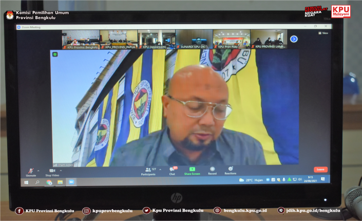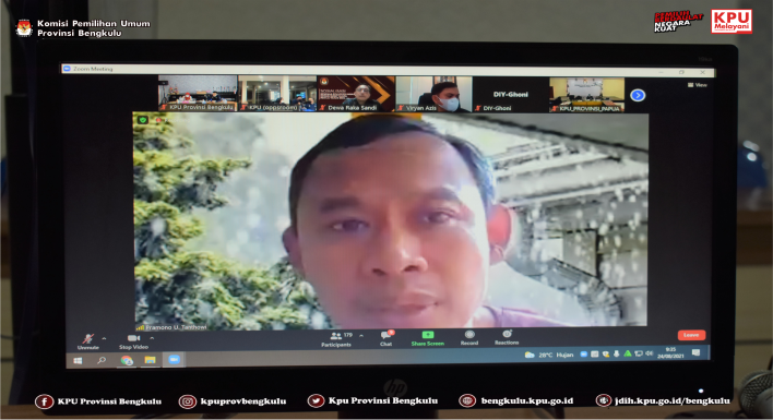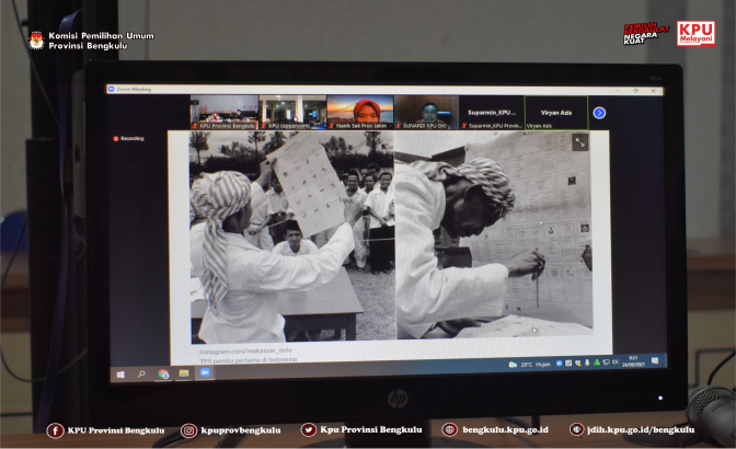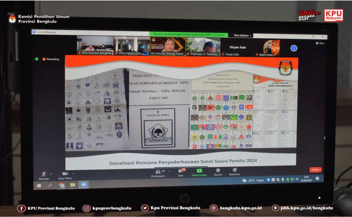 Anggota KPU Provinsi Bengkulu Siti Baroroh dan Sekretaris Kemas M Ajir mengikuti Sosialisasi Rencana Penyederhanaan Desain Surat Suara Pemilu Tahun 2024 yang dilaksanakan secara daring (zoom meeting) oleh KPU Republik Indonesia pada Selasa (24/8). Acara ini diikuti KPU Provinsi dan KPU Kabupaten/Kota Se-Indonesia. Acara yang dibuka langsung oleh Ketua KPU RI Ilham Saputra dan penyampaian materi dari Anggota KPU RI Evi Novida Ginting Manik, Viryan, I Dewa Kade Wiarsa Raka Sandi, Pramono Ubaid Tanthowi, dan Hasyim Asy’ari.