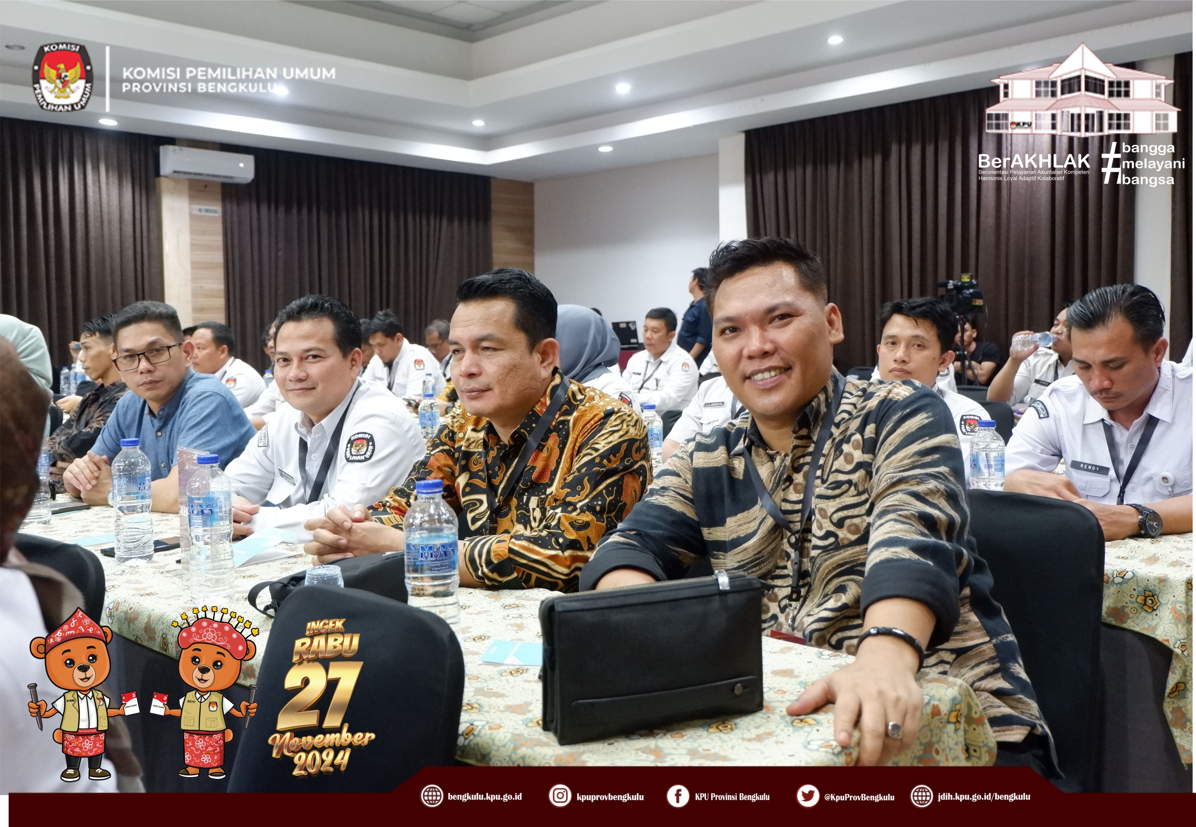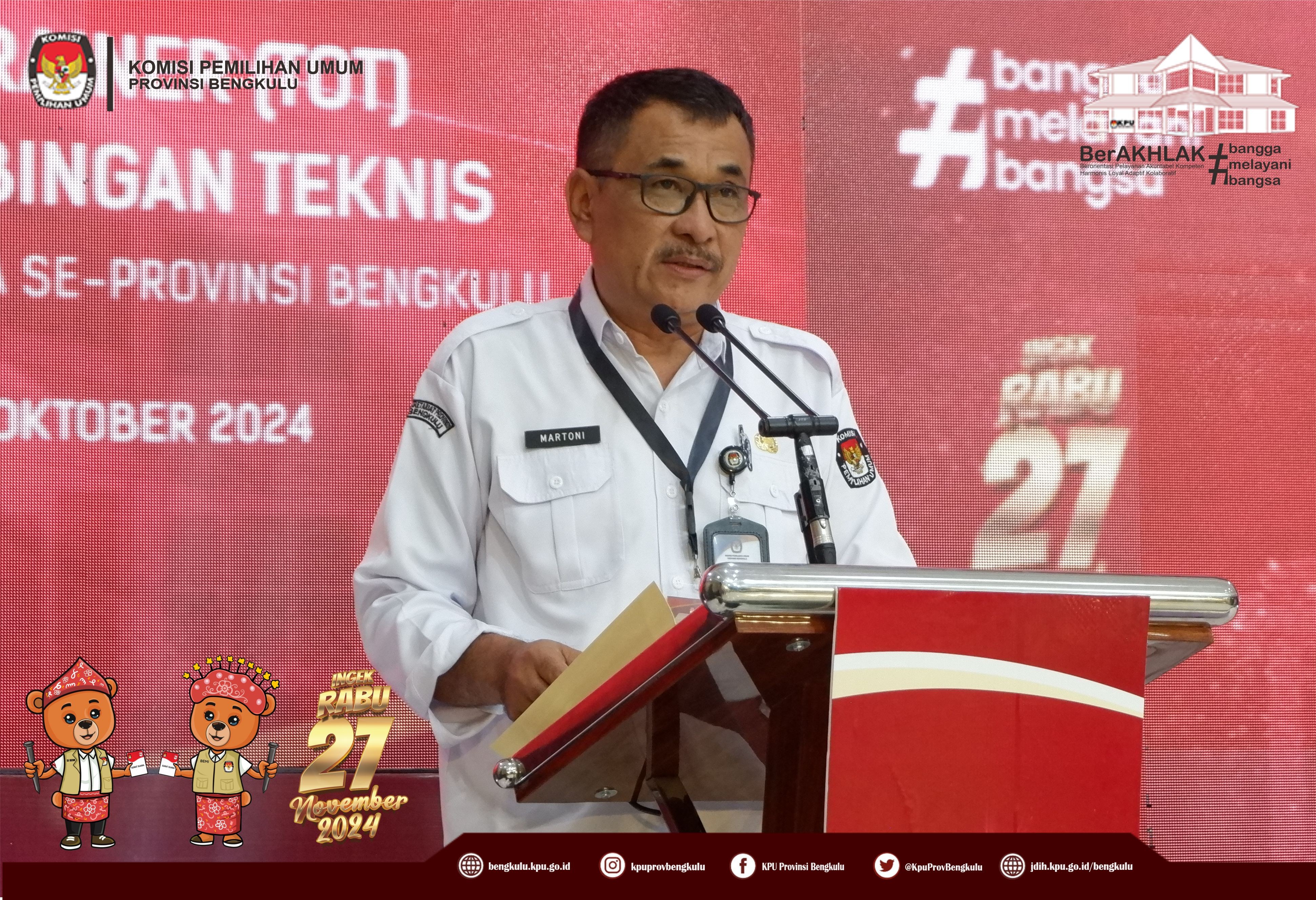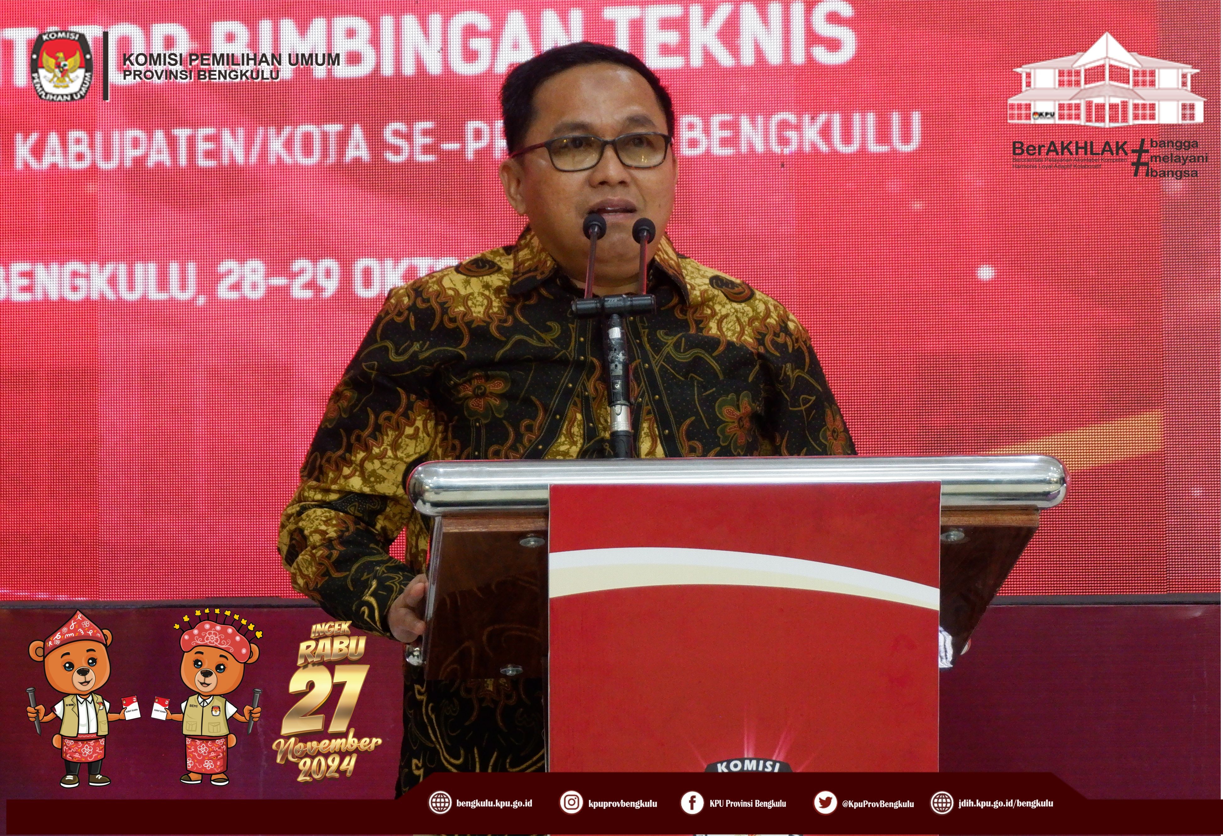 Bengkulu, bengkulu.kpu.go.id - Ketua KPU Provinsi Bengkulu Bapak Rusman Sudarsono, Anggota KPU Provinsi Bengkulu Bapak Alpin Samsen dan Bapak Emex Verzpni serta Sekretaris KPU Provinsi Bengkulu Bapak Kemas Mohammad Ajir membuka Training of Trainer Fasilitator Bimbingan Teknis Kepada KPU Kabupaten/Kota se-Provinsi Bengkulu, Senin (28/10/2024) di Grage Hotel Bengkulu. Peserta kegiatan adalah Ketua, Anggota yang membidangi Divisi Perencanaan Data dan Informasi, Ketua, Anggota yang membidangi Divisi Hukum dan Pengawasan, Kasubbag Perencanaan Data dan Informasi, Kasubbag Hukum dan SDM, Staf yang membidangi Teknis Penyelenggaraan, Staf yang membdangi Parhubmas dan SDM serta Operator Siakba KPU Kabupaten/Kota se-Provinsi Bengkulu. Dalam kesempatan tersebut Ketua dan Anggota KPU Provinsi Bengkulu memberikan arahan kepada peserta kegiatan tersebut.