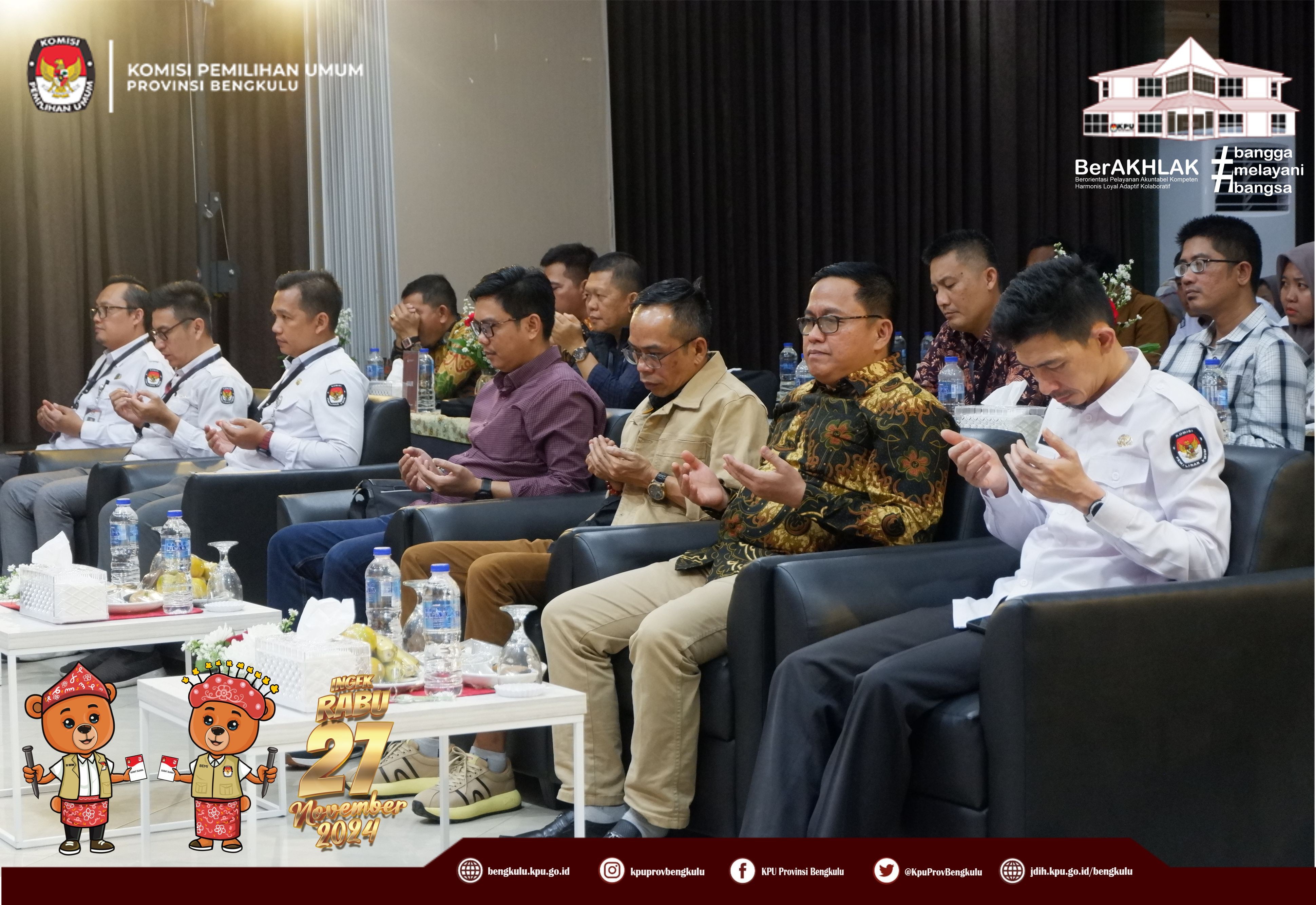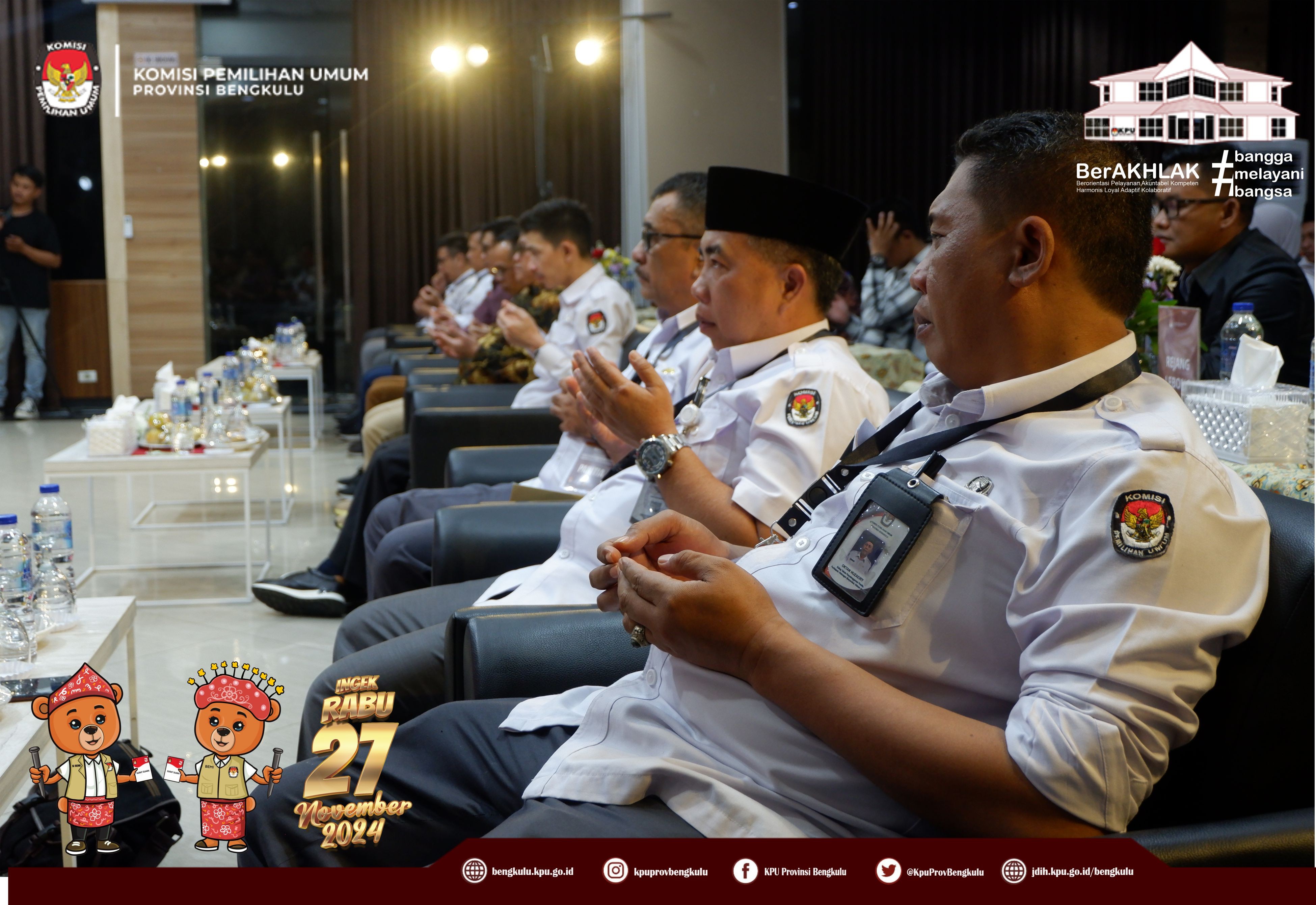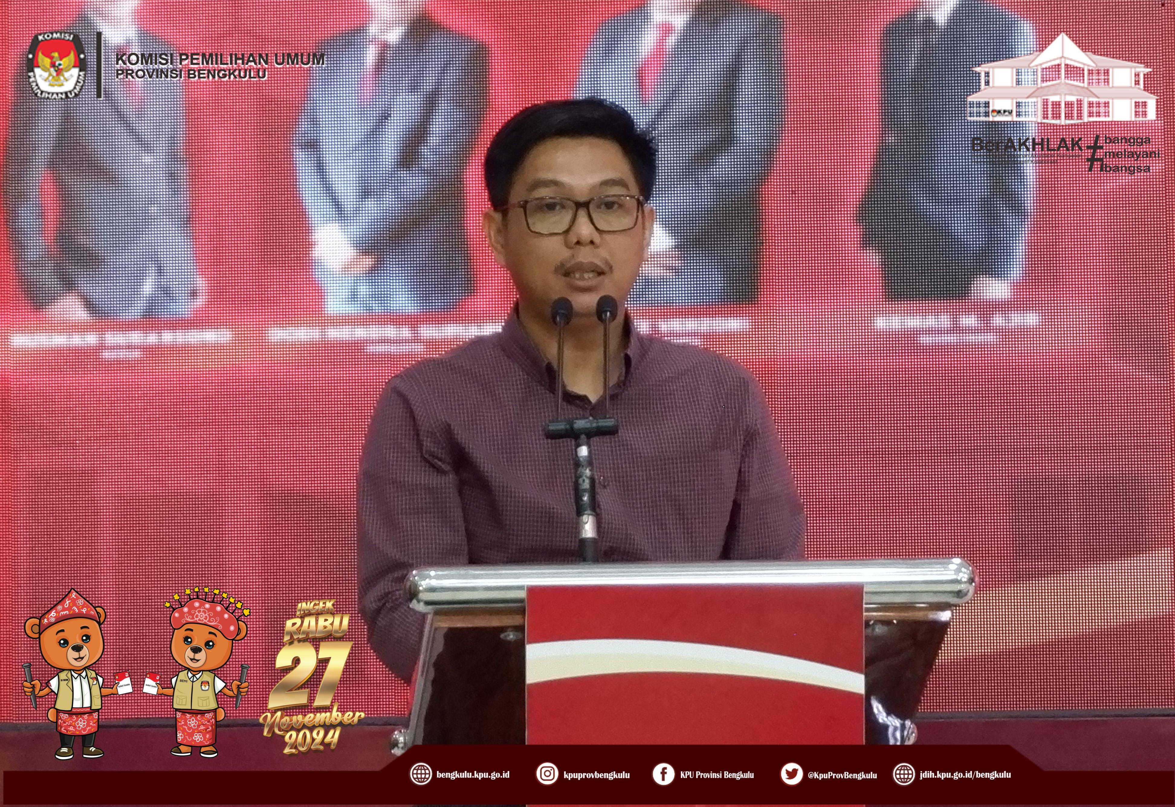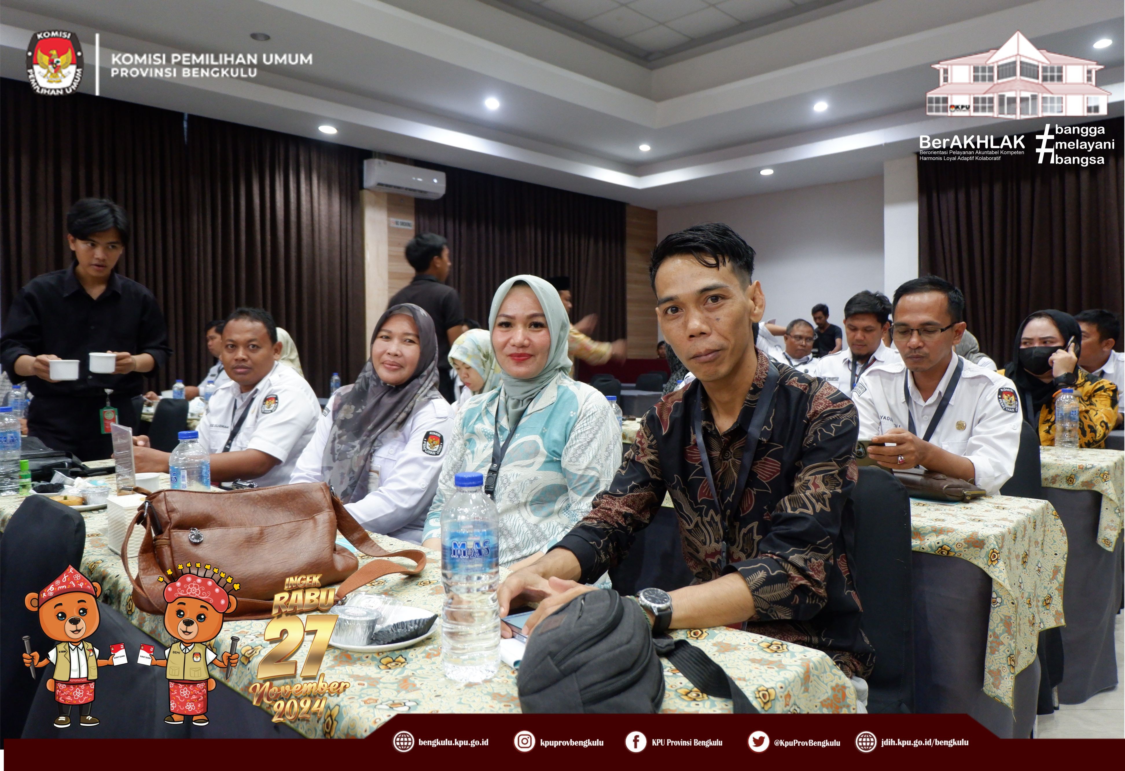 Bengkulu, bengkulu.kpu.go.id - Ketua KPU Provinsi Bengkulu Bapak Rusman Sudarsono, Anggota KPU Provinsi Bengkulu Bapak Alpin Samsen dan Bapak Emex Verzpni serta Sekretaris KPU Provinsi Bengkulu Bapak Kemas Mohammad Ajir membuka Training of Trainer Fasilitator Bimbingan Teknis Kepada KPU Kabupaten/Kota se-Provinsi Bengkulu, Senin (28/10/2024) di Grage Hotel Bengkulu. Peserta kegiatan adalah Ketua, Anggota yang membidangi Divisi Perencanaan Data dan Informasi, Ketua, Anggota yang membidangi Divisi Hukum dan Pengawasan, Kasubbag Perencanaan Data dan Informasi, Kasubbag Hukum dan SDM, Staf yang membidangi Teknis Penyelenggaraan, Staf yang membdangi Parhubmas dan SDM serta Operator Siakba KPU Kabupaten/Kota se-Provinsi Bengkulu. Dalam kesempatan tersebut Ketua dan Anggota KPU Provinsi Bengkulu memberikan arahan kepada peserta kegiatan tersebut.