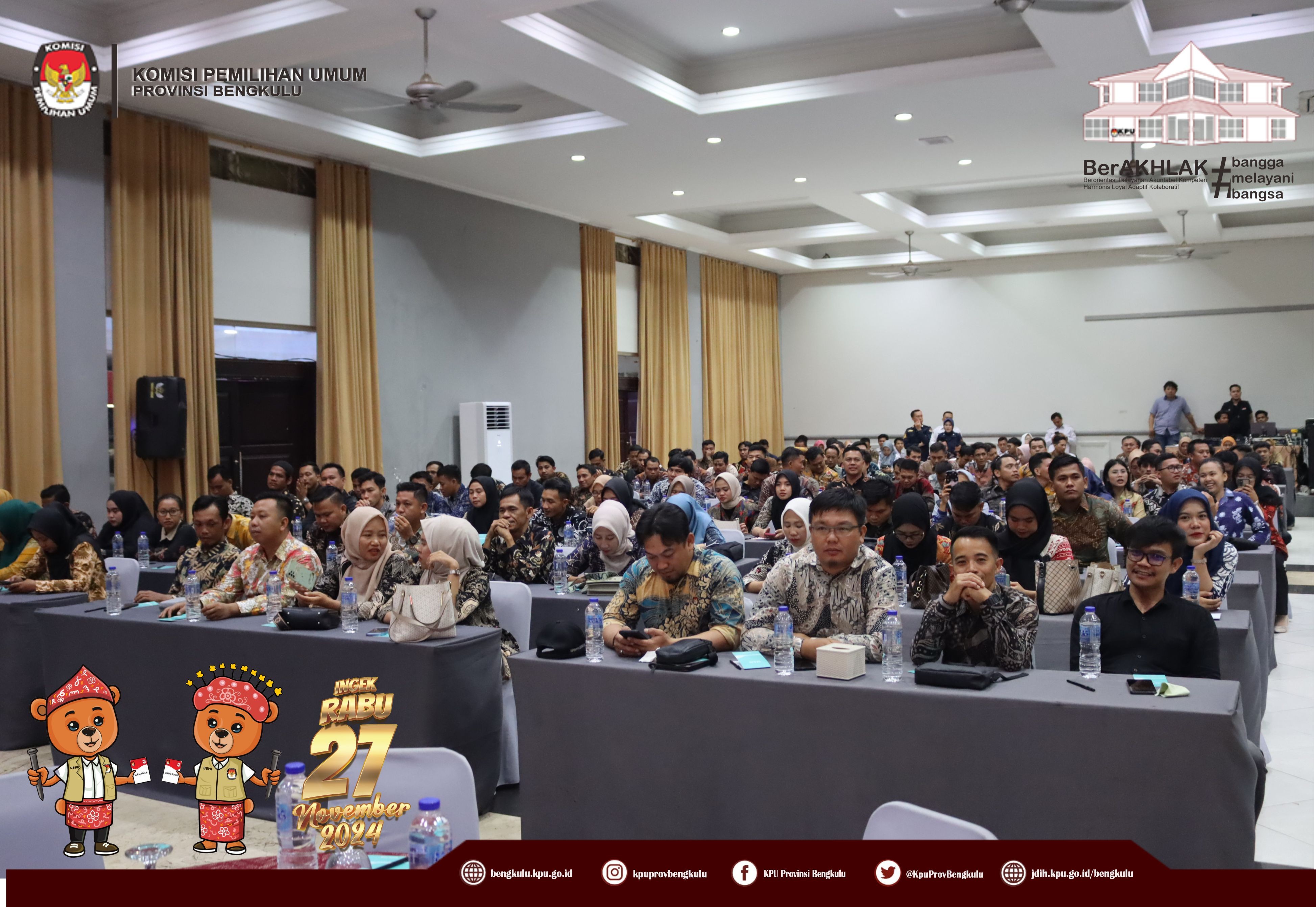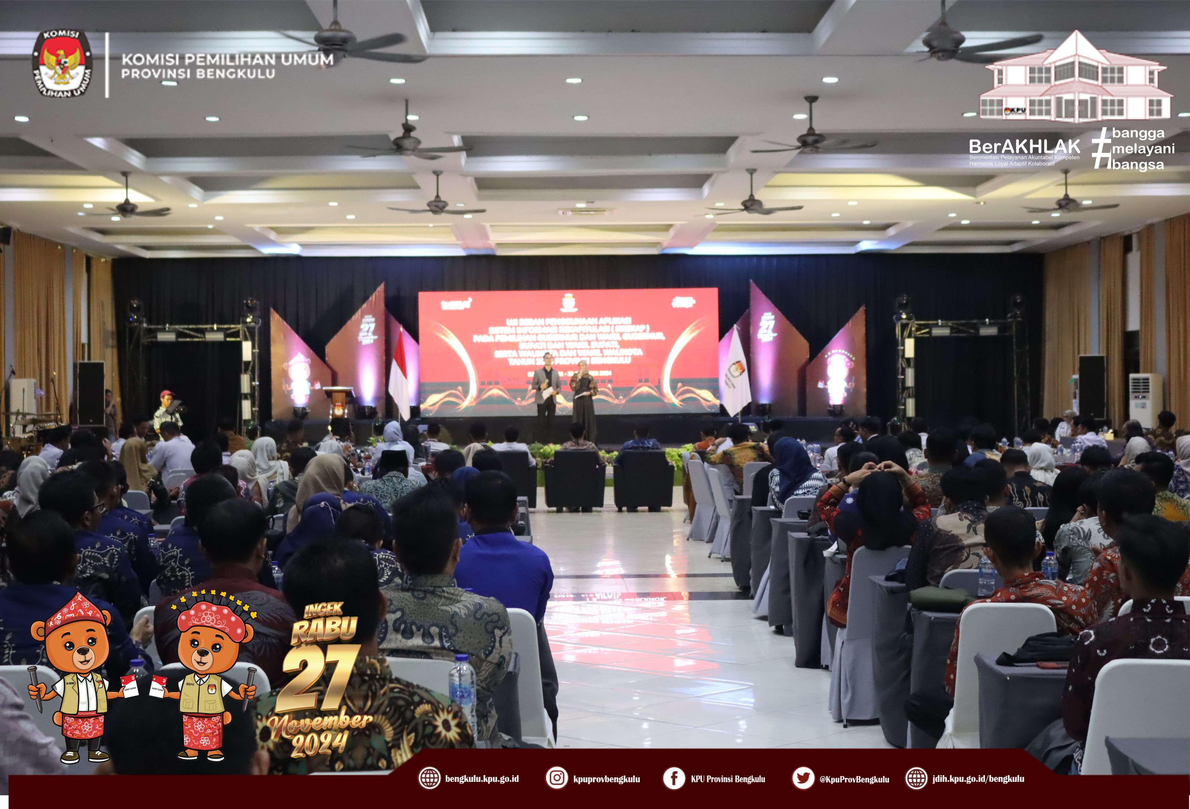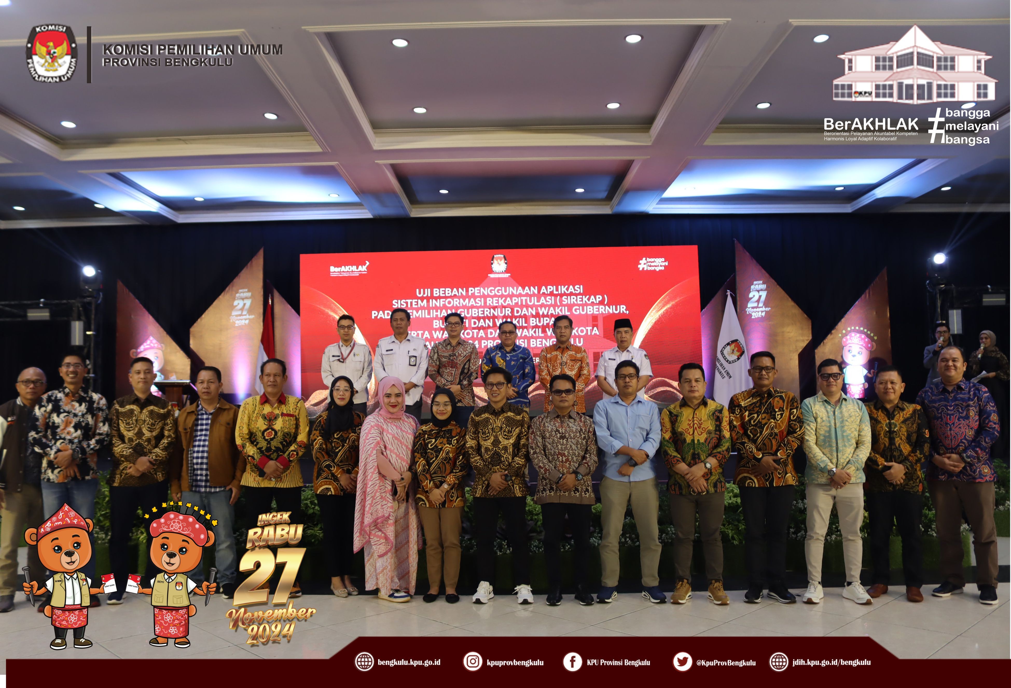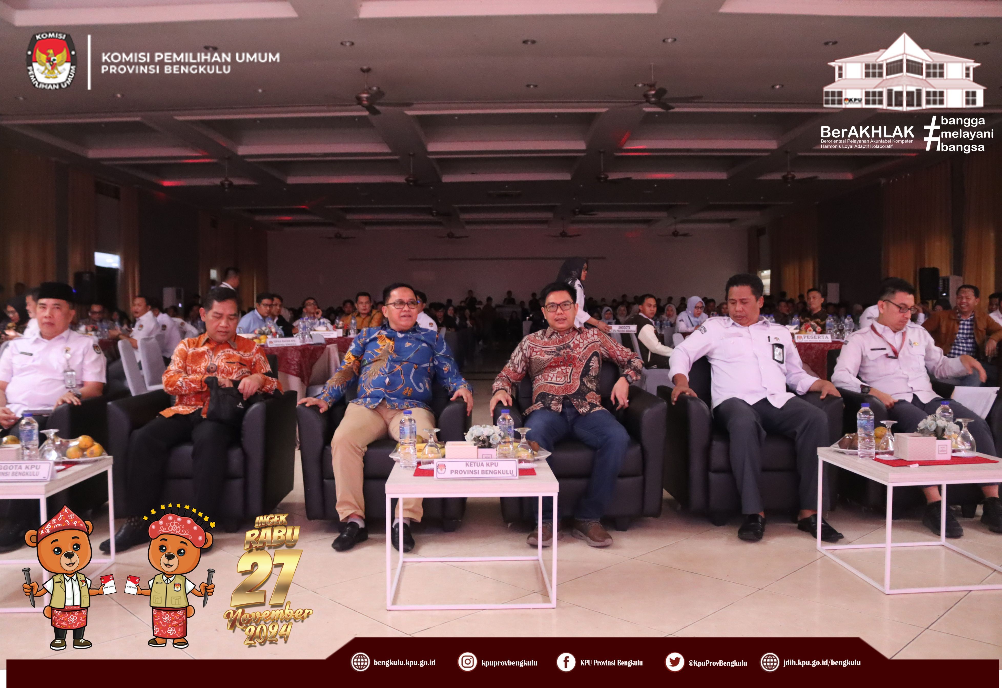 Bengkulu, bengkulu.kpu.go.id - Plh. Ketua KPU Provinsi Bengkulu Bapak Emex Verzoni, Anggota KPU Provinsi Bengkulu Bapak Alpin Samsen dan Bapak Dodi Hendra Supiarso, Plh Sekretaris KPU Provinsi Bengkulu Bapak Sudirman, Kabag TPHS Bapak Oktan Huzaeiry dan Plh. Kabag Perencanaan Data dan Informasi Bapak Hafiz Umar membuka kegiatan Uji Beban Penggunaan Aplikasi Sistem Informasi Rekapitulasi (Sirekap) Pemilihan Gubernur dan Wakil Gubernur, Bupati dan Wakil Bupati serta Walikota dan Wakil Walikota Tahun 2024 Provinsi Bengkulu, Senin (21/10/2024) di Grage Hotel Bengkulu. Hadir Anggota KPU Divisi Perencanaan Data dan Informasi, Anggota KPU Divisi Teknis Penyelenggaraan, Kasubbag TPHM, Admin/Operator Sirekap, Anggota PPK Divisi Perencanaan Data dan Informasi, Anggota PPK Divisi Teknis Penyelenggaraan Kabupaten/Kota se-Provinsi Bengkulu. Dalam arahannya Bapak Emex menyampaikan bahwa kegiatan ini dalam rangka memastikan kesiapan dan pemahaman yang sama dalam uji beban aplikasi Sirekap bagi KPU bersama jajaran adhoc pada pemilihan serentak Tahun 2024 di Provinsi Bengkulu. Bapak Emex berharap SDM jajaran adhoc mampu dan siap mengoperasikan aplikasi Sirekap secara baik dan Provinsi Bengkulu menjadi yang tercepat dan terbaik dalam penggunaan aplikasi sirekap secara nasional pada Rabu 27 November 2024 mendatang.
