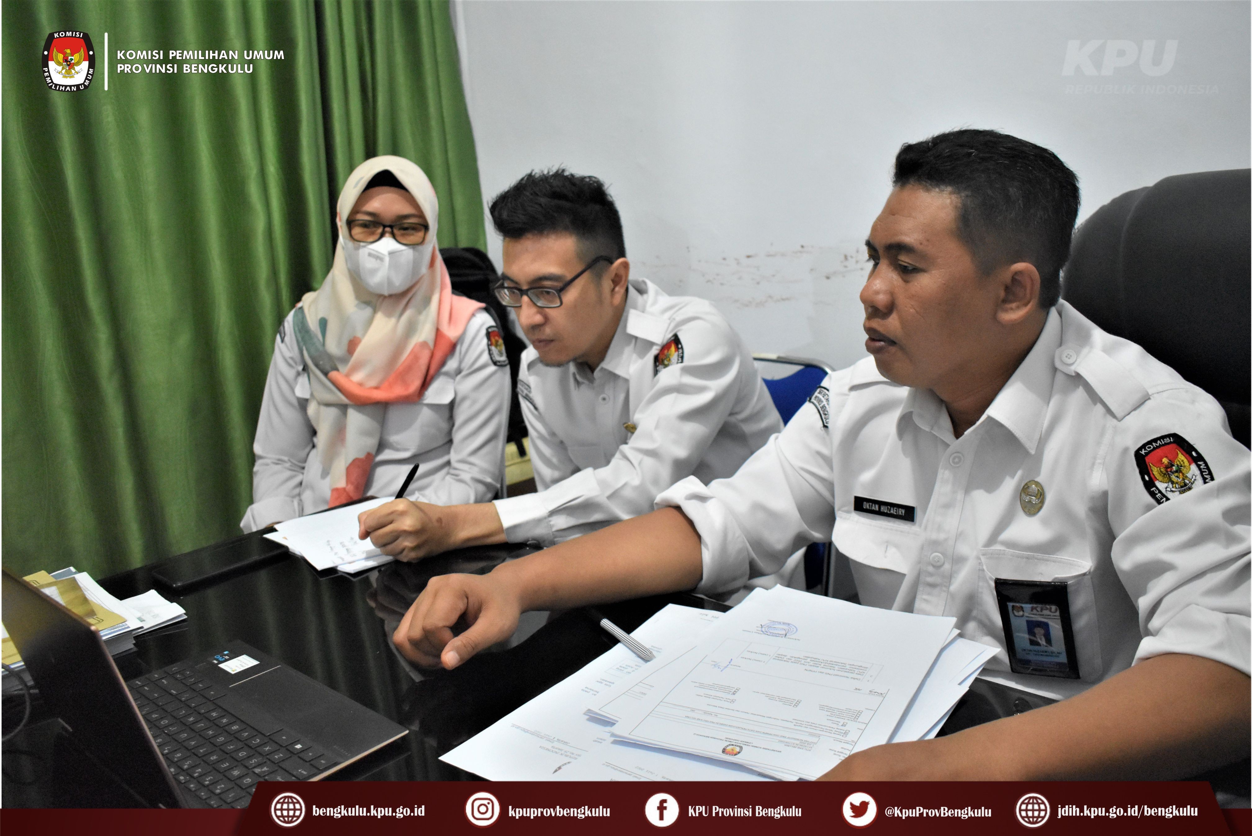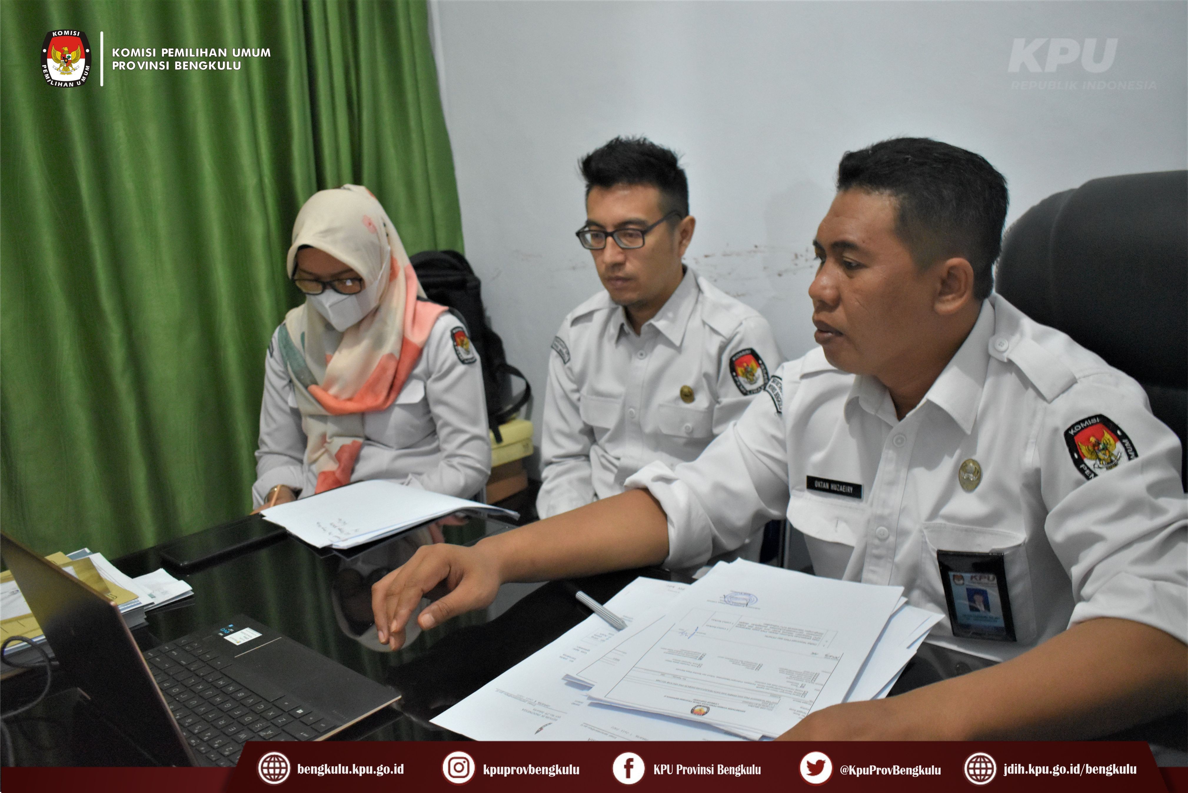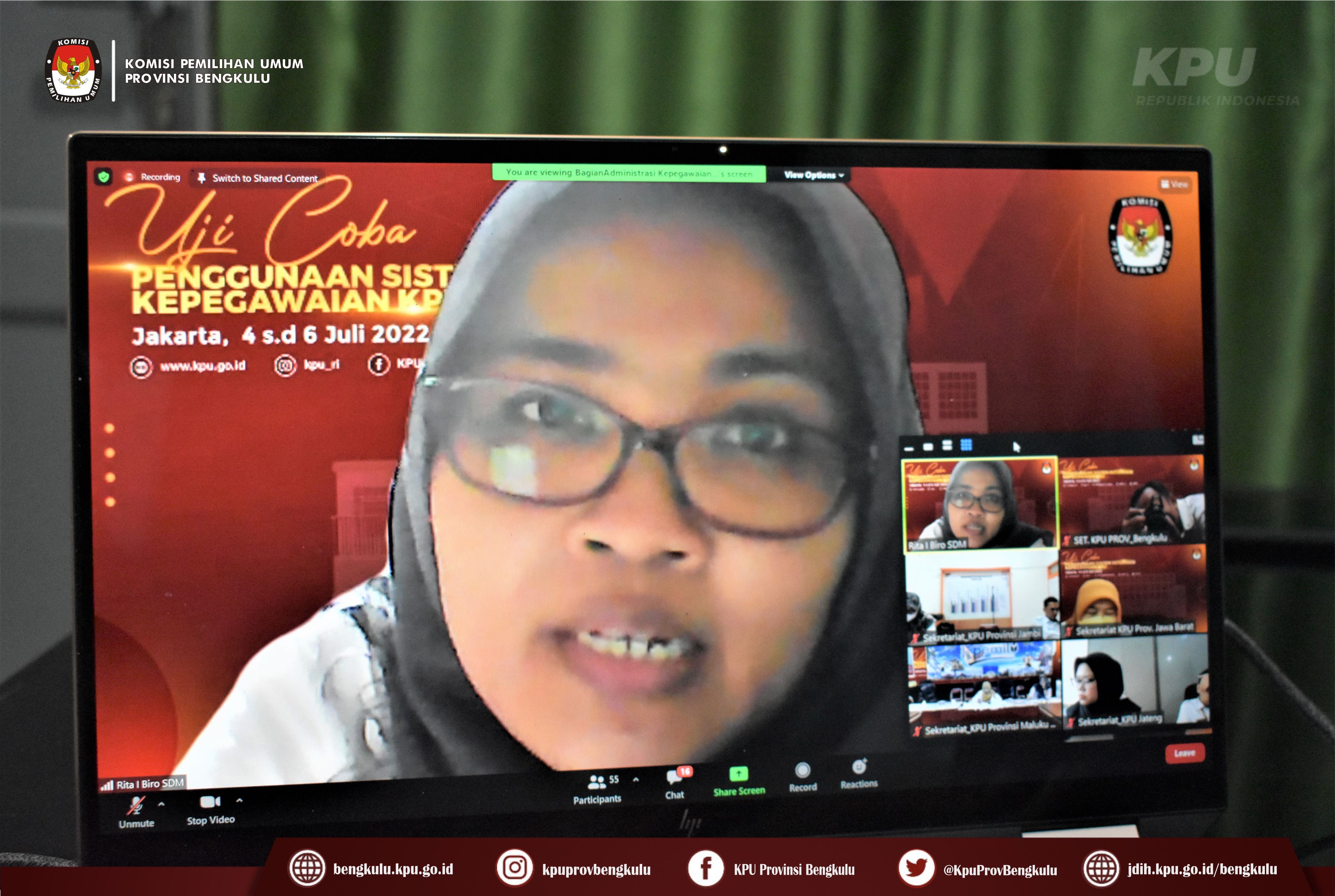 Bengkulu-bengkulu.kpu.go.id, Sekretariat KPU Provinsi Bengkulu yang diwakili Kabag Teknis Penyelenggaraan Pemilu Partisipasi Hubungan Masyarakat, Hukum dan SDM Oktan Huzaeiry, Kasubbag Hukum dan SDM Hafiz Umar dan Staf mengikuti Uji Coba Penggunaan Aplikasi Sistem Informasi Kepegawaian (SIMPEG) yang dilaksanakan Setjen KPU RI secara daring (zoom meeting), Senin (4/7). Dasar pelaksanaan kegiatan tersebut adalah Surat Sekretaris Jenderal KPU RI Nomor 781/SDM.06-Und/04/2022. Kegiatan ini dilaksanakan selama 3 (tiga) hari, yaitu 4-6 Juli 2022 dengan menghadirkan narasumber dari Setjen KPU RI Biro SDM.