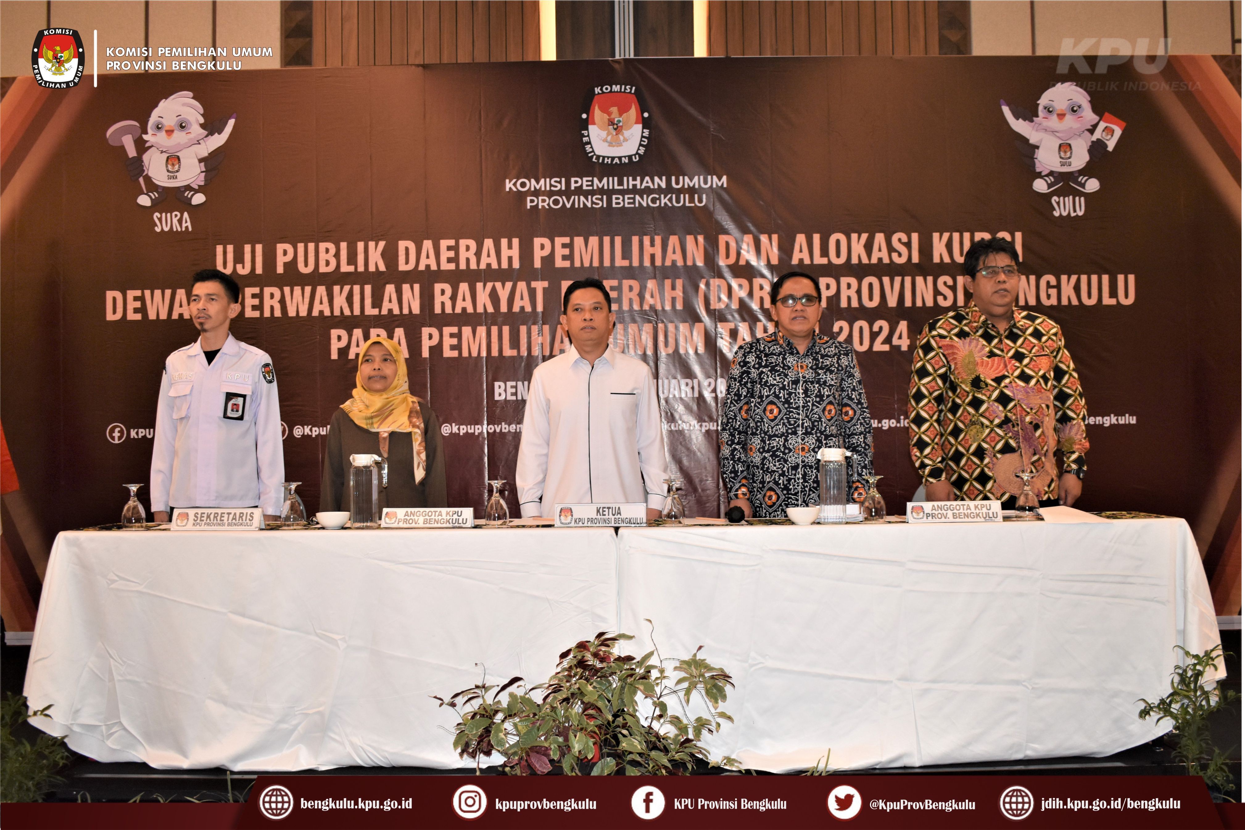 Bengkulu-bengkulu.kpu.go.id, Ketua KPU Provinsi Bengkulu Irwan Saputra bersama Anggota KPU Provinsi Bengkulu Siti Baroroh, Darlinsyah, Emex Verzoni, dan Sekretaris Kemas Mohammad Ajir membuka acara Uji Publik Daerah Pemilihan dan Alokasi Kursi Anggota Dewan Perwakilan Rakyat Daerah (DPRD) Provinsi Bengkulu pada Pemilihan Umum Tahun 2024, Kamis (19/1).
