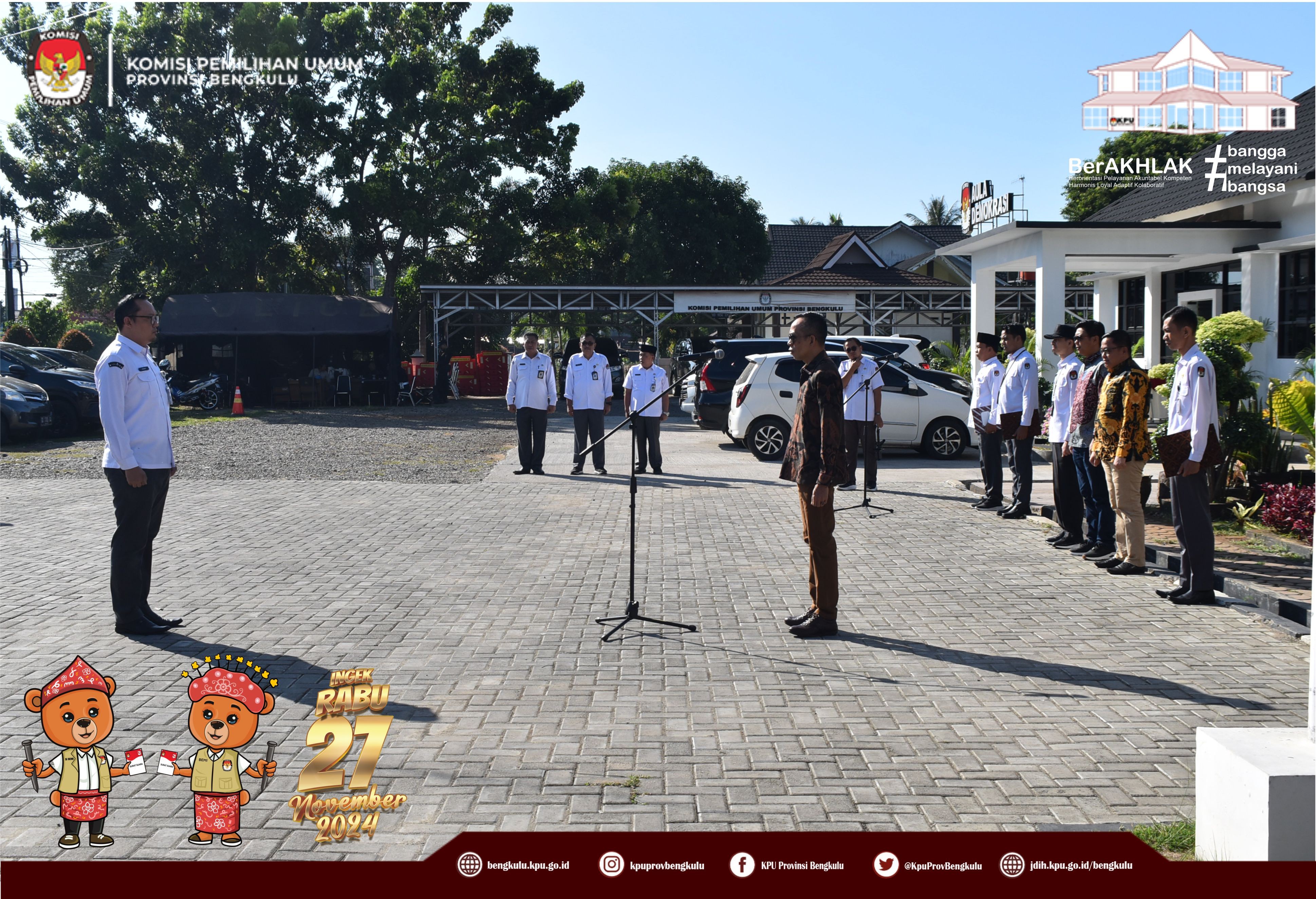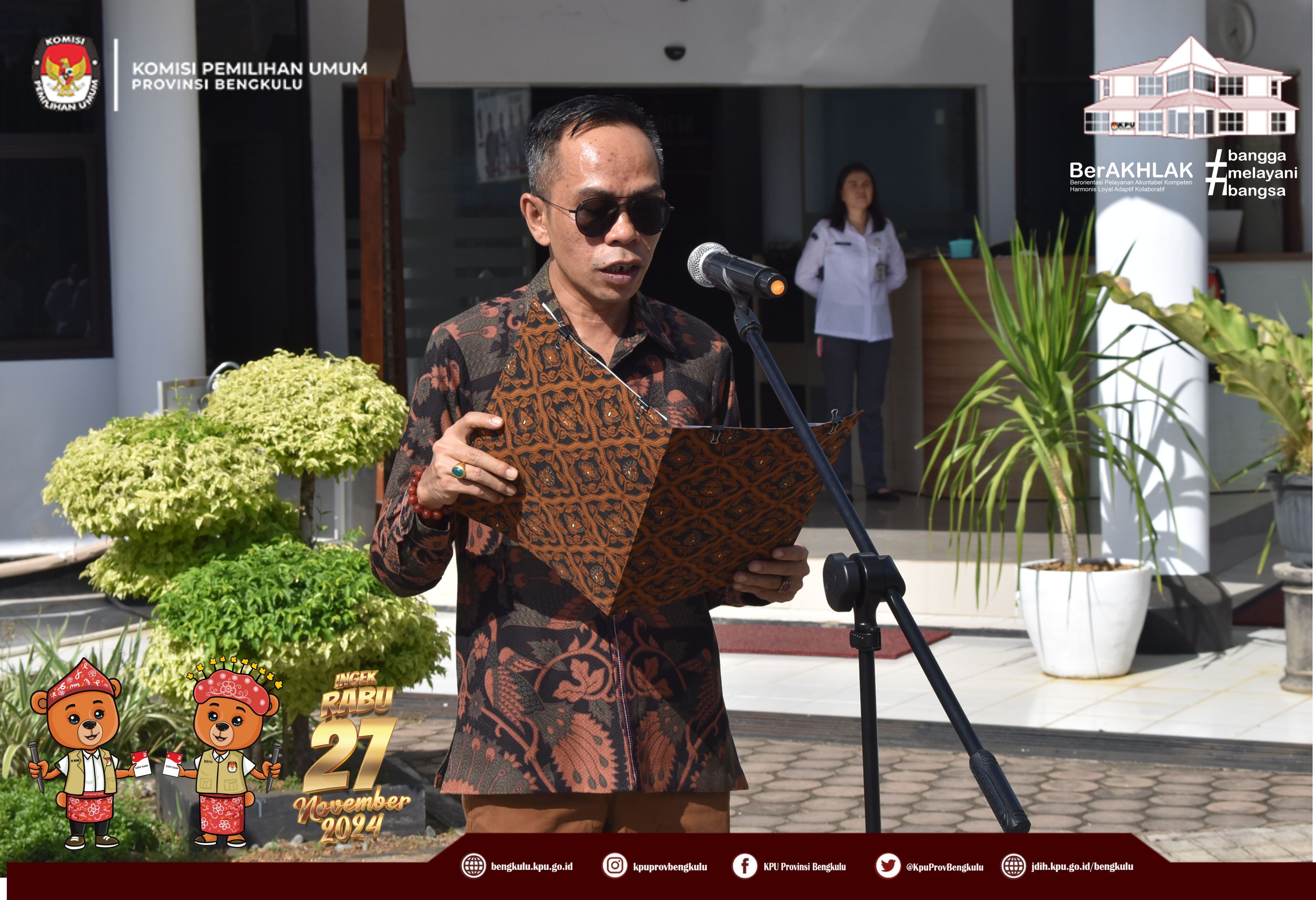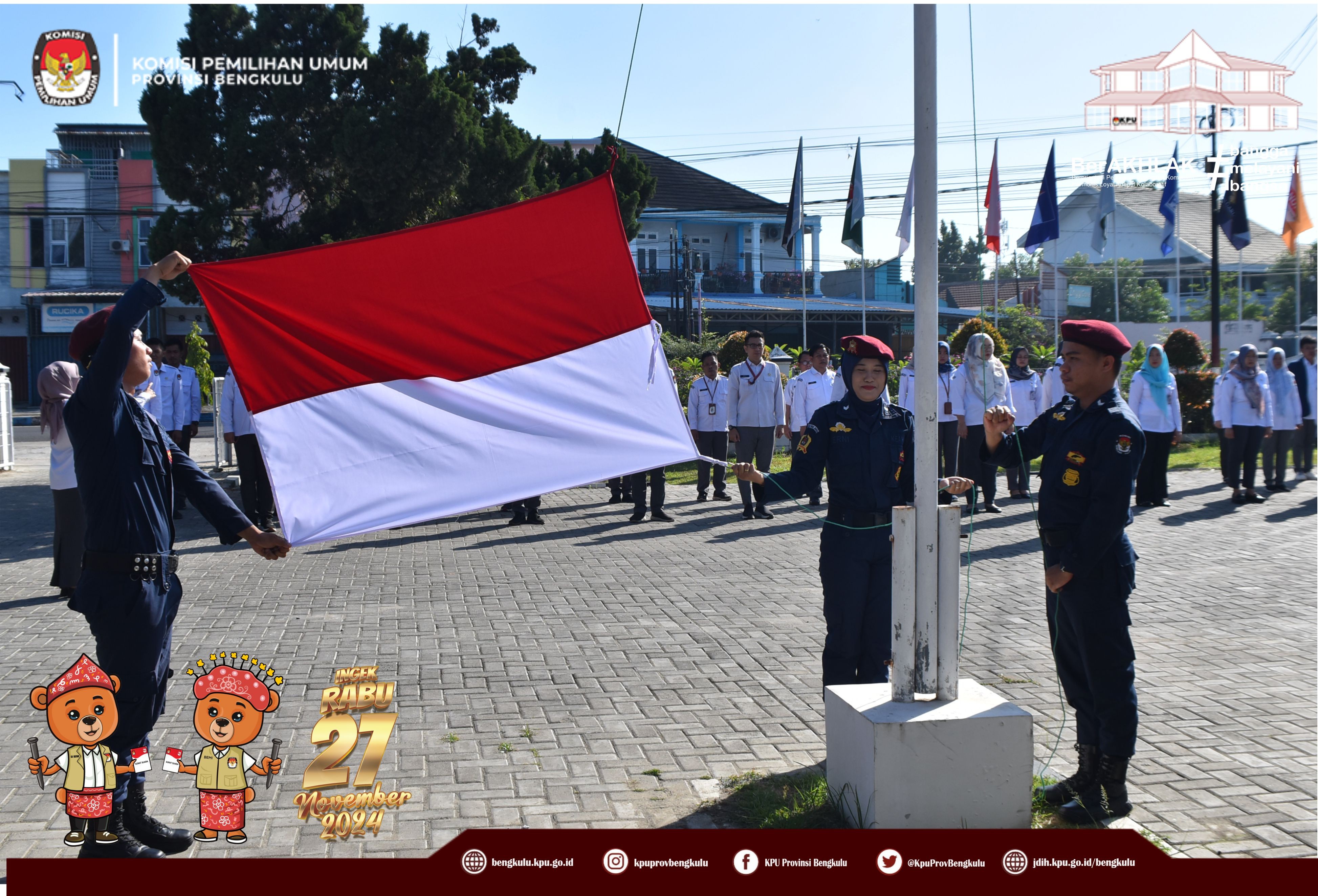 Bengkulu, bengkulu.kpu.go.id - KPU Provinsi Bengkulu melaksanakan Upacara Peringatan Hari Sumpah Pemuda ke-96 Tahun 2024, Senin (28/10/2024) di Halaman Kantor KPU Provinsi Bengkulu. Bertindak sebagai Pembina Upacara Katua KPU Provinsi Bengkulu Bapak Rusman Sudarsono. Upacara diiikuti Anggota KPU Provinsi Bengkulu Bapak Alpin Samsen dan Bapak Emex Verzoni serta Sekretaris KPU Provinsi Bengkulu Bapak Kemas Mohammad Ajir, Kabag, Pejabat Penata Kelola Pemilu Ahli Madya, Kasubbag dan Staf di Lingkungan Sekretariat KPU Provinsi Bengkulu. Upacara berjalan khidmat dan lancar.