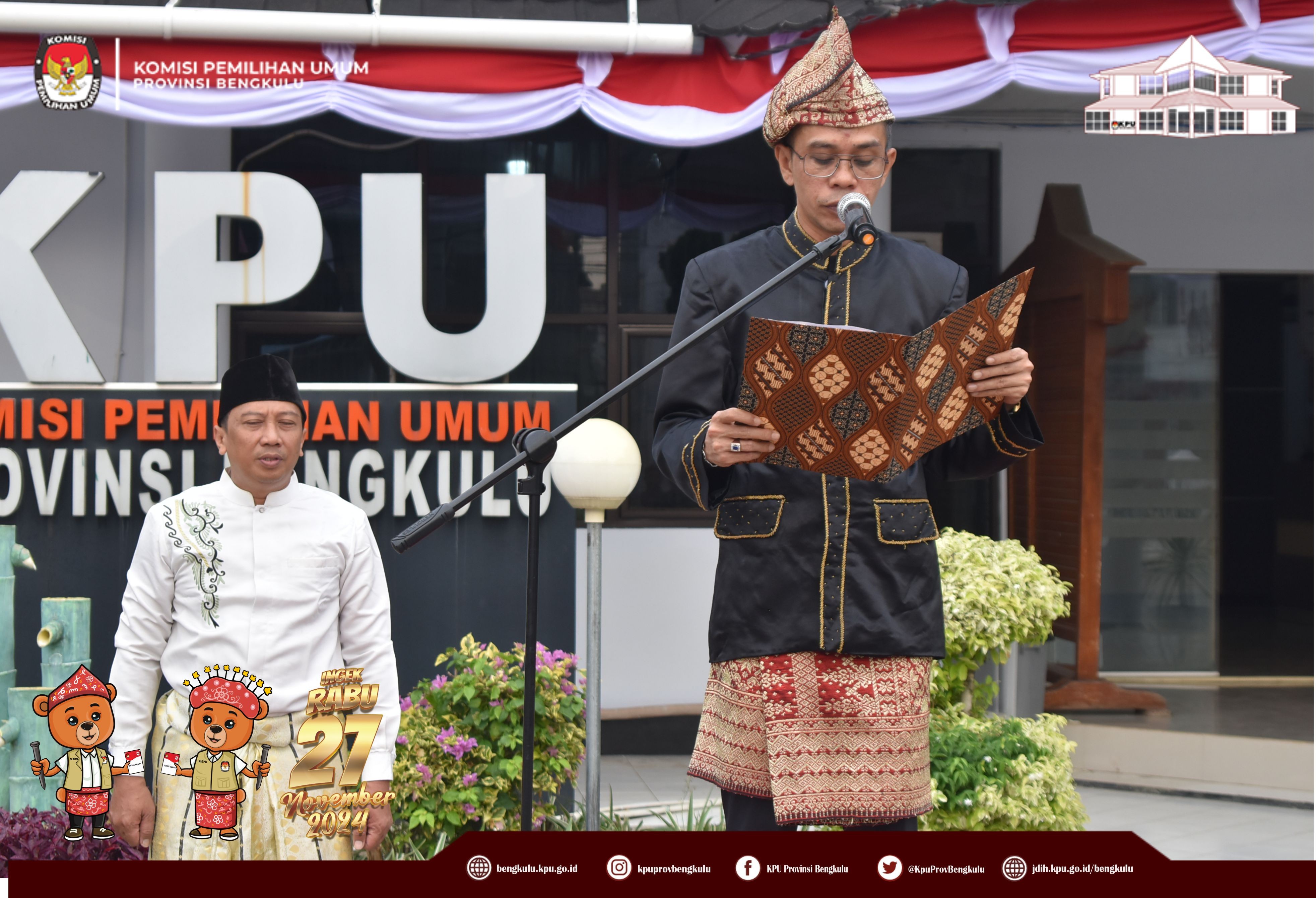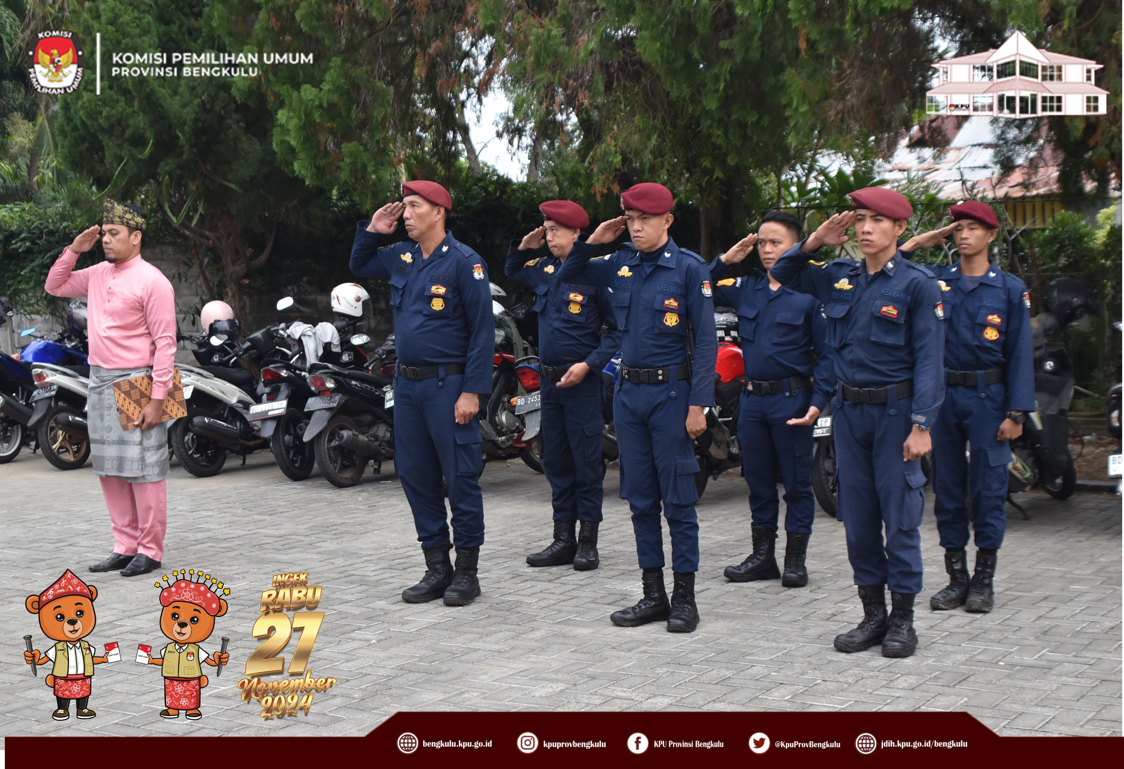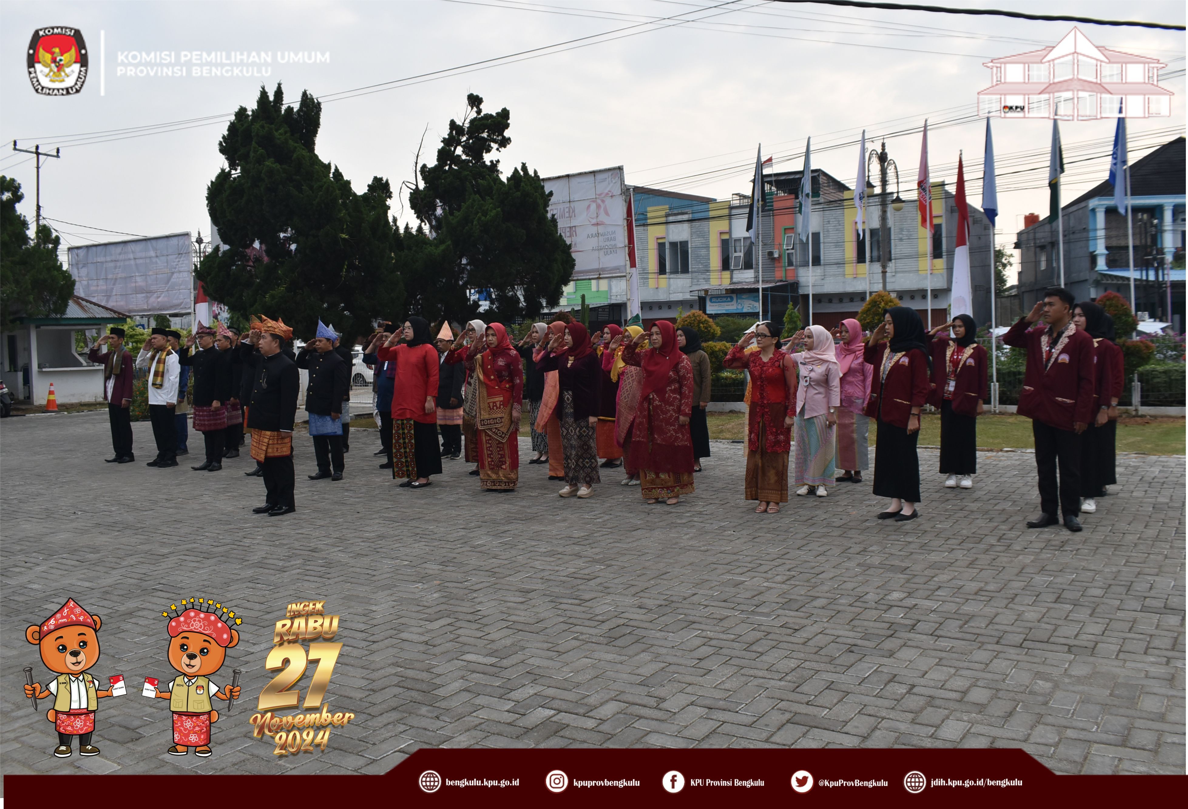 Bengkulu, bengkulu.kpu.go.id - KPU Provinsi Bengkulu melaksanakan Upacara Peringatan Hari Ulang Tahun ke - 79 Kemerdekaan Republik Indonesia, Sabtu (17/8/2024) di Halaman Kantor KPU Provinsi Bengkulu. Ketua KPU Provinsi Bengkulu Rusman Sudarsono bertindak sebagai Inspektur Upacara, kemudian diikuti Anggota KPU Provinsi Bengkulu Alpin Samsen, Dodi Hendra Supiarso, Emex Verzoni dan Sarjan Efendi, Ketua dan Sekretaris KPU Kabupaten, Kabag, Pejabat Penata Kelola Pemilu Ahli Madya, Kasubbag dan Staf di lingkungan Sekretariat KPU Provinsi Bengkulu. Upacara berjalan khidmat dan lancar.