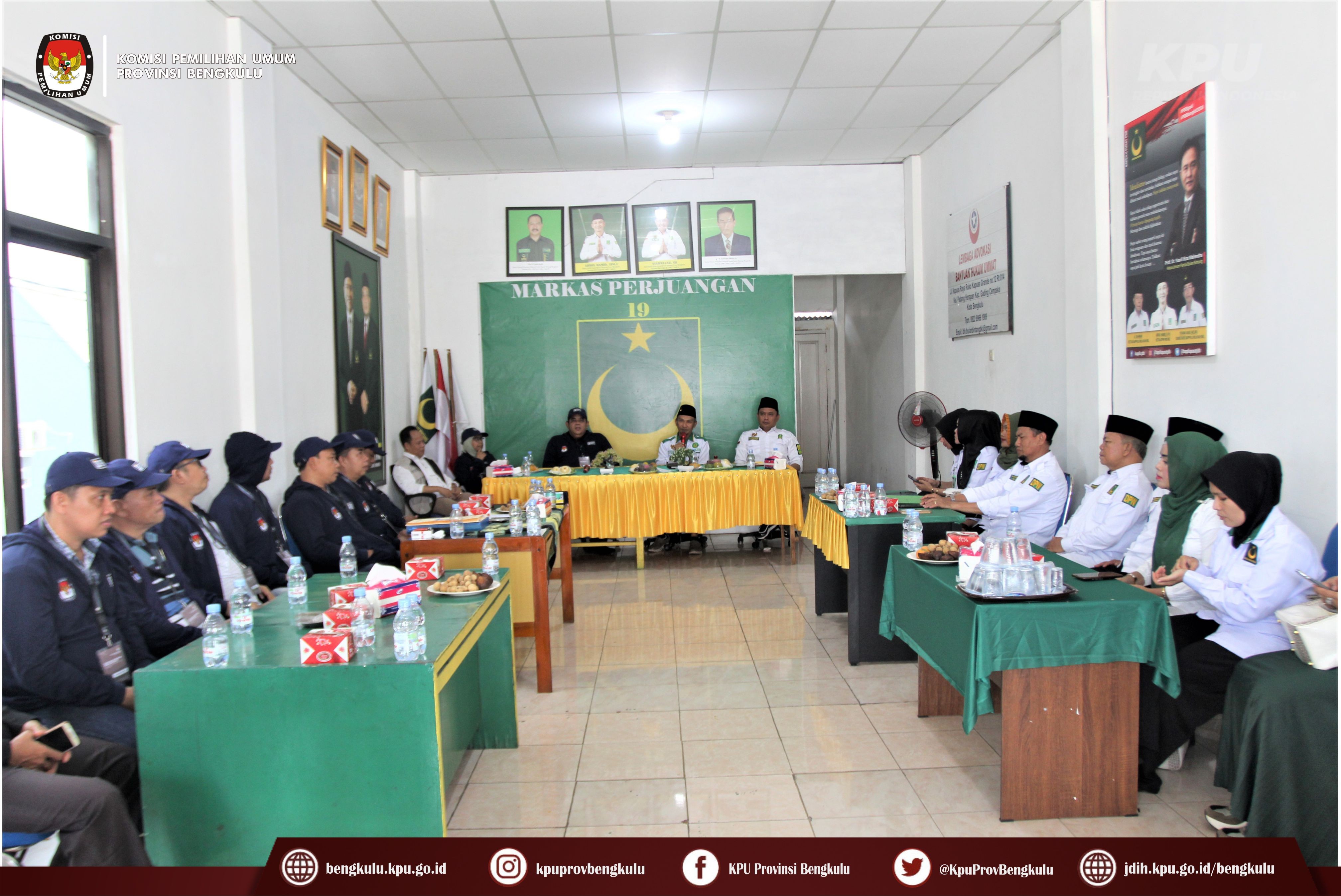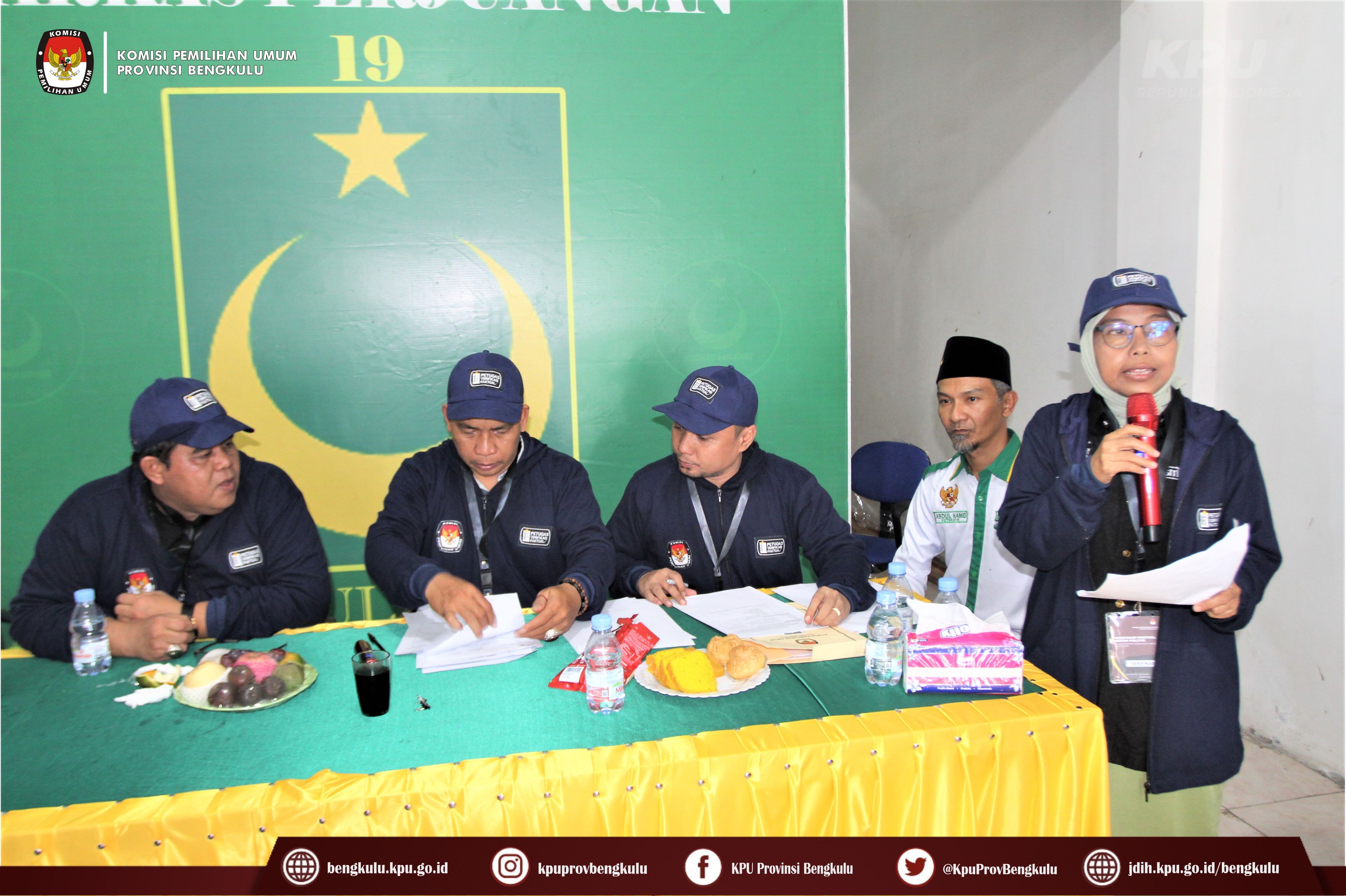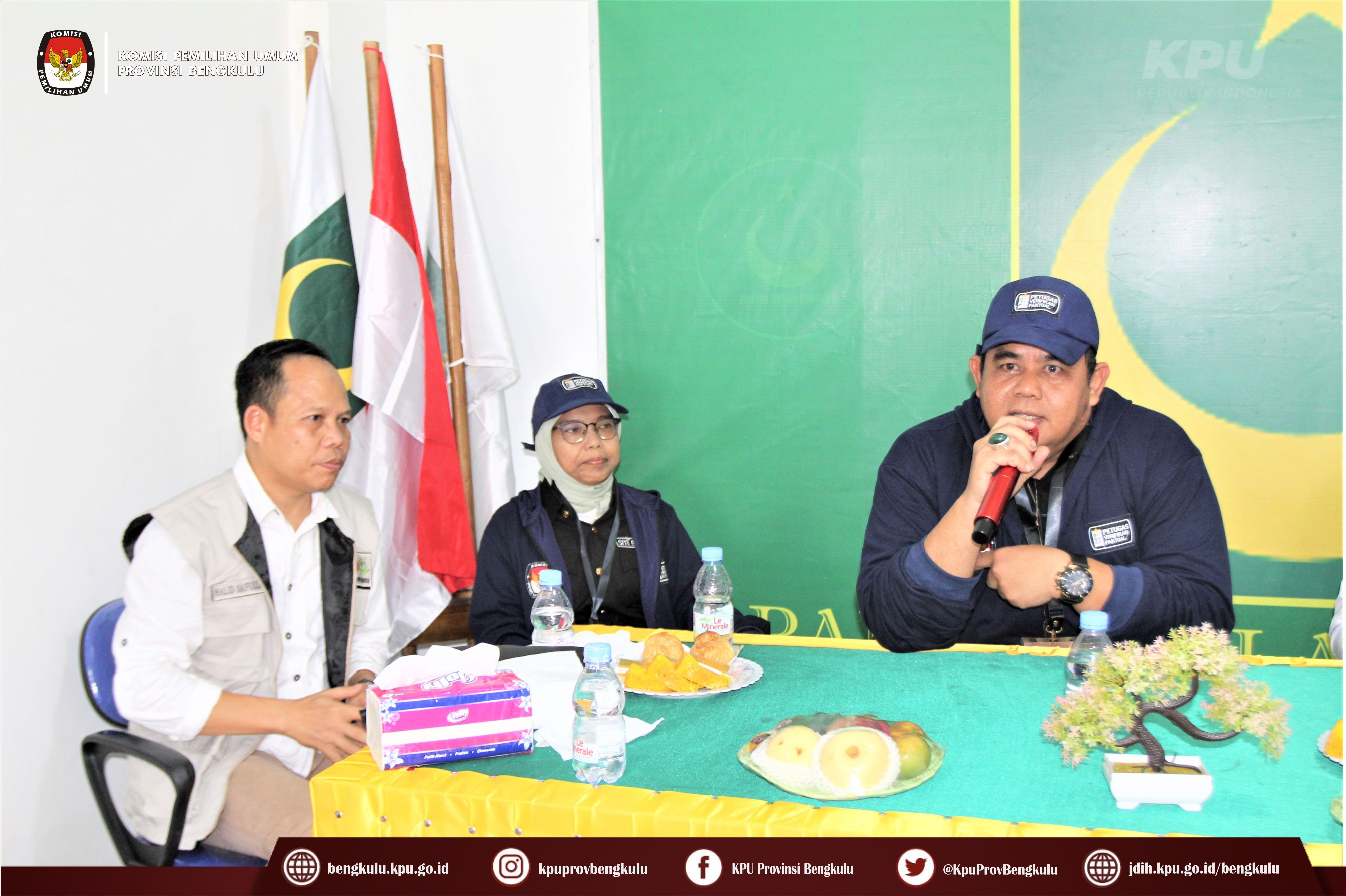 Bengkulu-bengkulu.kpu.go.id, Anggota KPU Provinsi Bengkulu Darlinsyah bersama Anggota KPU Provinsi Bengkulu Siti Baroroh serta jajaran Sekretariat KPU Provinsi Bengkulu dan Tim Pelaksana Kegiatan Verifikasi Partai Politik Peserta Pemilu 2024, yaitu Polda, Kesbangpol, Kejaksaan Tinggi dan Kanwil Kemenkumham Bengkulu mendatangi Sekretariat Partai Bulan Bintang (PBB) Tingkat Provinsi Bengkulu dalam rangka melaksanakan Verifikasi Faktual Kepengurusan Partai Politik, Minggu (16/10).