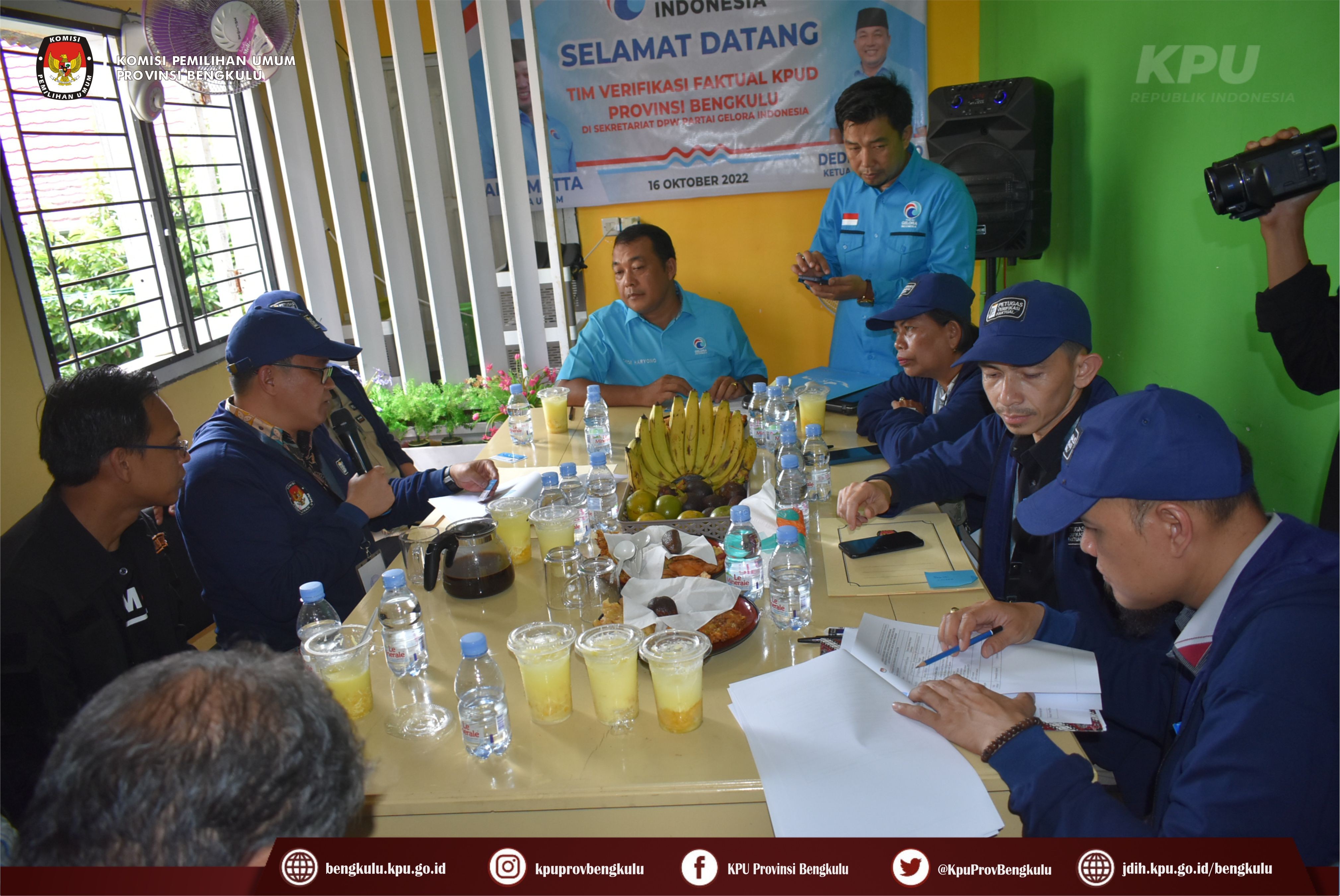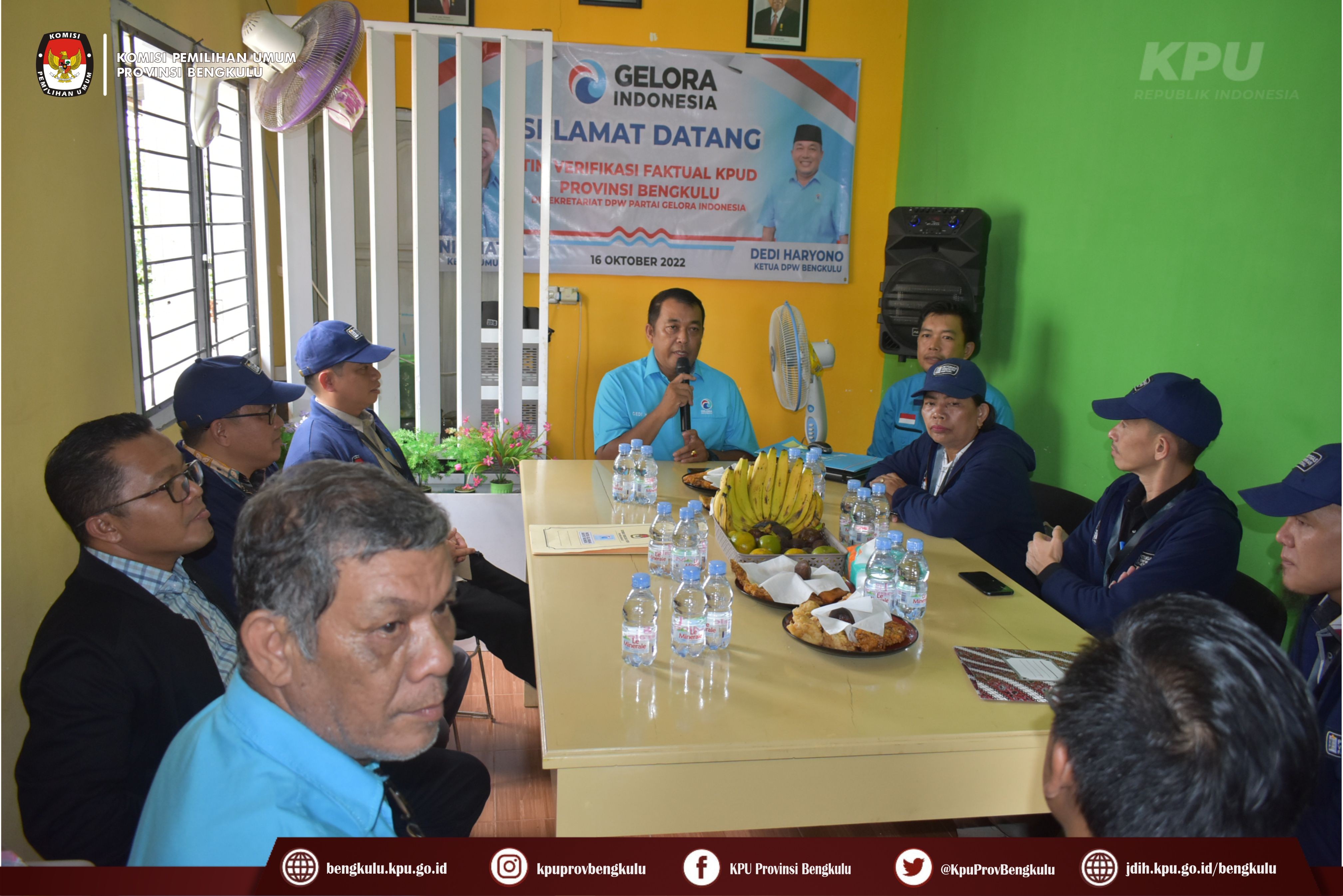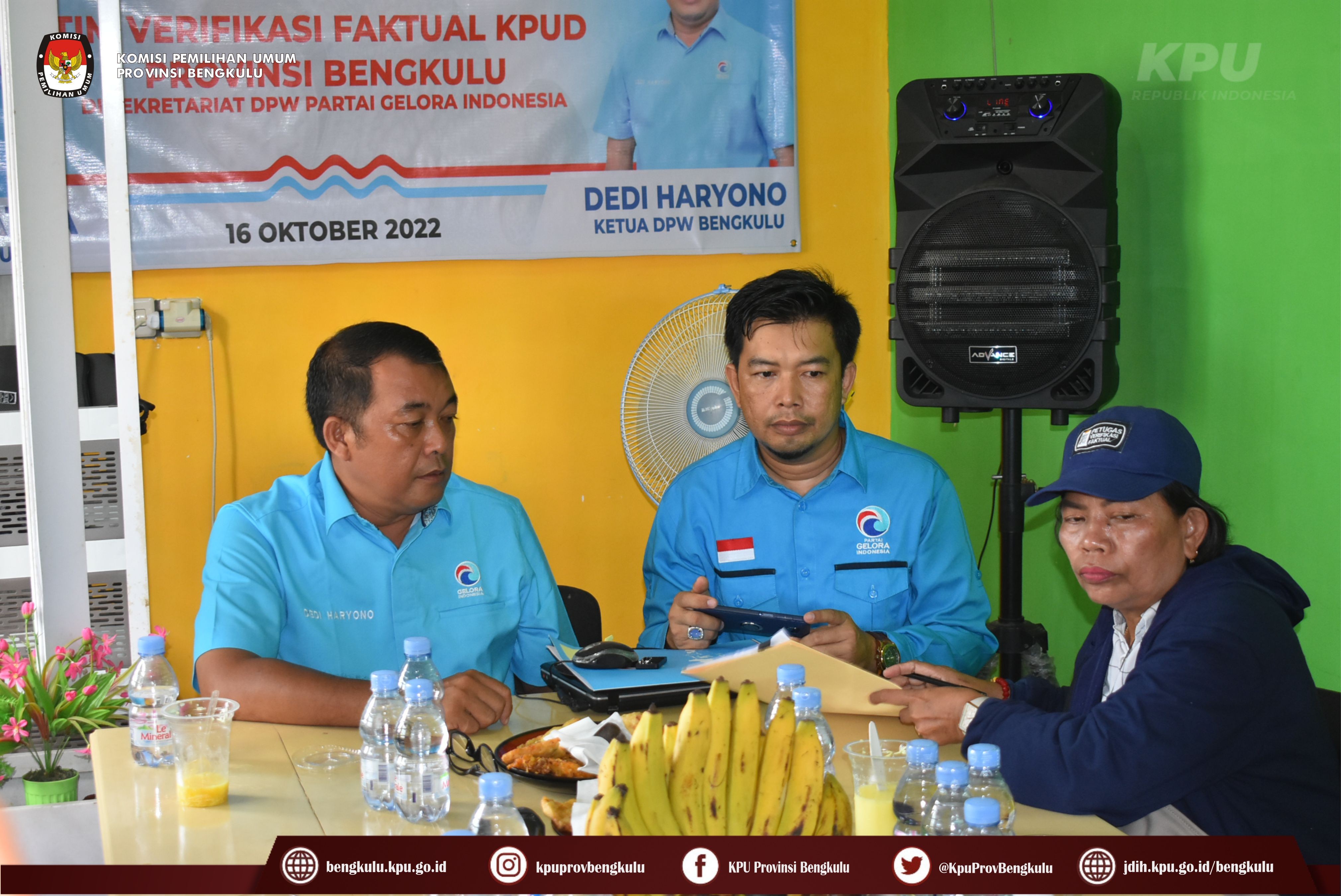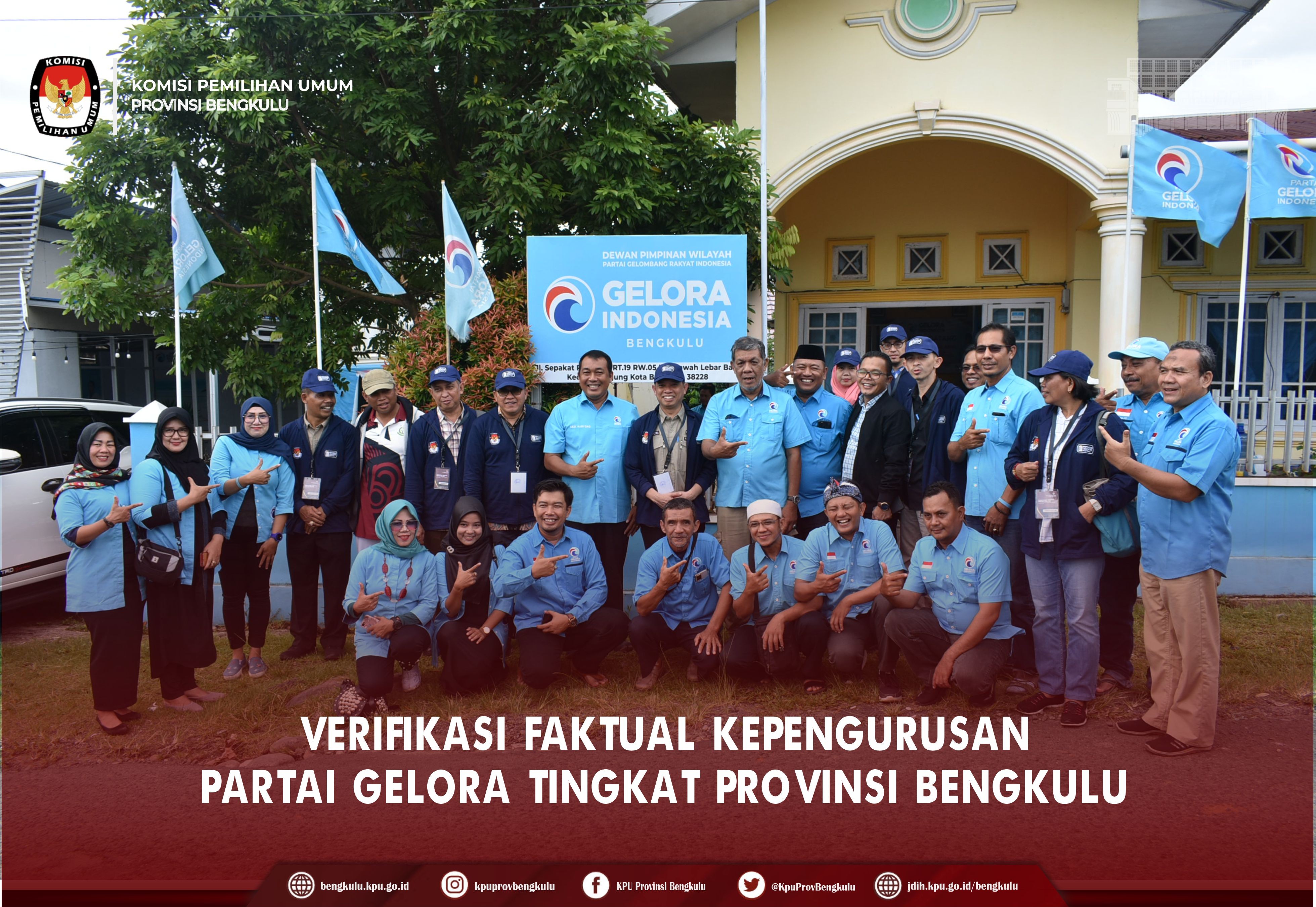 Bengkulu-bengkulu.kpu.go.id, Ketua KPU Provinsi Bengkulu Irwan Saputra bersama Anggota KPU Provinsi Bengkulu Emex Verzoni serta Sekretaris Kemas Mohammad Ajir dan Tim Pelaksana Kegiatan Verifikasi Partai Politik Peserta Pemilu 2024, yaitu Polda, Kesbangpol, Kejaksaan Tinggi dan Kanwil Kemenkumham Bengkulu mendatangi Sekretariat Partai Gelombang Rakyat Indonesia (GELORA) Tingkat Provinsi Bengkulu dalam rangka melaksanakan Verifikasi Faktual Kepengurusan Partai Politik, Minggu (16/10).