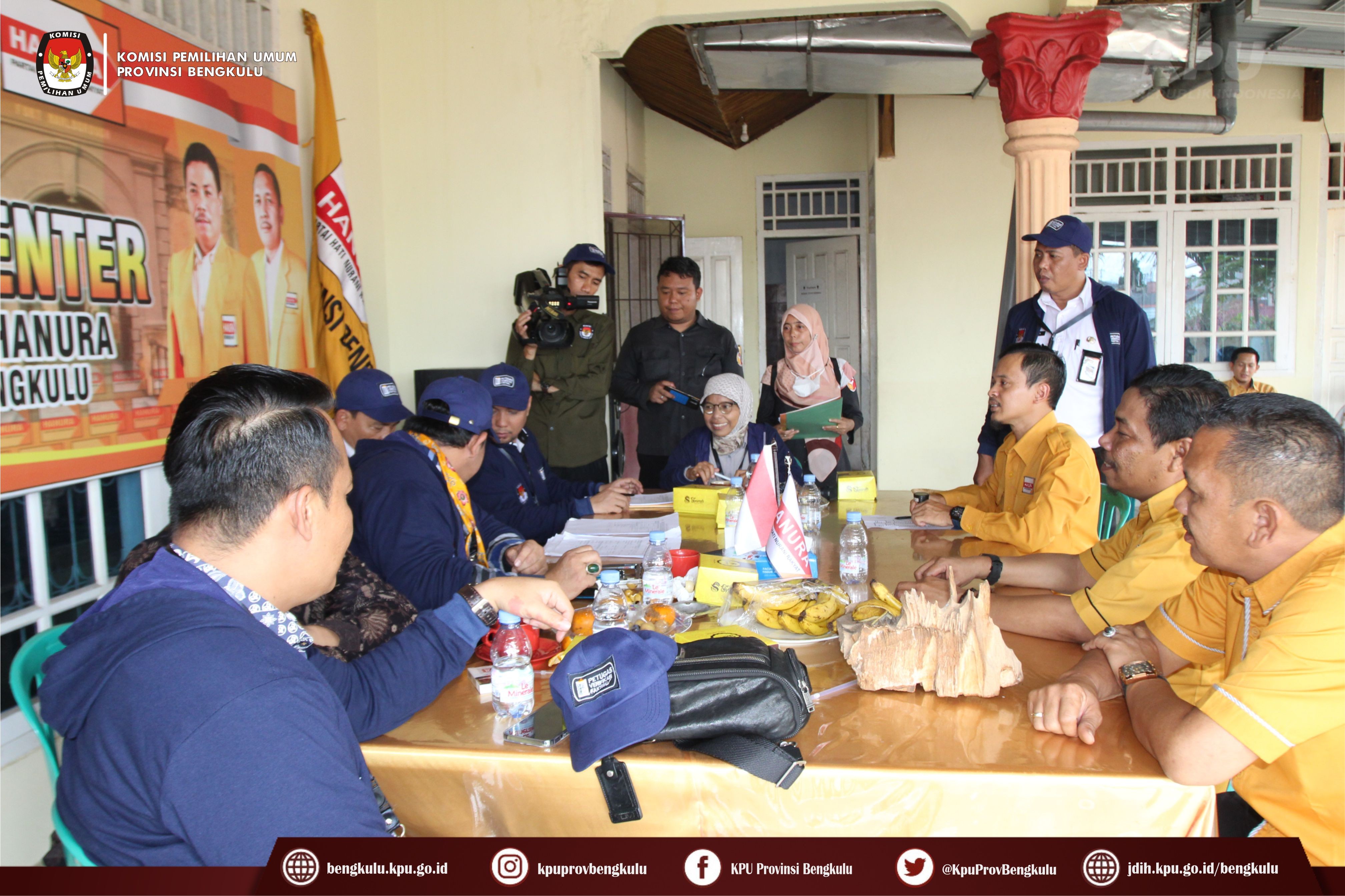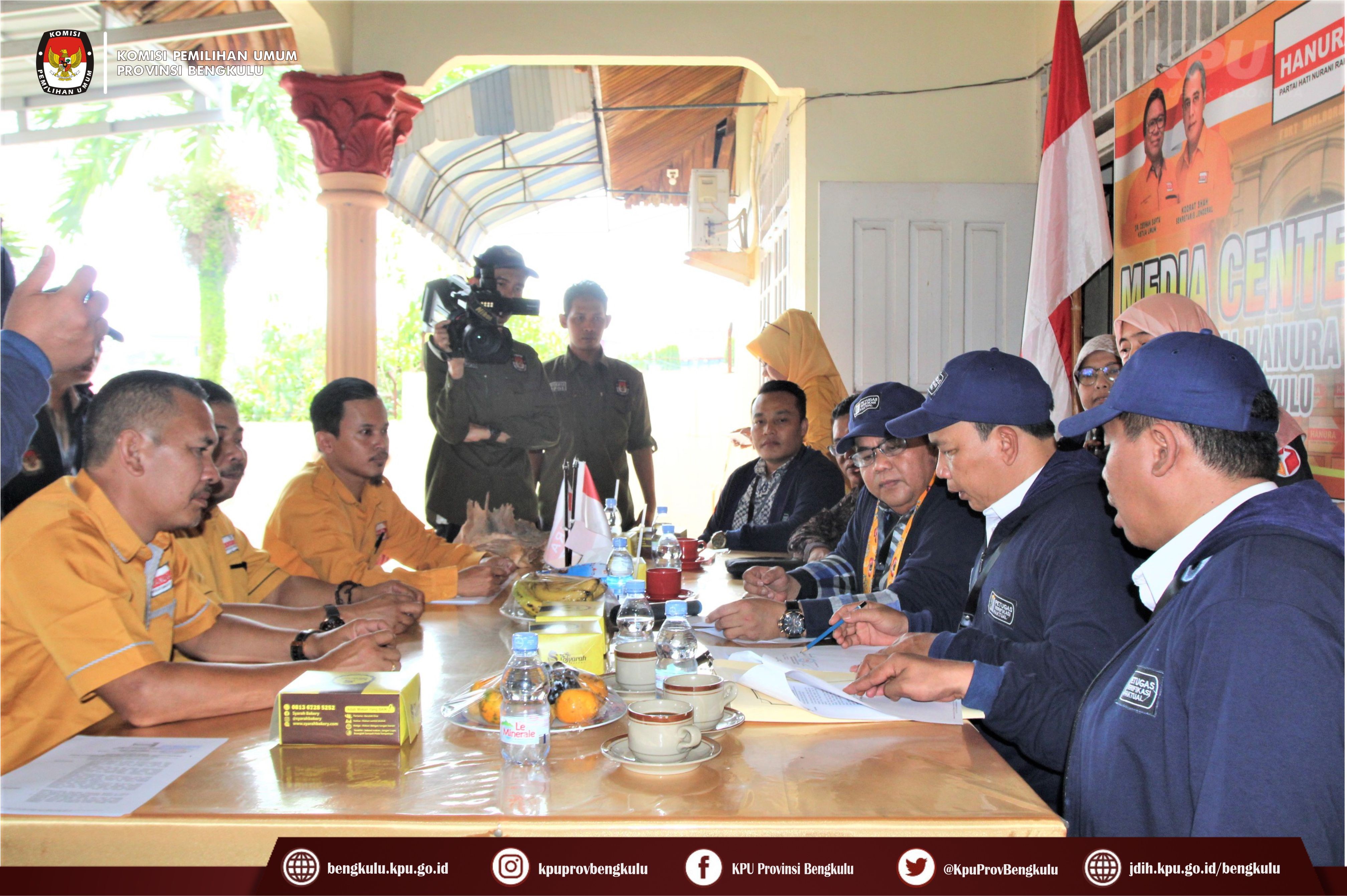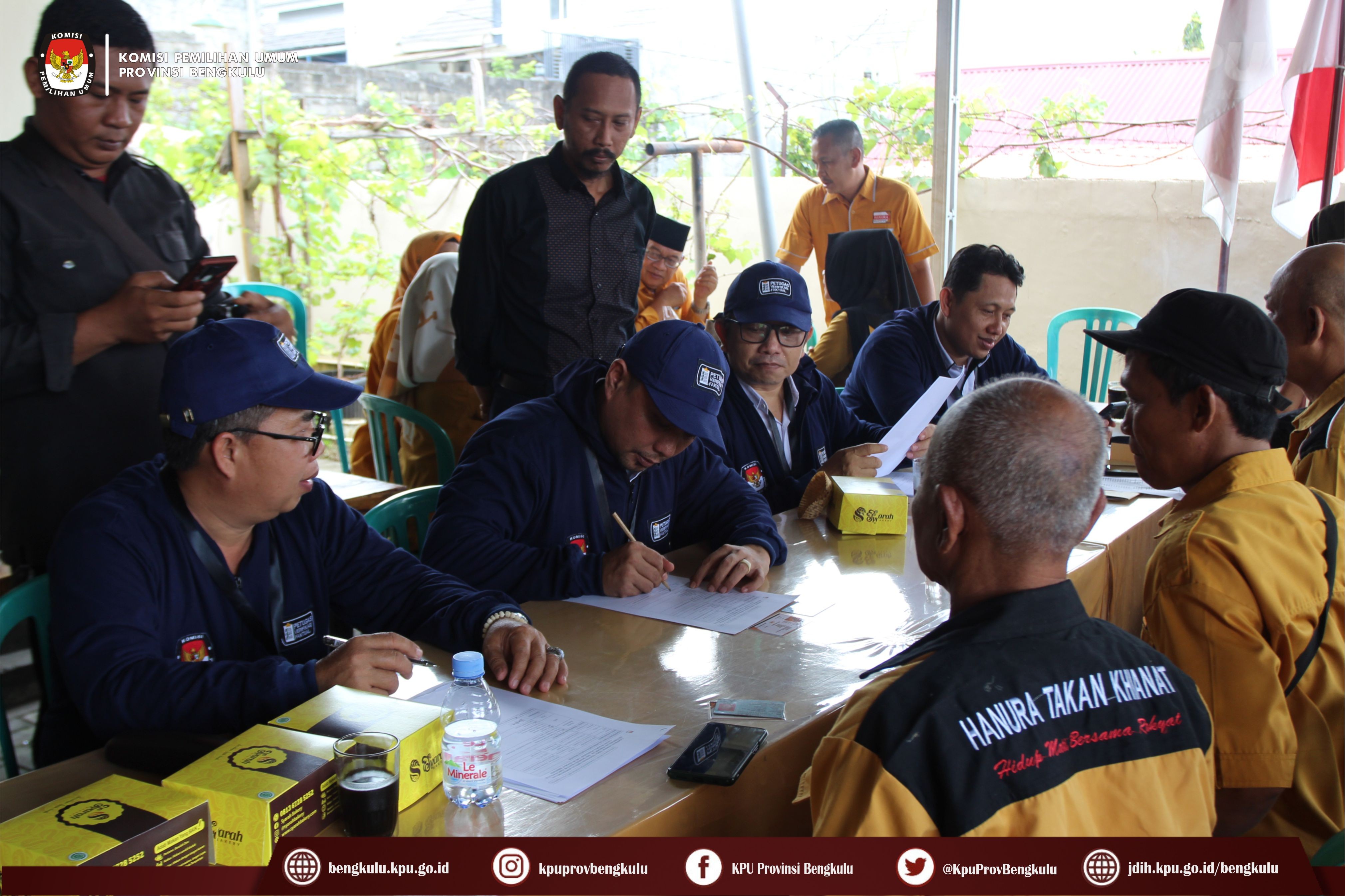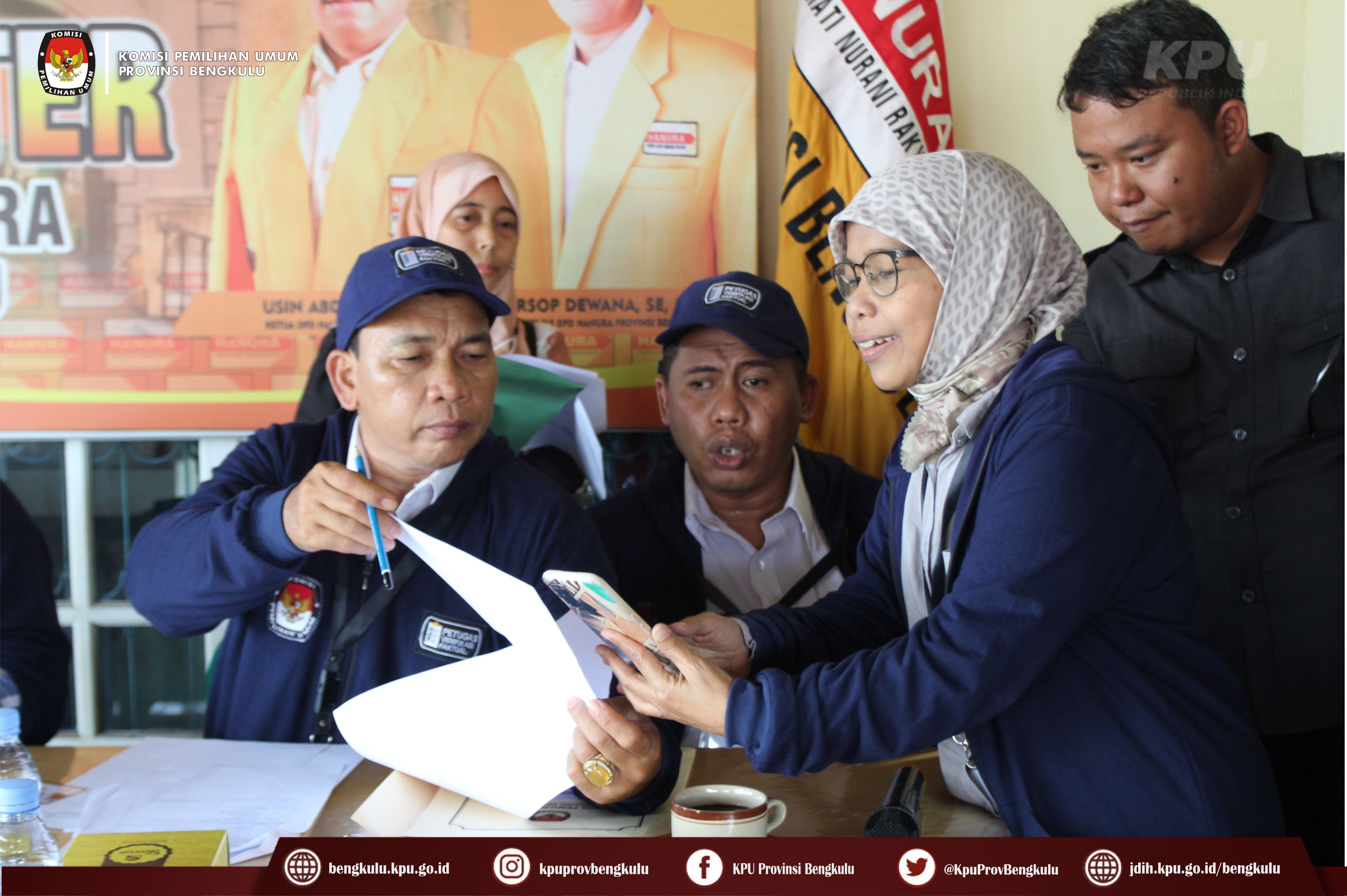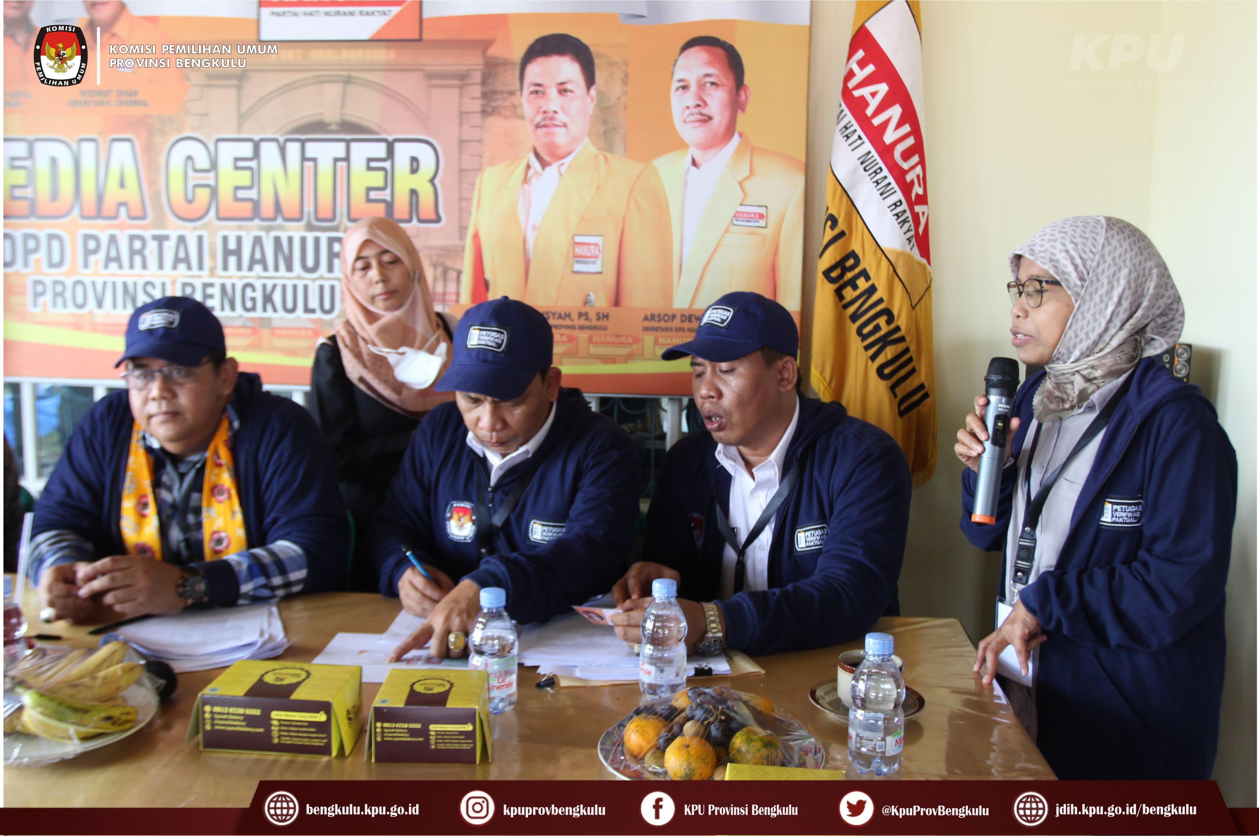 Bengkulu-bengkulu.kpu.go.id, Anggota KPU Provinsi Bengkulu Darlinsyah bersama Anggota KPU Provinsi Bengkulu Siti Baroroh serta jajaran Sekretariat KPU Provinsi Bengkulu dan Tim Pelaksana Kegiatan Verifikasi Partai Politik Peserta Pemilu 2024, yaitu Polda, Kesbangpol, Kejaksaan Tinggi dan Kanwil Kemenkumham Bengkulu mendatangi Sekretariat Dewan Pimpinan Daerah Partai Hati Nurani Rakyat (HANURA) Tingkat Provinsi Bengkulu dalam rangka melaksanakan Verifikasi Faktual Kepengurusan Partai Politik, Senin (17/10).