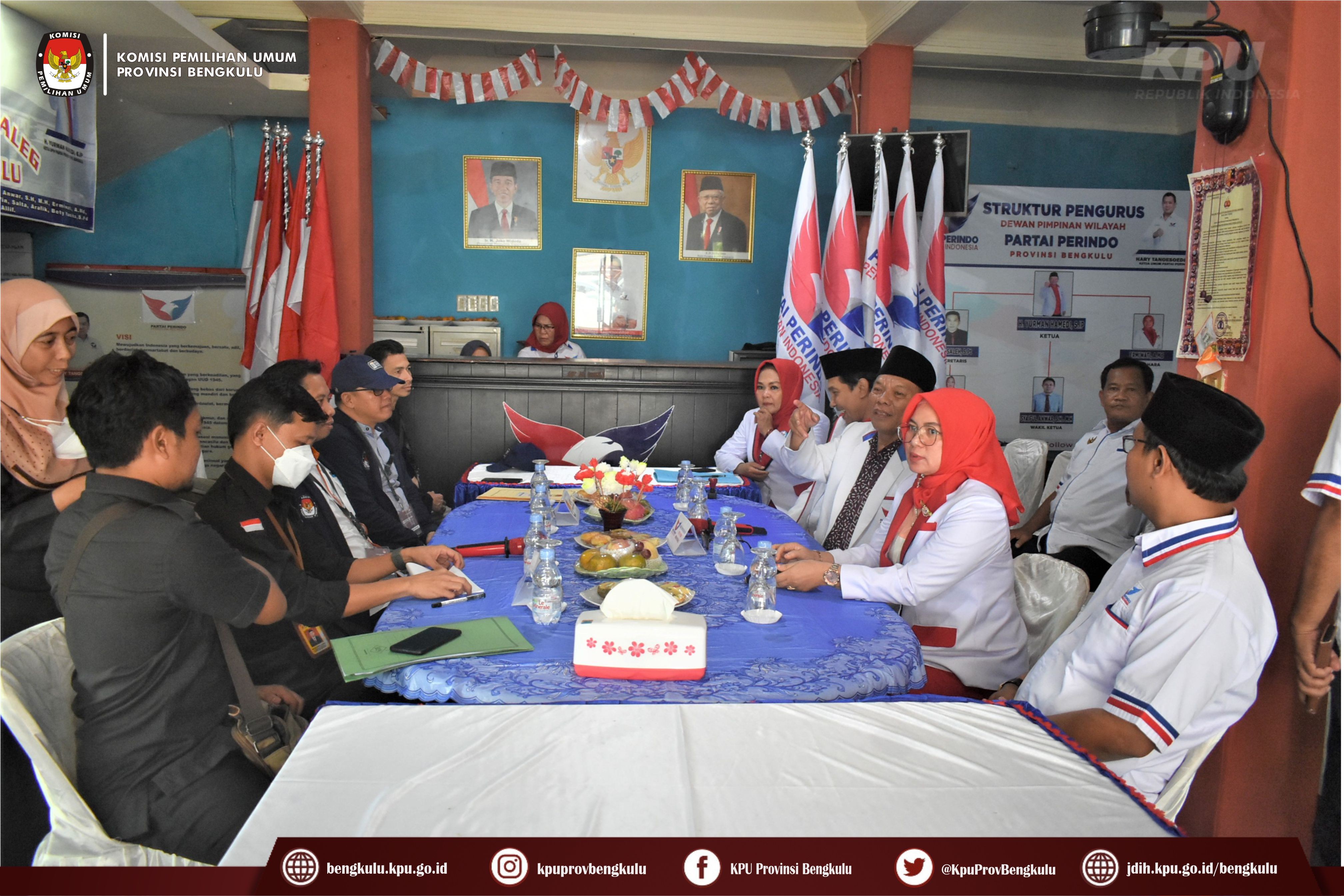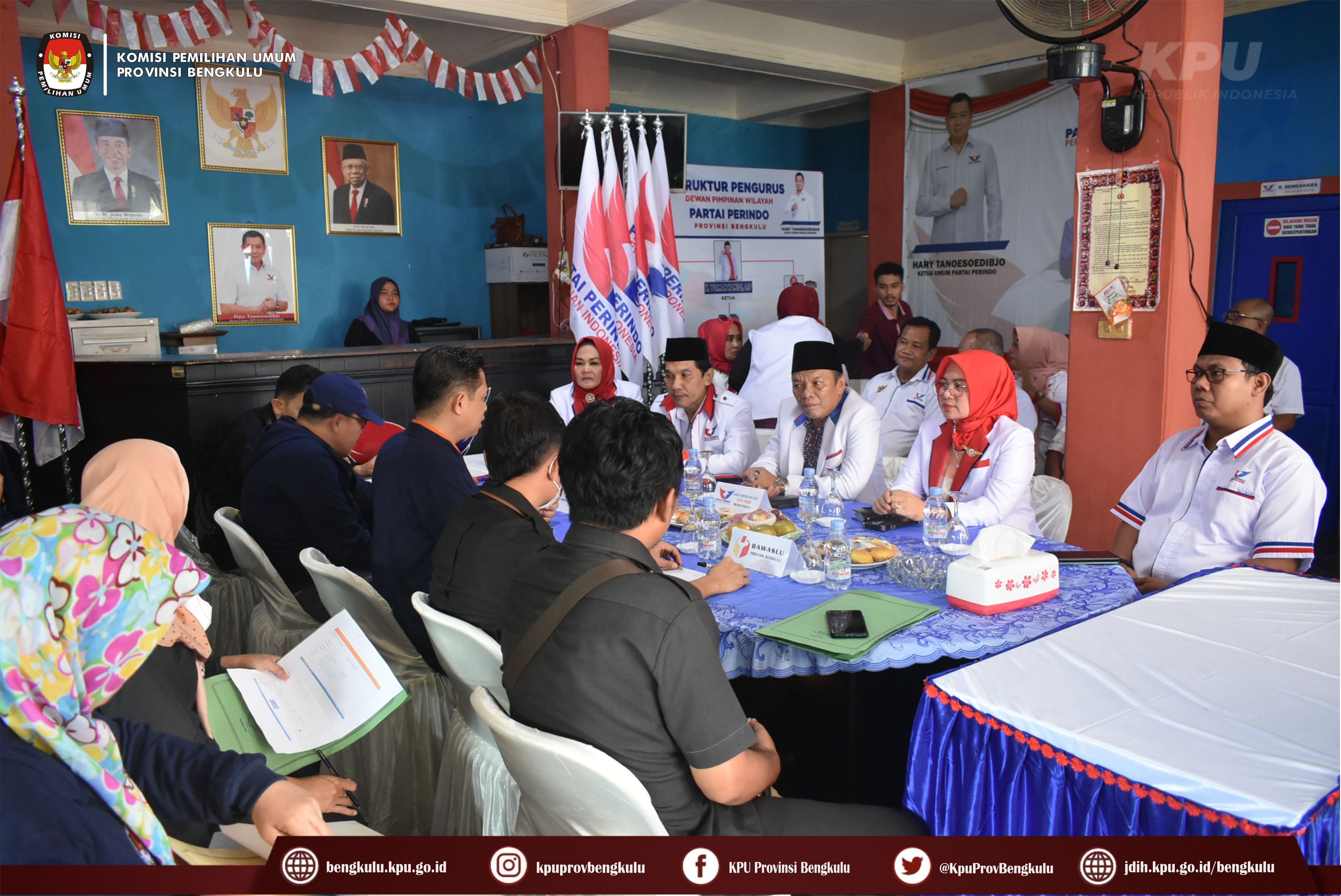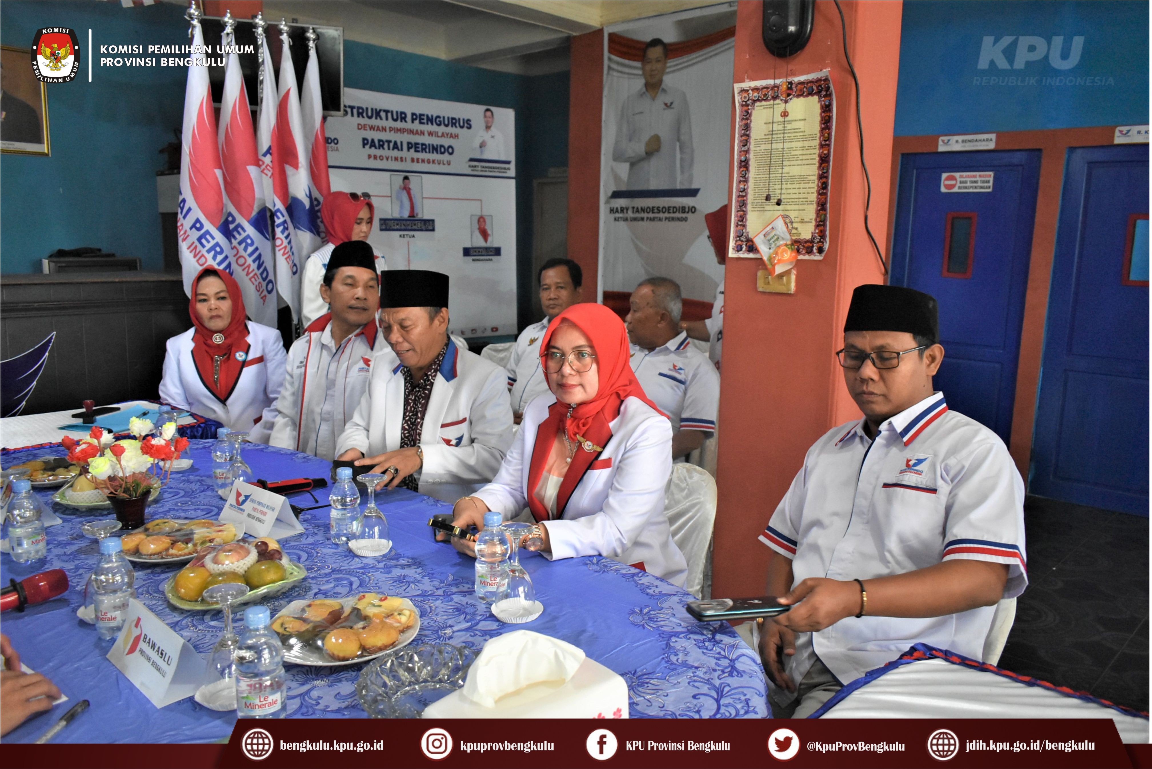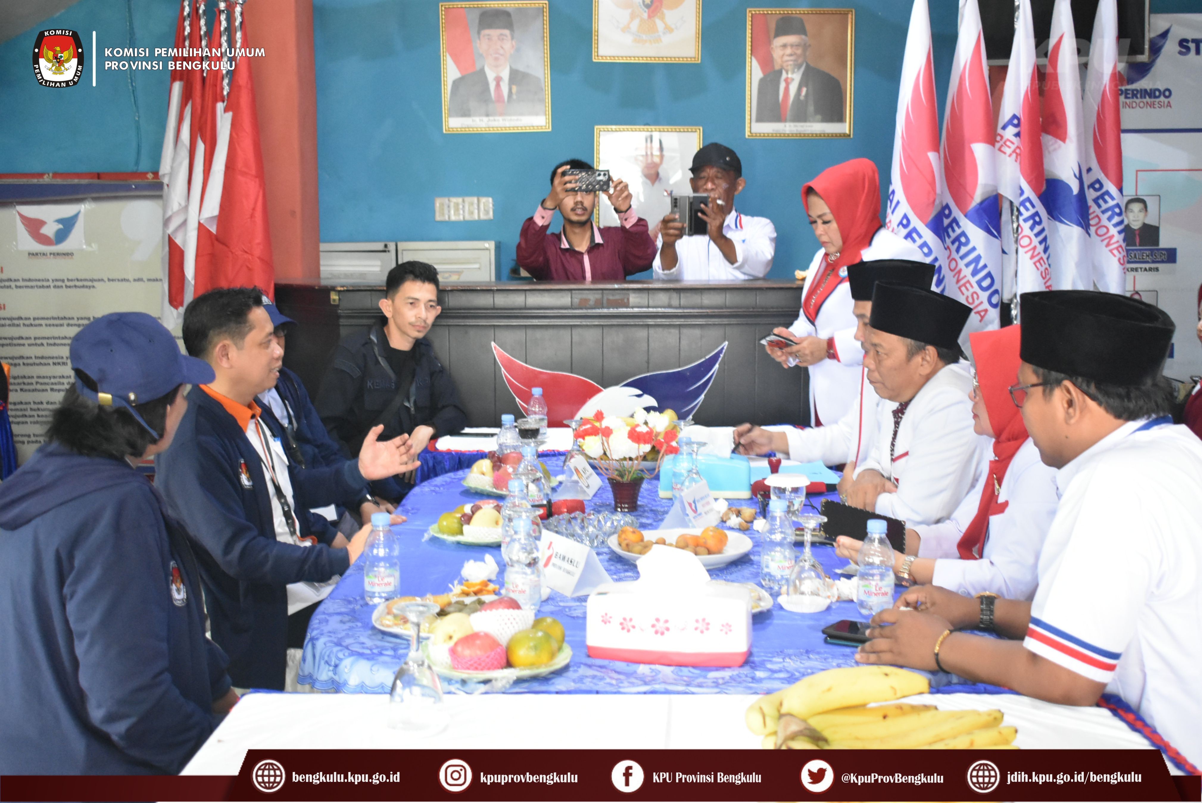 Bengkulu-bengkulu.kpu.go.id, Ketua KPU Provinsi Bengkulu Irwan Saputra bersama Anggota KPU Provinsi Bengkulu Emex Verzoni serta Sekretaris Kemas Mohammad Ajir dan Tim Pelaksana Kegiatan Verifikasi Partai Politik Peserta Pemilu 2024, yaitu Polda, Kesbangpol, Kejaksaan Tinggi dan Kanwil Kemenkumham Bengkulu mendatangi Sekretariat Dewan Pimpinan Wilayah Partai Persatuan Indonesia (PERINDO) Tingkat Provinsi Bengkulu dalam rangka melaksanakan Verifikasi Faktual Kepengurusan Partai Politik, Senin (17/10).