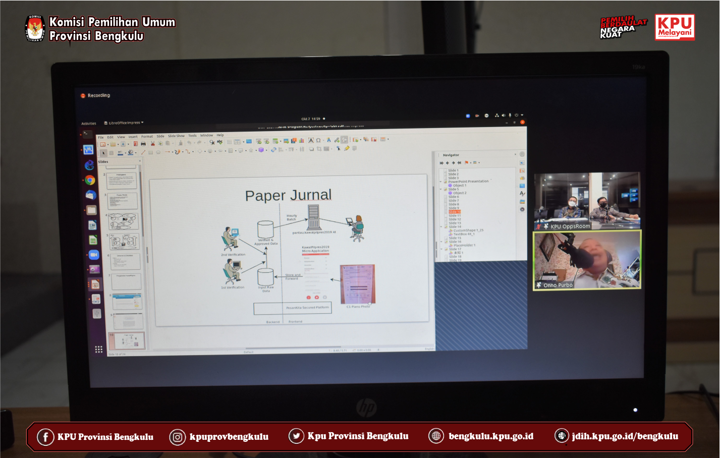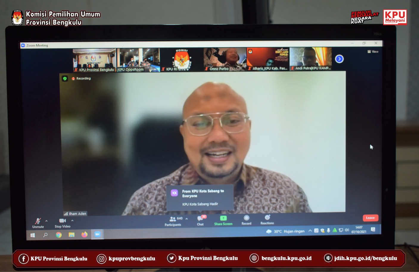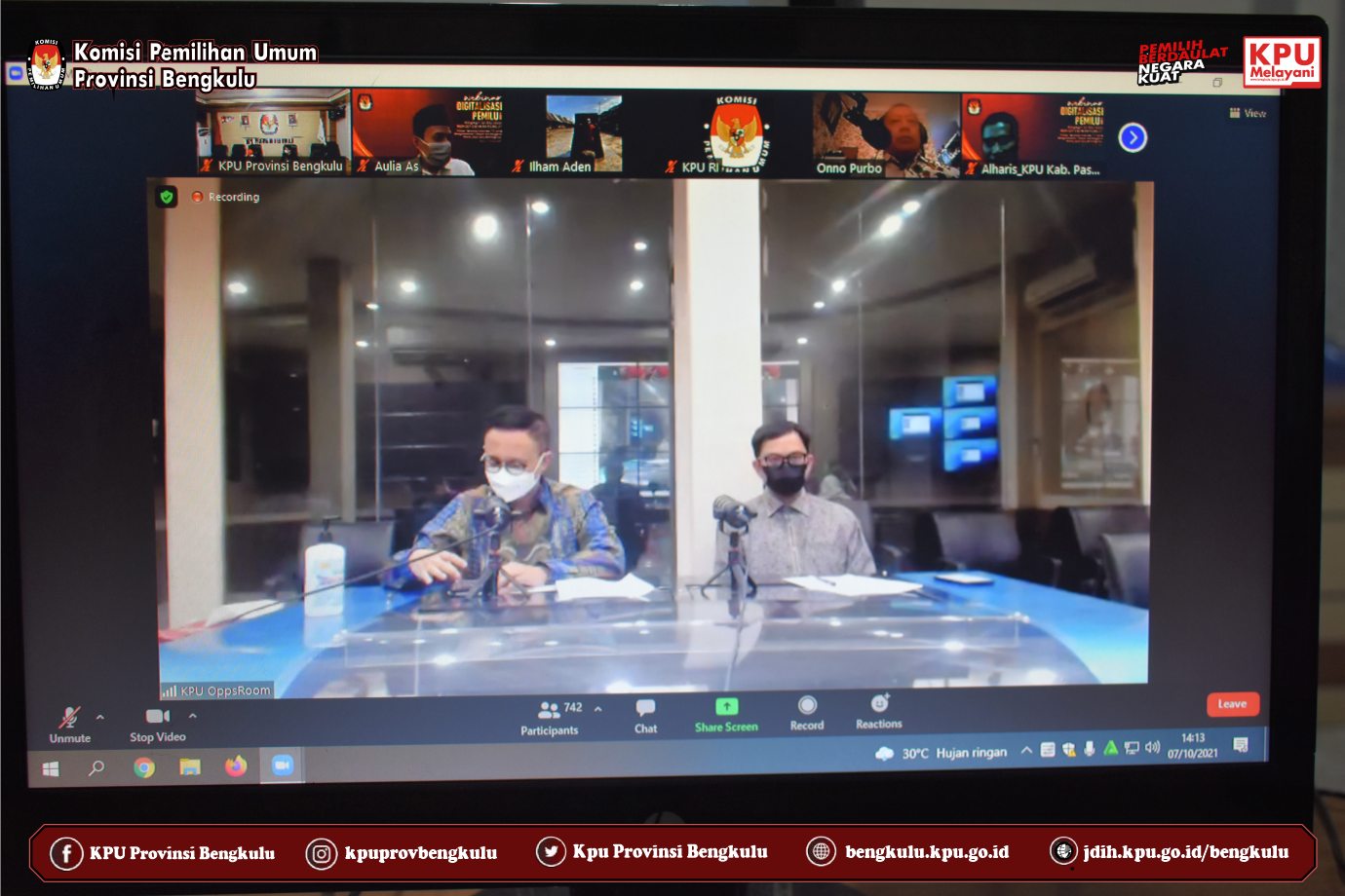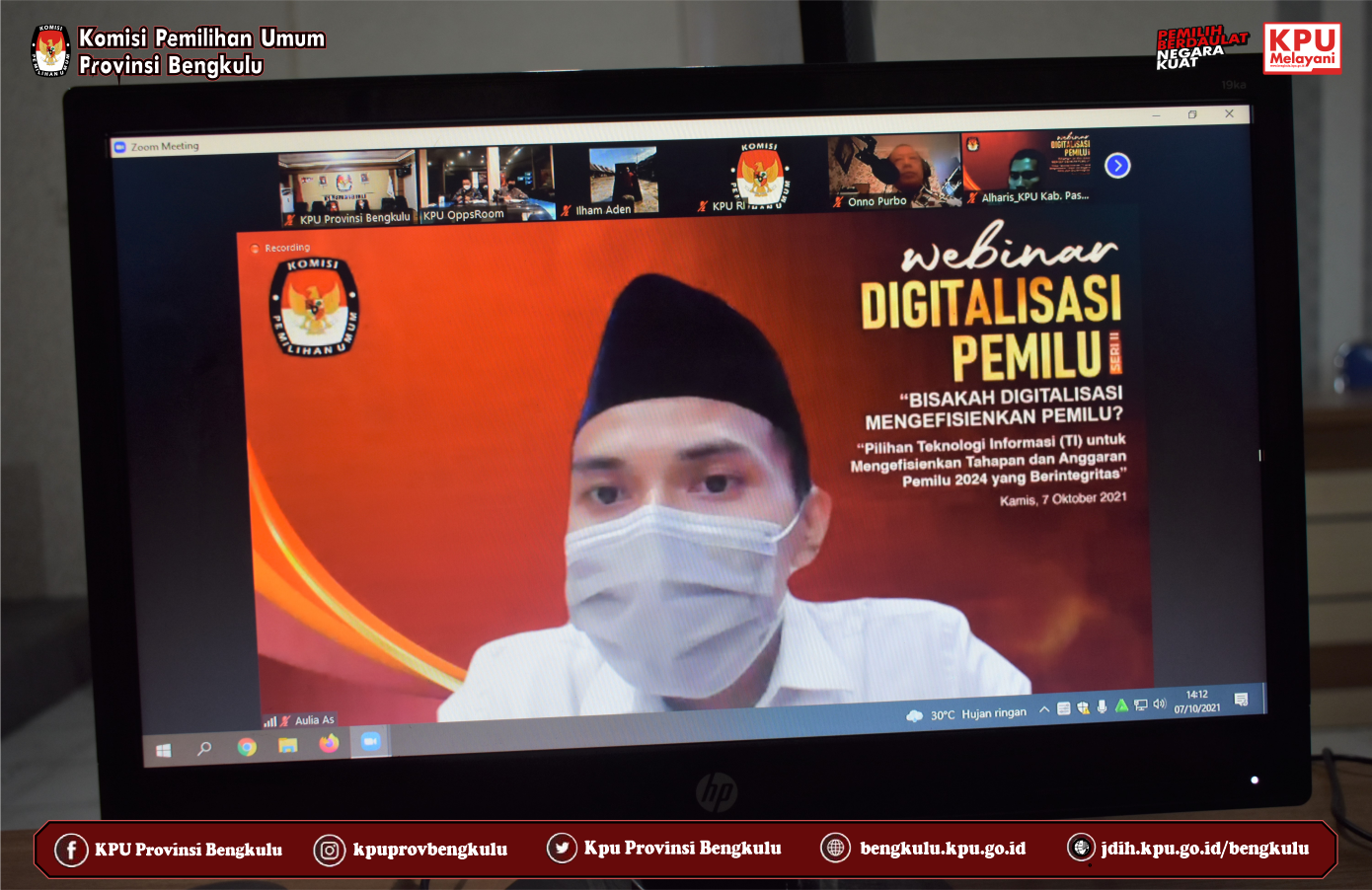 Ketua KPU Provinsi Bengkulu Irwan Saputra dan Anggota Siti Baroroh mengikuti Webinar Digitalisasi Pemilu Seri II dengan tema "Bisakah Digitalisasi Mengefisienkan Pemilu?" Pilihan Teknologi Informasi (TI) untuk mengefisienkan Tahapan dan Anggaran Pemilu 2024 yang berintegritas yang diselenggarakan oleh KPU Republik Indonesia secara daring (zoom meeting) pada Kamis (7/10). Webinar ini diikuti KPU Provinsi dan KPU Kabupaten/Kota Se-Indonesia. Webinar yang dimoderatori oleh Kepala Pusdatin KPU RI Bapak Sumariyandono ini dibuka langsung oleh Ketua KPU RI Bapak ilham Saputra dan Anggota KPU RI Bapak Viryan. Acara ini menghadirkan narasumber Pakar Ahli IT Onno W. Purbo yang membahas materi mengenai Digitalisasi Pemilu yang kemudian dilanjutkan diskusi.