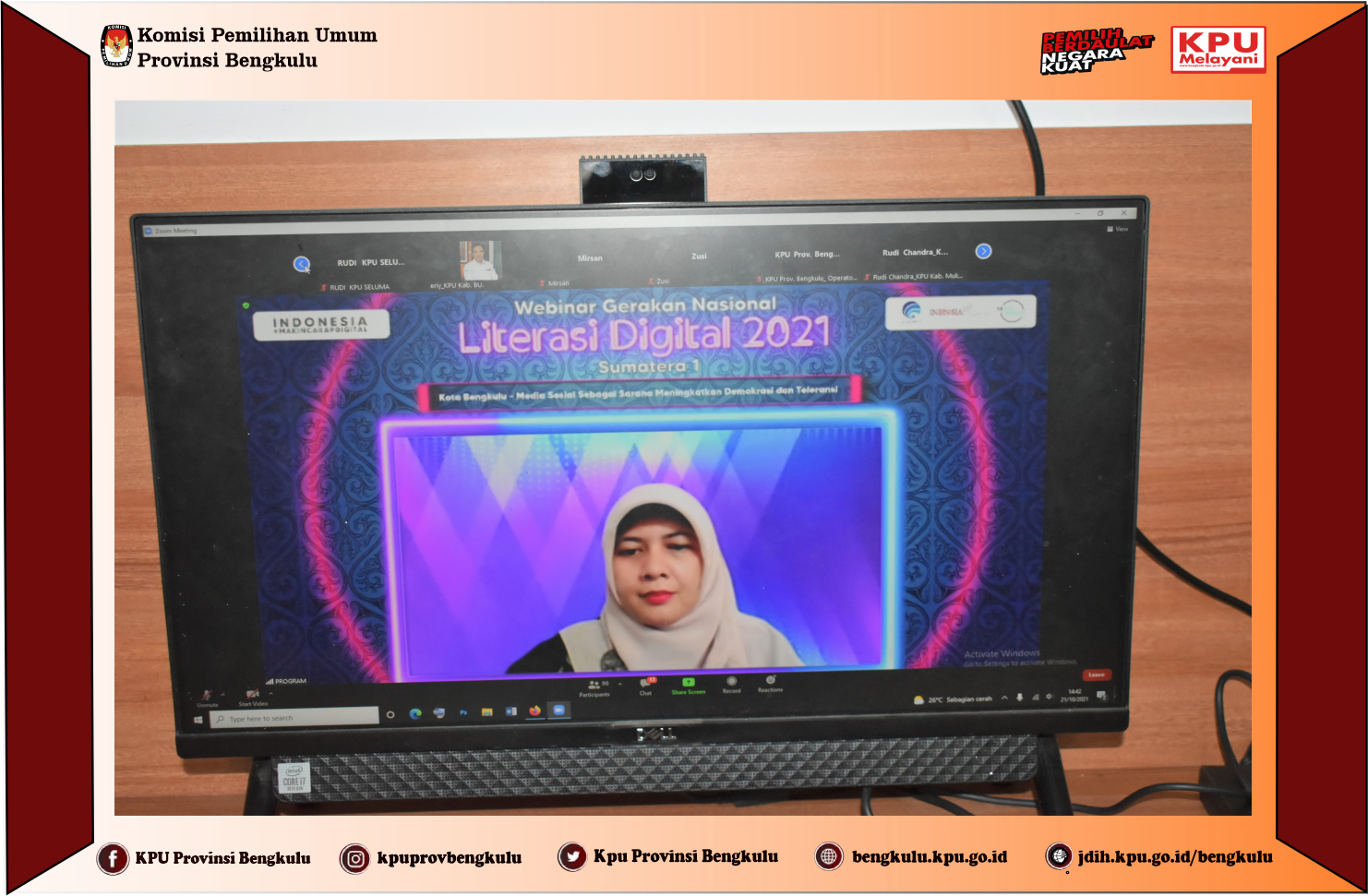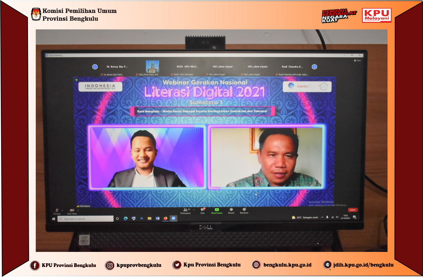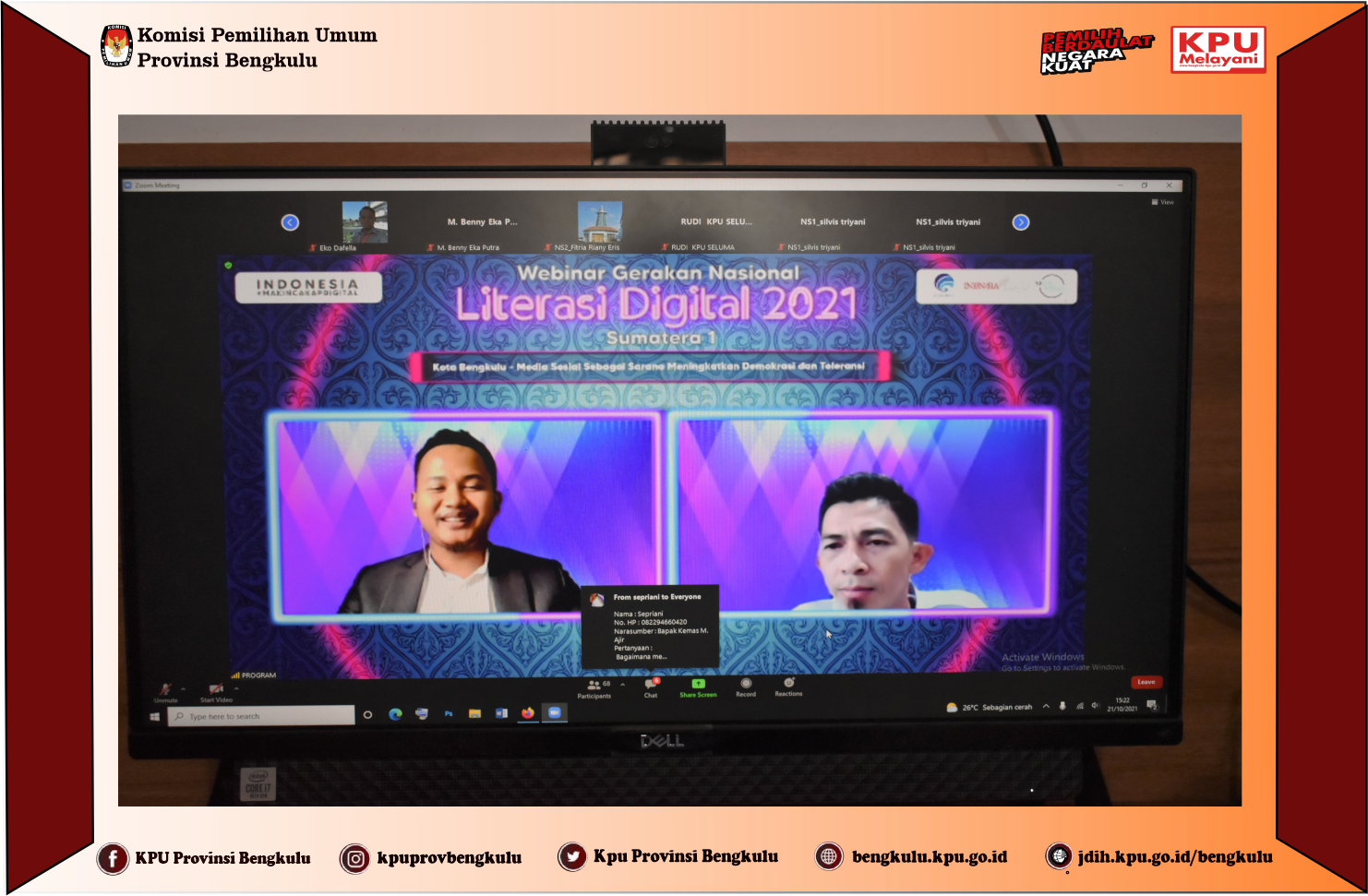 Sekretaris KPU Provinsi Bengkulu Kemas M Ajir hadir sebagai Narasumber Webinar Gerakan Nasional Literasi Digital 2021 yang mengusung tema Media Sosial Sebagai Sarana Meningkatkan Demokrasi dan Toleransi (Bengkulu) pada Kamis (21/10) yang diselenggarakan Kementerian Komunikasi dan Informasi secara daring (zoom meeting). Webinar ini dibuka langsung oleh Direktur Jenderal Aplikasi Informatika, Semuel Abrijani Pangerapan. Webinar yang dimoderatori Rahmat Riyadi ini selain menghadirkan Kemas M Ajir juga menghadirkan narasumber Ghina Bastiana (Watercolor illustrator, influencer dan Dosen), Fitria Riany Eris (Dosen Universitas Sultan Ageng Tirtayasa), dan Sumarlen (Peneliti PUSKAPP Bengkulu). Kemas M Ajir membahas tema Budaya Digital “Medsos untuk Demokrasi dan Toleransi”. Selain materi, acara ini diisi dengan diskusi tanya jawab dan pembagian doorprize.