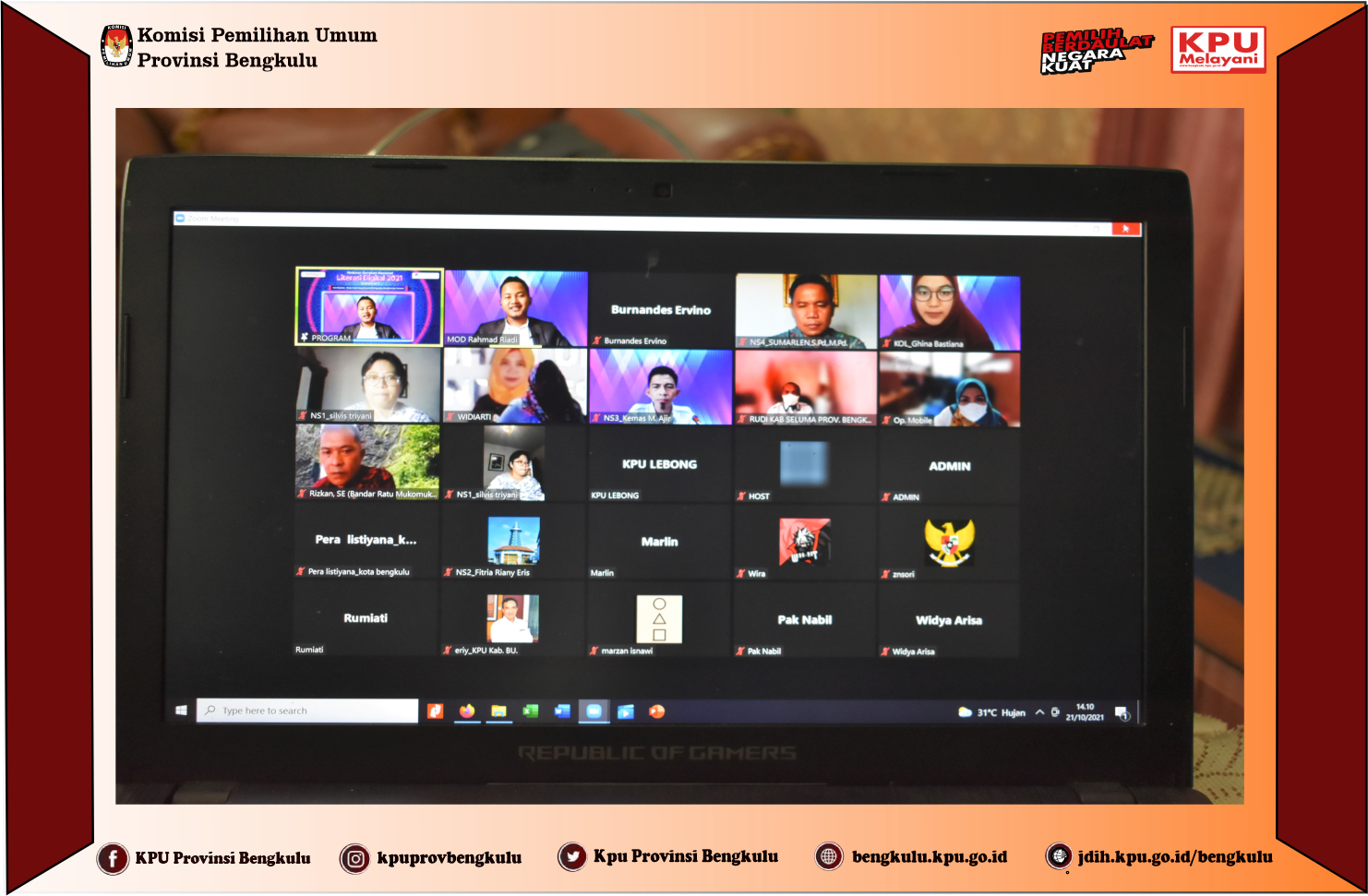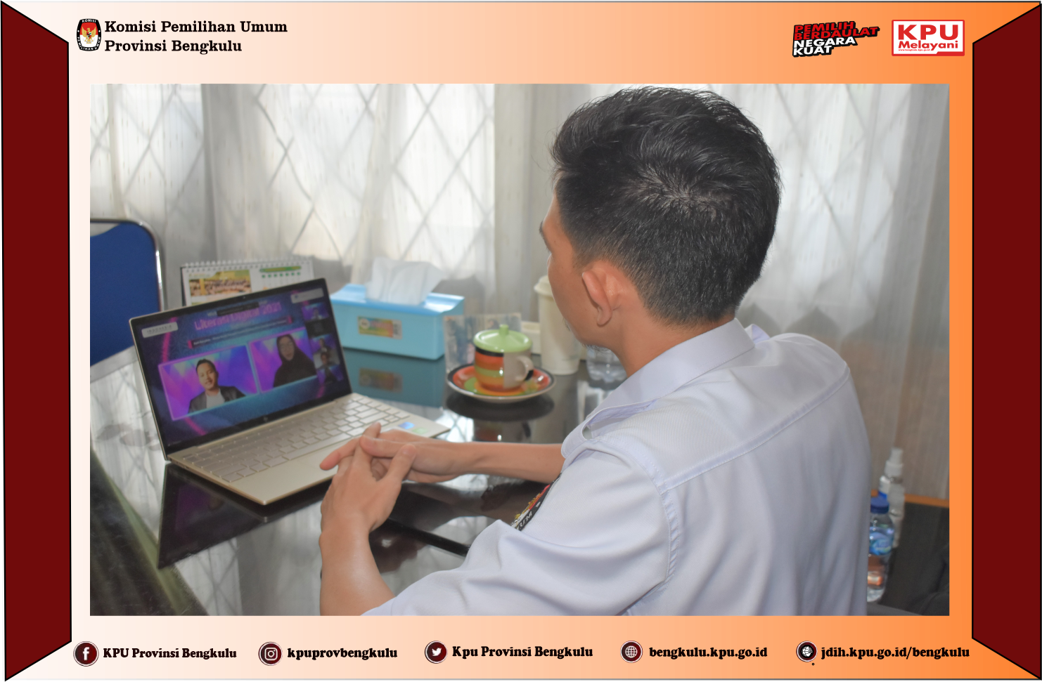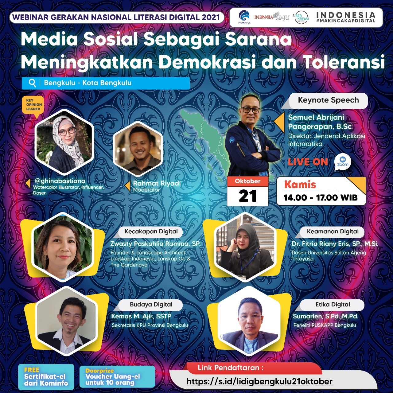 Sekretaris KPU Provinsi Bengkulu Kemas M Ajir hadir sebagai Narasumber Webinar Gerakan Nasional Literasi Digital 2021 yang mengusung tema Media Sosial Sebagai Sarana Meningkatkan Demokrasi dan Toleransi (Bengkulu) pada Kamis (21/10) yang diselenggarakan Kementerian Komunikasi dan Informasi secara daring (zoom meeting). Webinar ini dibuka langsung oleh Direktur Jenderal Aplikasi Informatika, Semuel Abrijani Pangerapan. Webinar yang dimoderatori Rahmat Riyadi ini selain menghadirkan Kemas M Ajir juga menghadirkan narasumber Ghina Bastiana (Watercolor illustrator, influencer dan Dosen), Fitria Riany Eris (Dosen Universitas Sultan Ageng Tirtayasa), dan Sumarlen (Peneliti PUSKAPP Bengkulu). Kemas M Ajir membahas tema Budaya Digital “Medsos untuk Demokrasi dan Toleransi”. Selain materi, acara ini diisi dengan diskusi tanya jawab dan pembagian doorprize.