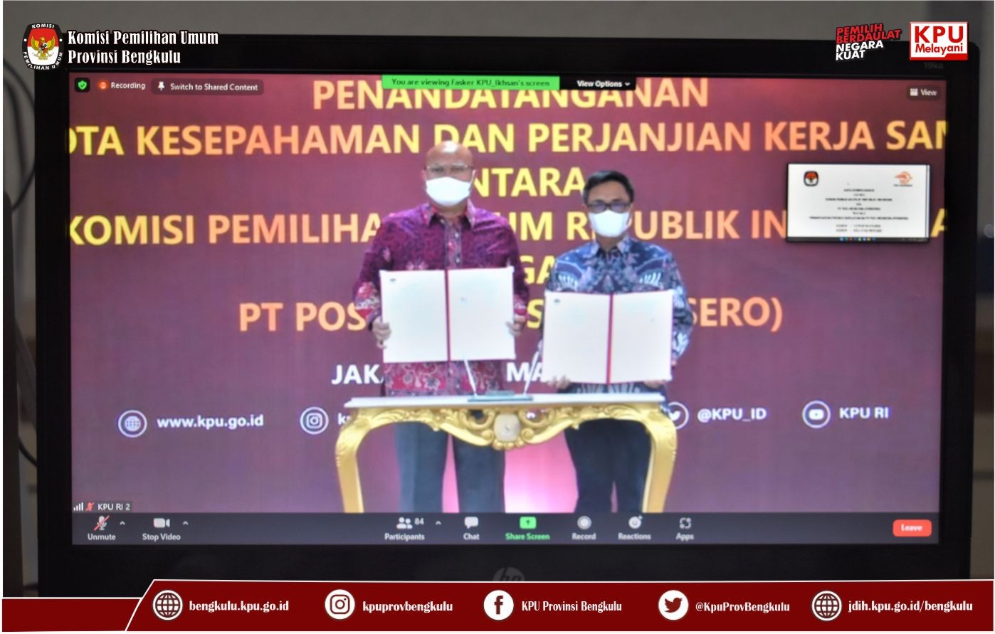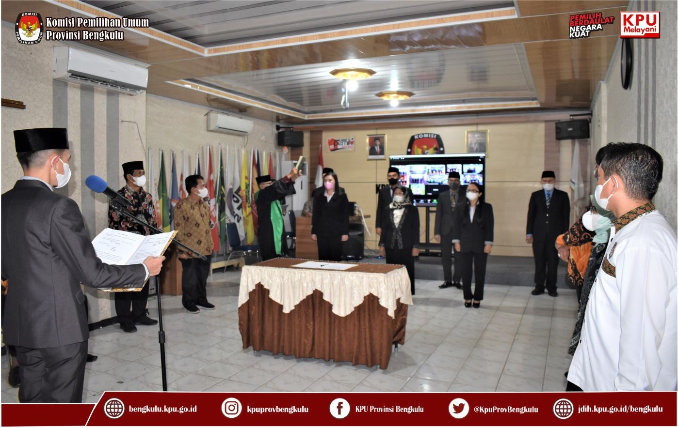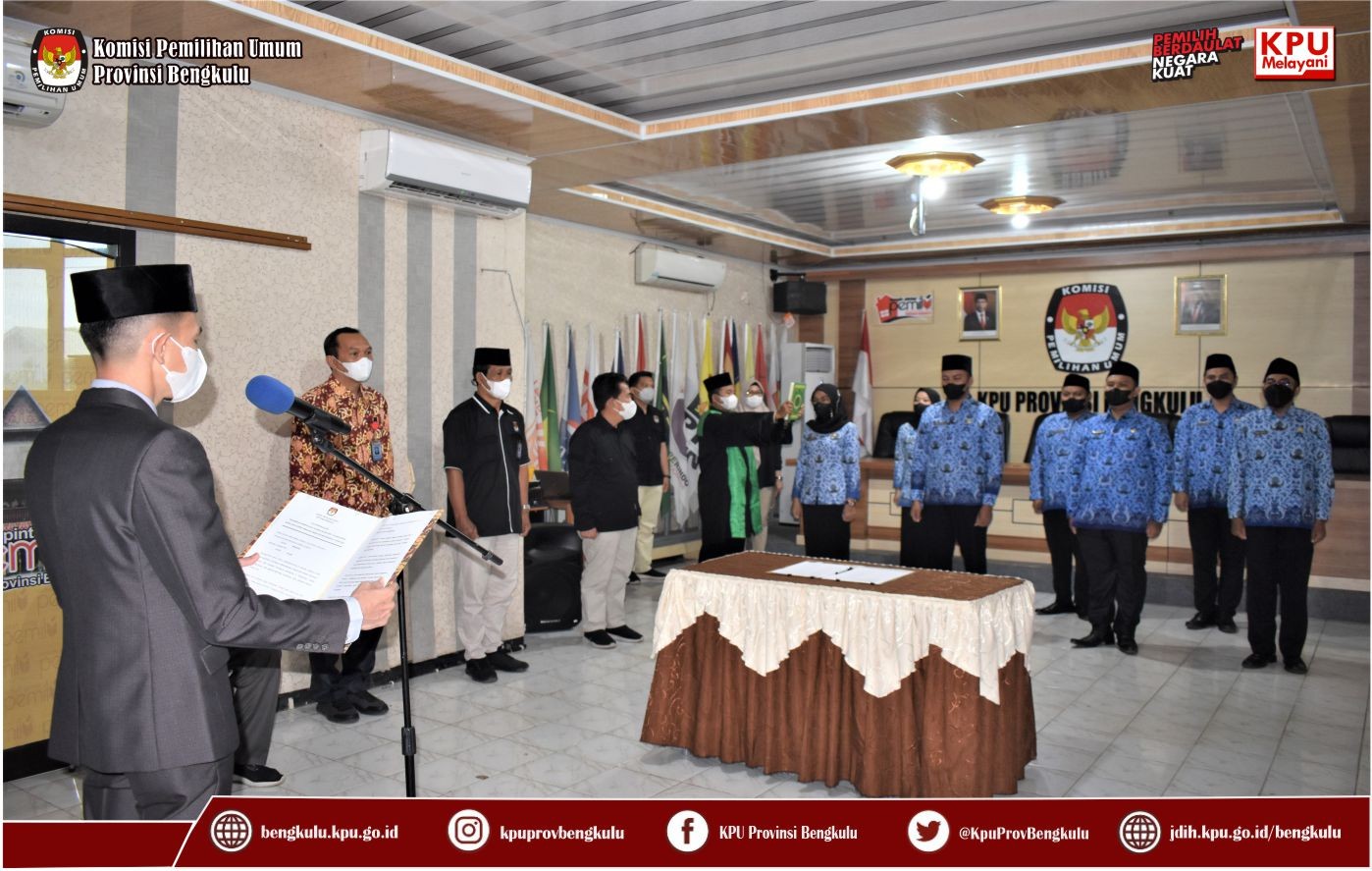 #TemanPemilih, KPU Provinsi Bengkulu melaksanakan Pelantikan dan Pengambilan Sumpah/Janji Jabatan Pengawas Pada Sekretariat KPU Provinsi dan Sekretariat Kab/Kota Se-Provinsi Bengkulu Tahun 2022 lingkup Provinsi Bengkulu Tahun 2022 secara daring pada Jum’at (11/3) di Ruang Audio Visual Rumah Pintar Pemilu yang langsung dimonitoring oleh KPU Republik Indonesia melalui daring. Pelaksanaan Pelantikan dan Pengambilan Sumpah/Janji ini dilakukan langsung oleh Sekretaris KPU Provinsi Bengkulu Kemas M Ajir serta dihadiri dan disaksikan oleh Ketua KPU Provinsi Bengkulu Irwan Saputra dan Anggota KPU Provinsi Bengkulu Siti Baroroh, dan Darlinsyah, serta Kabag Keuangan Umum dan Logistik Sudirman, Kabag Teknis Penyelenggaraan Pemilu Partisipasi dan Hubungan Masyarakat Hukum dan SDM Oktan Huzaeiry dan Kabag Perencanaan Data dan informasi Hamzah, Anggota KPU dan Sekretaris KPU Kabupaten/Kota Se-Provinsi Bengkulu. Pejabat yang diambil sumpah/janji sebanyak 46 (empat puluh enam) orang terdiri dari 6 (empat) orang pada Sekretariat KPU Provinsi Bengkulu, 4 (empat) orang pada setiap Sekretariat KPU Kabupaten/Kota Se-Provinsi Bengkulu. Pelaksanaan Pelantikan berjalan khidmat dan lancar. Pada Sekretariat KPU Provinsi Pejabat yang dilantik sebagai berikut : Angky Galaty, SH.,MH sebagai Kasubbag Umum dan Logistik, Ronny Novanda, SH.,MM sebagai Kasubbag Keuangan, Hafiz Umar, SH sebagai Kasubbag Hukum dan SDM, M Benny Eka Putra, Se.,MH sebagai Kasubbag Teknis Penyelenggaraan Pemilu, Partisipasi dan Hubungan Masyarakat Yunita Dika Fitri, ST,M.Si sebagai Kasubbag Data dan Informasi, dan Azmiyatun, S.Sos sebagai Perencanaan.