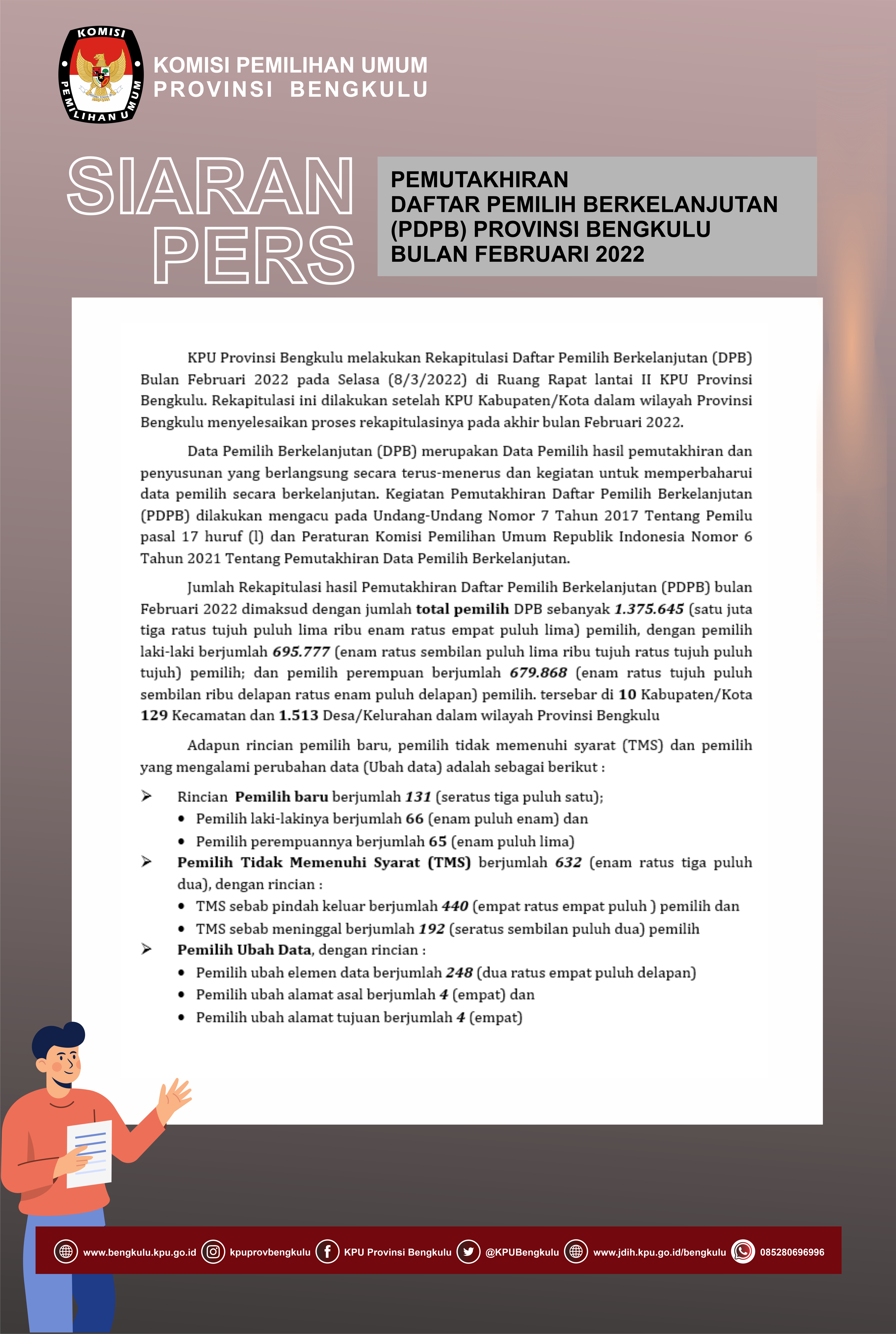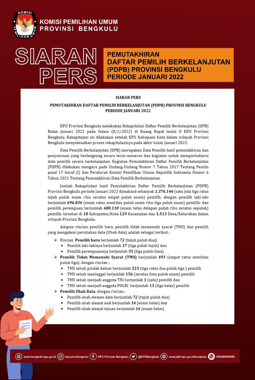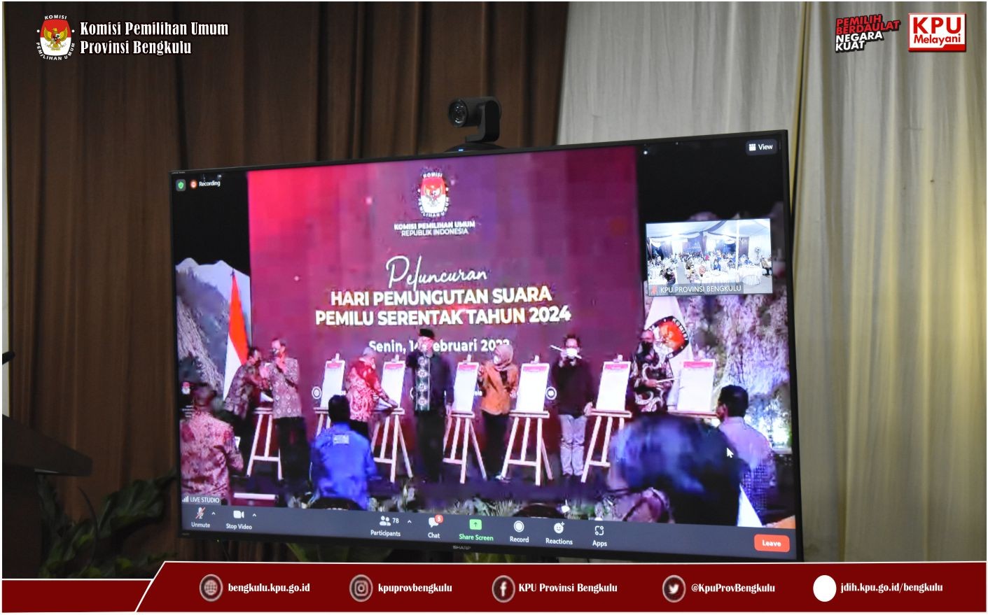 #TemanPemilih, KPU Provinsi Bengkulu melaksanakan Acara Nonton Bersama Peluncuran Hari Pemungutan Suara Pemilihan Umum Serentak Tahun 2024 yang digelar secara daring oleh KPU Republik Indonesia pada Senin (14/2) bertempat di Halaman Kantor KPU Provinsi Bengkulu. Acara dihadiri oleh Gubernur Bengkulu yang diwakili Asisten I Khairil Anwar, DPRD Provinsi, Bawaslu, Kejaksaan Tinggi, Pengadilan Tinggi, Korem 041 Gamas, Lanal, BIN, Ombudsman, Kesbangpol, Dinas Dukcapil, KIP, KPID, dan Partai Politik Tingkat Provinsi. Acara launching ini berlangsung dengan meriah dimulai dengan menyanyikan lagu Kebangsaan Indonesia Raya, sambutan Ketua KPU Republik Indonesia Ilham Saputra, serta puncak acara peluncuran Pemilu Serentak Tahun 2024 ditandai dengan pecoblosan Surat Suara oleh Ketua dan Anggota KPU Republik Indonesia.