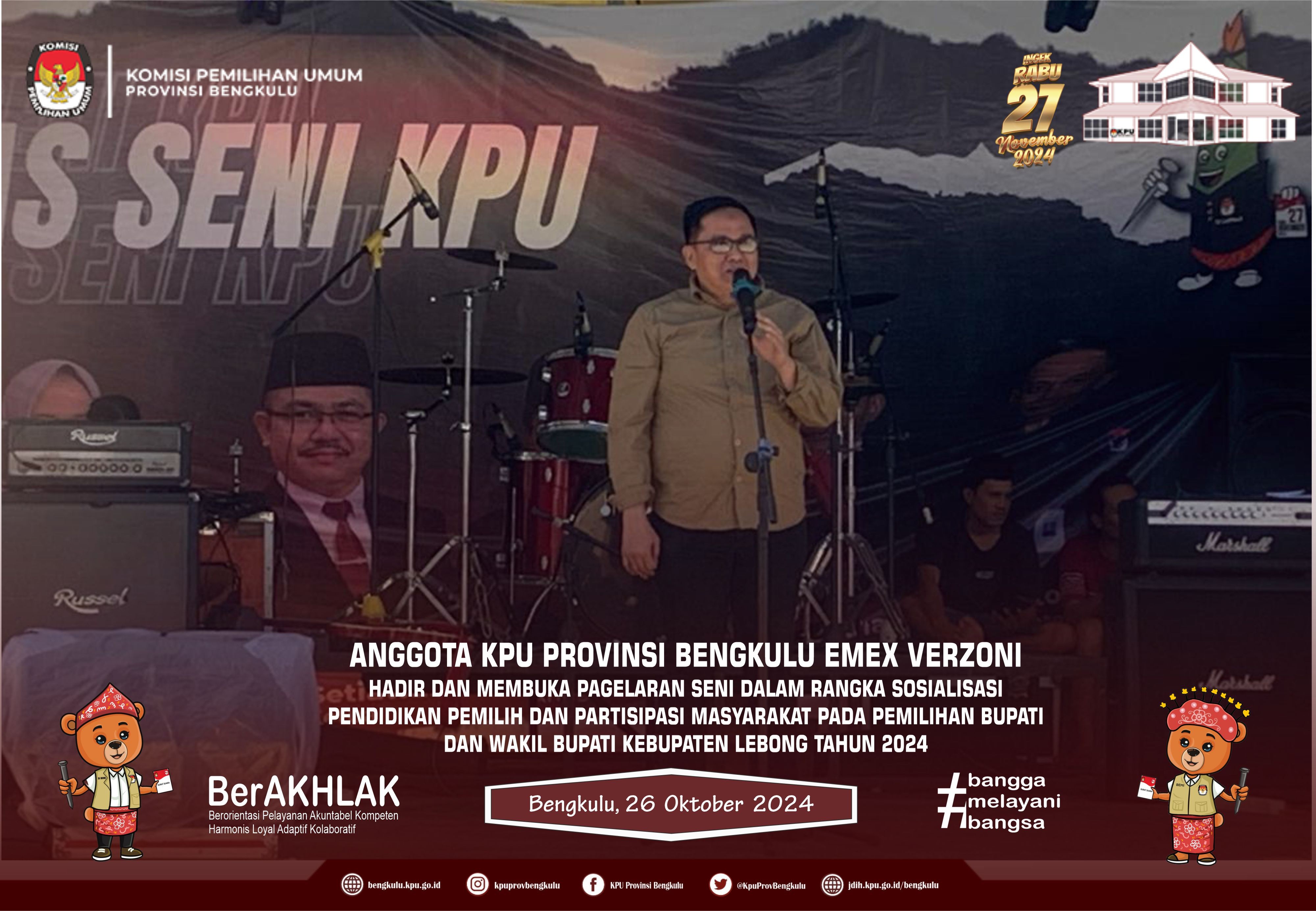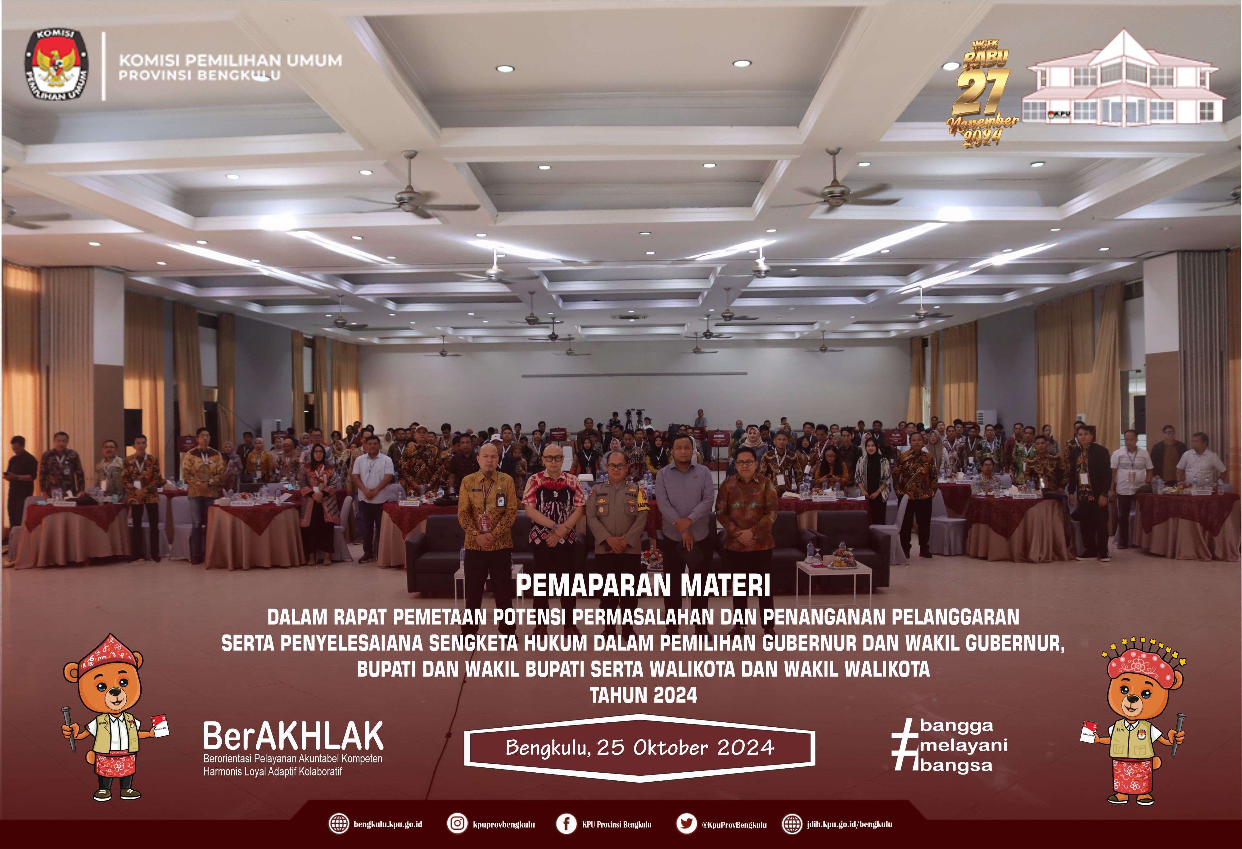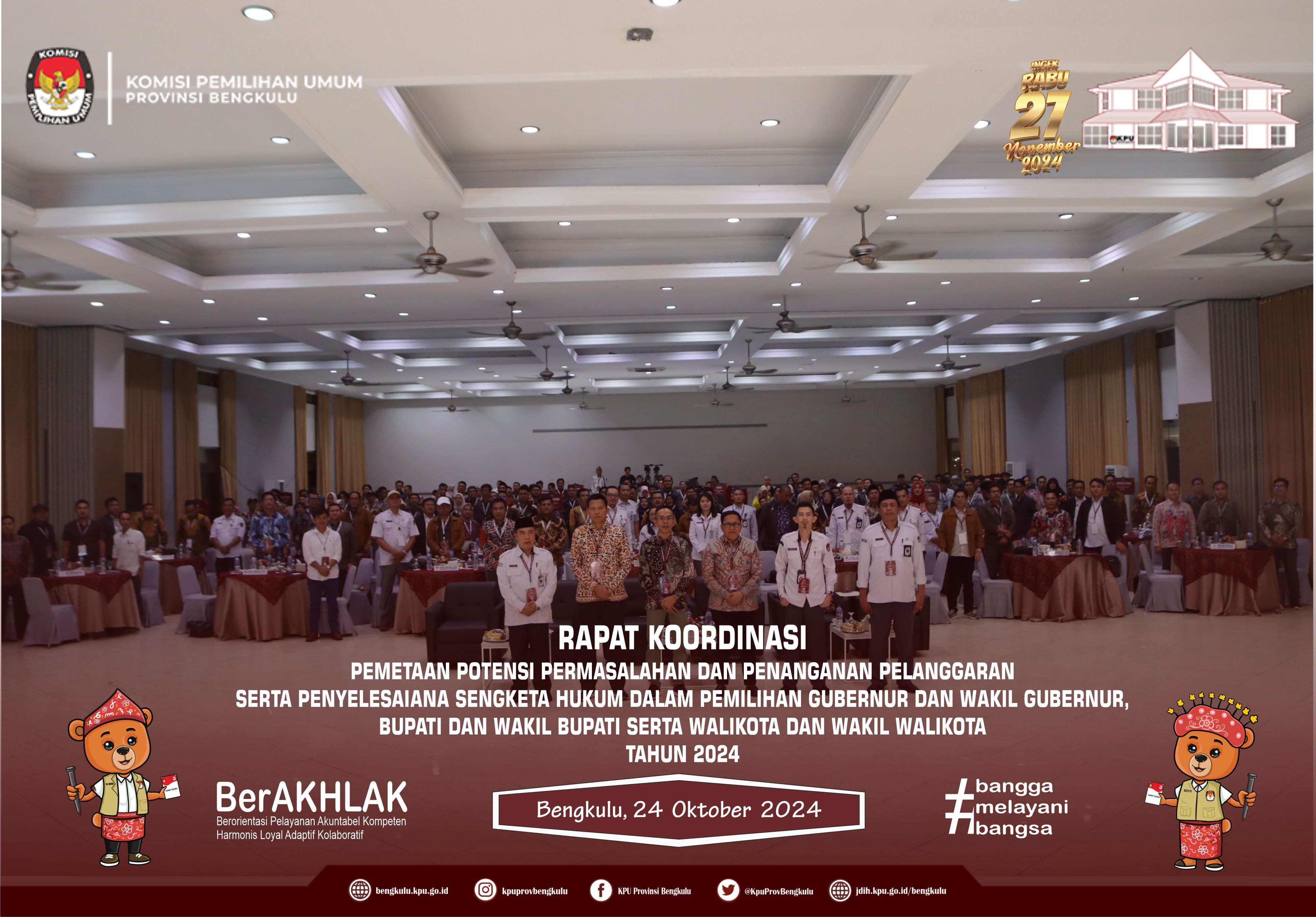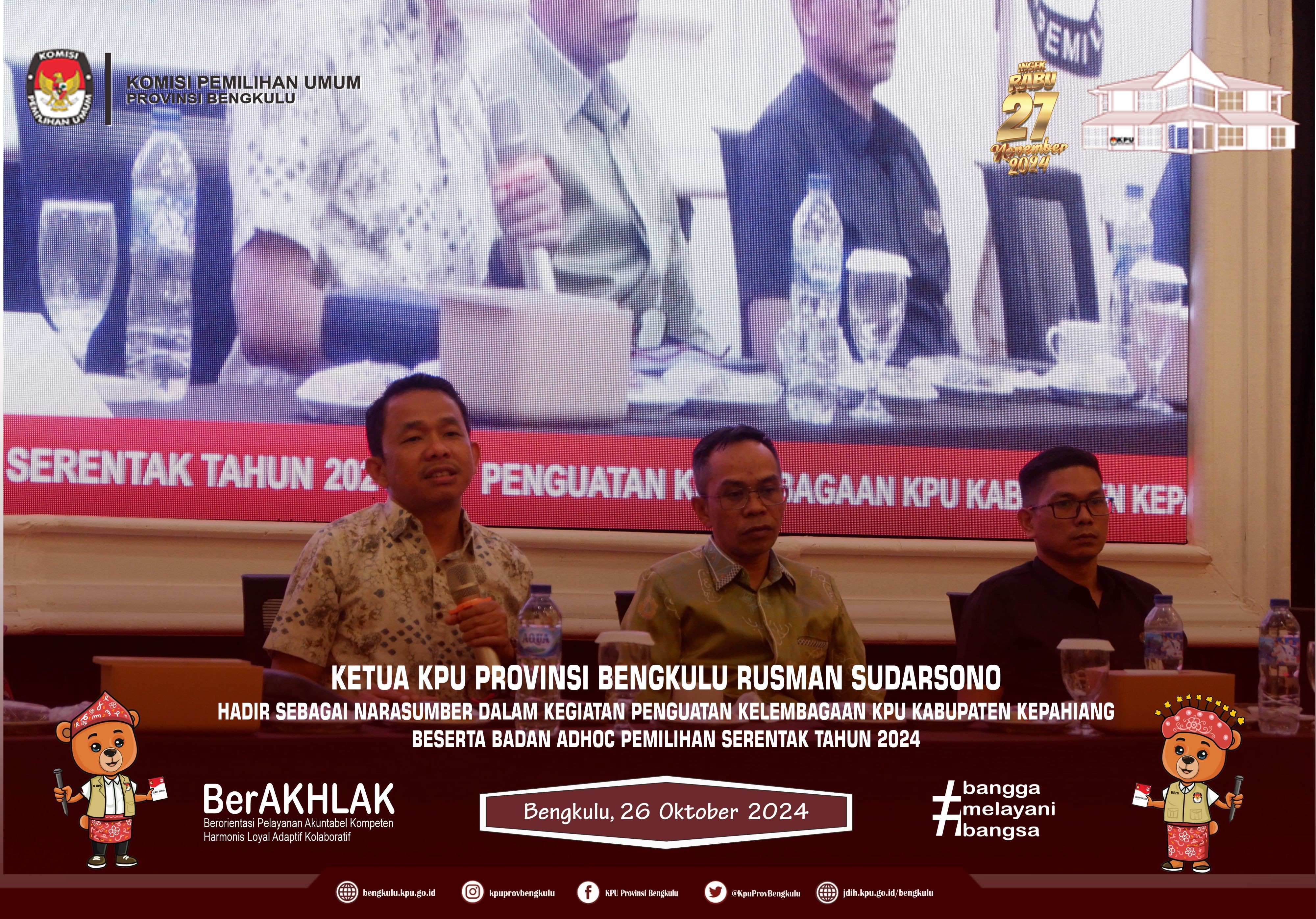 Bengkulu, bengkulu.kpu.go.id - Ketua KPU Provinsi Bengkulu Bapak Rusman Sudarsono Hadir sebagai Narasumber dalam Penguatan Kelembagaan KPU Kabupaten Kepahiang Beserta Badan Adhoc Pemilihan Serentak Tahun 2024 yang diselenggarakan KPU Kabupaten Kepahiang, Sabtu (26/10/2024) di Ballroom Hotel Shandyka Kepahiang. Hadir Panitia Pemilihan Kecamatan (PPK) dan Panitia Pemungutan Suara (PPS) se-Kabupaten Kepahiang. Bapak Rusman menegaskan bahwa penguatan kelembagaan ini penting dilakukan dalam rangka menyamakan persepsi dan pemahaman terhadap tugas, tupoksi dan wewenang KPU Kabupaten dan Badan Adhoc dalam penyelenggaraan Pemilihan Serentak di Provinsi Bengkulu. Bapak Rusman berharap agar jajaran KPU Kabupaten Kepahiang serta PPK dan PPS se-Kabupaten Kepahiang bekerja secara profesional, menjaga integritas dan soliditas dalam bekerja, serta meningkatkan kemampuan dan kapabilitas setiap individu dalam melaksanakan kinerja setiap tahapan.