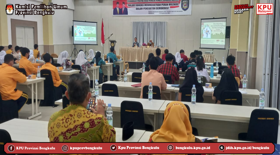 Ketua KPU Provinsi Bengkulu Irwan Saputra hadir sebagai Narasumber kegiatan Pendidikan Politik Bagi Pemilu Pemula/Generasi Milenial dengan Tema dalam rangka meningkatkan peran milenial dalam penguatan demokrasi yang diselenggarakan oleh Badan Kesatuan Bangsa dan Politik (Kesbangpol) Provinsi Bengkulu di Kampus Poltekkes Kemenkes Provinsi Bengkulu. Peserta yang hadir berasal Siswa-Siswa SMAN 1, 2, 3, 4, 5, 6, 7 dan 10, SMKN 1, 2, 3, dan 7, MAN 1 dan 2, SMA Carolus, SMA Muhammadiyah. Dalam materinya Irwan Saputra menyampaikan peran besar pemilih pemula atau generasi milenial dalam menjaga demokrasi. Selain itu, Irwan juga mengajak pemilih pemula atau generasi milenial untuk tetap menjaga demokrasi dengan selalu berpartisipasi aktif dalam setiap pemilu maupun pemilihan.